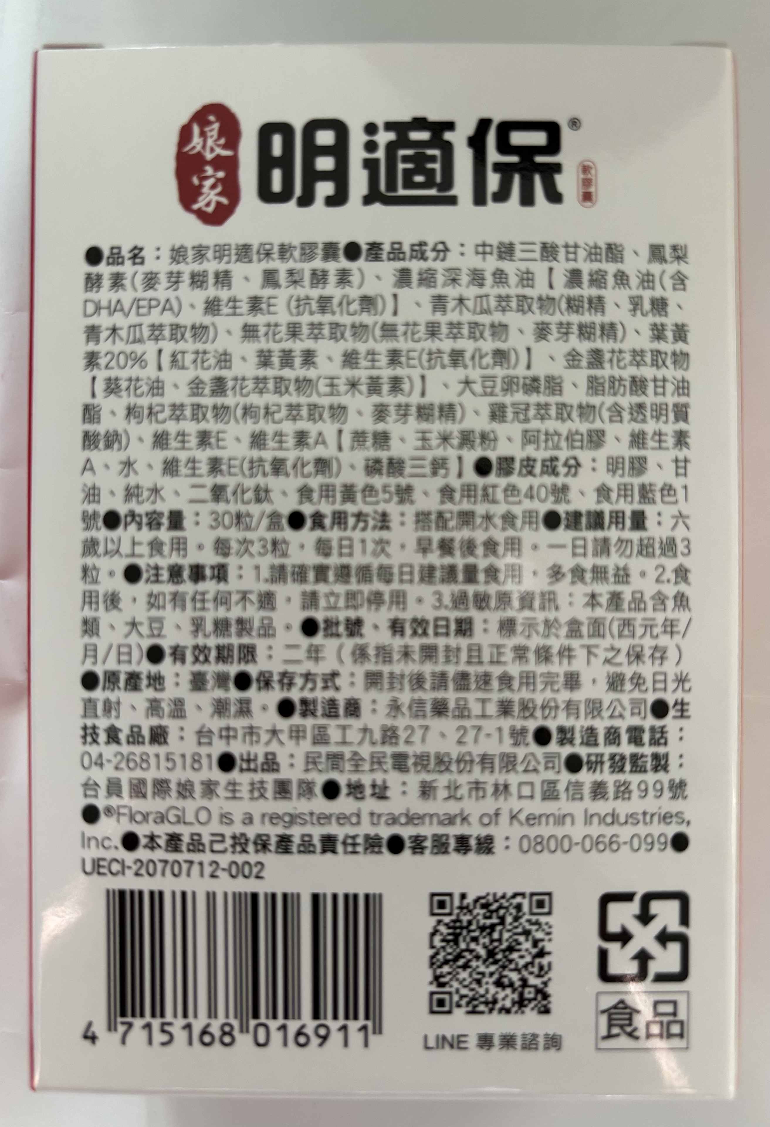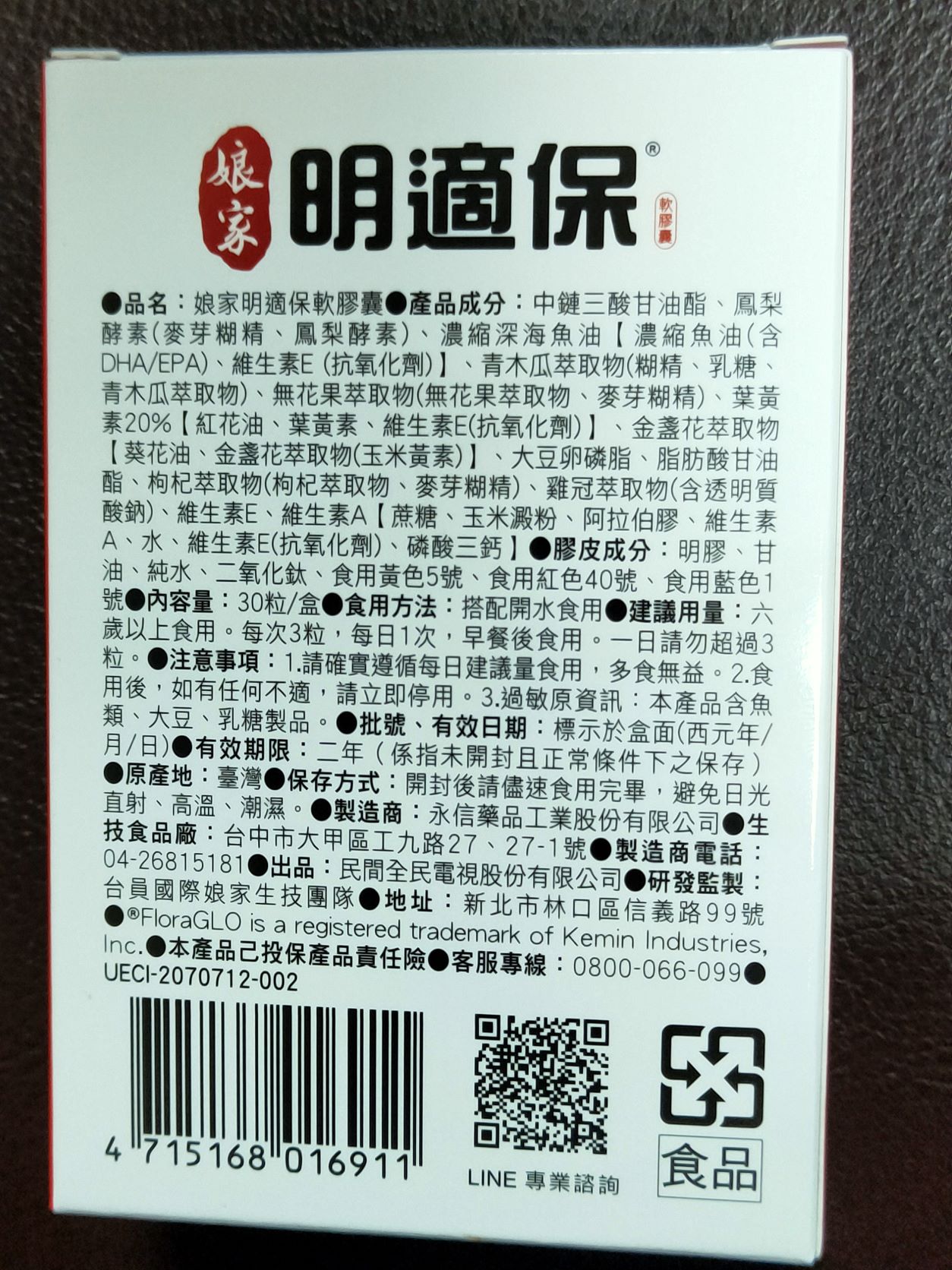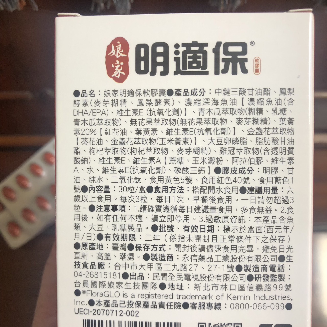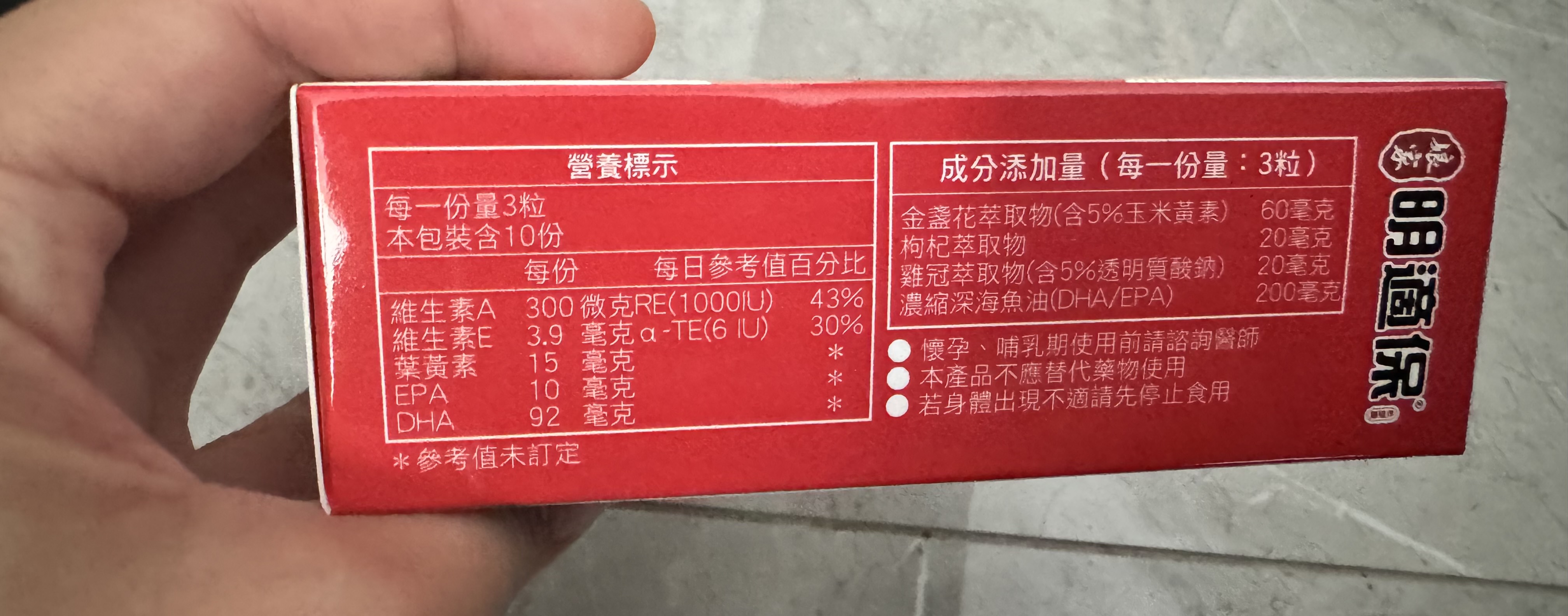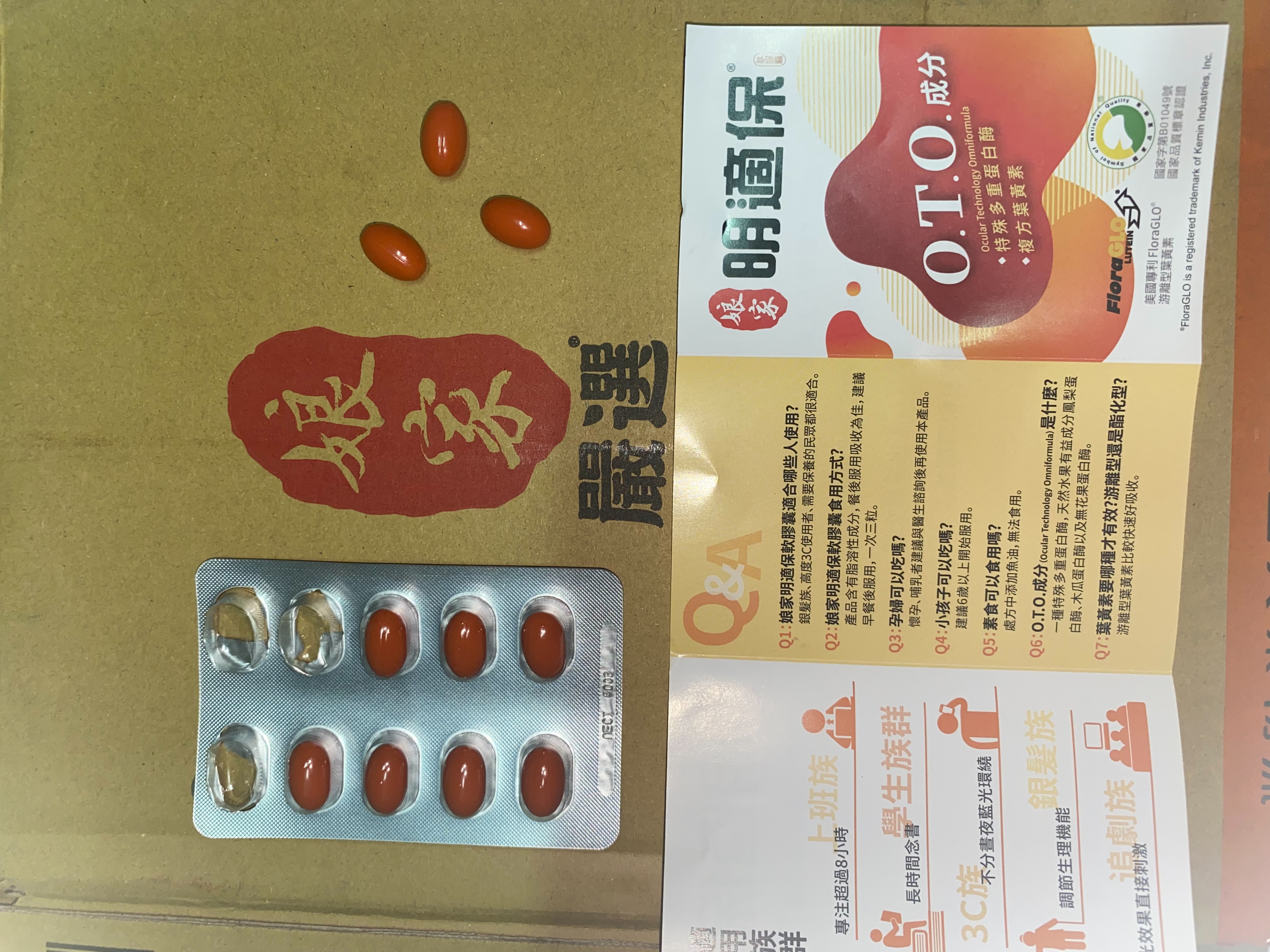 產品成分:中鏈三酸甘油酯、鳳梨酵素(麥芽糊精、鳳梨酵素)、濃縮深海魚油【濃縮魚油(含DHA/EPA)、維生素 E (抗氧化劑)】、青木瓜萃取物(糊精、乳糖、青木瓜萃取物)、無花果萃取物(無花果萃取物、麥芽糊精)、葉黃素20%【紅花油、葉黃素、維生素E(抗氧化劑)】、金盞花萃取物【葵花油、金盞花萃取物(玉米黃素)】、大豆卵磷脂、脂肪酸甘油酯 、枸杞萃取物(枸杞萃取物、麥芽糊精)、雞冠萃取物(含玻尿酸)、維生素E、維生素A【蔗糖、玉米澱粉、阿拉伯膠、維生素A、水、維生素E(抗氧化劑)、磷酸三鈣】