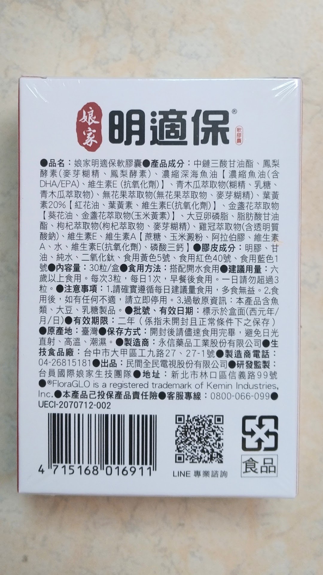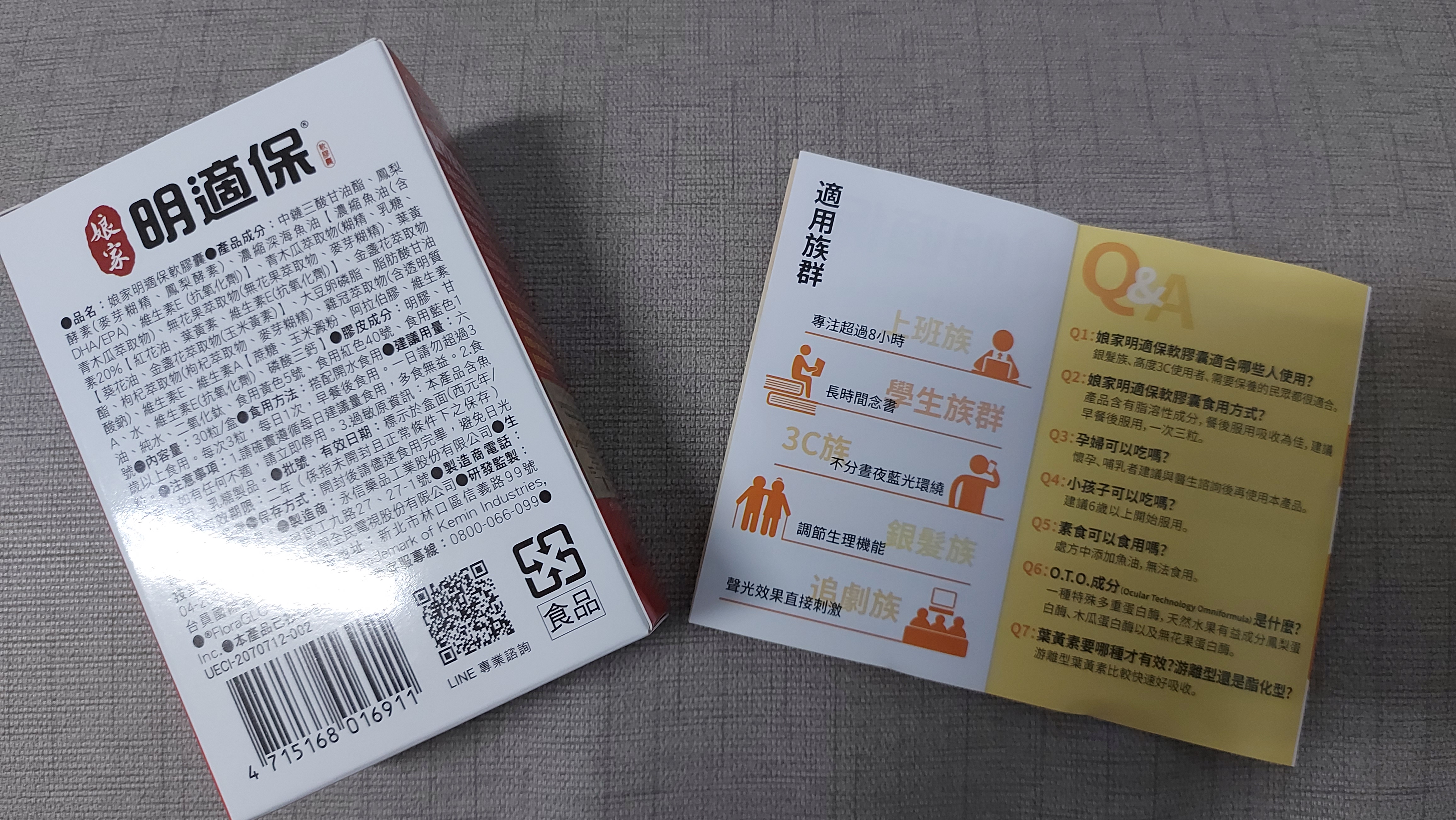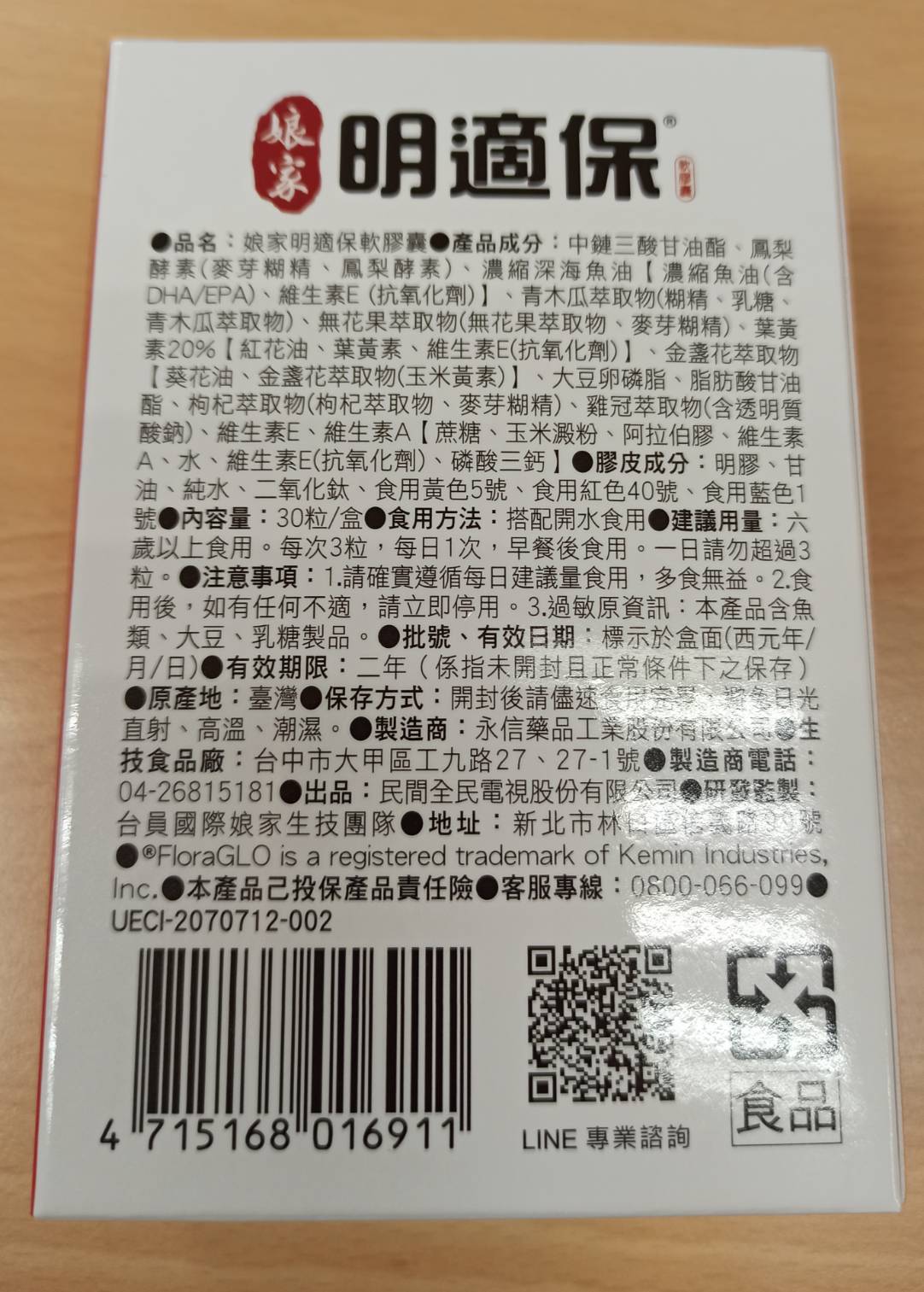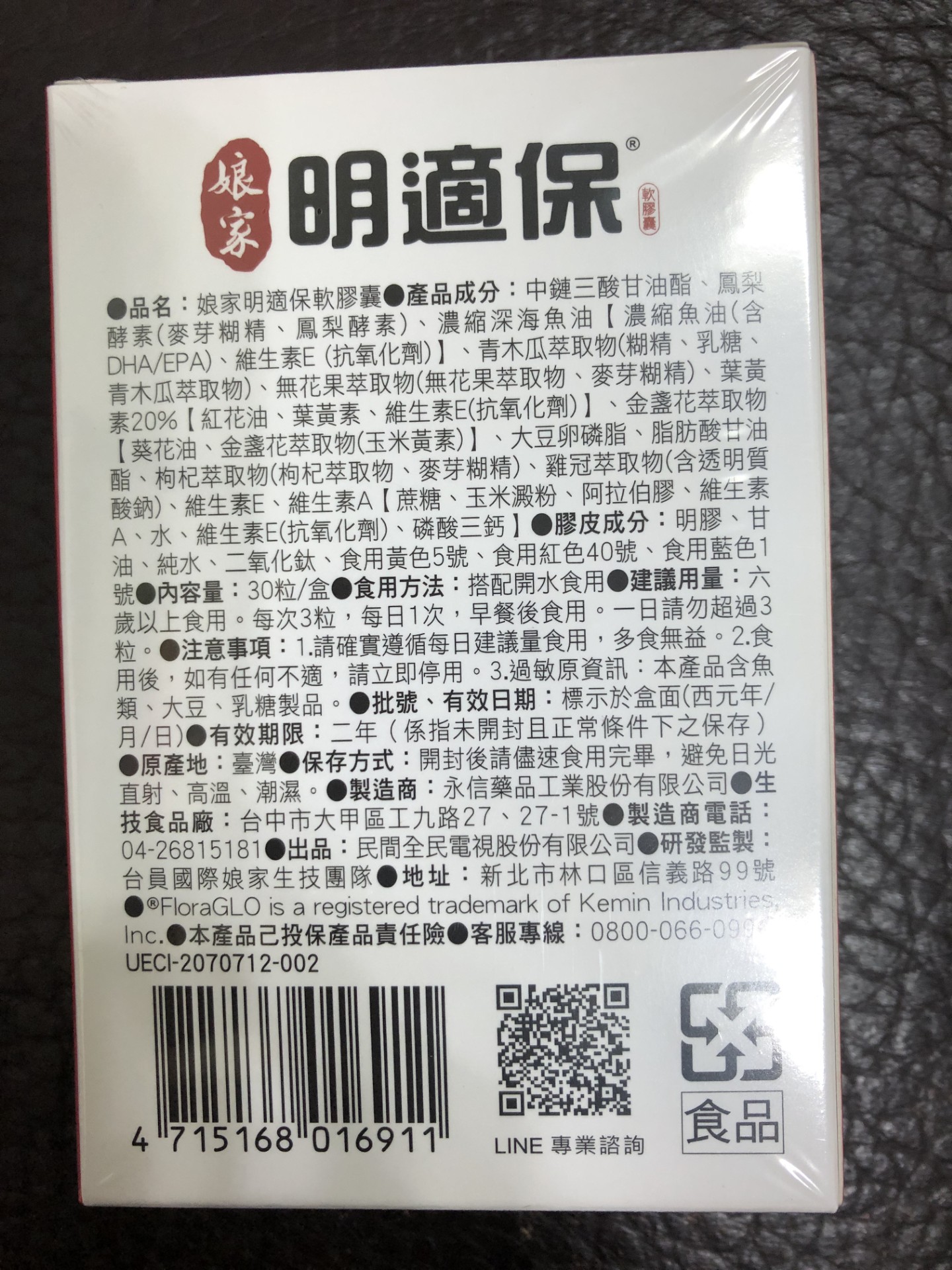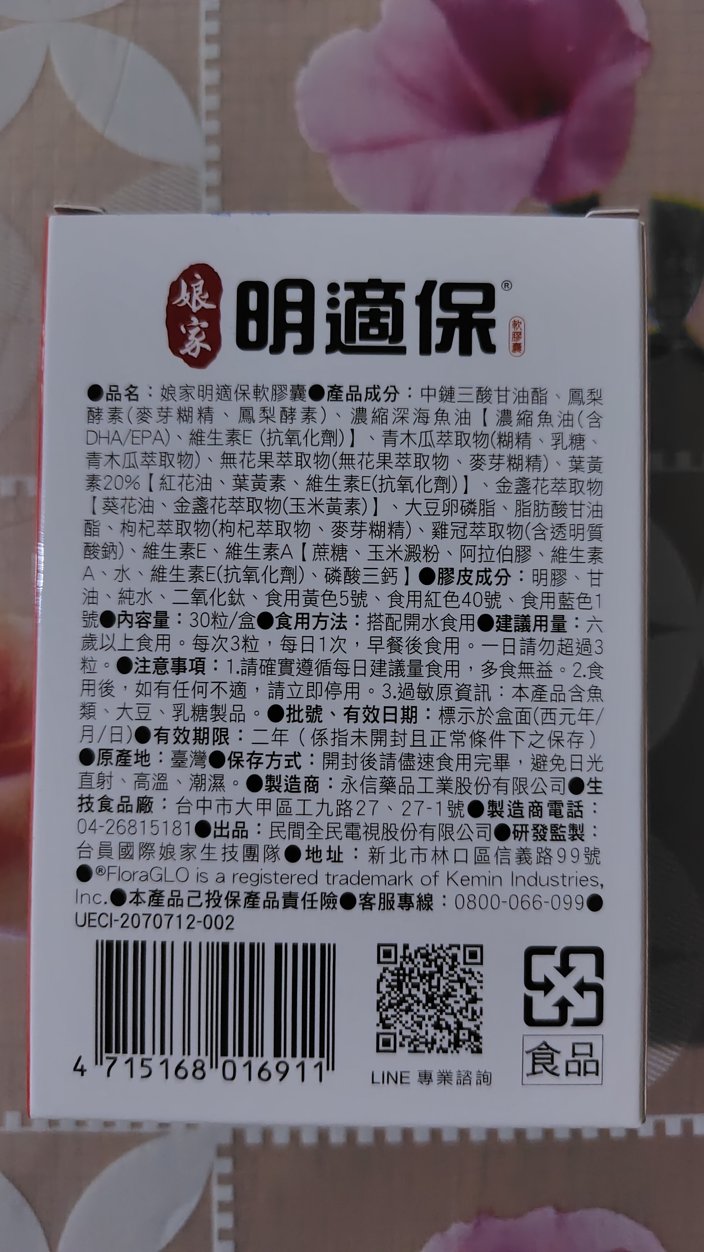 產品成分:中鏈三酸甘油酯、鳳梨酵素(麥芽糊精、鳳梨酵素)、濃縮深海魚油【濃縮魚油(含DHA/EPA)、維生素 E (抗氧化劑)】、青木瓜萃取物(糊精、乳糖、青木瓜萃取物)、無花果萃取物(無花果萃取物、麥芽糊精)、葉黃素20%【紅花油、葉黃素、維生素E(抗氧化劑)】、金盞花萃取物【葵花油、金盞花萃取物(玉米黃素)】、大豆卵磷脂、脂肪酸甘油酯 、枸杞萃取物(枸杞萃取物、麥芽糊精)、雞冠萃取物(含玻尿酸)、維生素E、維生素A【蔗糖、玉米澱粉、阿拉伯膠、維生素A、水、維生素E(抗氧化劑)、磷酸三鈣】