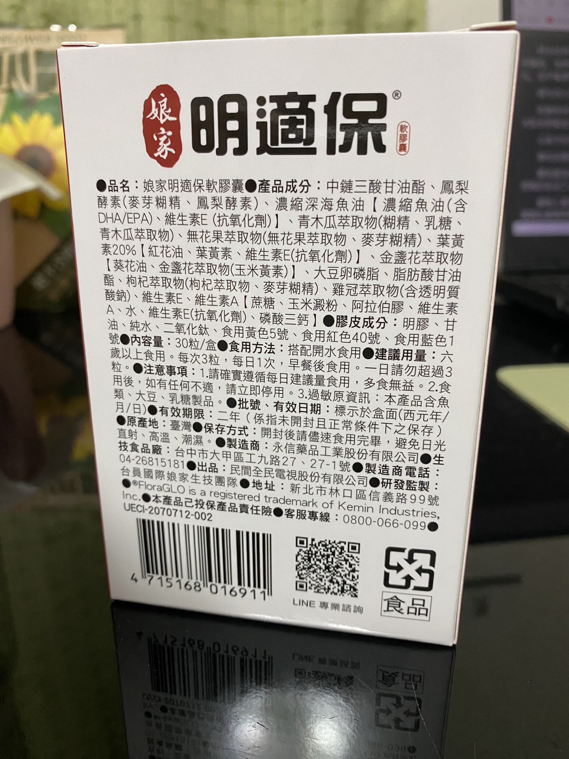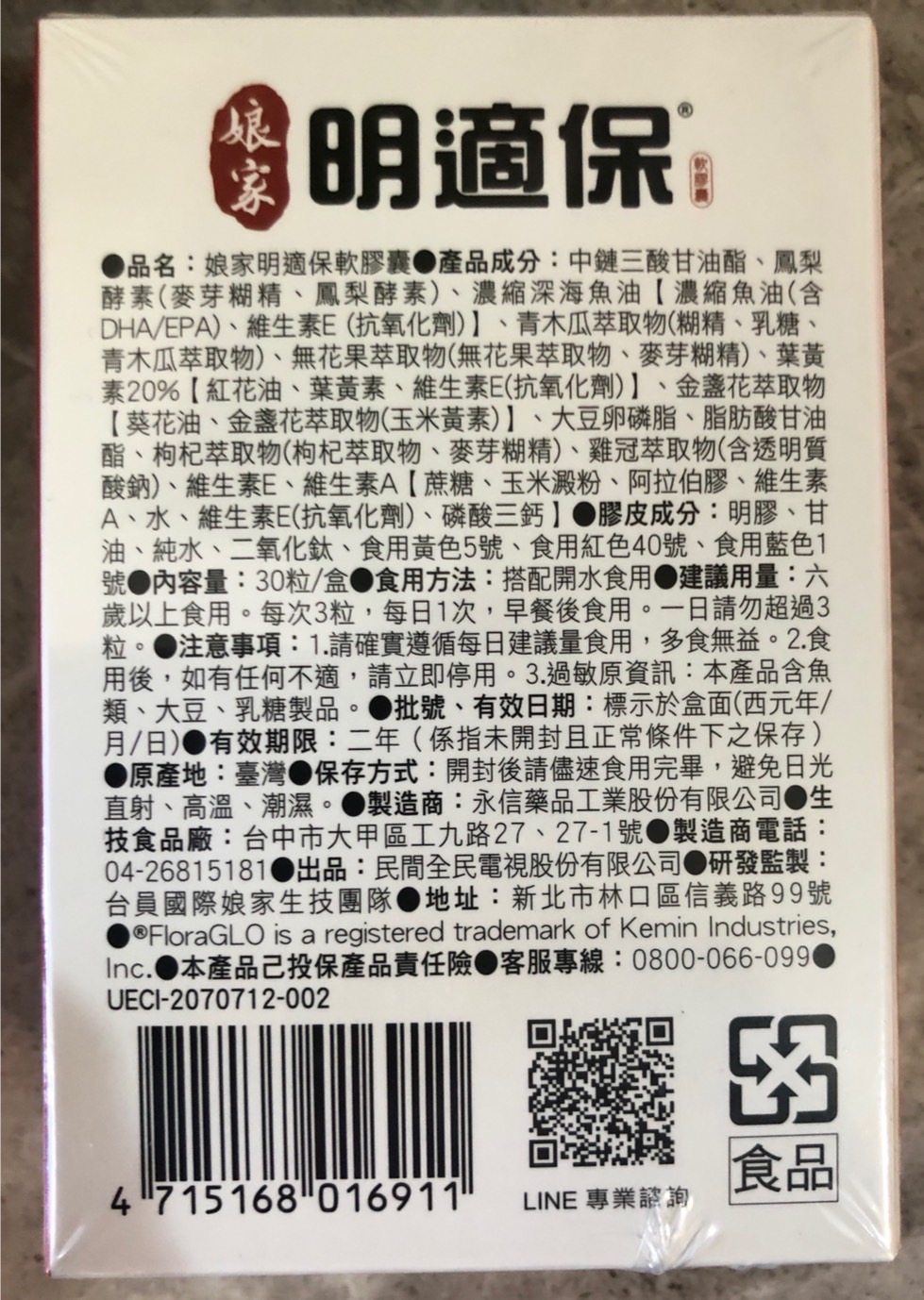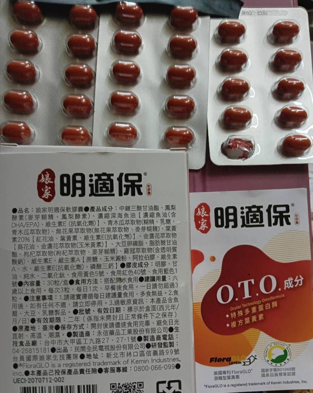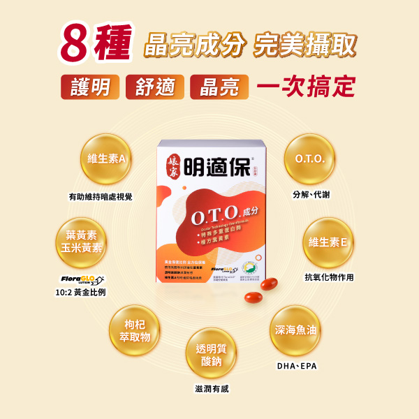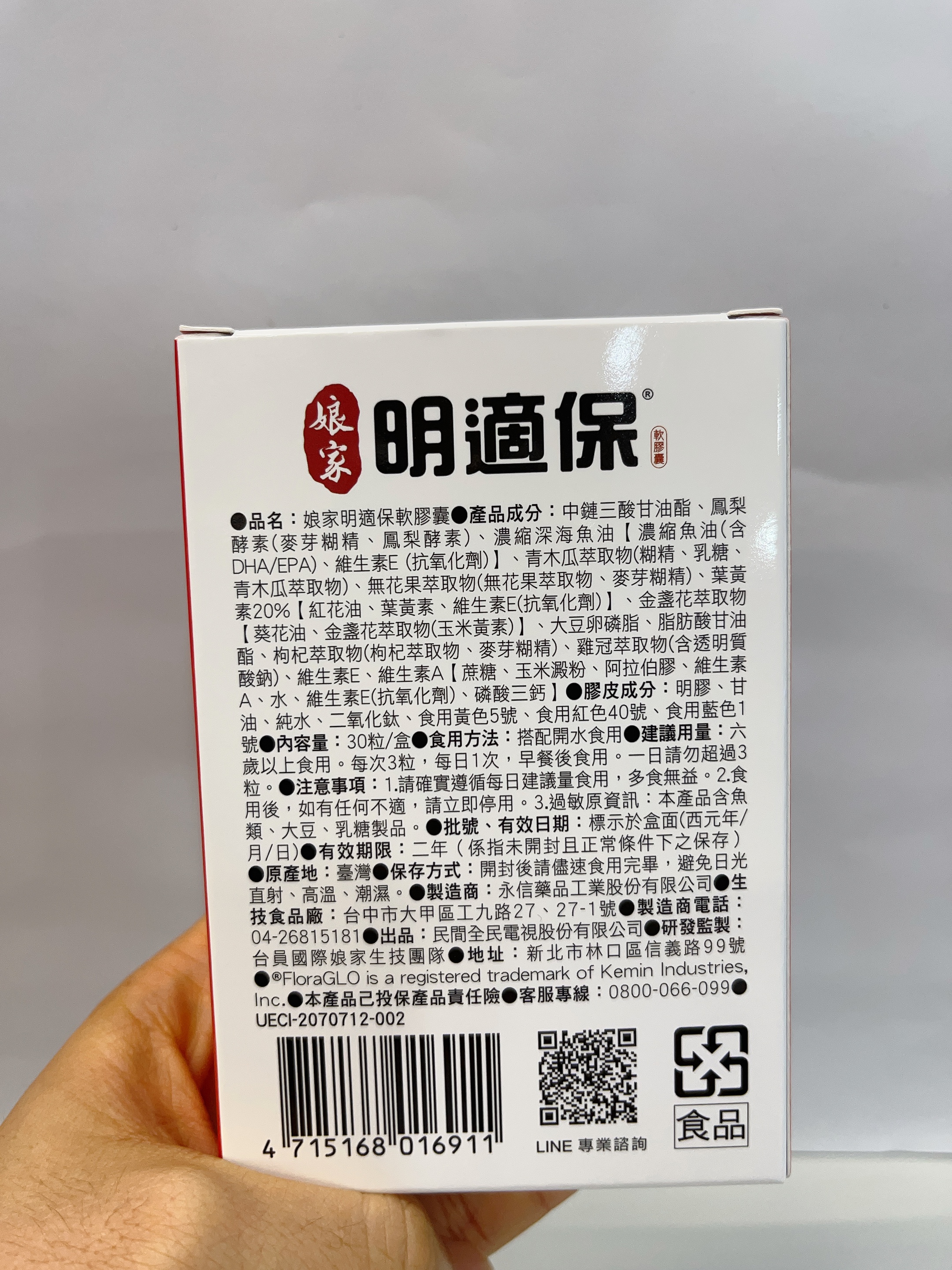 產品成分:中鏈三酸甘油酯、鳳梨酵素(麥芽糊精、鳳梨酵素)、濃縮深海魚油【濃縮魚油(含DHA/EPA)、維生素 E (抗氧化劑)】、青木瓜萃取物(糊精、乳糖、青木瓜萃取物)、無花果萃取物(無花果萃取物、麥芽糊精)、葉黃素20%【紅花油、葉黃素、維生素E(抗氧化劑)】、金盞花萃取物【葵花油、金盞花萃取物(玉米黃素)】、大豆卵磷脂、脂肪酸甘油酯 、枸杞萃取物(枸杞萃取物、麥芽糊精)、雞冠萃取物(含玻尿酸)、維生素E、維生素A【蔗糖、玉米澱粉、阿拉伯膠、維生素A、水、維生素E(抗氧化劑)、磷酸三鈣】