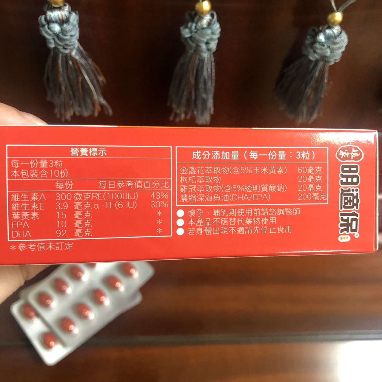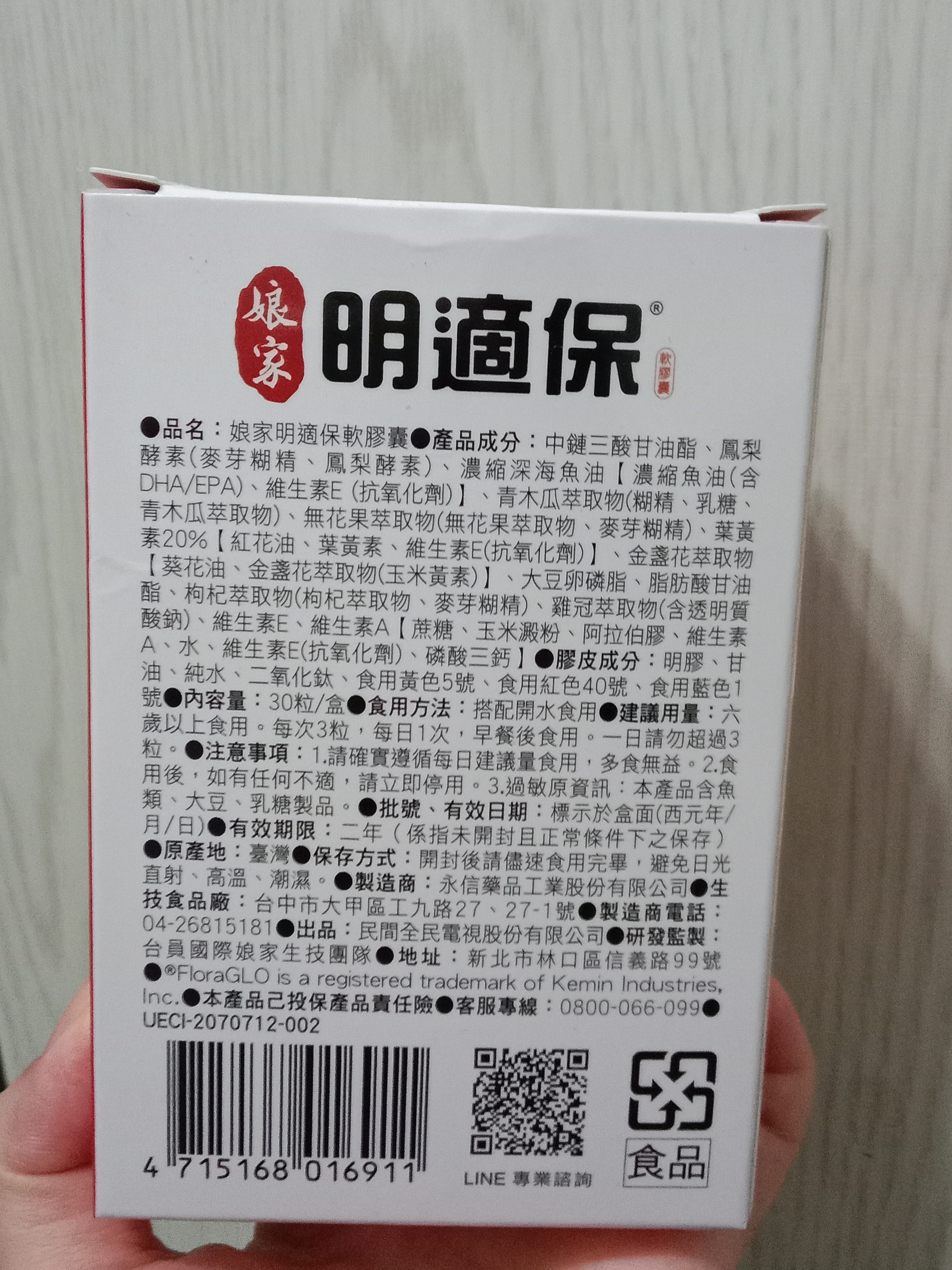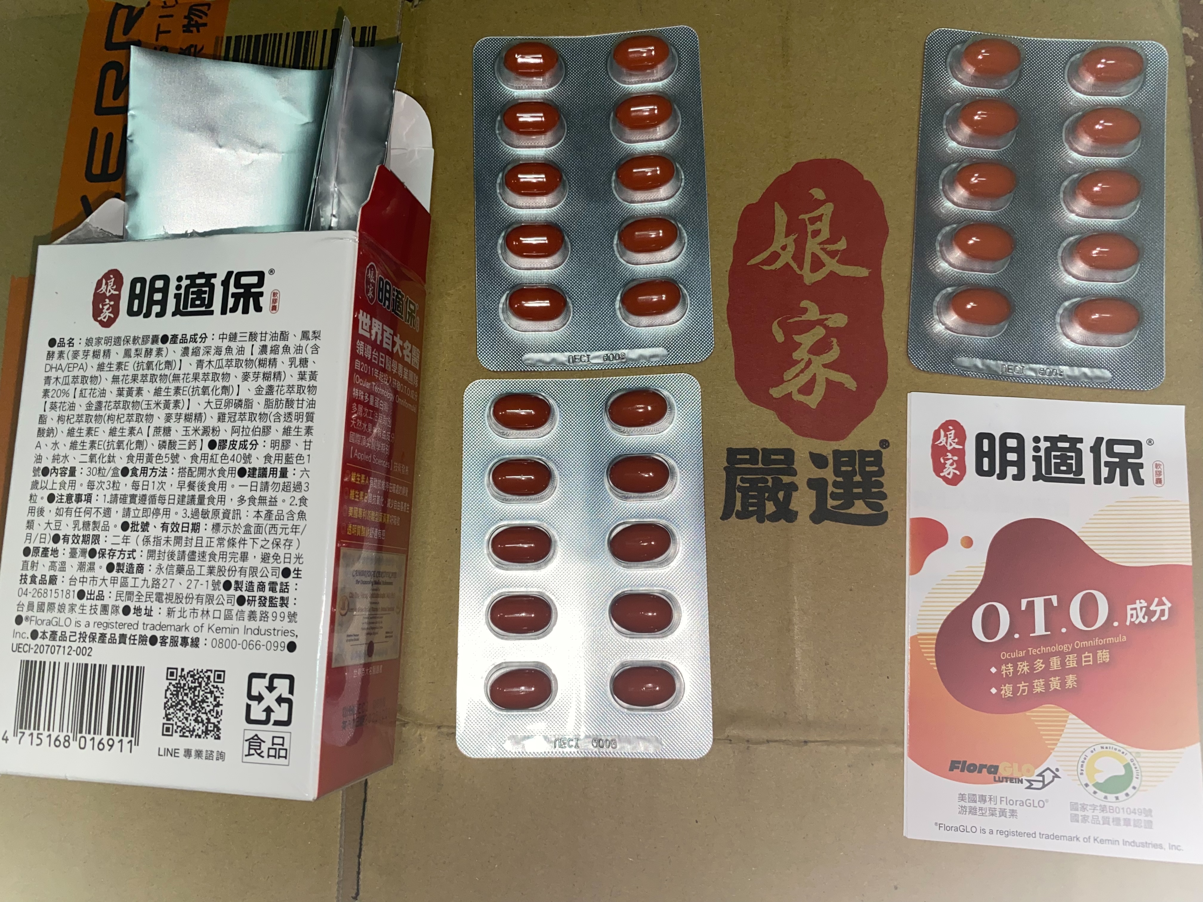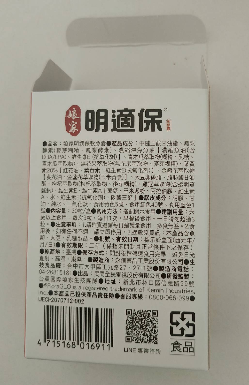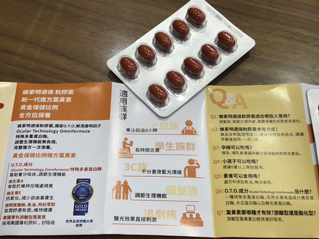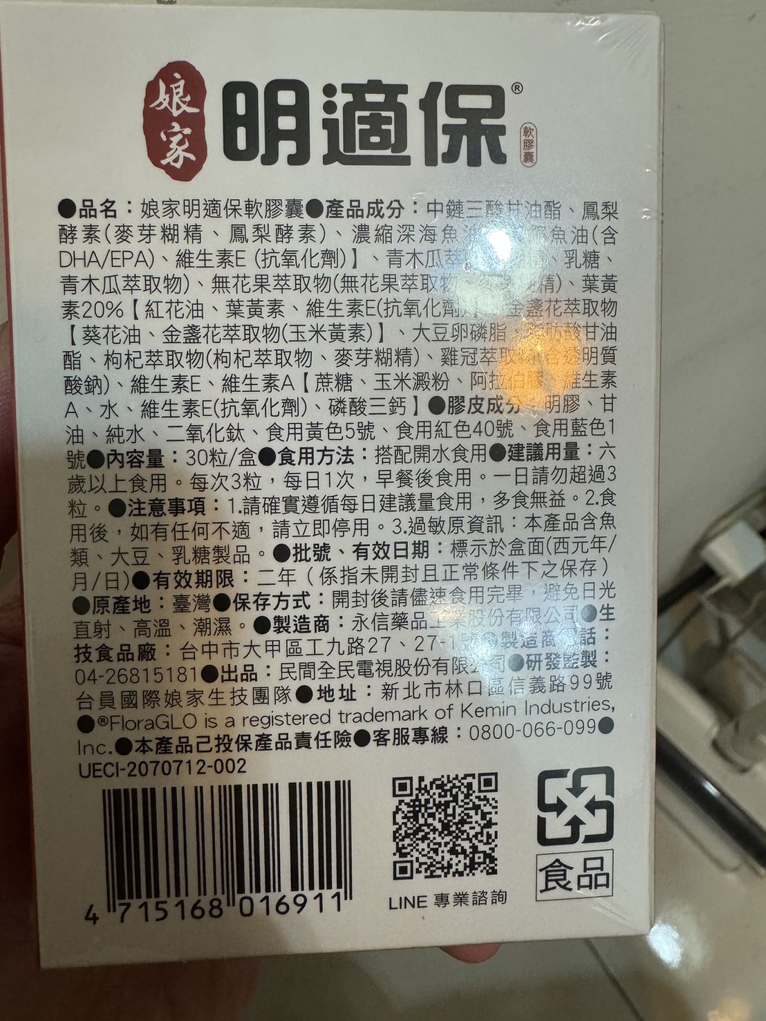 產品成分:中鏈三酸甘油酯、鳳梨酵素(麥芽糊精、鳳梨酵素)、濃縮深海魚油【濃縮魚油(含DHA/EPA)、維生素 E (抗氧化劑)】、青木瓜萃取物(糊精、乳糖、青木瓜萃取物)、無花果萃取物(無花果萃取物、麥芽糊精)、葉黃素20%【紅花油、葉黃素、維生素E(抗氧化劑)】、金盞花萃取物【葵花油、金盞花萃取物(玉米黃素)】、大豆卵磷脂、脂肪酸甘油酯 、枸杞萃取物(枸杞萃取物、麥芽糊精)、雞冠萃取物(含玻尿酸)、維生素E、維生素A【蔗糖、玉米澱粉、阿拉伯膠、維生素A、水、維生素E(抗氧化劑)、磷酸三鈣】