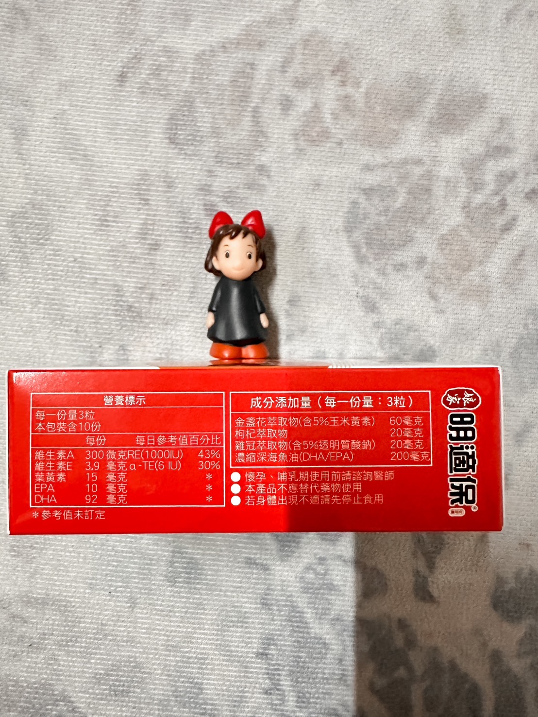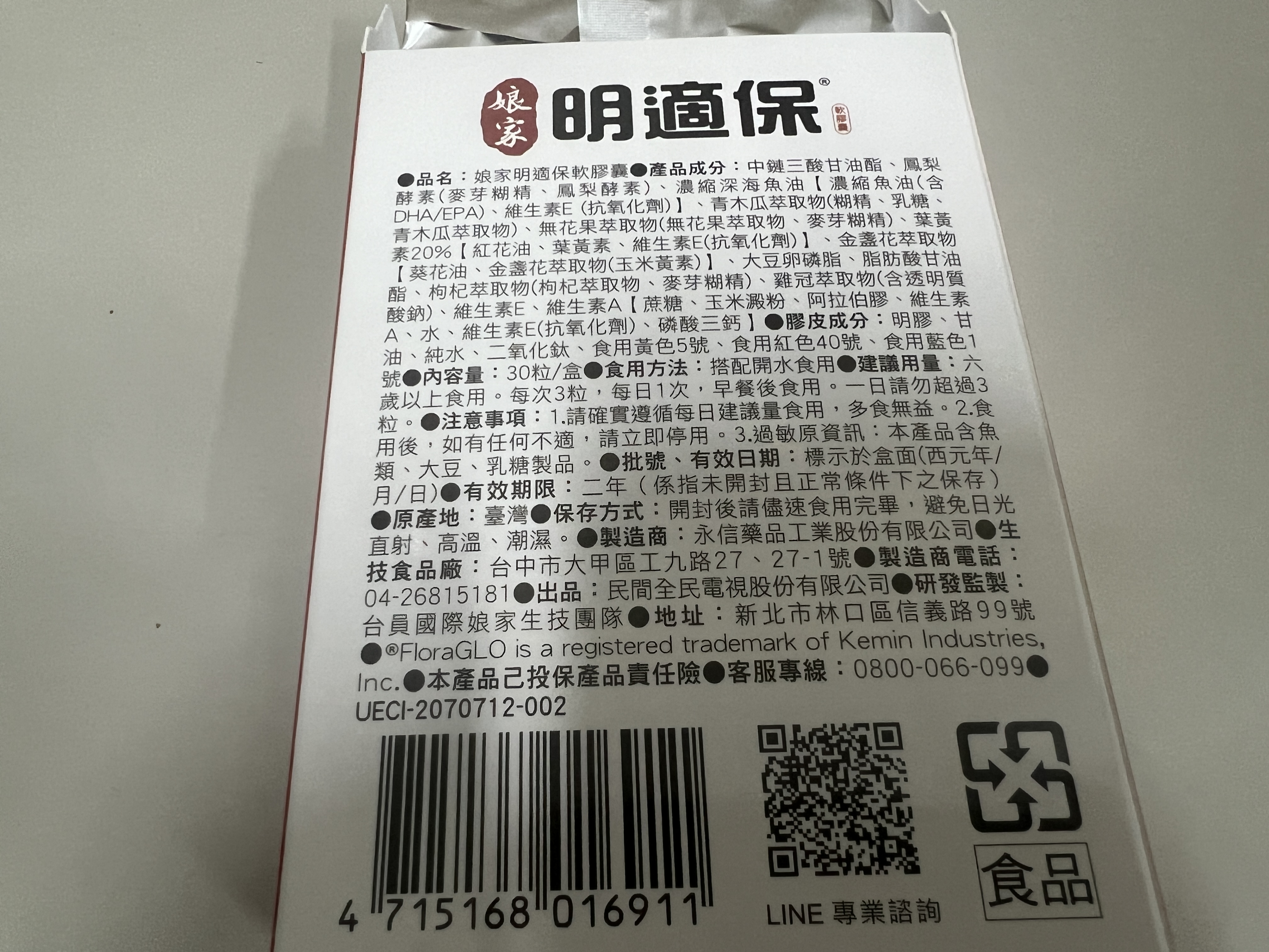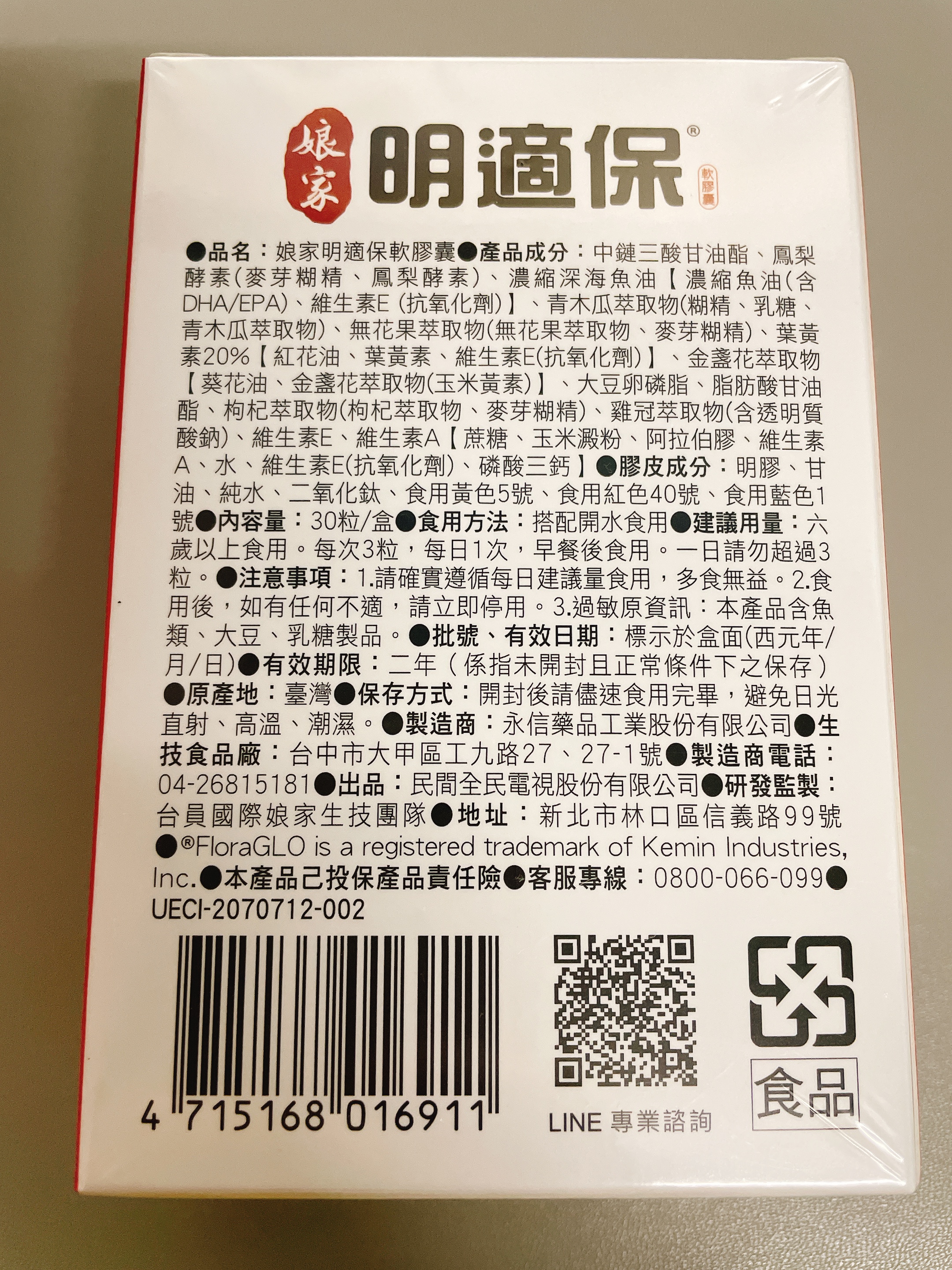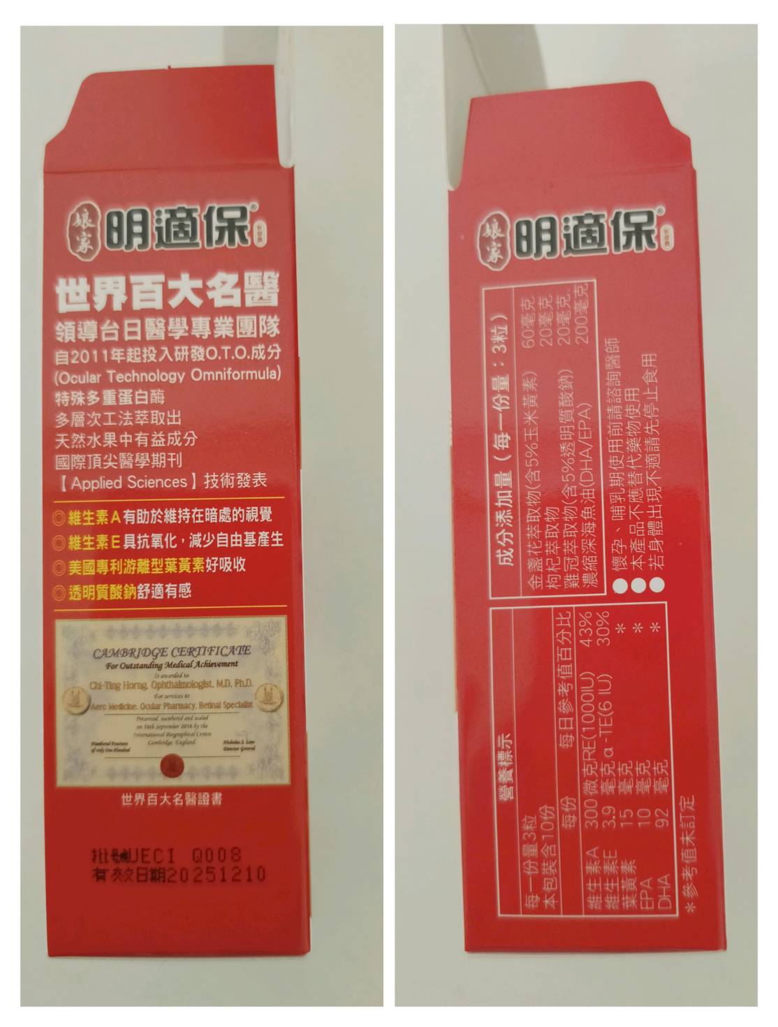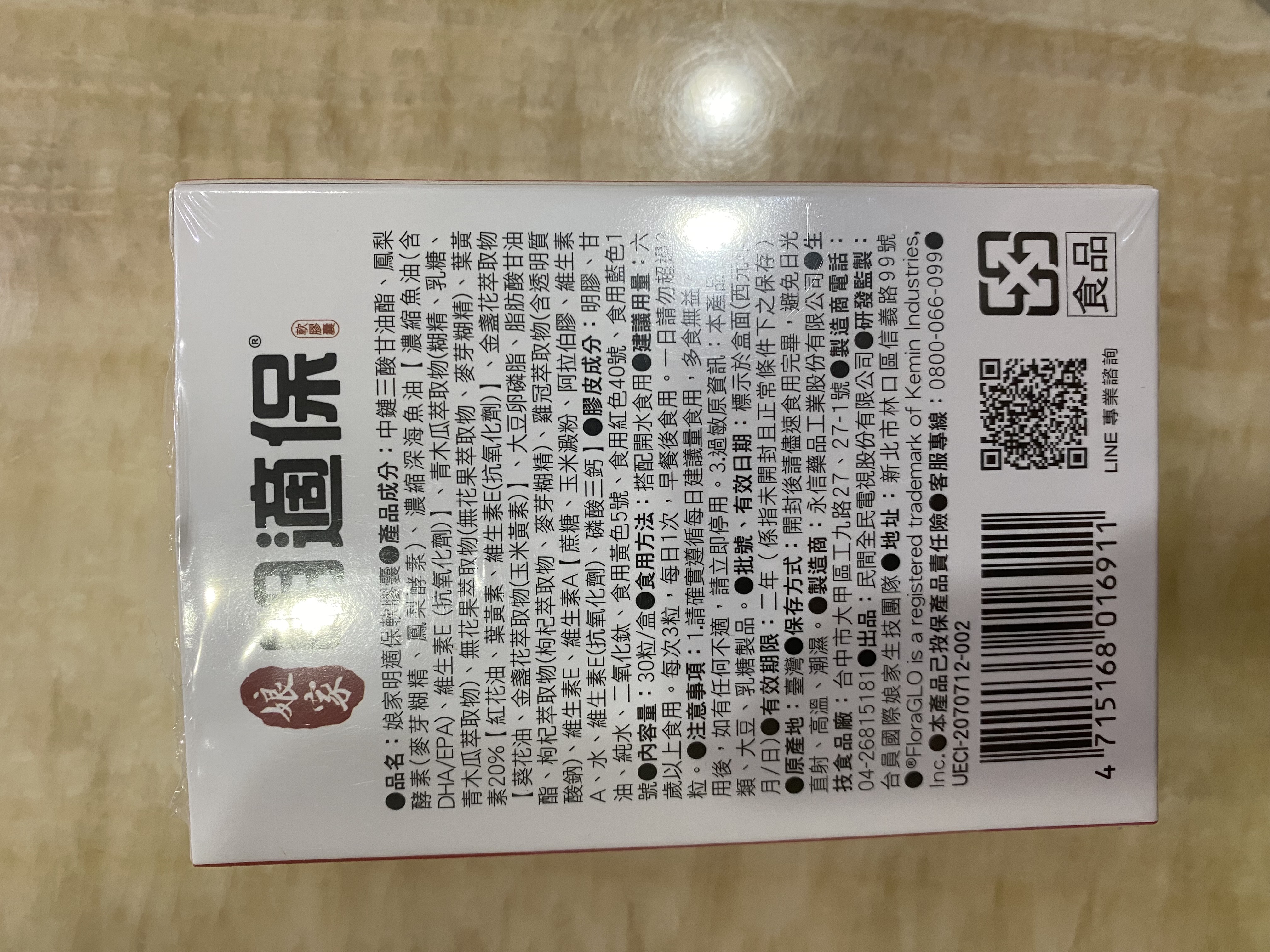 產品成分:中鏈三酸甘油酯、鳳梨酵素(麥芽糊精、鳳梨酵素)、濃縮深海魚油【濃縮魚油(含DHA/EPA)、維生素 E (抗氧化劑)】、青木瓜萃取物(糊精、乳糖、青木瓜萃取物)、無花果萃取物(無花果萃取物、麥芽糊精)、葉黃素20%【紅花油、葉黃素、維生素E(抗氧化劑)】、金盞花萃取物【葵花油、金盞花萃取物(玉米黃素)】、大豆卵磷脂、脂肪酸甘油酯 、枸杞萃取物(枸杞萃取物、麥芽糊精)、雞冠萃取物(含玻尿酸)、維生素E、維生素A【蔗糖、玉米澱粉、阿拉伯膠、維生素A、水、維生素E(抗氧化劑)、磷酸三鈣】