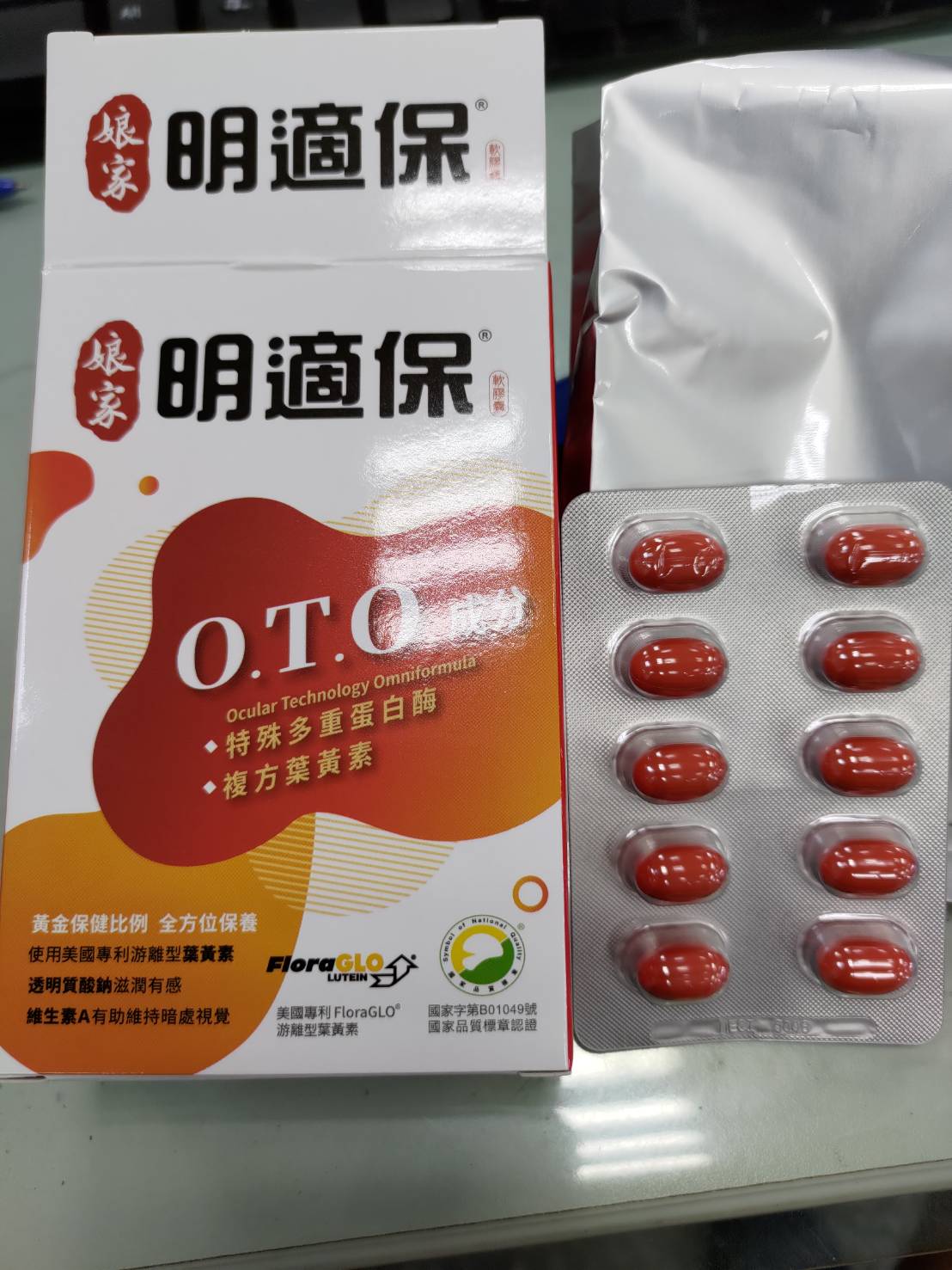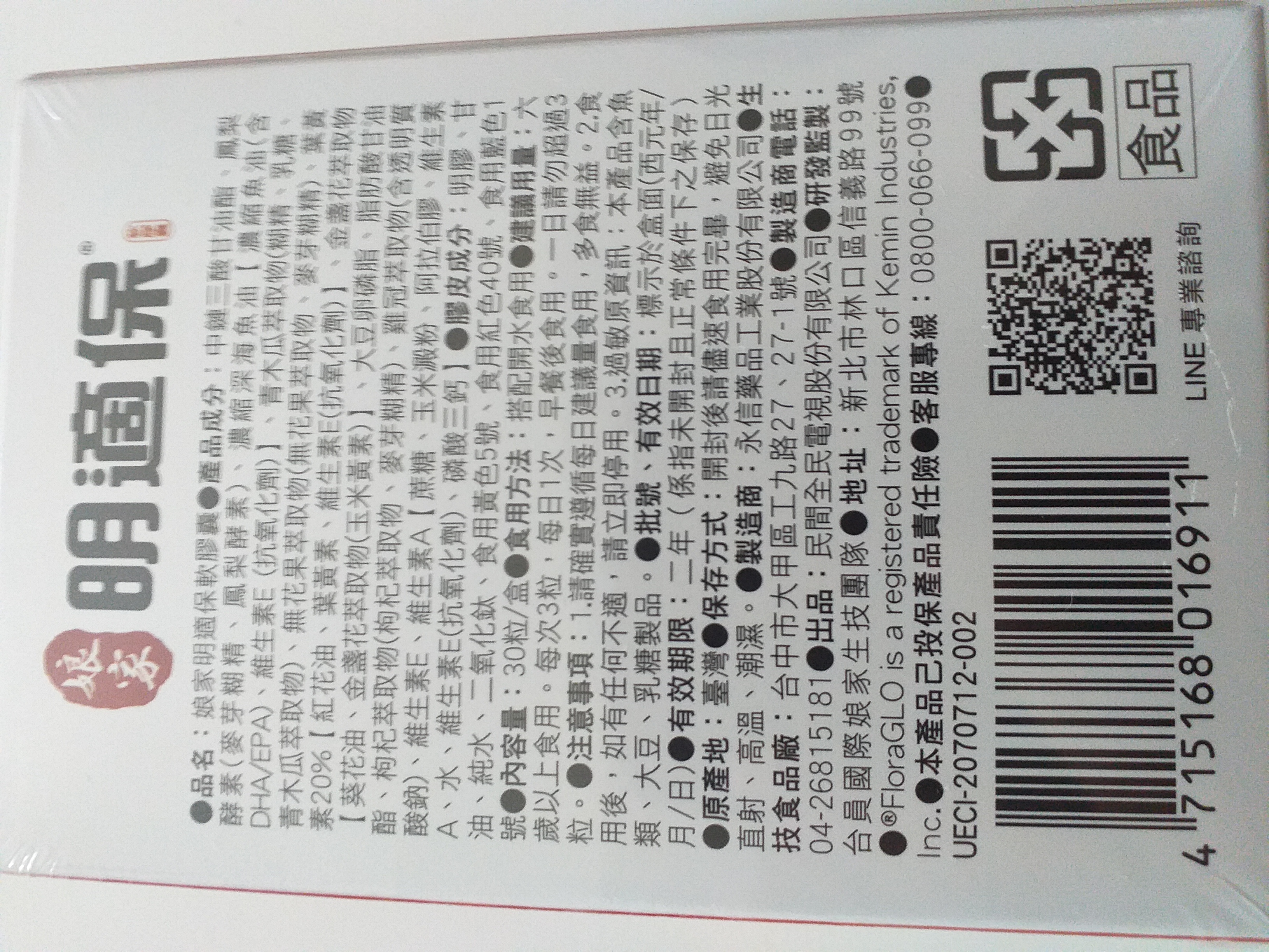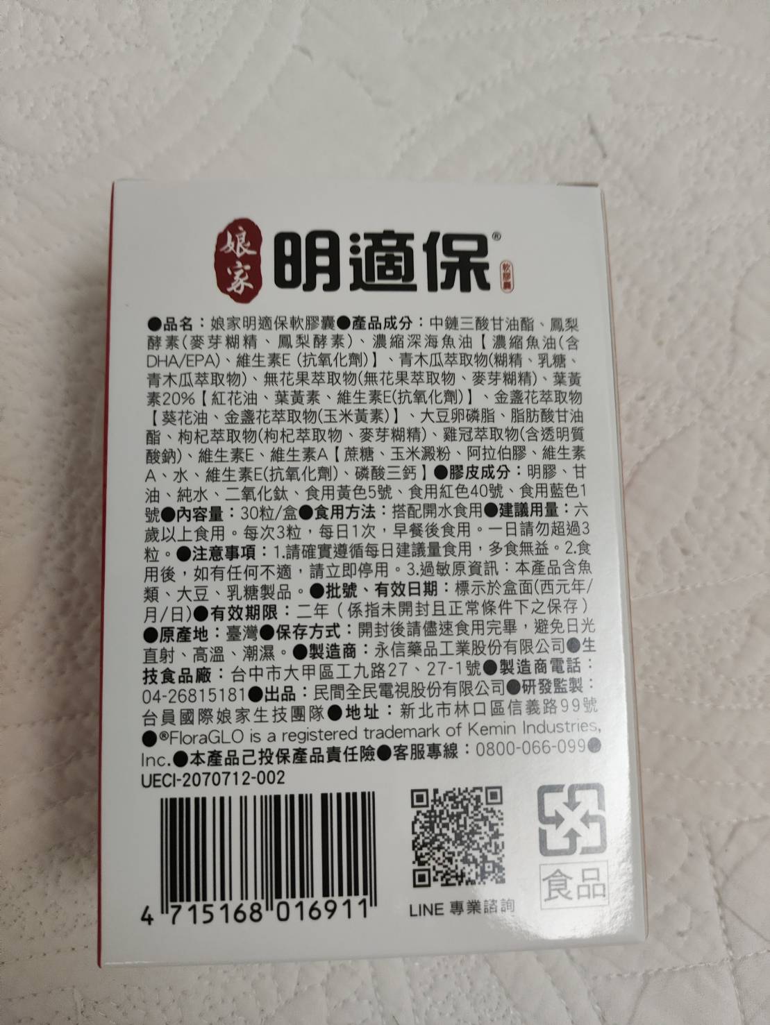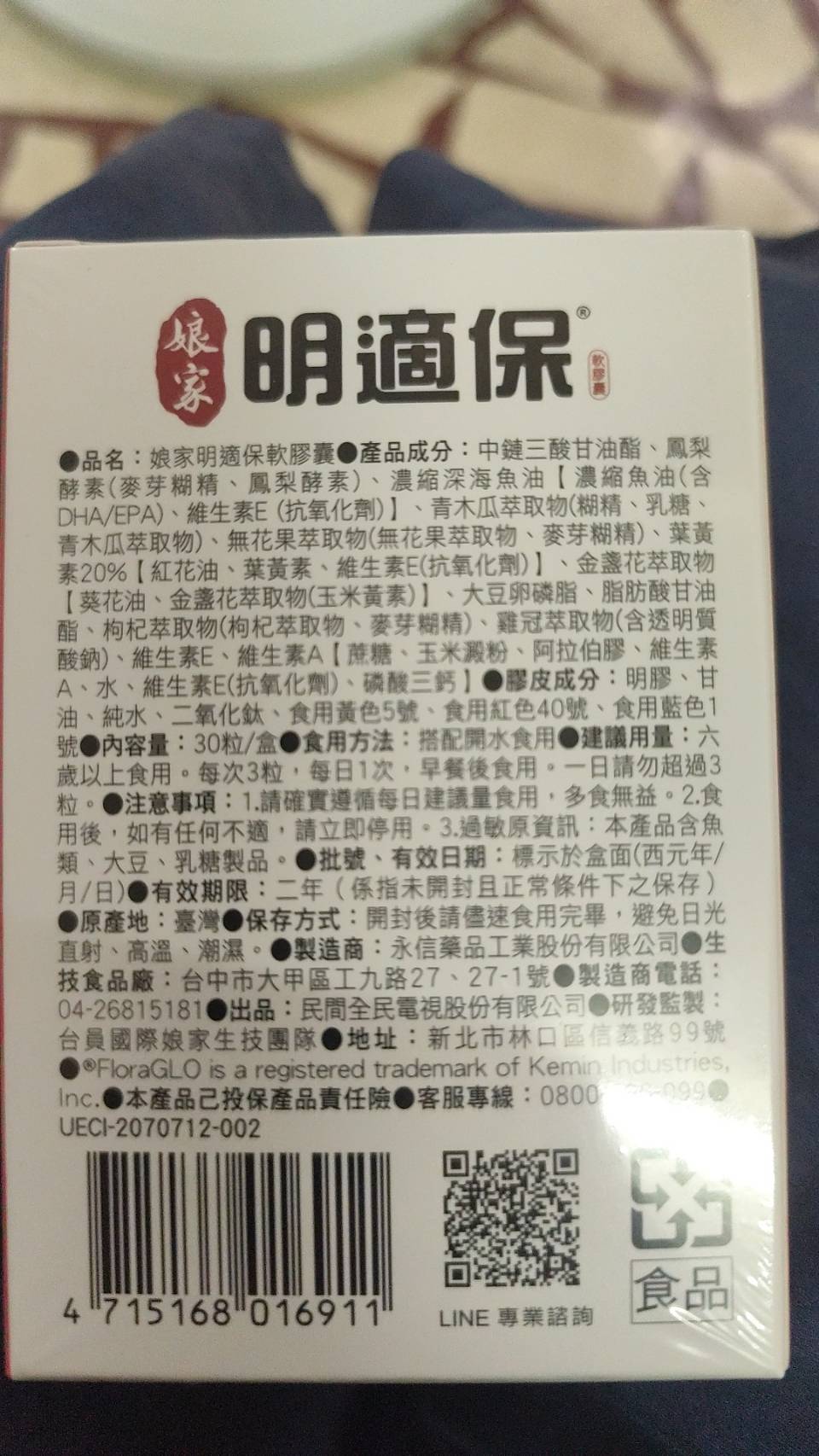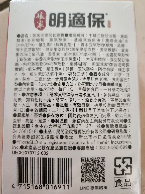 產品成分:中鏈三酸甘油酯、鳳梨酵素(麥芽糊精、鳳梨酵素)、濃縮深海魚油【濃縮魚油(含DHA/EPA)、維生素 E (抗氧化劑)】、青木瓜萃取物(糊精、乳糖、青木瓜萃取物)、無花果萃取物(無花果萃取物、麥芽糊精)、葉黃素20%【紅花油、葉黃素、維生素E(抗氧化劑)】、金盞花萃取物【葵花油、金盞花萃取物(玉米黃素)】、大豆卵磷脂、脂肪酸甘油酯 、枸杞萃取物(枸杞萃取物、麥芽糊精)、雞冠萃取物(含玻尿酸)、維生素E、維生素A【蔗糖、玉米澱粉、阿拉伯膠、維生素A、水、維生素E(抗氧化劑)、磷酸三鈣】