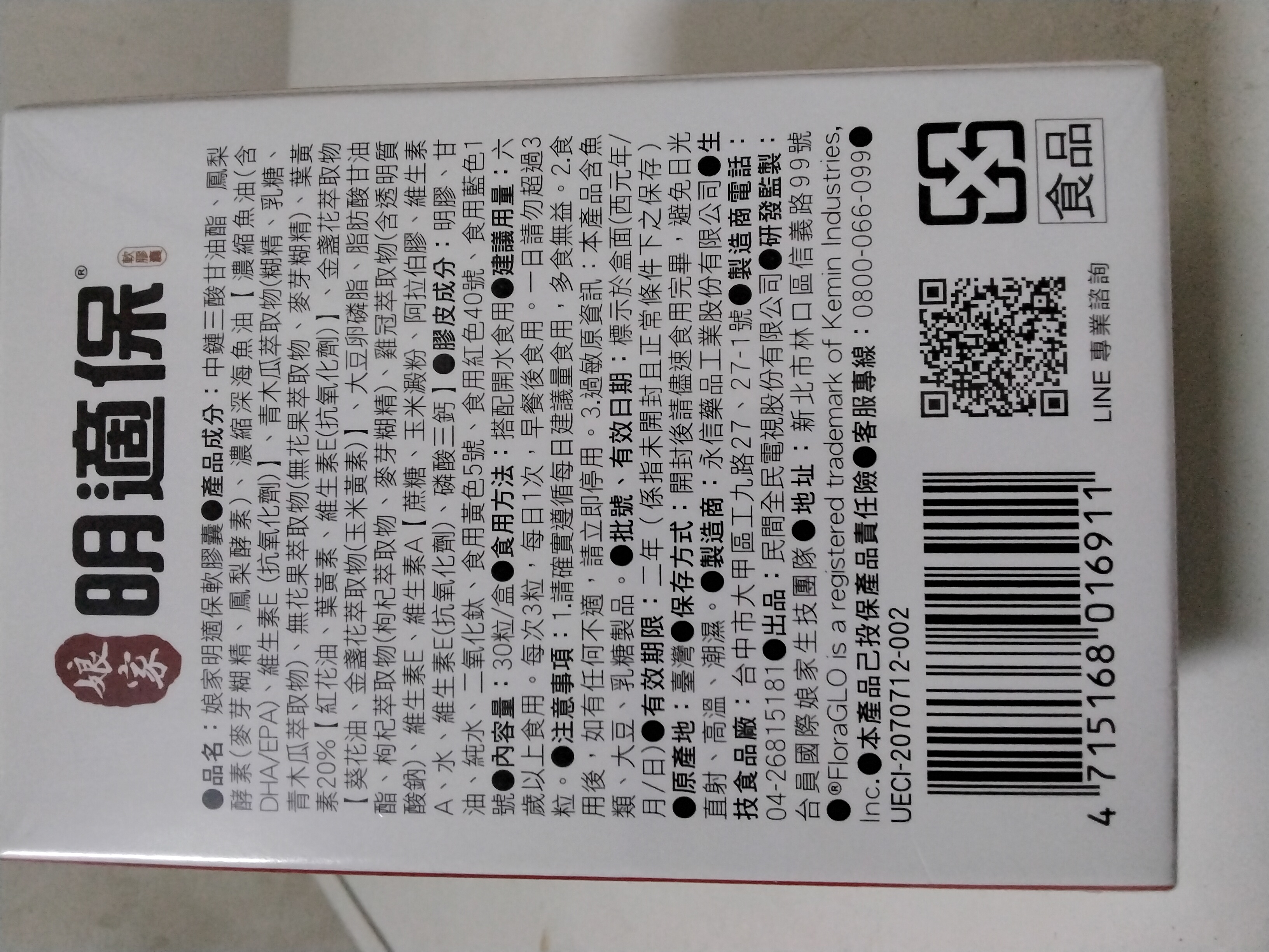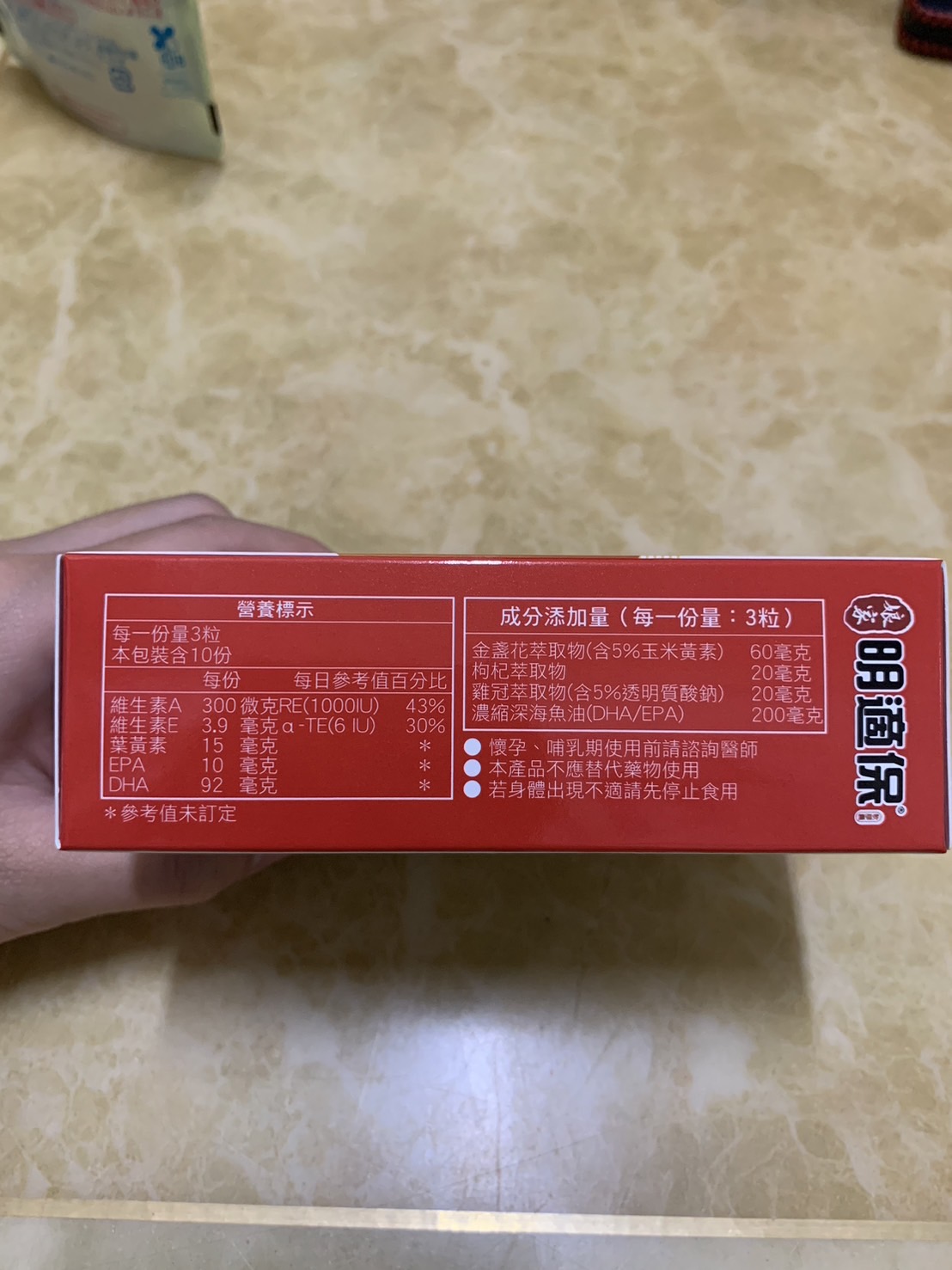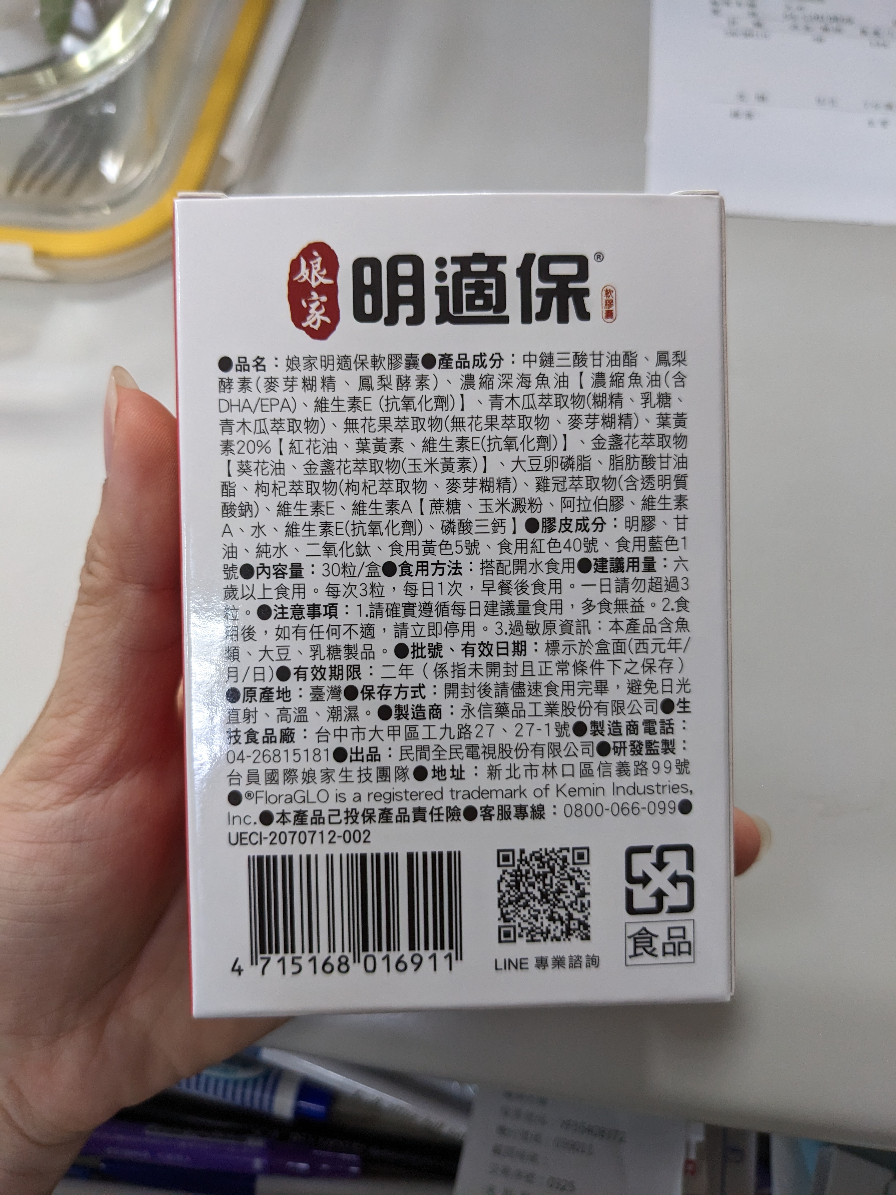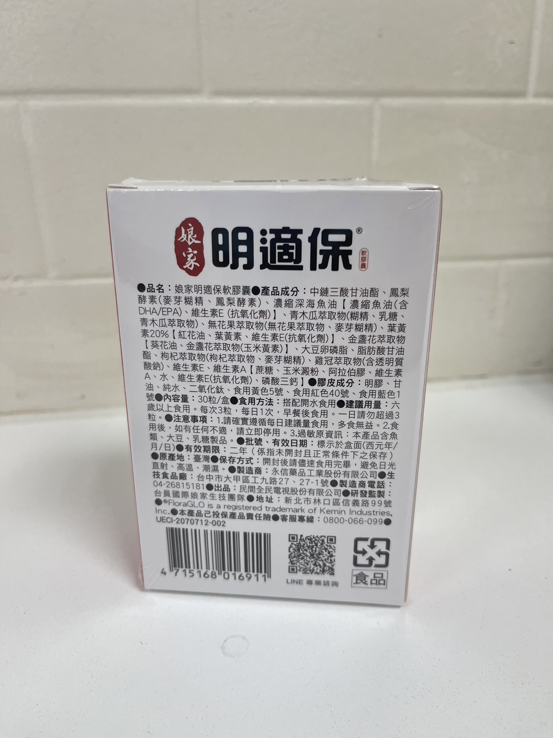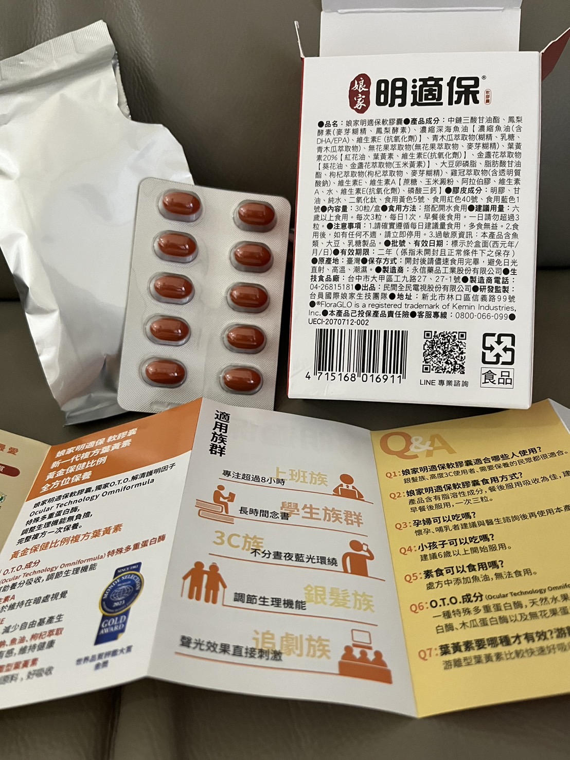 產品成分:中鏈三酸甘油酯、鳳梨酵素(麥芽糊精、鳳梨酵素)、濃縮深海魚油【濃縮魚油(含DHA/EPA)、維生素 E (抗氧化劑)】、青木瓜萃取物(糊精、乳糖、青木瓜萃取物)、無花果萃取物(無花果萃取物、麥芽糊精)、葉黃素20%【紅花油、葉黃素、維生素E(抗氧化劑)】、金盞花萃取物【葵花油、金盞花萃取物(玉米黃素)】、大豆卵磷脂、脂肪酸甘油酯 、枸杞萃取物(枸杞萃取物、麥芽糊精)、雞冠萃取物(含玻尿酸)、維生素E、維生素A【蔗糖、玉米澱粉、阿拉伯膠、維生素A、水、維生素E(抗氧化劑)、磷酸三鈣】