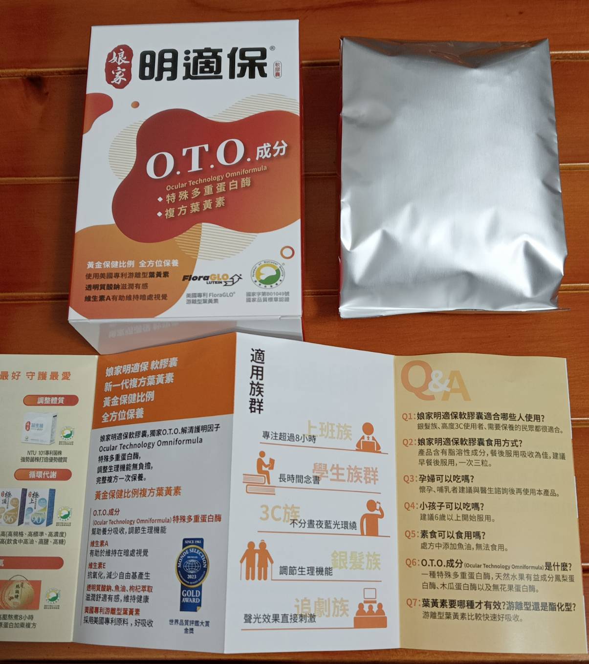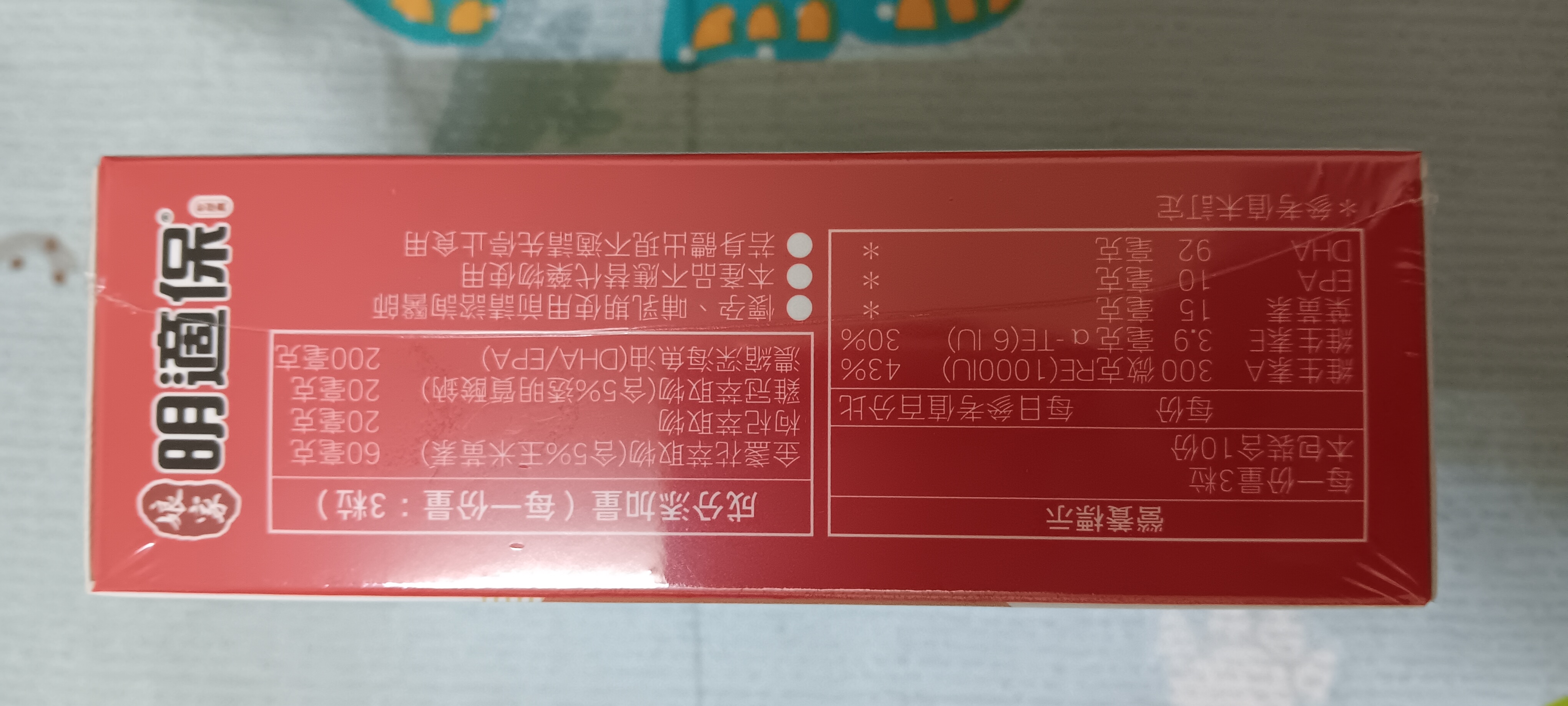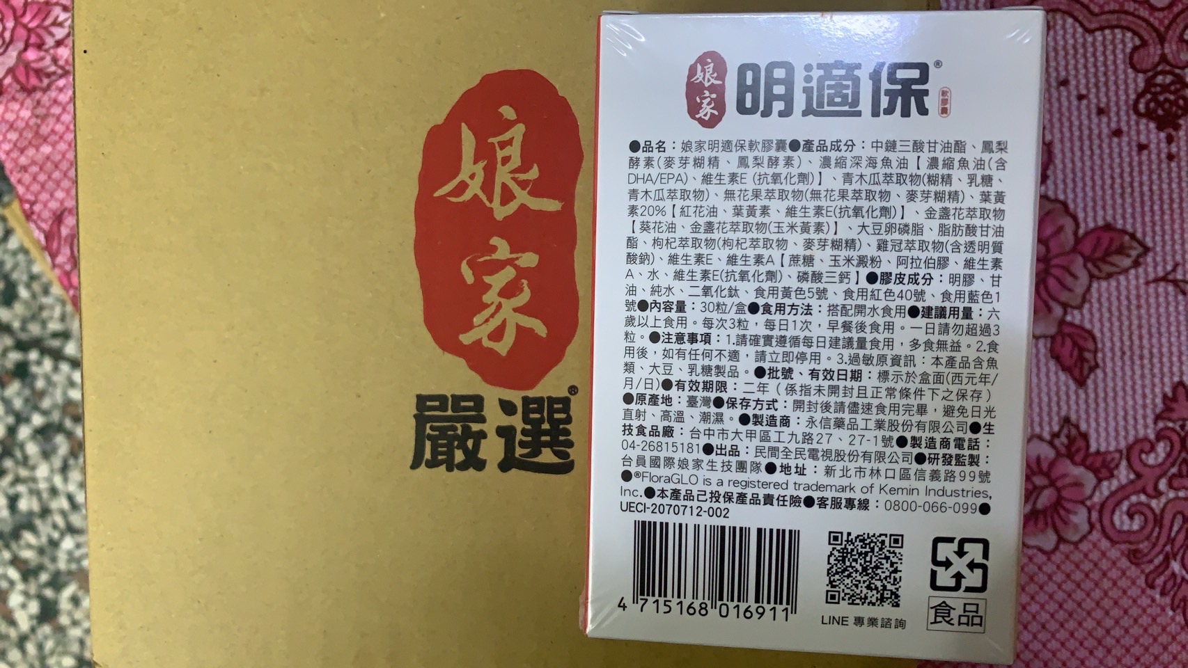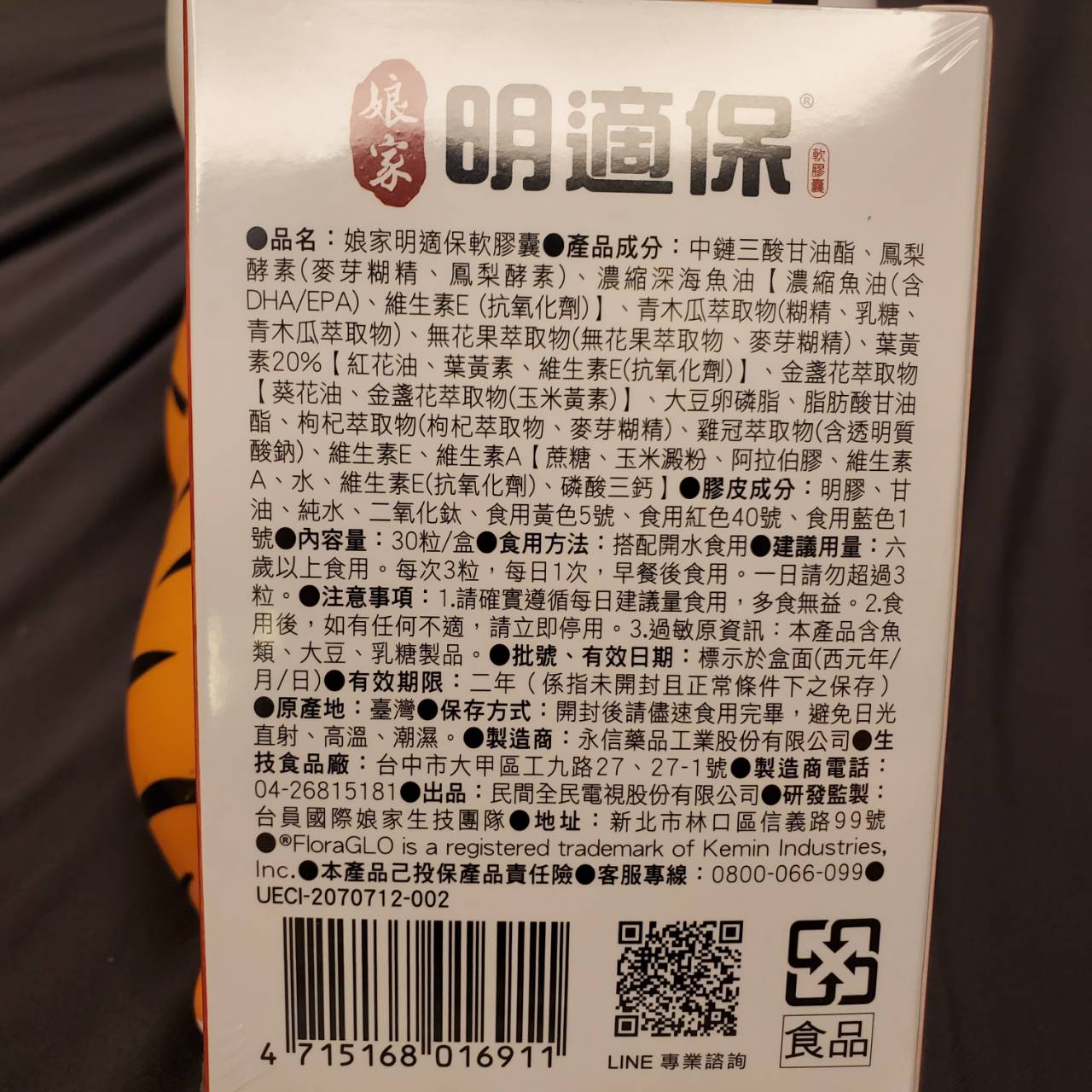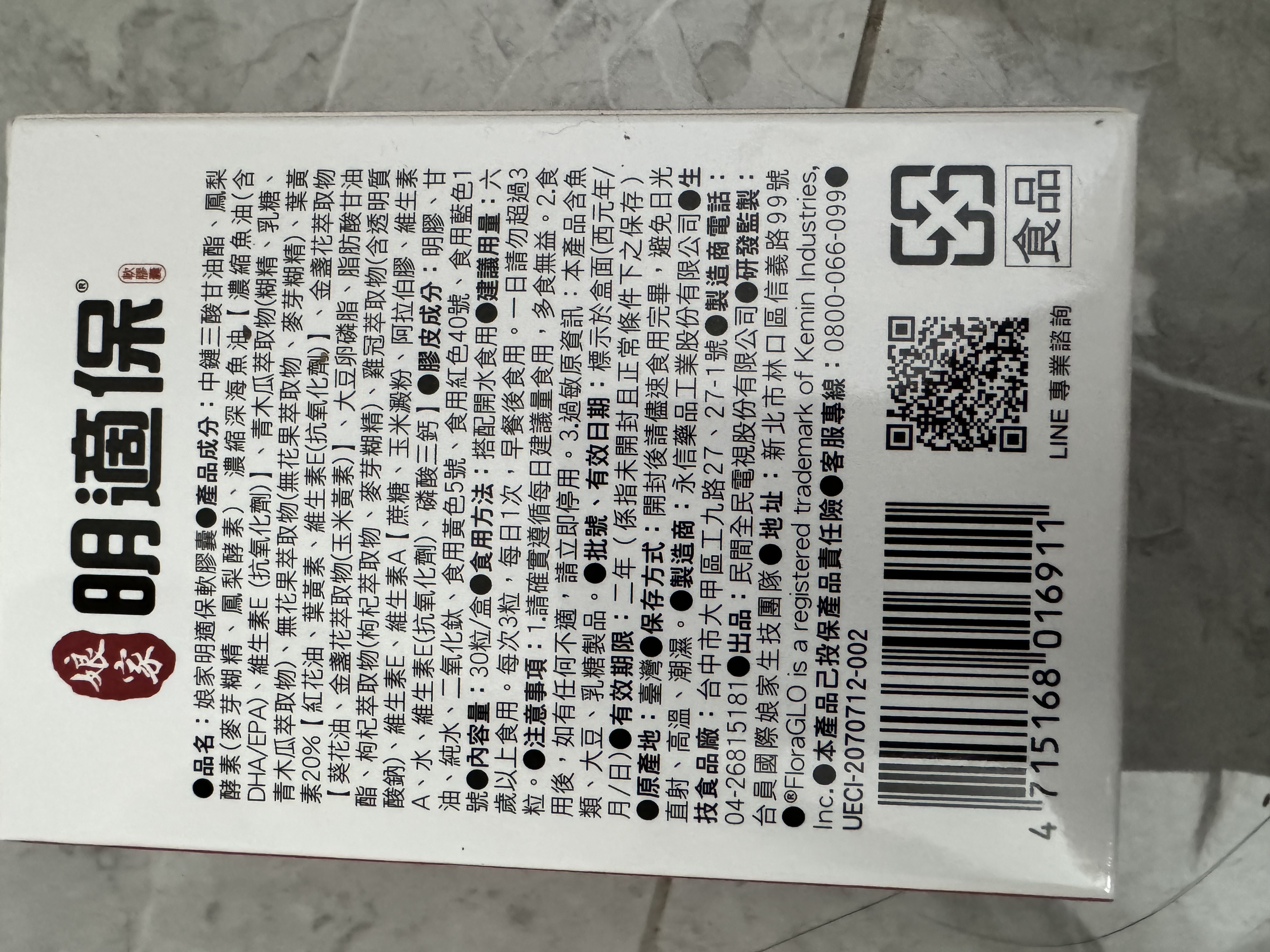 產品成分:中鏈三酸甘油酯、鳳梨酵素(麥芽糊精、鳳梨酵素)、濃縮深海魚油【濃縮魚油(含DHA/EPA)、維生素 E (抗氧化劑)】、青木瓜萃取物(糊精、乳糖、青木瓜萃取物)、無花果萃取物(無花果萃取物、麥芽糊精)、葉黃素20%【紅花油、葉黃素、維生素E(抗氧化劑)】、金盞花萃取物【葵花油、金盞花萃取物(玉米黃素)】、大豆卵磷脂、脂肪酸甘油酯 、枸杞萃取物(枸杞萃取物、麥芽糊精)、雞冠萃取物(含玻尿酸)、維生素E、維生素A【蔗糖、玉米澱粉、阿拉伯膠、維生素A、水、維生素E(抗氧化劑)、磷酸三鈣】