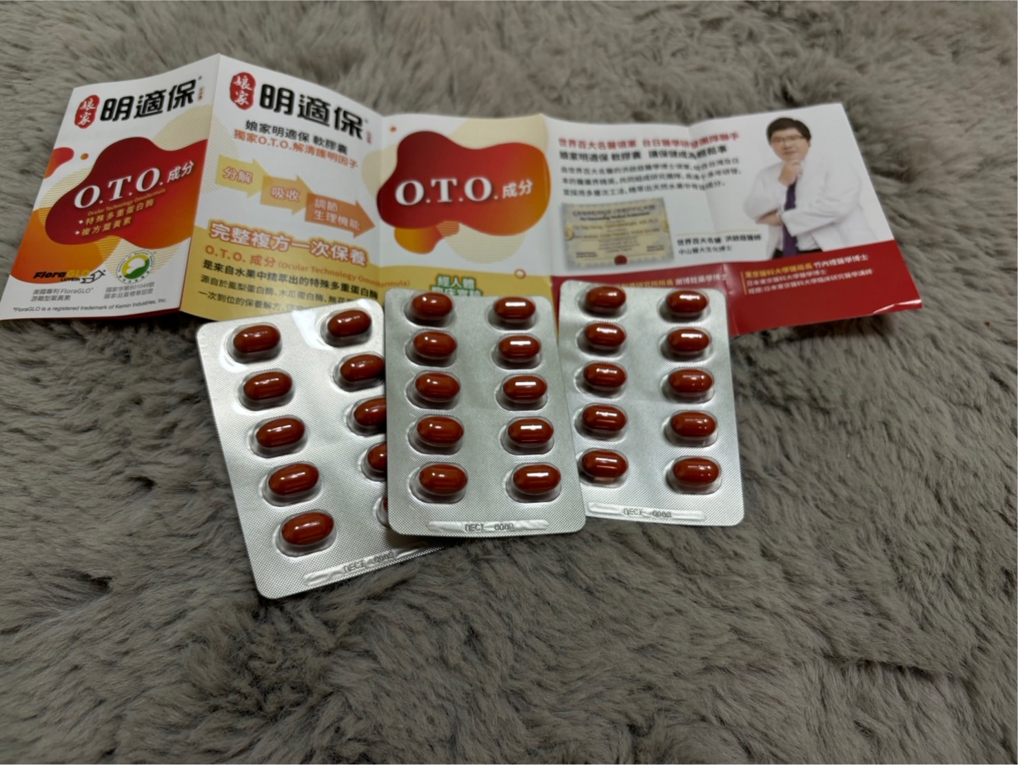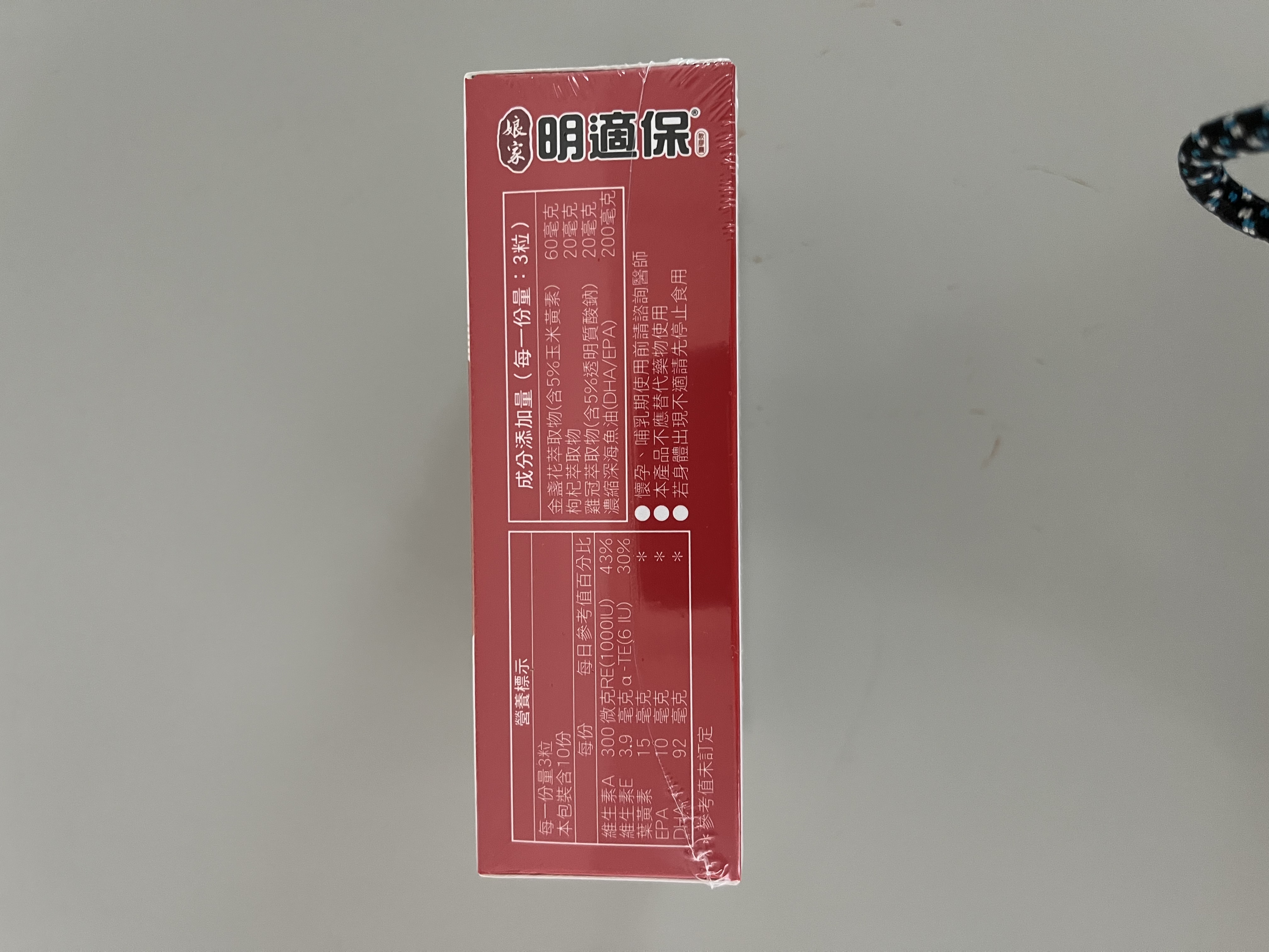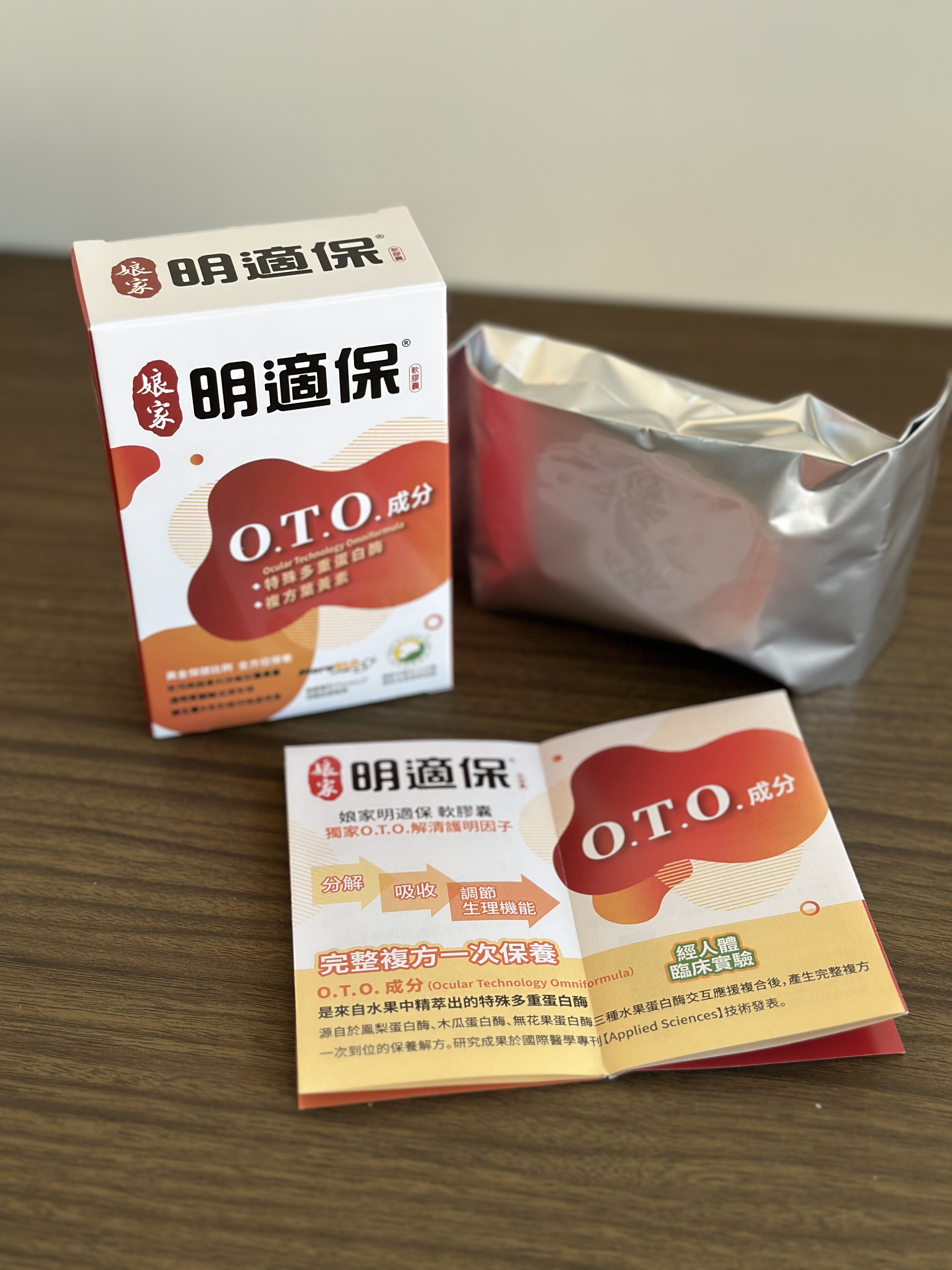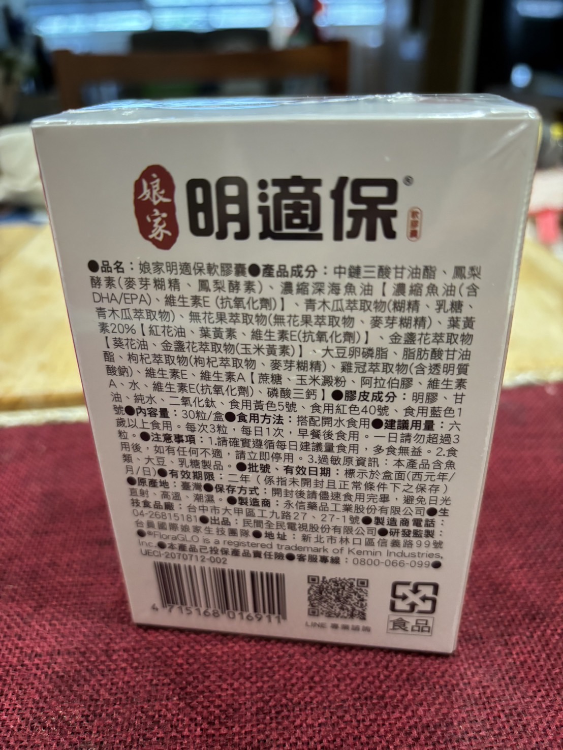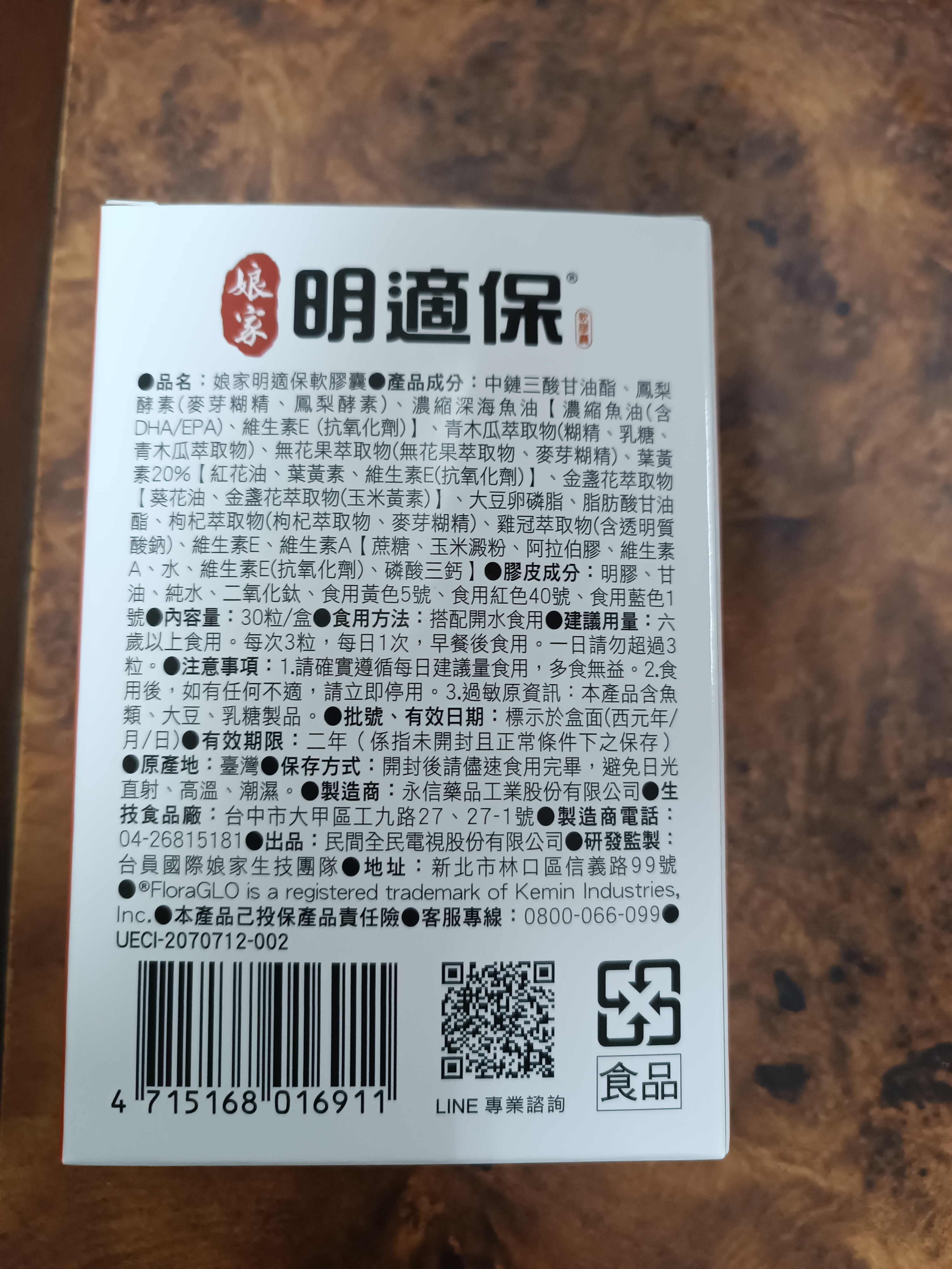 產品成分:中鏈三酸甘油酯、鳳梨酵素(麥芽糊精、鳳梨酵素)、濃縮深海魚油【濃縮魚油(含DHA/EPA)、維生素 E (抗氧化劑)】、青木瓜萃取物(糊精、乳糖、青木瓜萃取物)、無花果萃取物(無花果萃取物、麥芽糊精)、葉黃素20%【紅花油、葉黃素、維生素E(抗氧化劑)】、金盞花萃取物【葵花油、金盞花萃取物(玉米黃素)】、大豆卵磷脂、脂肪酸甘油酯 、枸杞萃取物(枸杞萃取物、麥芽糊精)、雞冠萃取物(含玻尿酸)、維生素E、維生素A【蔗糖、玉米澱粉、阿拉伯膠、維生素A、水、維生素E(抗氧化劑)、磷酸三鈣】