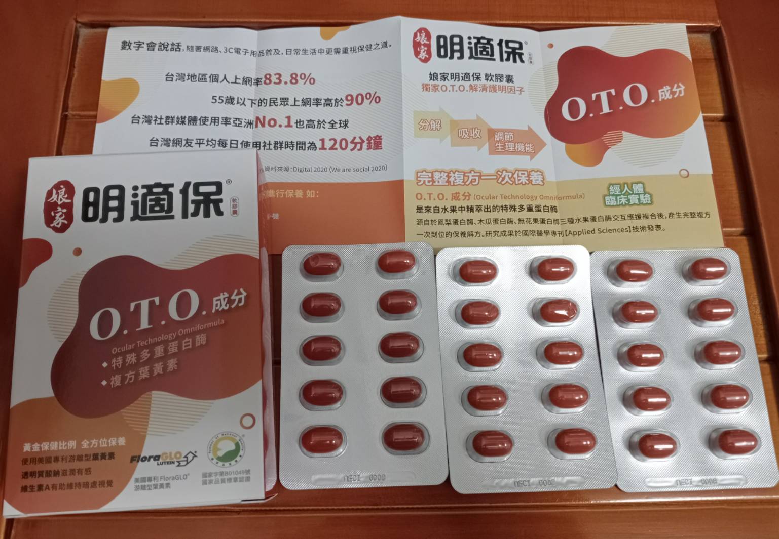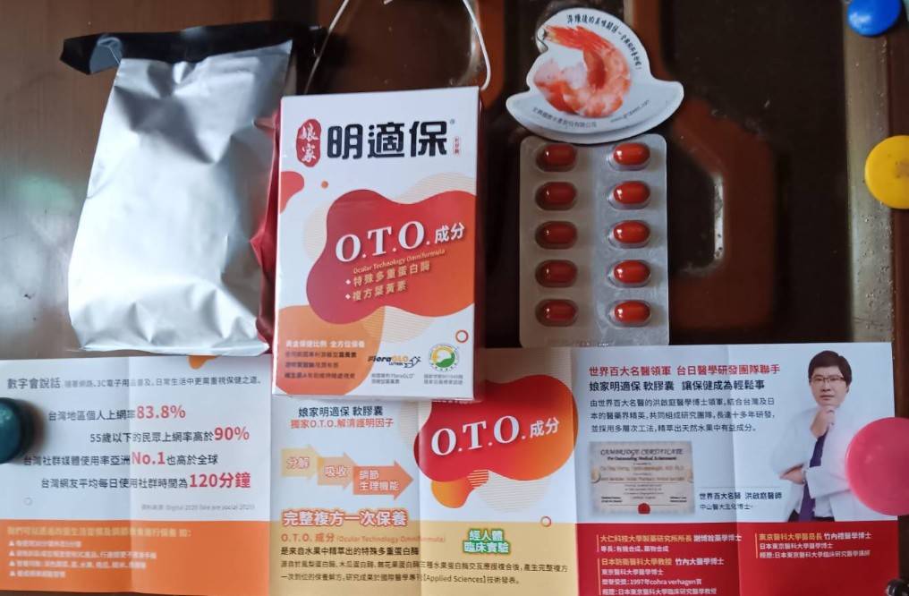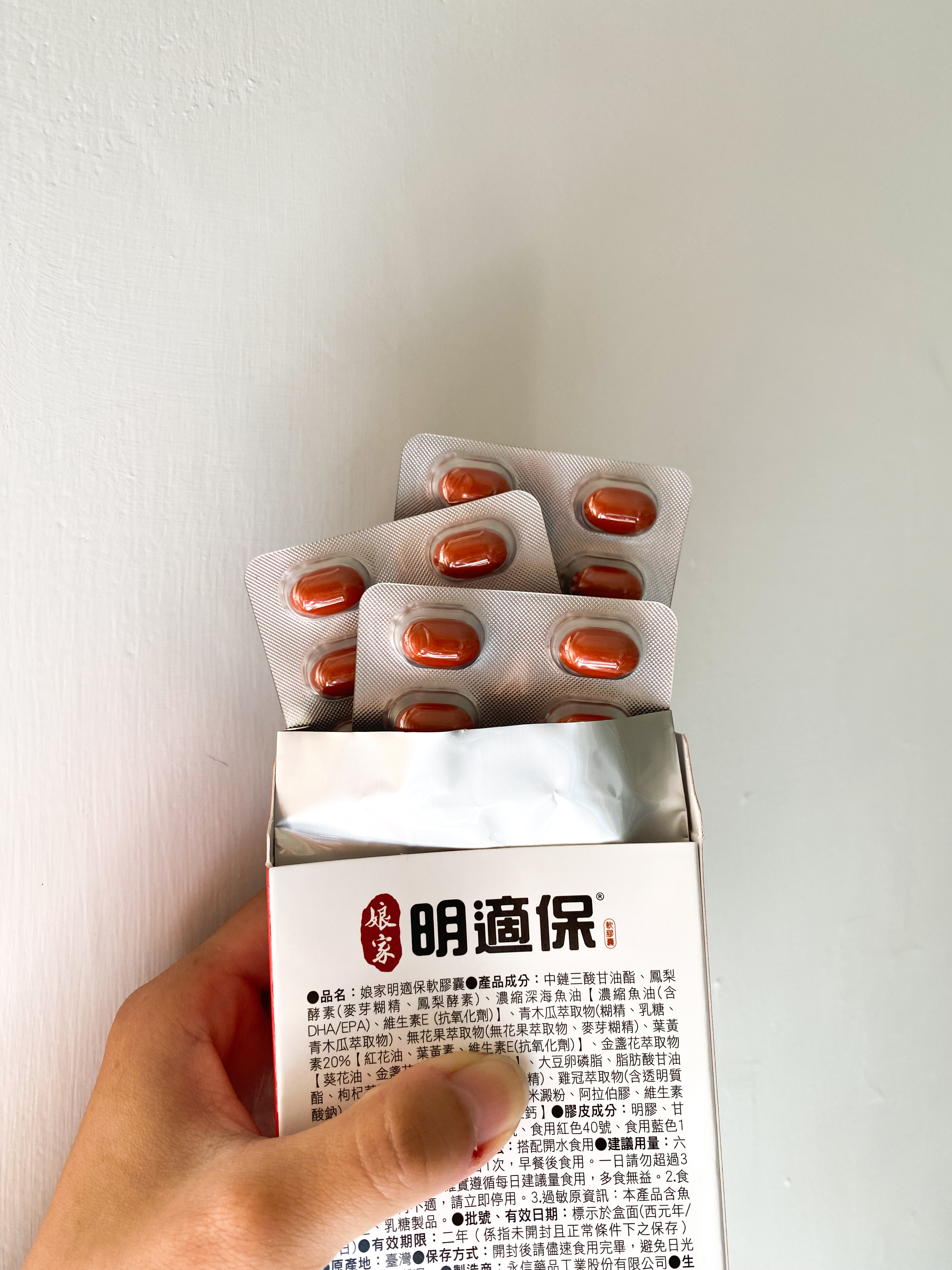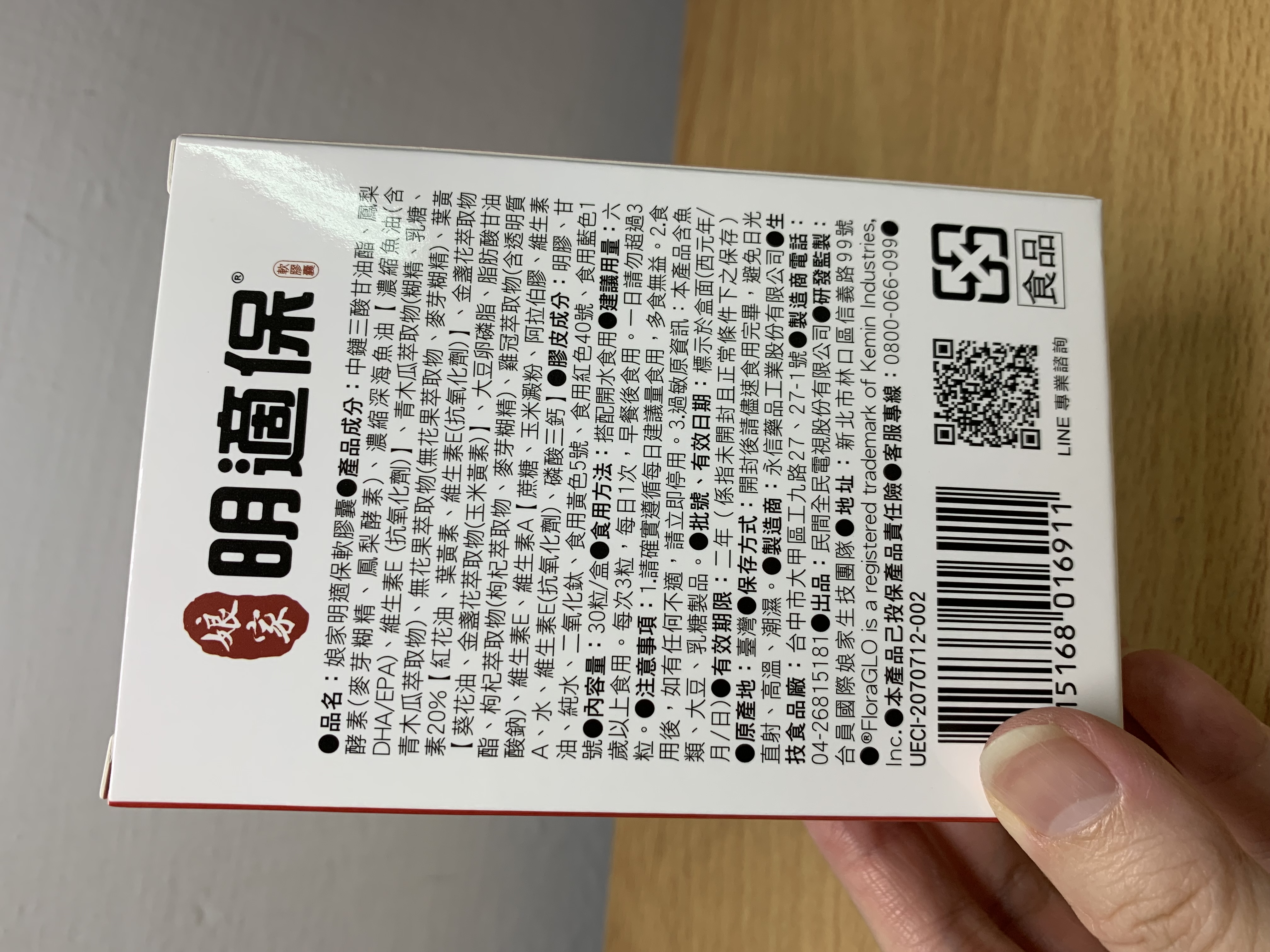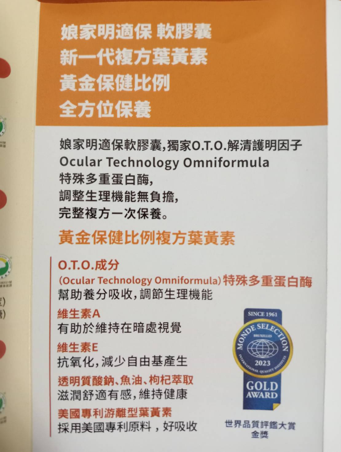 產品成分:中鏈三酸甘油酯、鳳梨酵素(麥芽糊精、鳳梨酵素)、濃縮深海魚油【濃縮魚油(含DHA/EPA)、維生素 E (抗氧化劑)】、青木瓜萃取物(糊精、乳糖、青木瓜萃取物)、無花果萃取物(無花果萃取物、麥芽糊精)、葉黃素20%【紅花油、葉黃素、維生素E(抗氧化劑)】、金盞花萃取物【葵花油、金盞花萃取物(玉米黃素)】、大豆卵磷脂、脂肪酸甘油酯 、枸杞萃取物(枸杞萃取物、麥芽糊精)、雞冠萃取物(含玻尿酸)、維生素E、維生素A【蔗糖、玉米澱粉、阿拉伯膠、維生素A、水、維生素E(抗氧化劑)、磷酸三鈣】