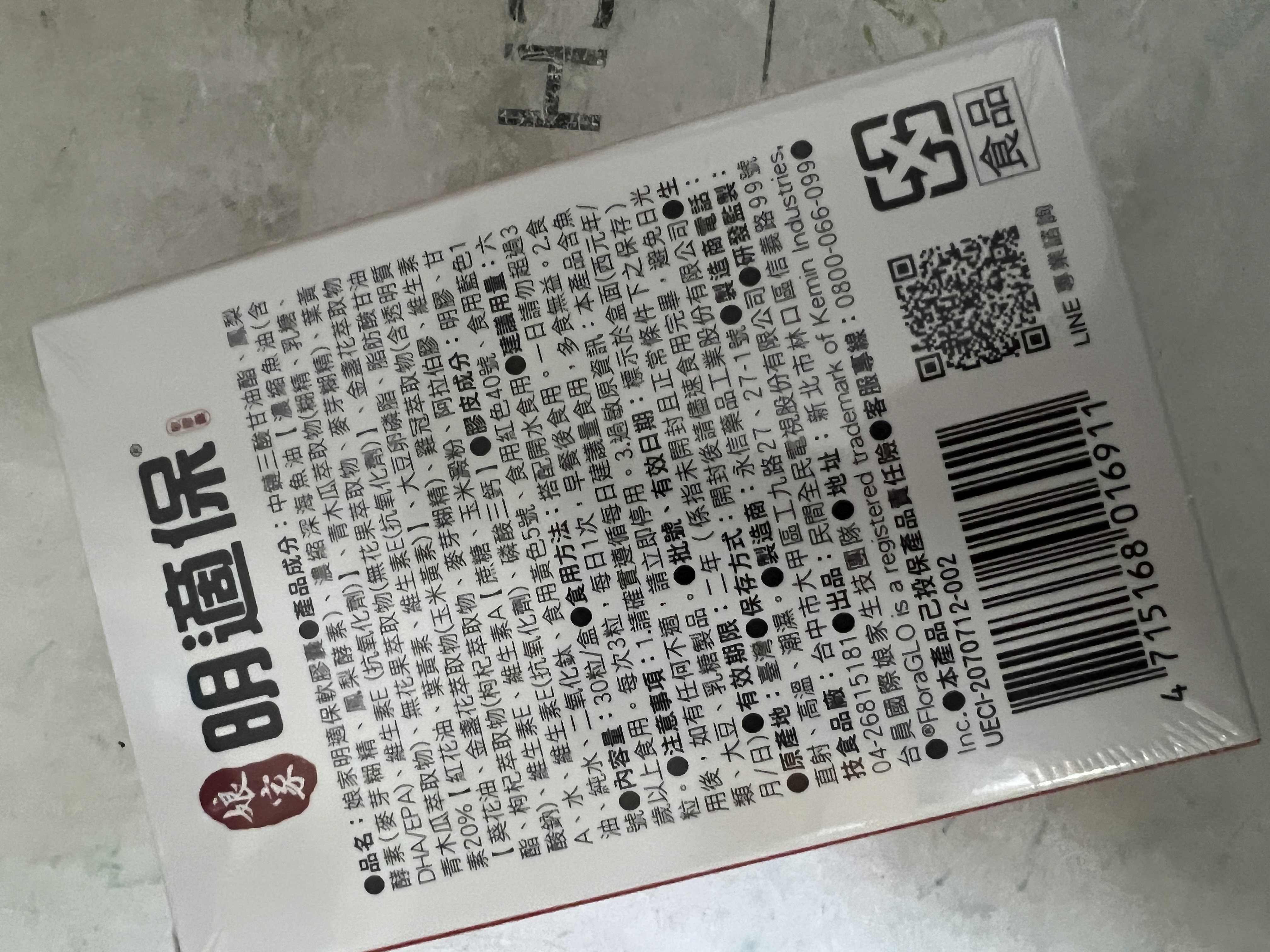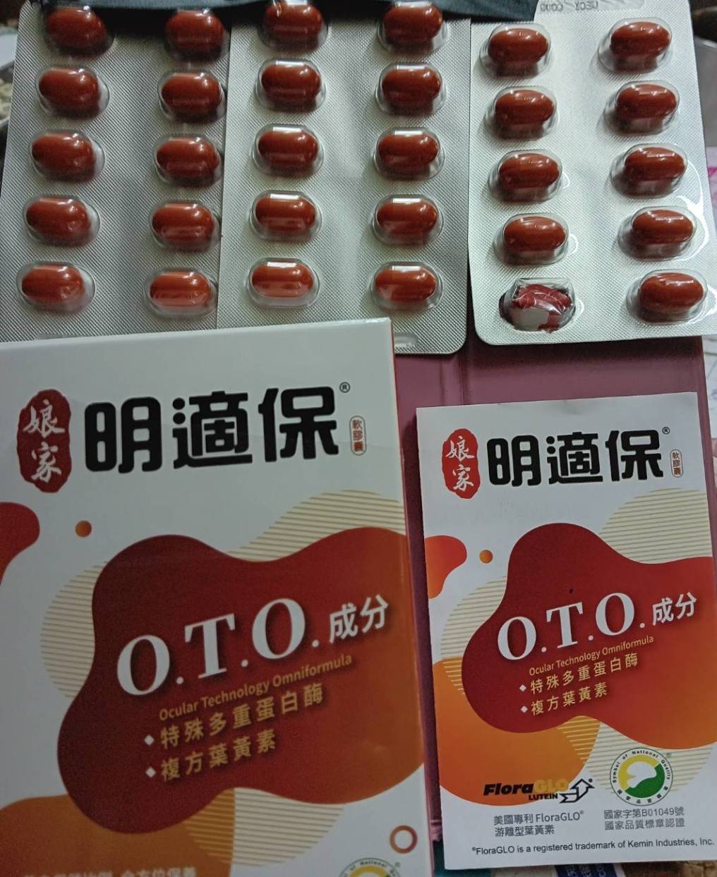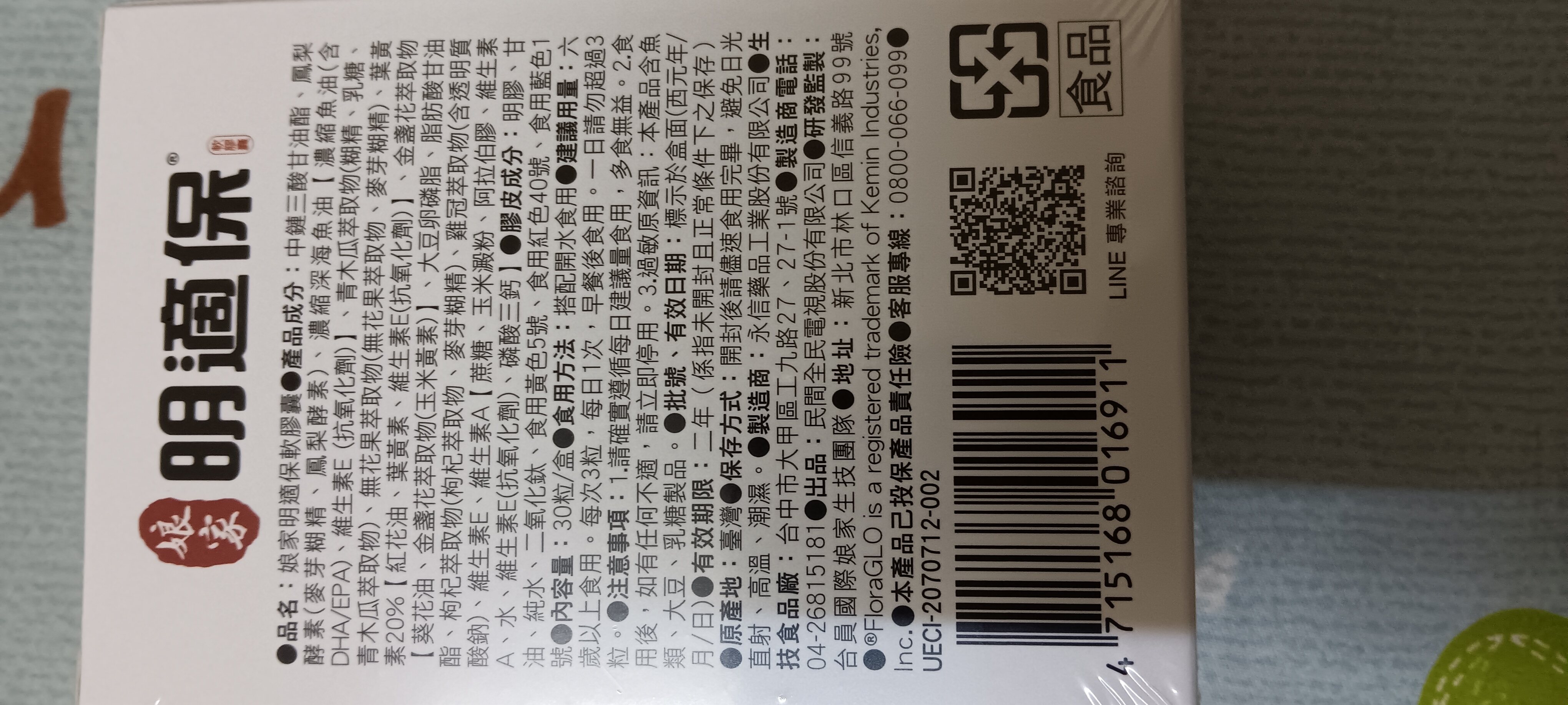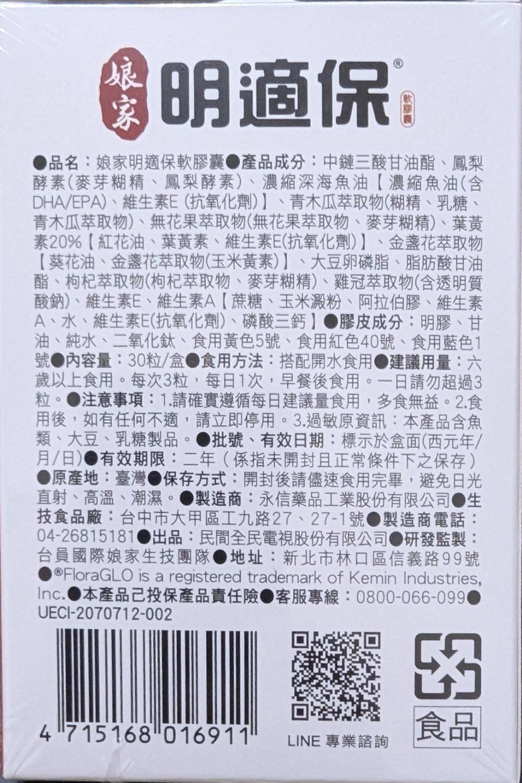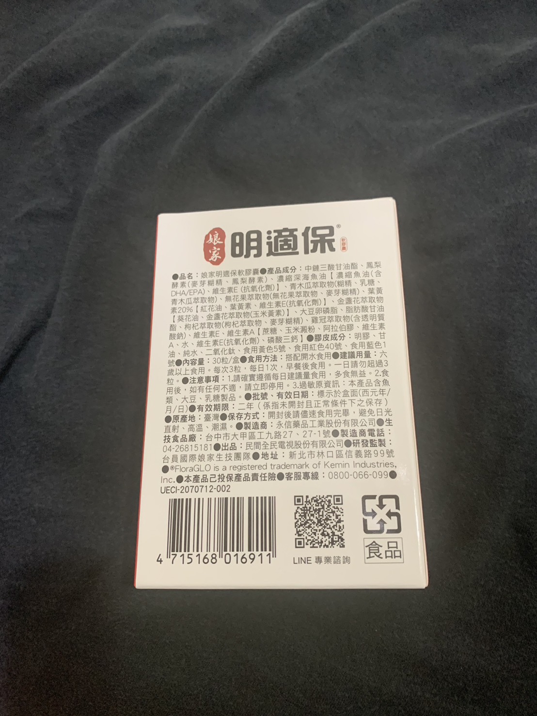 產品成分:中鏈三酸甘油酯、鳳梨酵素(麥芽糊精、鳳梨酵素)、濃縮深海魚油【濃縮魚油(含DHA/EPA)、維生素 E (抗氧化劑)】、青木瓜萃取物(糊精、乳糖、青木瓜萃取物)、無花果萃取物(無花果萃取物、麥芽糊精)、葉黃素20%【紅花油、葉黃素、維生素E(抗氧化劑)】、金盞花萃取物【葵花油、金盞花萃取物(玉米黃素)】、大豆卵磷脂、脂肪酸甘油酯 、枸杞萃取物(枸杞萃取物、麥芽糊精)、雞冠萃取物(含玻尿酸)、維生素E、維生素A【蔗糖、玉米澱粉、阿拉伯膠、維生素A、水、維生素E(抗氧化劑)、磷酸三鈣】