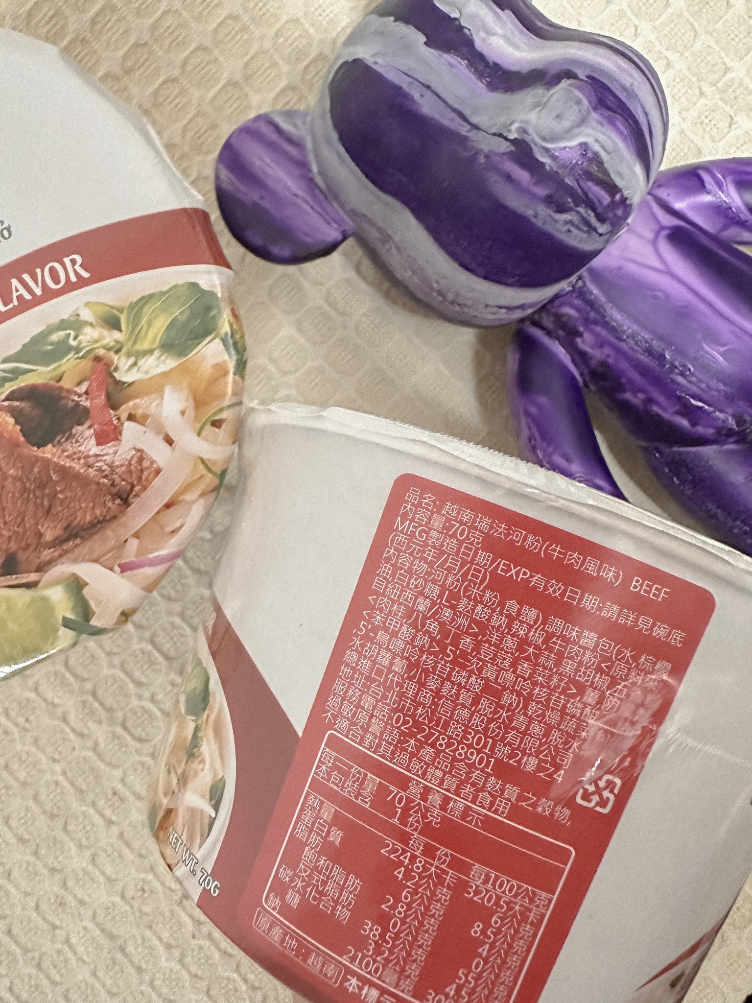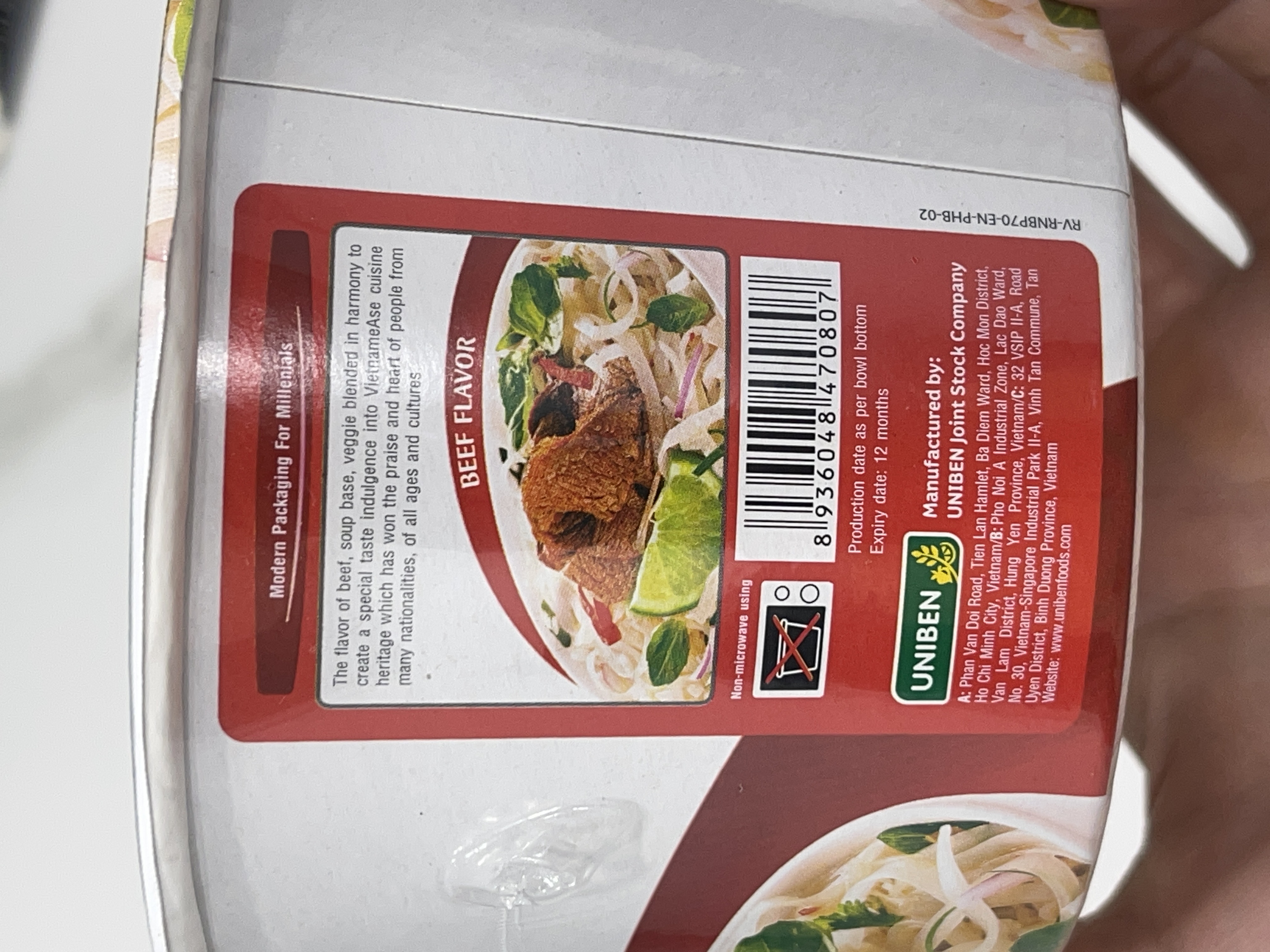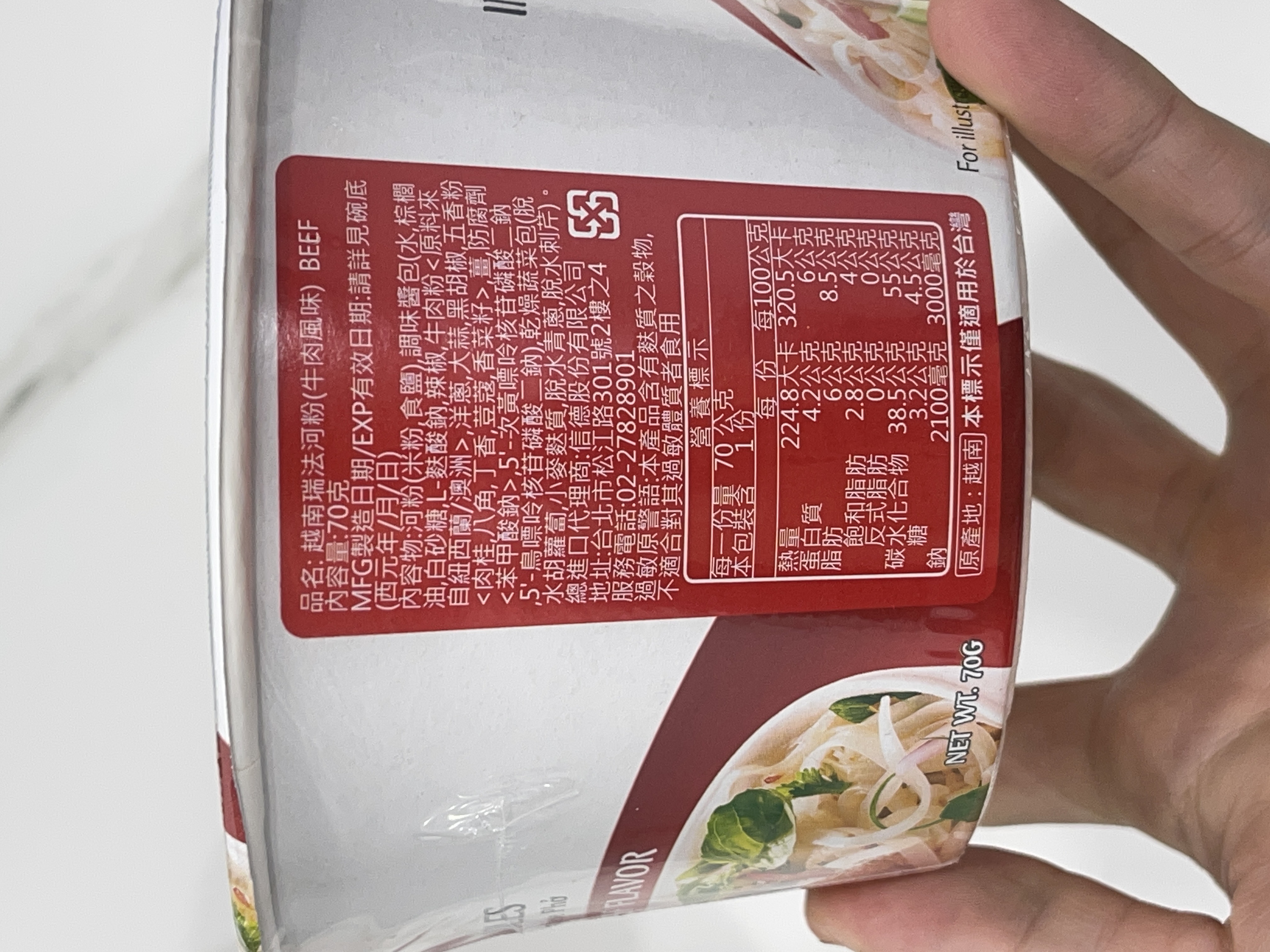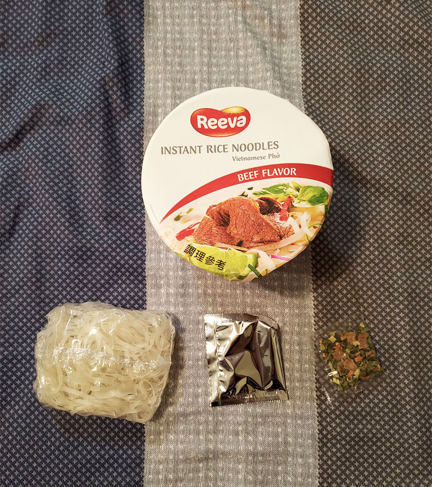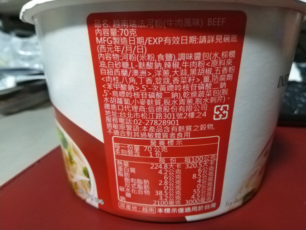 河粉(米粉87.7%、木薯澱粉、食鹽)、湯包(植物油-橄欖油、食鹽、白砂糖、辣椒、黑胡椒、洋蔥、蒜、薑、五香粉肉桂、八角、丁香、荳蔻、香菜籽、牛肉粉(牛肉萃取物)、味精、5'-鳥嘌呤核苷磷酸二鈉、 5'-次黃嘌呤核苷磷酸二鈉、防腐劑(苯甲酸鈉)、辣味包(辣椒、蒜、白砂糖、食鹽、防腐劑已二烯酸鉀, 偏亞硫酸氫鈉)、乾燥蔬菜包(脫水洋蔥、脫水香菜、脫水胡蘿蔔、麩質)