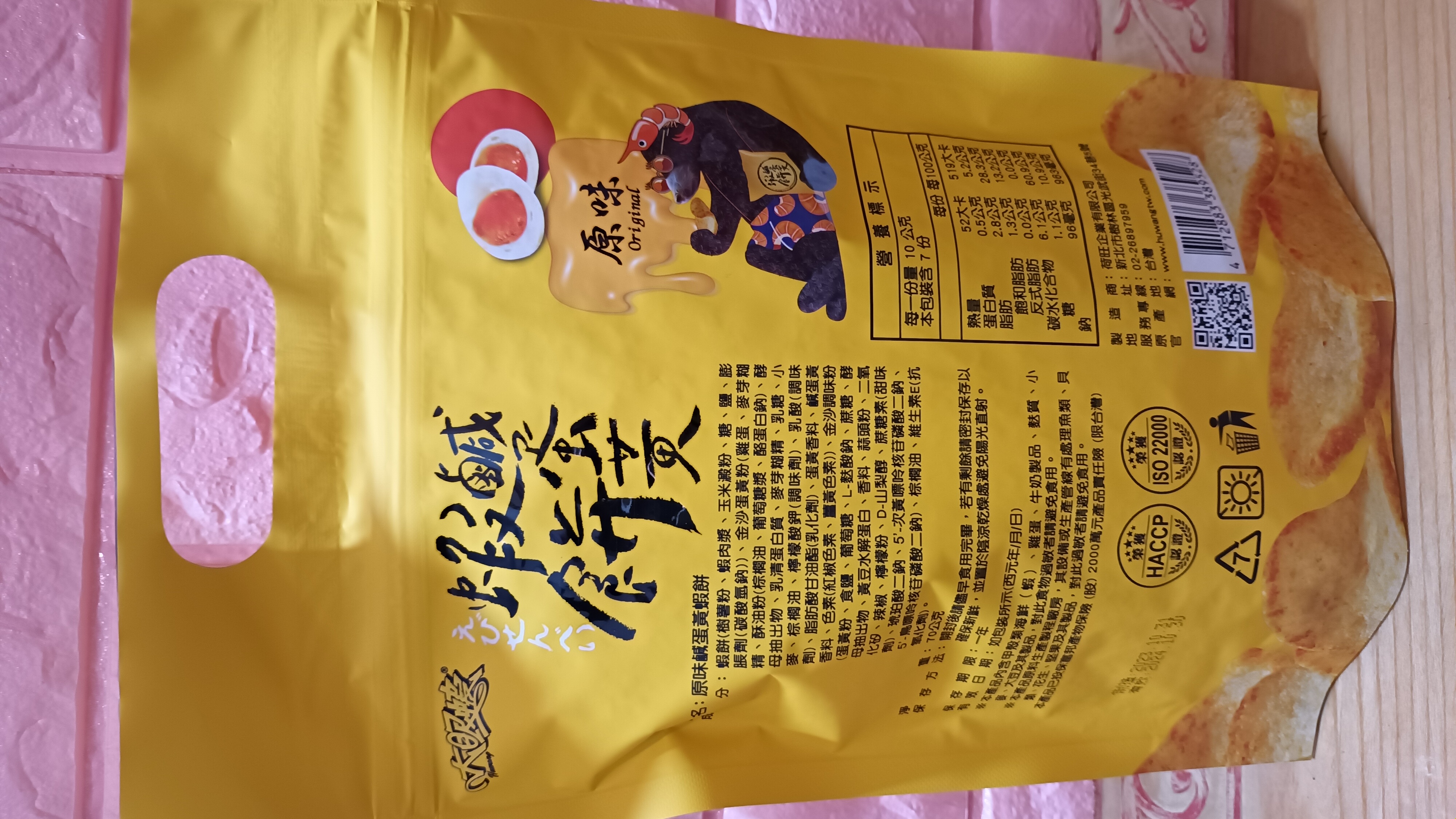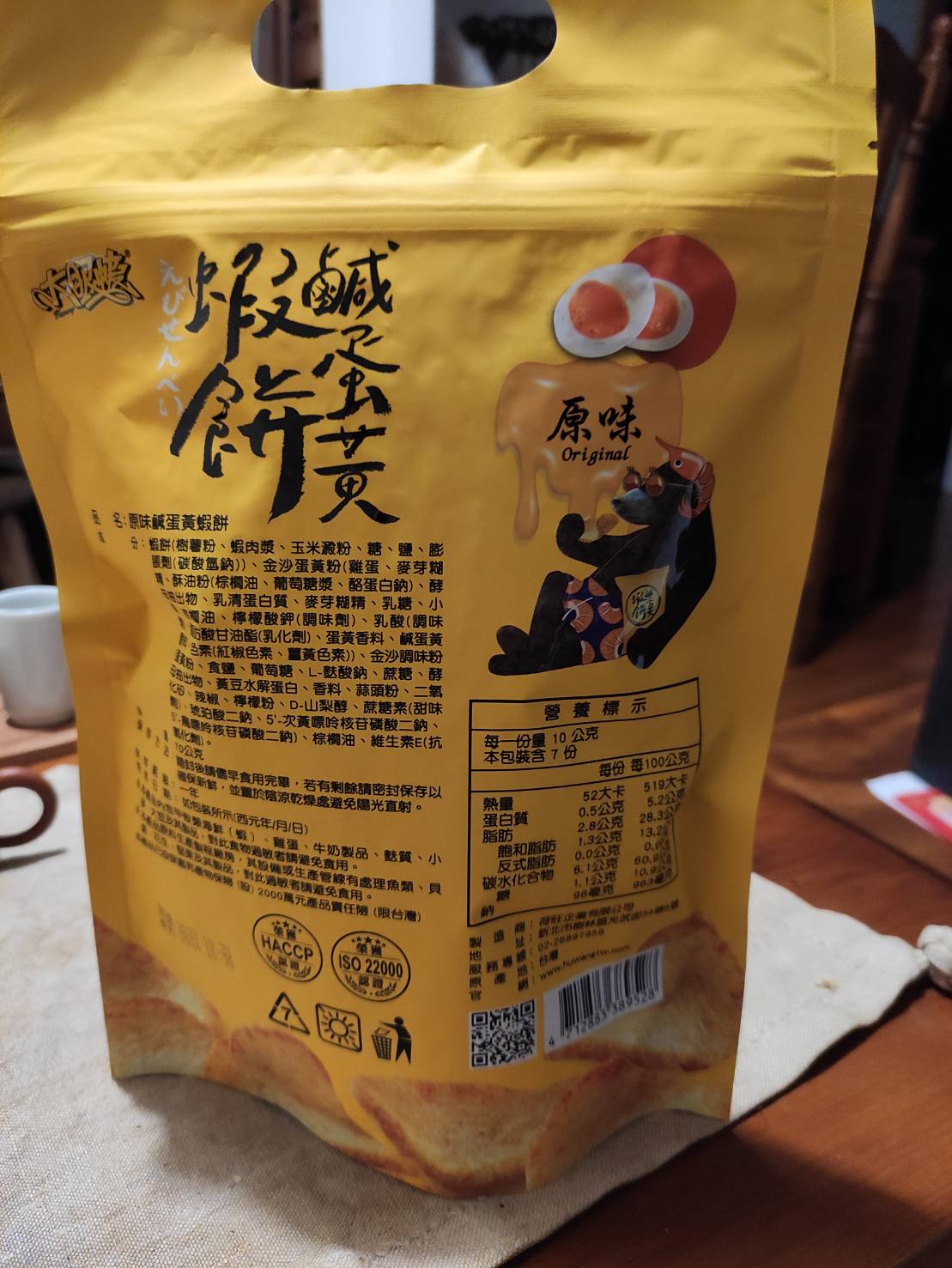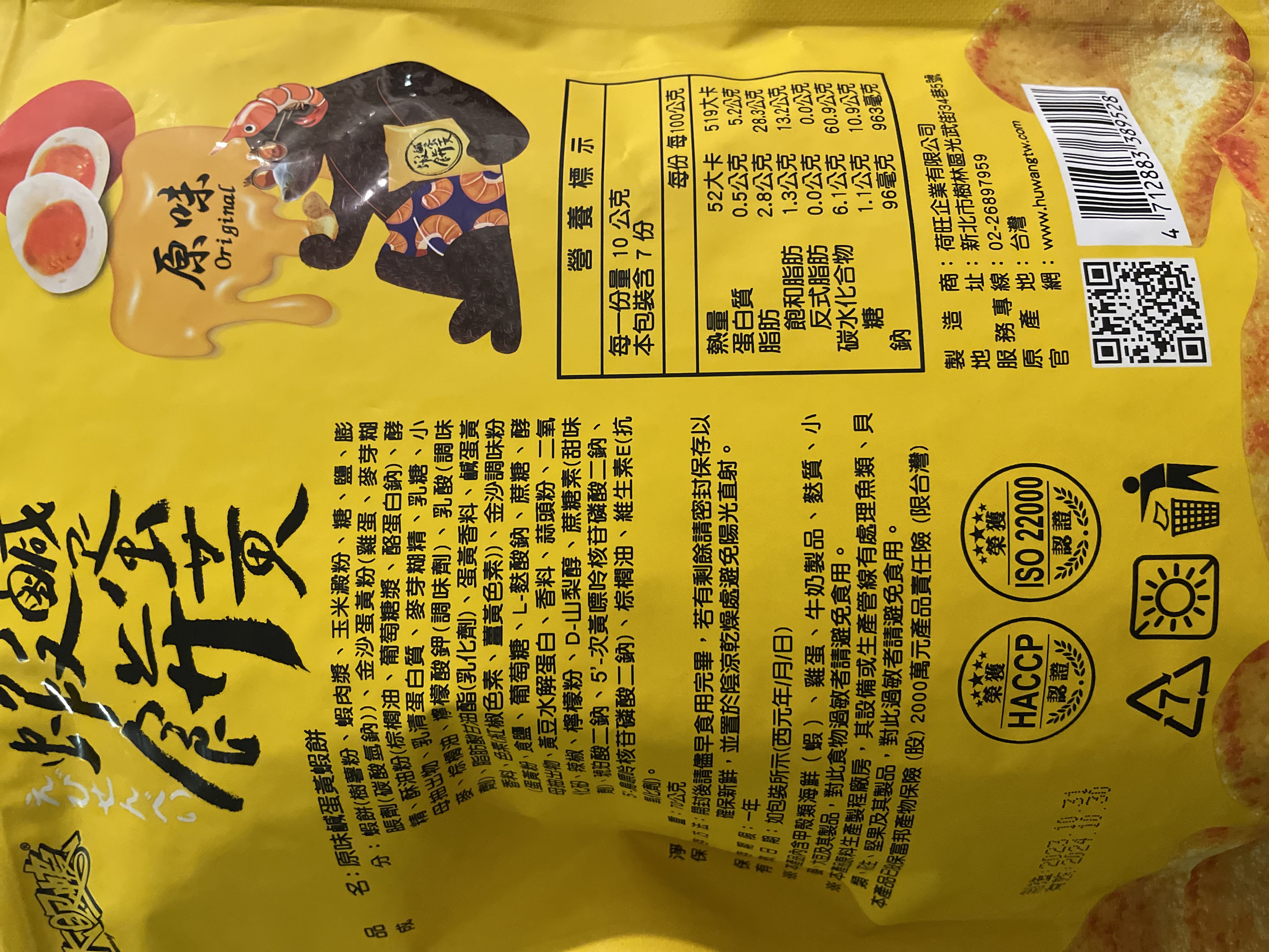 蝦餅(樹薯粉、蝦肉漿、玉米澱粉、糖、鹽、膨脹劑(酸性焦磷酸鈉))、棕櫚油、鹹蛋黃粉(雞蛋、麥芽糊精、酥油粉(棕櫚油、葡萄糖漿、酪蛋白鈉)、酵母抽出物、乳清蛋白質、麥芽糊精、乳糖、小麥、棕櫚油、檸檬酸鉀(調味劑)、乳酸(調味劑)、脂肪酸甘油酯(乳化劑)、蛋黃香料、鹹蛋黃香料、色素(紅椒色素、薑黃色素)、金沙調味(蛋黃粉、食鹽、葡萄糖、L-麩酸鈉(調味劑)、蔗糖、酵母抽出物、黃豆水解蛋白、香料、蒜頭粉、二氧化矽、辣椒、檸檬粉、D-山梨醇(甜味劑)、蔗糖素(甜味劑)、琥珀酸二鈉、5’-次黃嘌呤核苷酸磷酸二鈉+5’-鳥嘌呤核苷酸二鈉