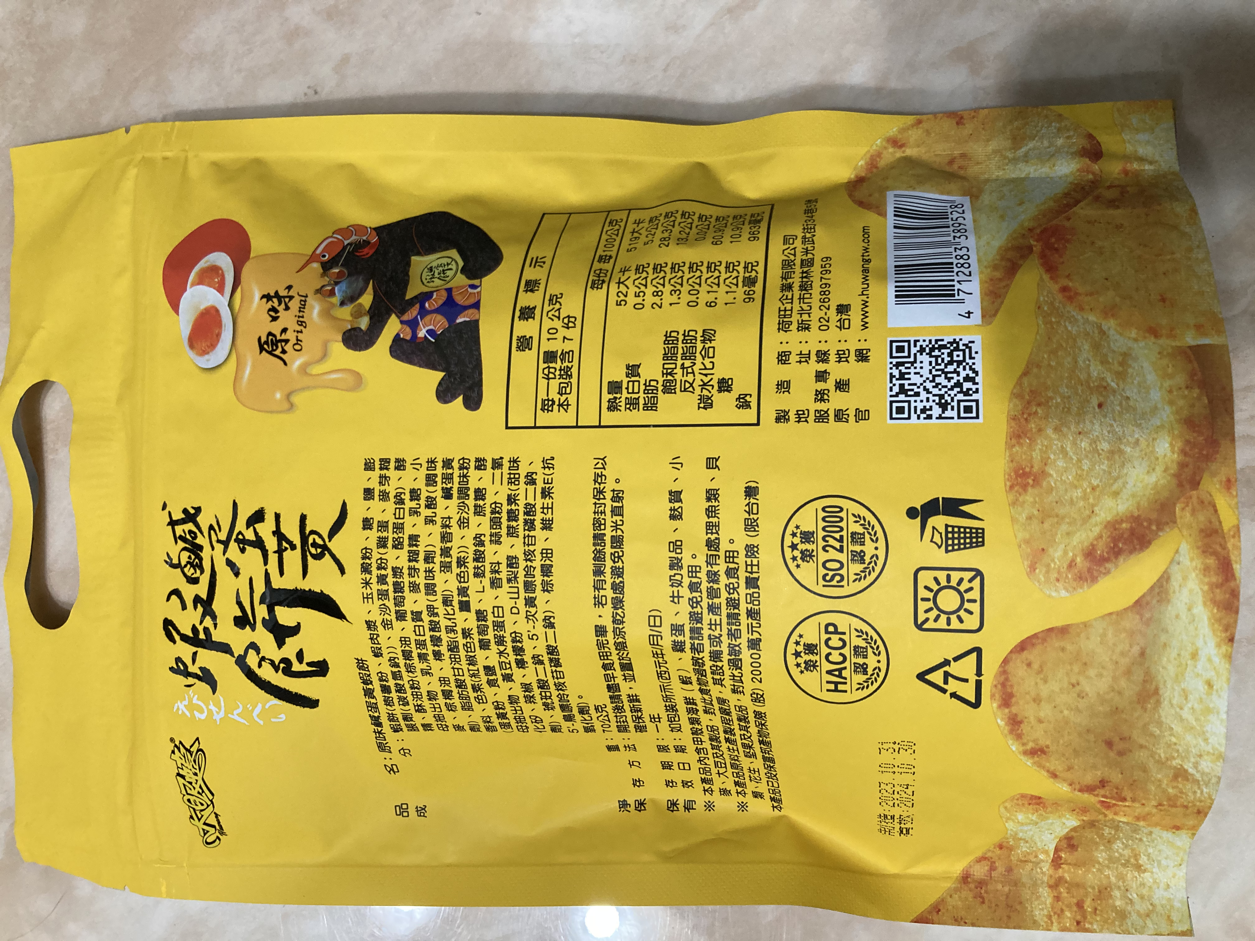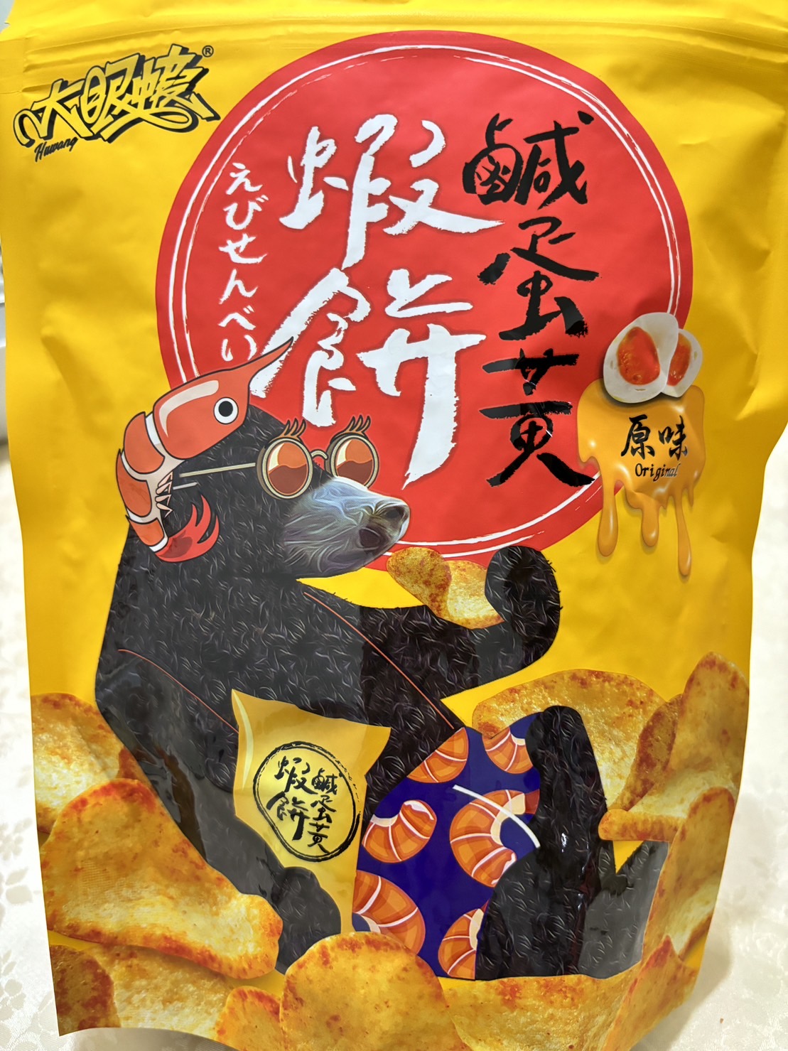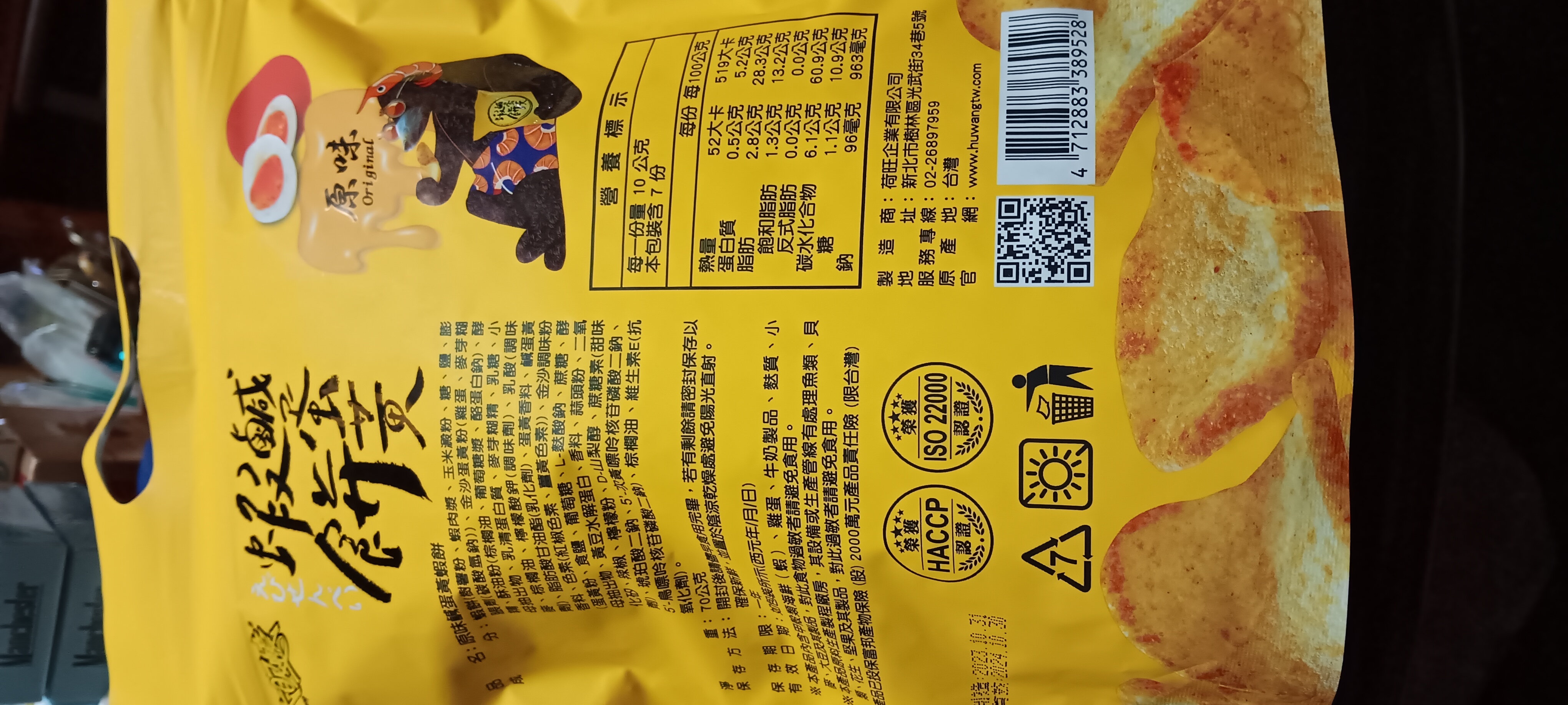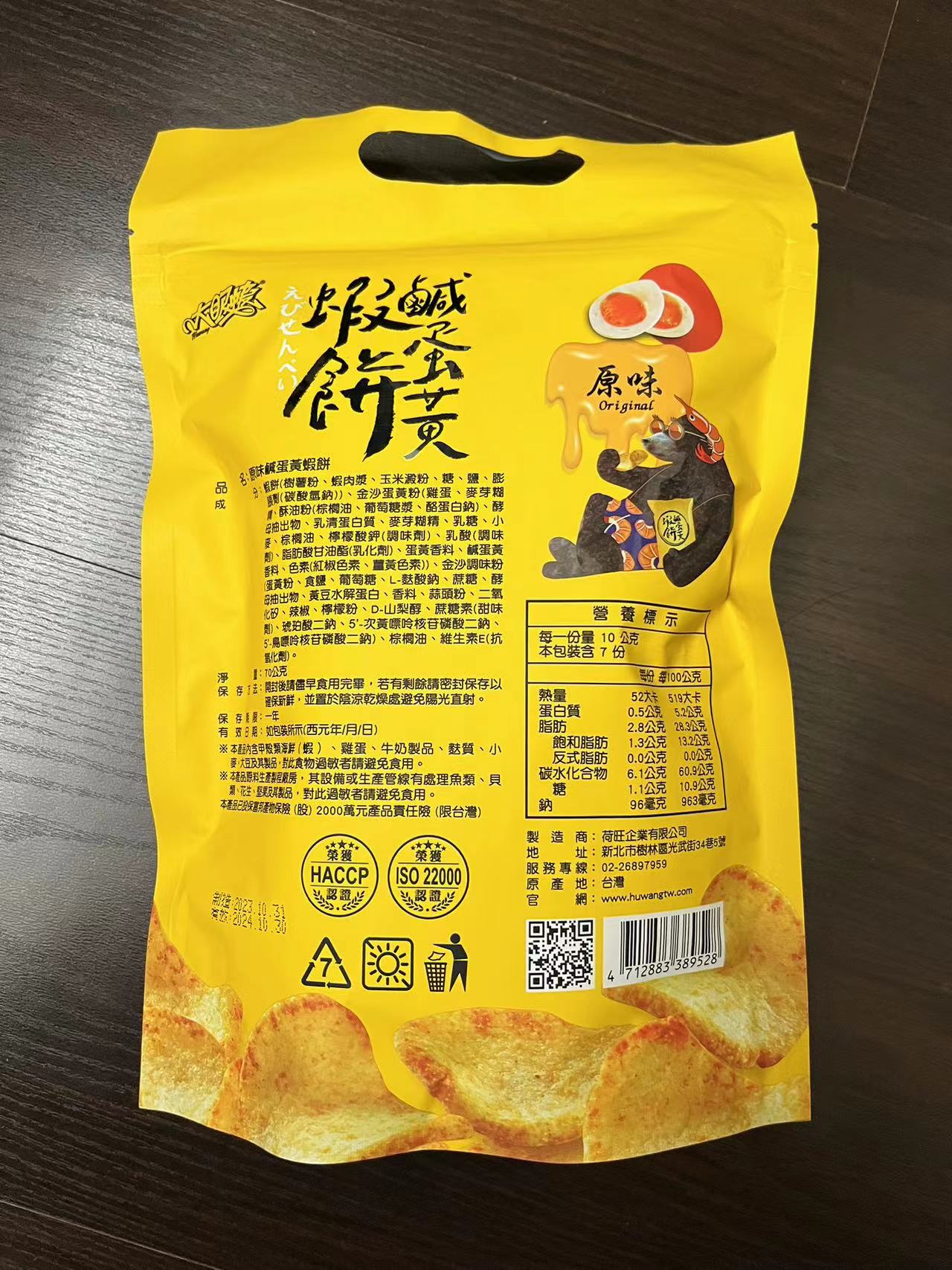 蝦餅(樹薯粉、蝦肉漿、玉米澱粉、糖、鹽、膨脹劑(酸性焦磷酸鈉))、棕櫚油、鹹蛋黃粉(雞蛋、麥芽糊精、酥油粉(棕櫚油、葡萄糖漿、酪蛋白鈉)、酵母抽出物、乳清蛋白質、麥芽糊精、乳糖、小麥、棕櫚油、檸檬酸鉀(調味劑)、乳酸(調味劑)、脂肪酸甘油酯(乳化劑)、蛋黃香料、鹹蛋黃香料、色素(紅椒色素、薑黃色素)、金沙調味(蛋黃粉、食鹽、葡萄糖、L-麩酸鈉(調味劑)、蔗糖、酵母抽出物、黃豆水解蛋白、香料、蒜頭粉、二氧化矽、辣椒、檸檬粉、D-山梨醇(甜味劑)、蔗糖素(甜味劑)、琥珀酸二鈉、5’-次黃嘌呤核苷酸磷酸二鈉+5’-鳥嘌呤核苷酸二鈉
