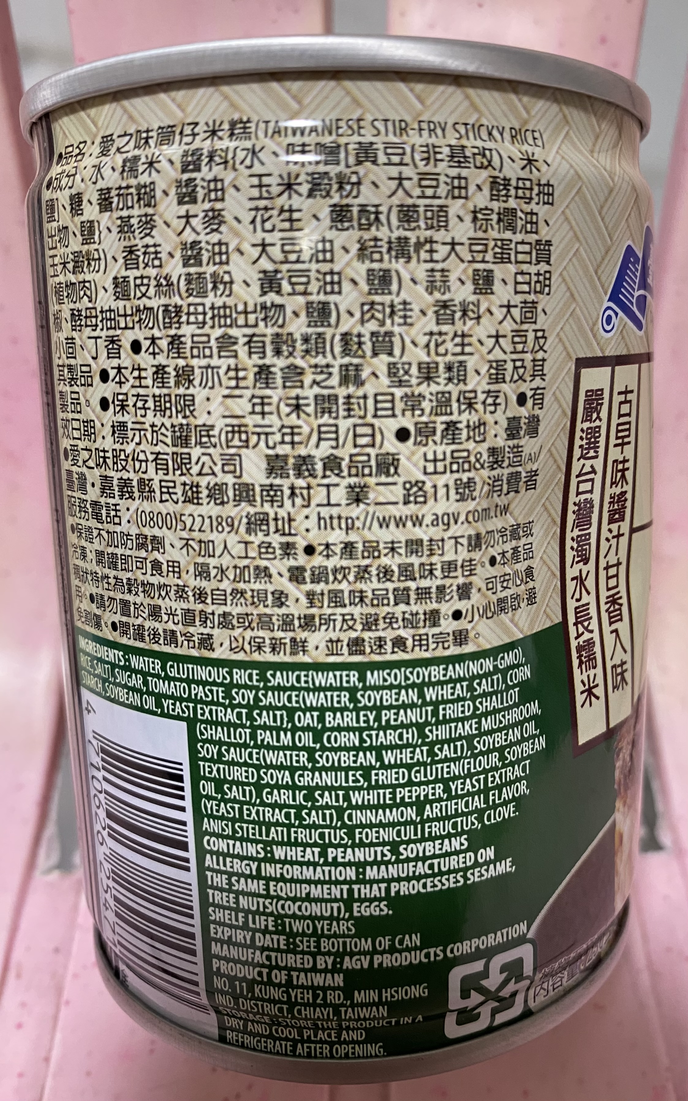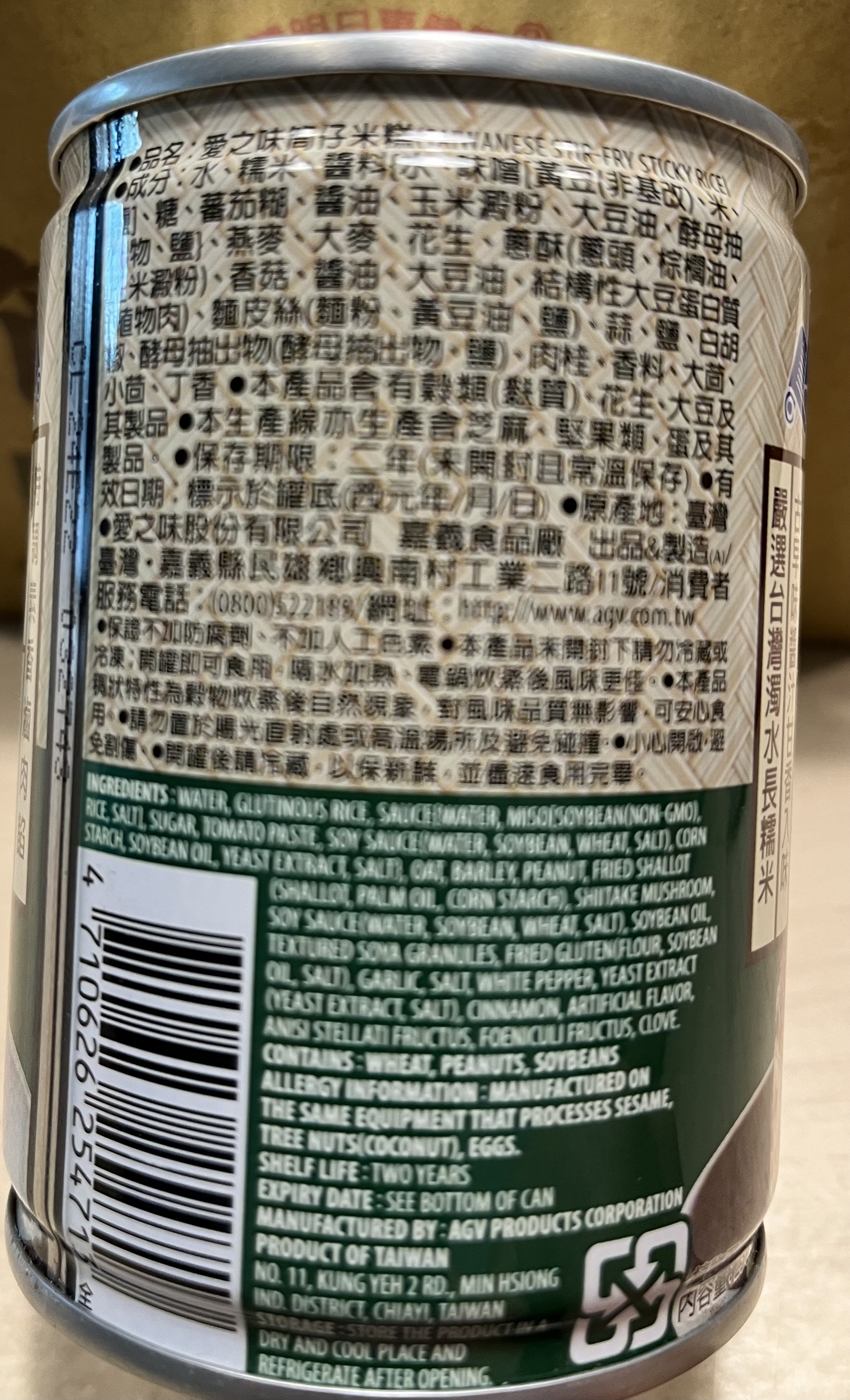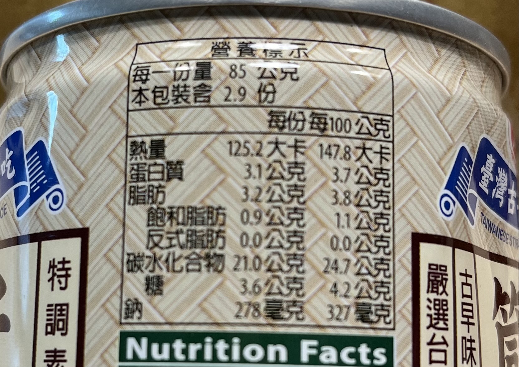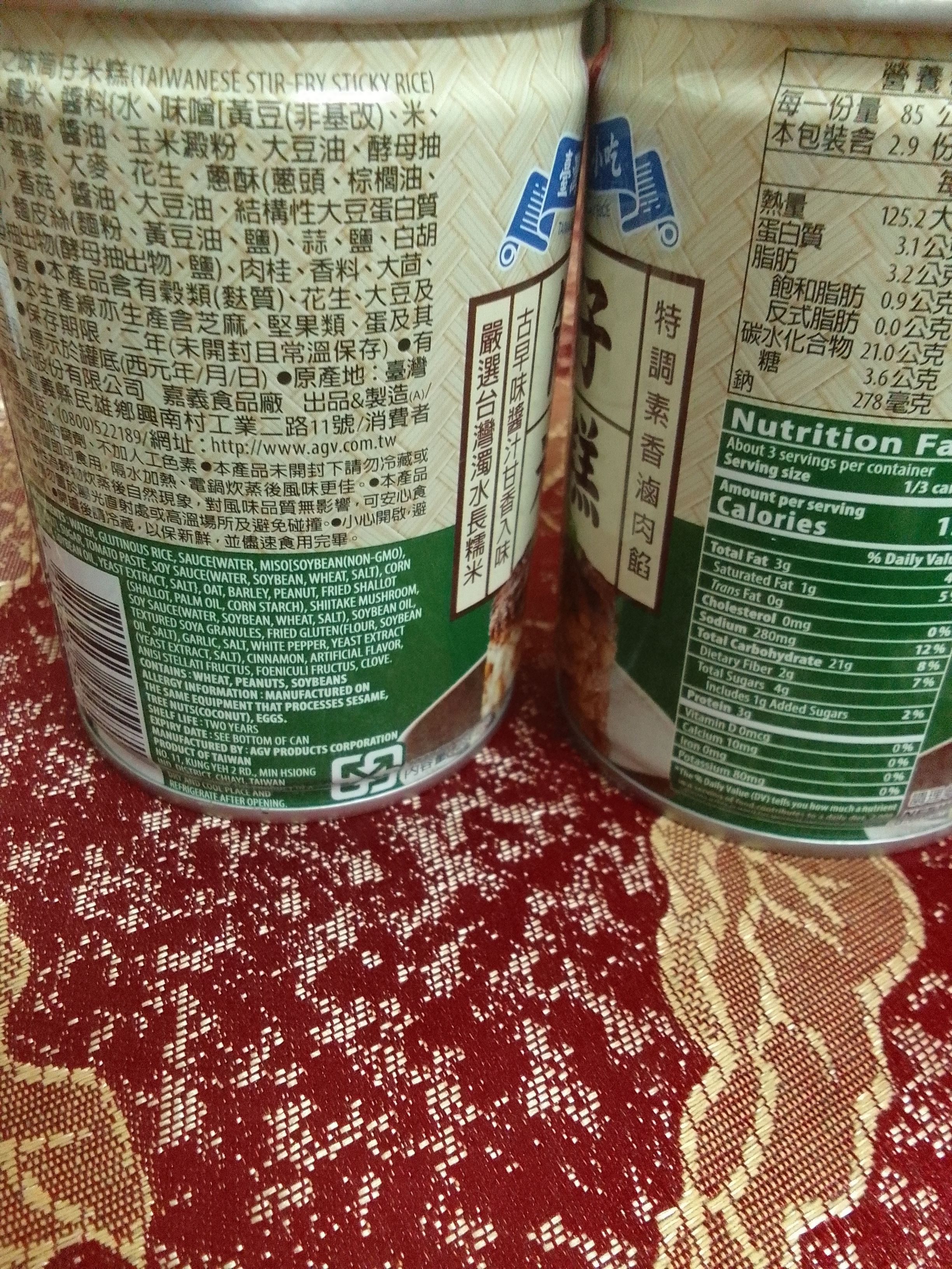 水、糯米、醬料{水、味噌[黃豆(非基改)、米、鹽]、糖、蕃茄糊、醬油、玉米澱粉、大豆油、酵母抽出物、鹽}、燕麥、大麥、花生、蔥酥(蔥頭、棕櫚油、玉米澱粉)、香菇、醬油、大豆油、結構性大豆蛋白質(植物肉)、麵皮絲(麵粉、黃豆油、鹽)、蒜、鹽、白胡椒、酵母抽出物(酵母抽出物、鹽)、肉桂、香料、大茴、小茴、丁香