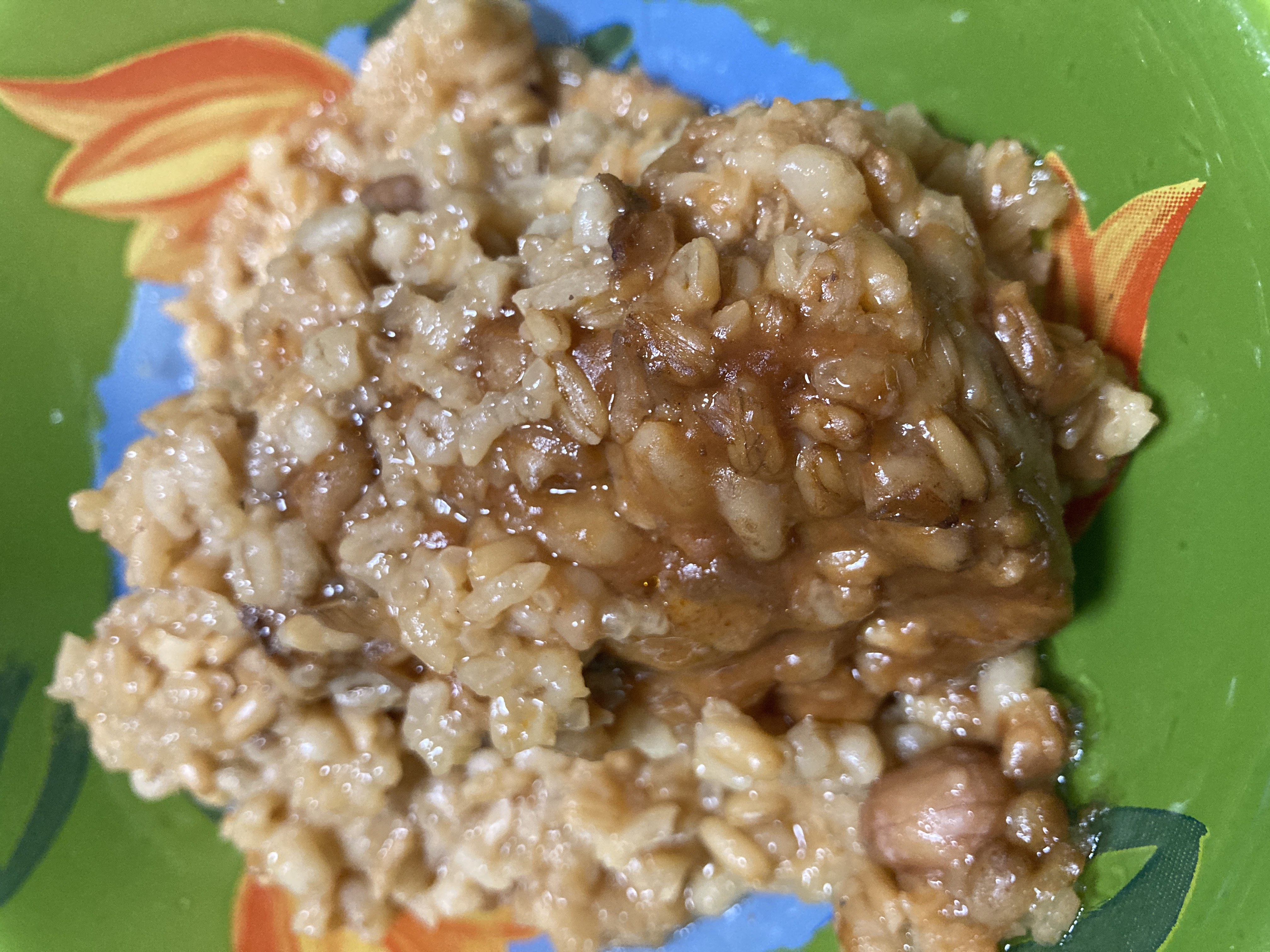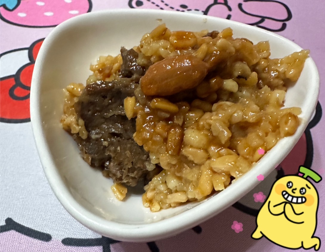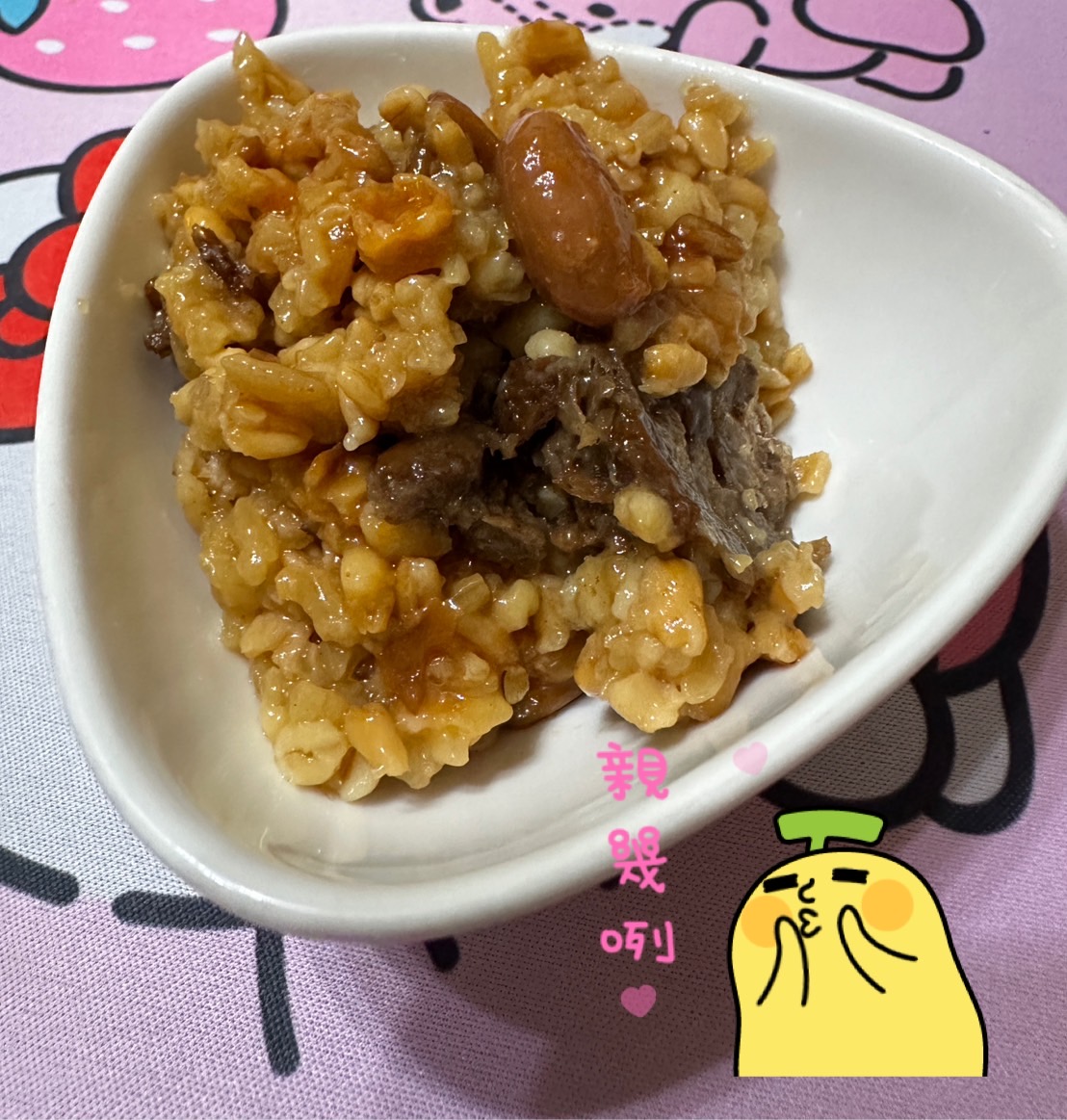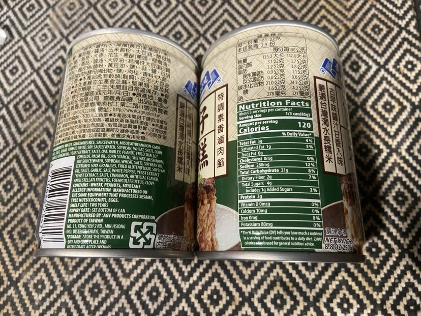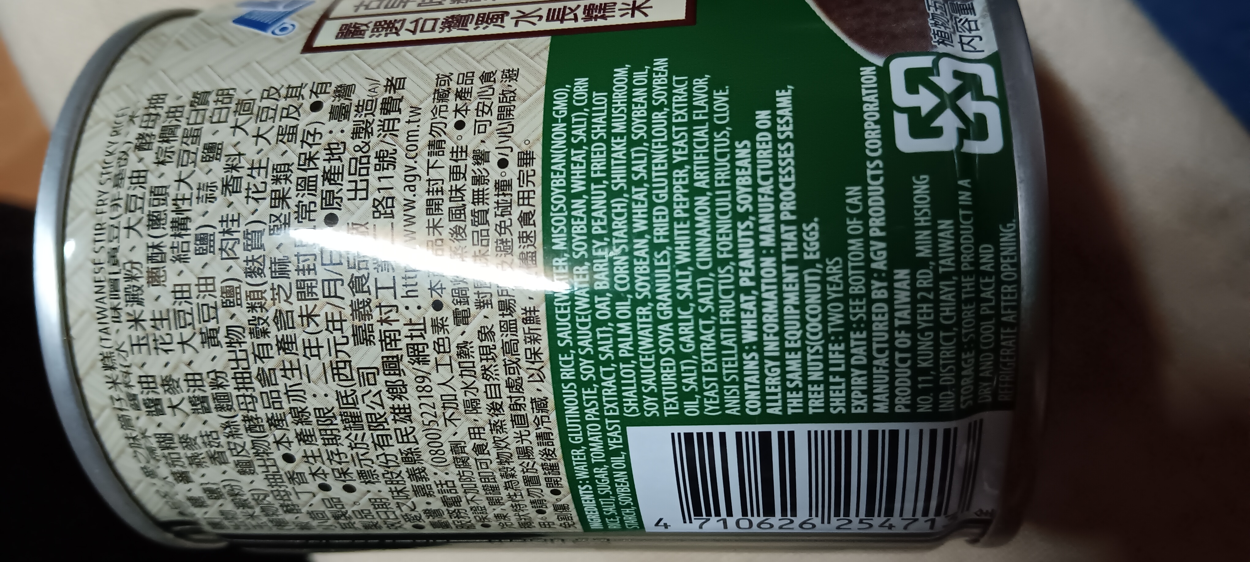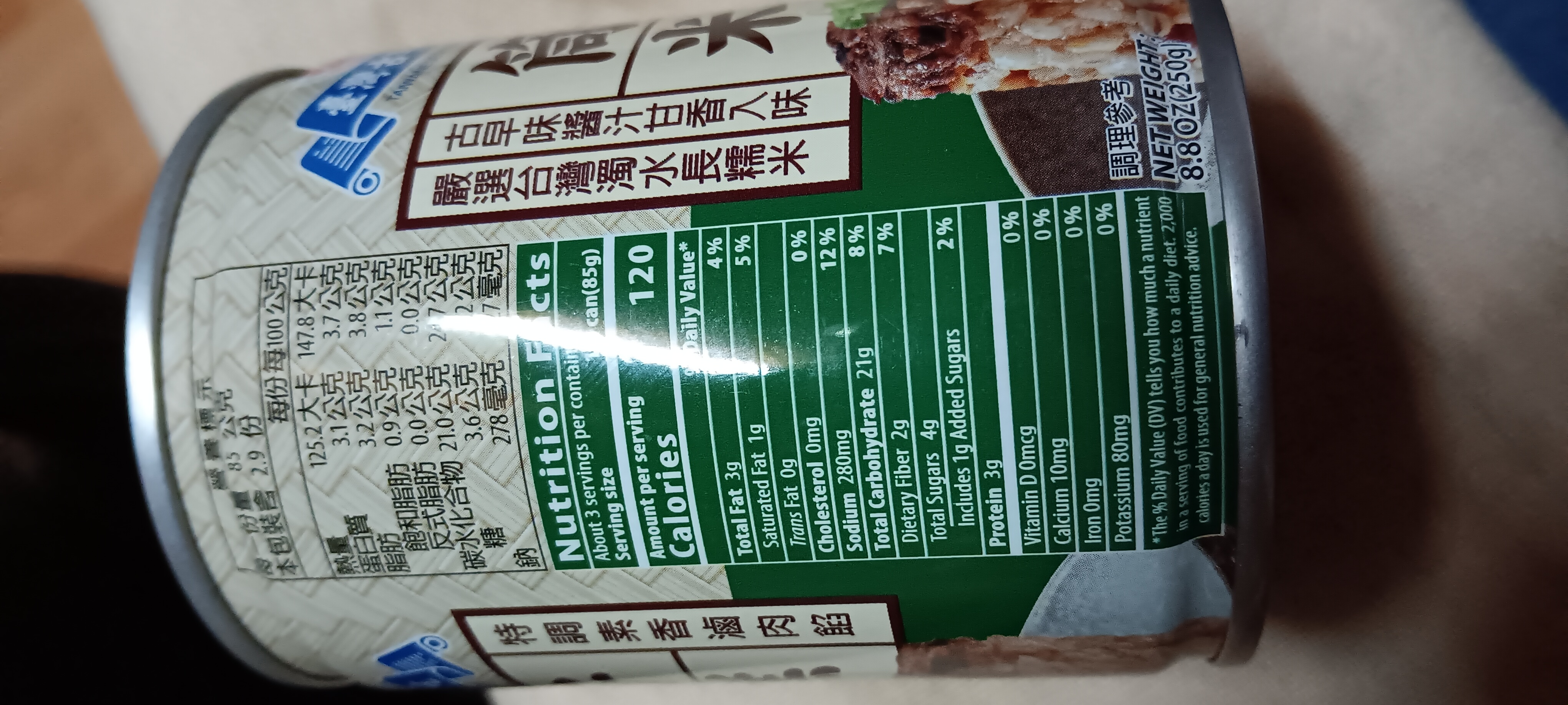 水、糯米、醬料{水、味噌[黃豆(非基改)、米、鹽]、糖、蕃茄糊、醬油、玉米澱粉、大豆油、酵母抽出物、鹽}、燕麥、大麥、花生、蔥酥(蔥頭、棕櫚油、玉米澱粉)、香菇、醬油、大豆油、結構性大豆蛋白質(植物肉)、麵皮絲(麵粉、黃豆油、鹽)、蒜、鹽、白胡椒、酵母抽出物(酵母抽出物、鹽)、肉桂、香料、大茴、小茴、丁香