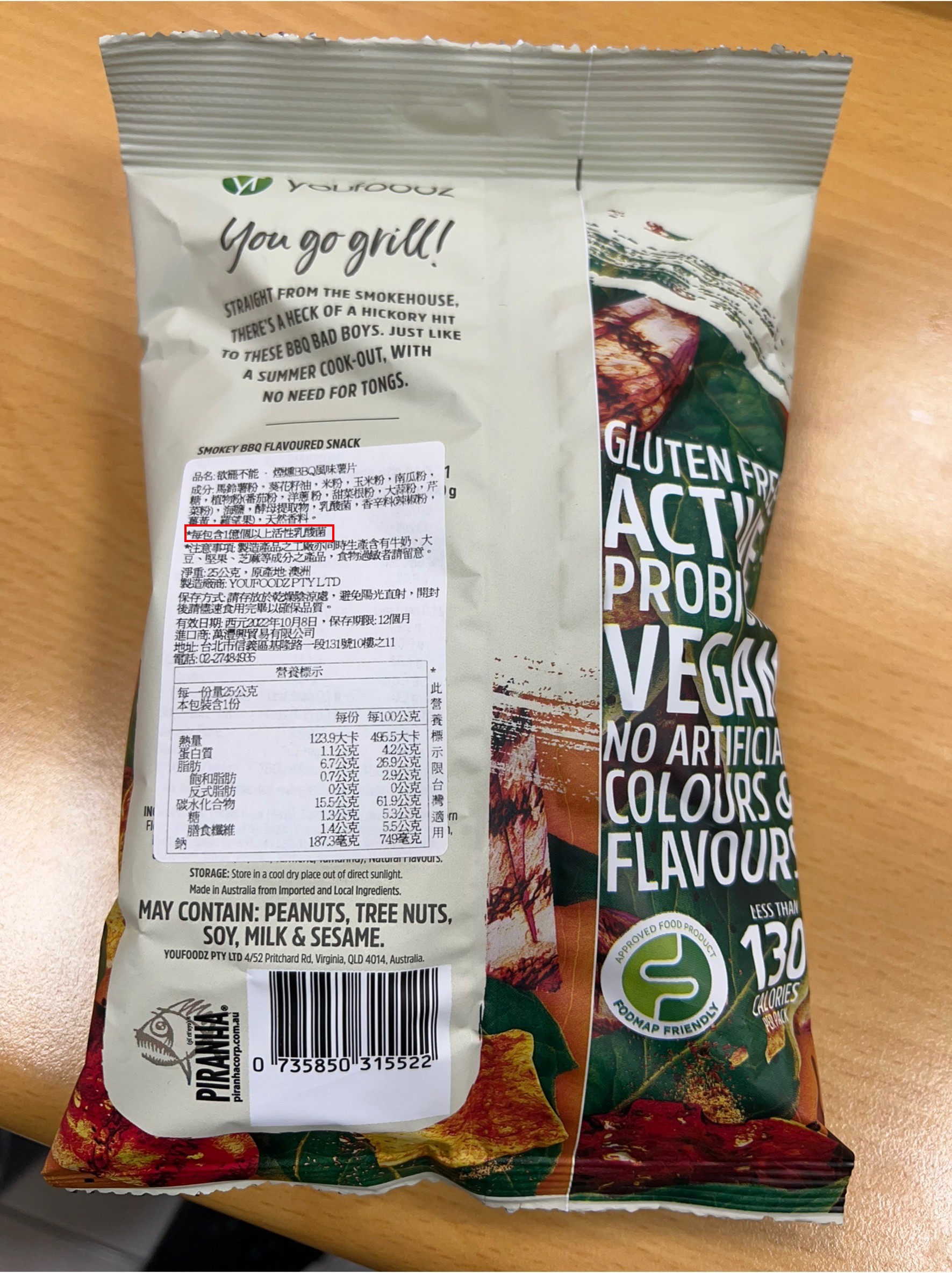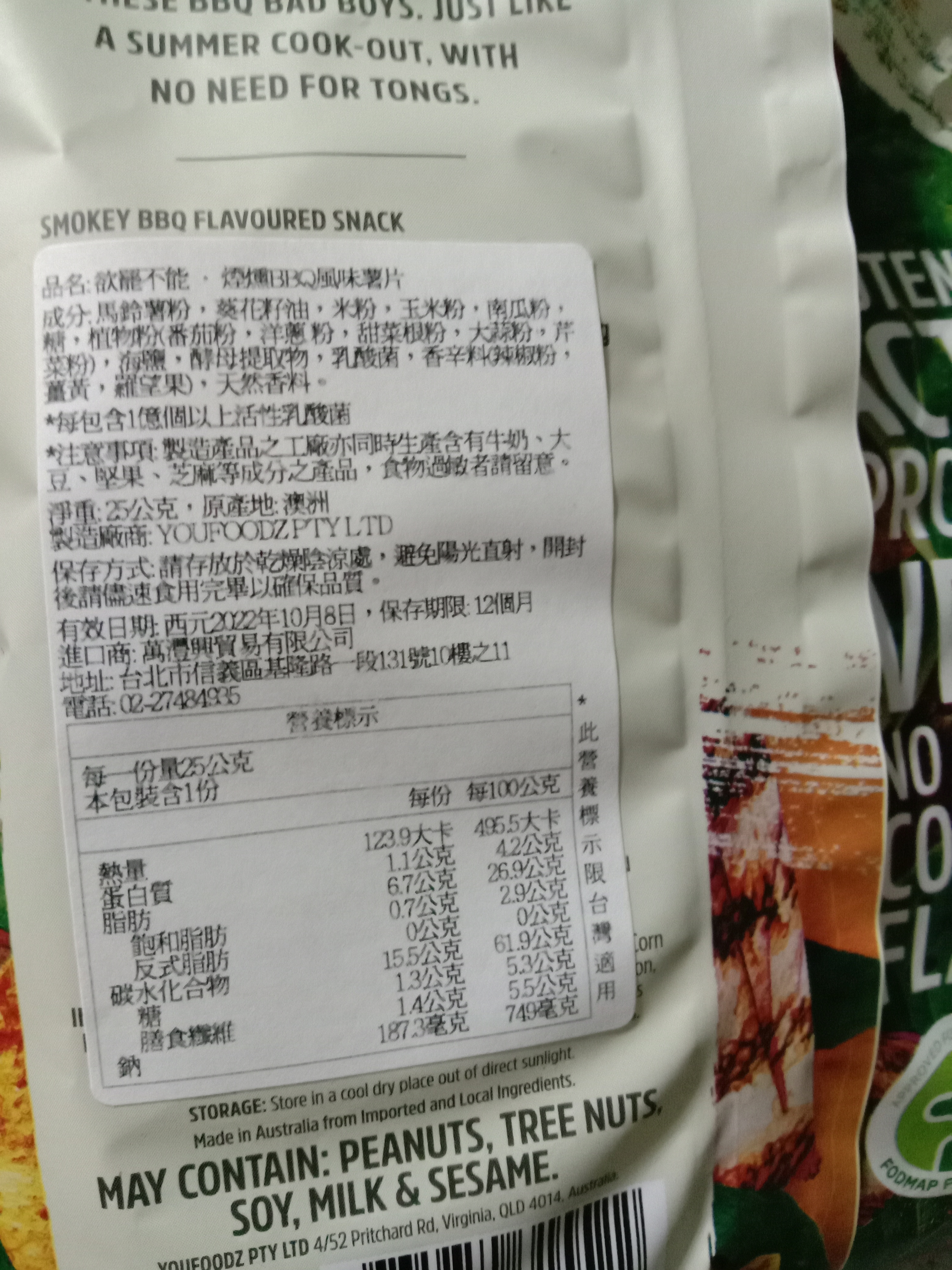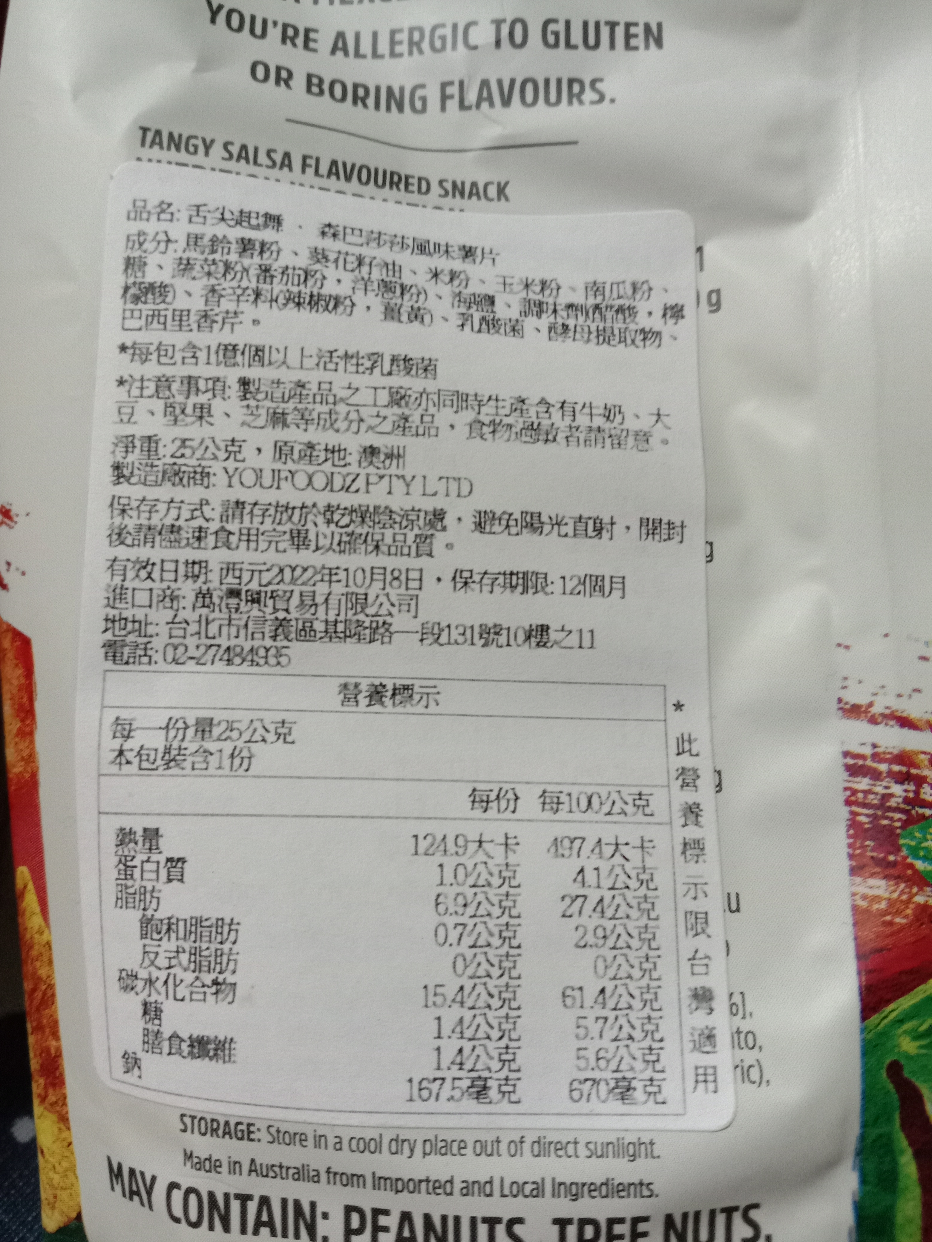 回列表 youfoodz 益生菌薯片綜合口味 嘴饞大膽吃 健康無負擔 市價170元 所需等級 一般會員以上 所需學分 60 體驗份數 15 關注人數 2479 申請人數 418 申請截止 品牌業者:澳洲 youfoodz 負責廠商 萬灃興貿易有限公司 廠商地址 臺北市信義區基隆路1段131號10樓之11 產地 澳洲 試用產品規格 煙燻BBQ薯片、森巴莎莎薯片各1包,每包25g。 食品業者登錄字號 A-152281277-00000-2 心得分享 商品介紹 商品成分 使用方法 注意事項 體驗名單 8.3 youfoodz 益生菌薯片 綜合口味 包裝美學 8.6 煙燻香氣 8.0 莎莎醬風味 8.2 新奇程度 8.2 薯片口感 8.4 建議推薦 8.3 心得分享 13則 林禹彤 金食達人 27歲 臺北市 2022/02/16 對youfoodz 益生菌薯片 綜合口味留下評價 9 口味:【煙燻BBQ薯片】: 鹹中帶甜,兩者平衡恰到好處,煙燻風味不會到很重,偏清爽型但香氣足夠。【森巴莎莎薯片】: 不同於煙燻,鹹中帶些許酸甜香氣,番茄味較勝出但不會太重,個人更喜愛此款。口感:厚度較一般洋芋片厚一點,有脆度但不會硬。整體評比:一般市面上較少吃到這種口感的薯片,會讓人想一口一口接著吃,而且以健康度來說,若要選擇薯片我會選擇澳洲youfoodz 欲罷不能 • 煙燻BBQ薯片或是澳洲youfoodz 舌尖起舞•森巴莎莎薯片而非一般市售洋芋片,而且25g單包裝一包熱量約125大卡,很適合嘴饞的時候來上一包啊! 王筱玲 金食達人 43歲 新北市 2022/02/21 對youfoodz 益生菌薯片 綜合口味留下評價 8 我很喜歡吃零食,無論是洋芋片、薯片這類小點心、都是我的最愛~可是我也知道,市售零食大多重油、重鹹,不是健康的食物。所以我一直在找、希望能找到少人工添加物、少油炸,健康又好吃的小零嘴。可尋覓了那麼久、能符合理想標準的還真不多。第一次看到益生菌薯片綜合口味時,真是勾起了好奇心。薯片還能結合益生菌!?仔細再看一看,成分天然、沒什麼看不懂的化學添加物,捨棄傳統油炸、經炭烤製成~這個點心完全符合我的需要。所以通過申請後,迫不及待開包品嚐~煙燻BBQ薯片:用南瓜粉、馬鈴薯粉、玉米粉等天然食材製成,調味則用辣椒粉、薑黃、羅望果等天然香料增加食材風味。口感酥脆、每一片都帶有淡淡煙燻口味,不死鹹、吃完不會口渴,我很喜歡這個味道。森巴莎莎薯片:食材比例上跟煙燻BBQ大同小異,都有南瓜粉、馬鈴薯粉、玉米粉等天然食材跟調味,不同的是有加醋酸跟檸檬酸調味。薯片剛入口時會先吃到蔬菜香氣、再來有一點點酸味。食材風味都淡淡的、但混合在一起就形成很特別森巴莎莎,值得一試。這兩款薯片都是小包裝(25g),且都有添加1億個以上活性乳酸菌、低熱量、含膳食纖維。吃零食還能維持消化道健康、一兼二顧~真是維持身材又解饞的好點心。 林哲因 金食達人 39歲 臺北市 2022/02/15 對youfoodz 益生菌薯片 綜合口味留下評價 9 這次試吃的是youfoodz 益生菌薯片,跟想像中的薯片有點不一樣,看說明和照片比較像健康的零嘴,收到就立刻開起來試吃!首先先食用了森巴莎莎口味,打開時撲鼻而來蕃茄味濃郁的味道,吃起來口感酥脆不會太硬,除了番茄香甜的味道,酸味十分適中,另外帶有一點苦味,但也中和了番茄的濃郁氣味,讓人不會膩口。而煙燻 BBQ口味,烤肉醬氣味較淡,比較清爽的感覺,口味較不鹹,表比森巴莎莎更耐吃,仔細品嚐也可吃出香甜的洋蔥味,適合較喜歡清爽口味的人食用。 馨庭 金食達人 33歲 高雄市 2022/02/17 對youfoodz 益生菌薯片 綜合口味留下評價 9 包裝外觀讓人有聖誕節的氛圍!色彩很飽和很可愛,而且小小一包很適合嘴饞吃完負擔不會太大。打開包裝後香味很棒,不會有過於強烈的香料味,薯片口感很酥脆,入口番茄莎莎味適宜,整體風味平衡佳,適合不喜歡重鹹的消費者。最吸引人的地方是每包含1億個以上的活性乳酸菌,吃起來沒有保健食品令人不喜歡的生粉味,跟產品融合得很好!在吃零食時可以安慰自己也在促進腸胃健康。 鄭臻甄 金食達人 35歲 屏東縣 2022/02/17 對youfoodz 益生菌薯片 綜合口味留下評價 7 這款是我看到一直滿想試的,因為市面上的薯片熱量都過高,但這款既有薯片的口感又可以不用吸收太多熱量,一收到產品就打開試看看,莎莎醬的真的好好吃酸酸的味道讓人一口接一口,另一款煙燻也讓人停不下來,如果之後想吃洋芋片會考慮回購此款既熱量不高又可以享受微罪惡的感覺。真的太棒了👏 邱郁婷 金食達人 38歲 臺中市 2022/02/18 對youfoodz 益生菌薯片 綜合口味留下評價 8 打開包裹瞬間,聖誕節般的繽紛包裝心情看著愉悅~第一次接觸到益生菌薯片,包裝上註明每包含一億個以上活性乳酸菌,健康的感覺讓人躍躍欲試!實際吃起來味道較一般薯片清淡,少了洋芋片的油膩重鹹,乾爽脆口較像台式的蝦片口感,平時不吃洋芋片的我本來打開只想吃個幾口試試,怎麼直接整包吃完也沒有罪惡感! 張佑安(yuanchang) 鑽石達人 63歲 臺中市 2022/02/18 對youfoodz 益生菌薯片 綜合口味留下評價 9 森巴莎莎口味:鹹味可加重口感:吃起來像蝦片的感覺,入口即化(含著的話), 個人很喜歡脆度:佳較適合幼年兒童、牙齒老化、牙齒矯正的族群,但脆一點會更受年輕族群歡迎。煙燻BBQ口味:吃完後會有義大利香料的味道,吃的過程中有番茄的香味跑出來,十分好吃,鹹度適中口感:酥脆好吃,跟森巴莎莎比起來似乎稍微脆了點,很像市面上吃的洋芋片脆度:佳這款應該會很受歡迎,口味口感都不錯,大人小孩都會很喜
