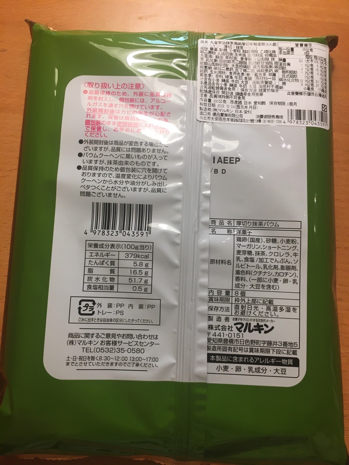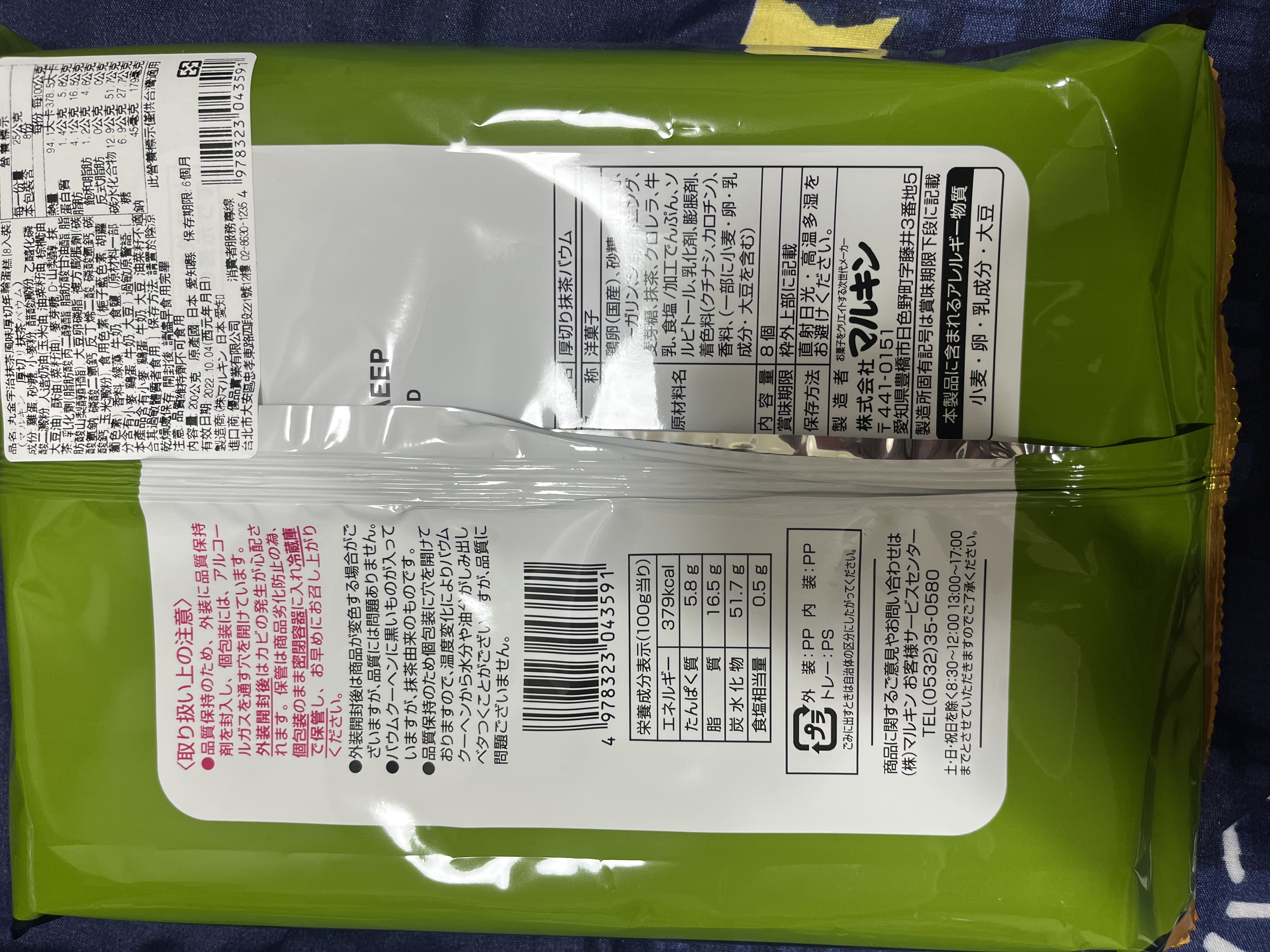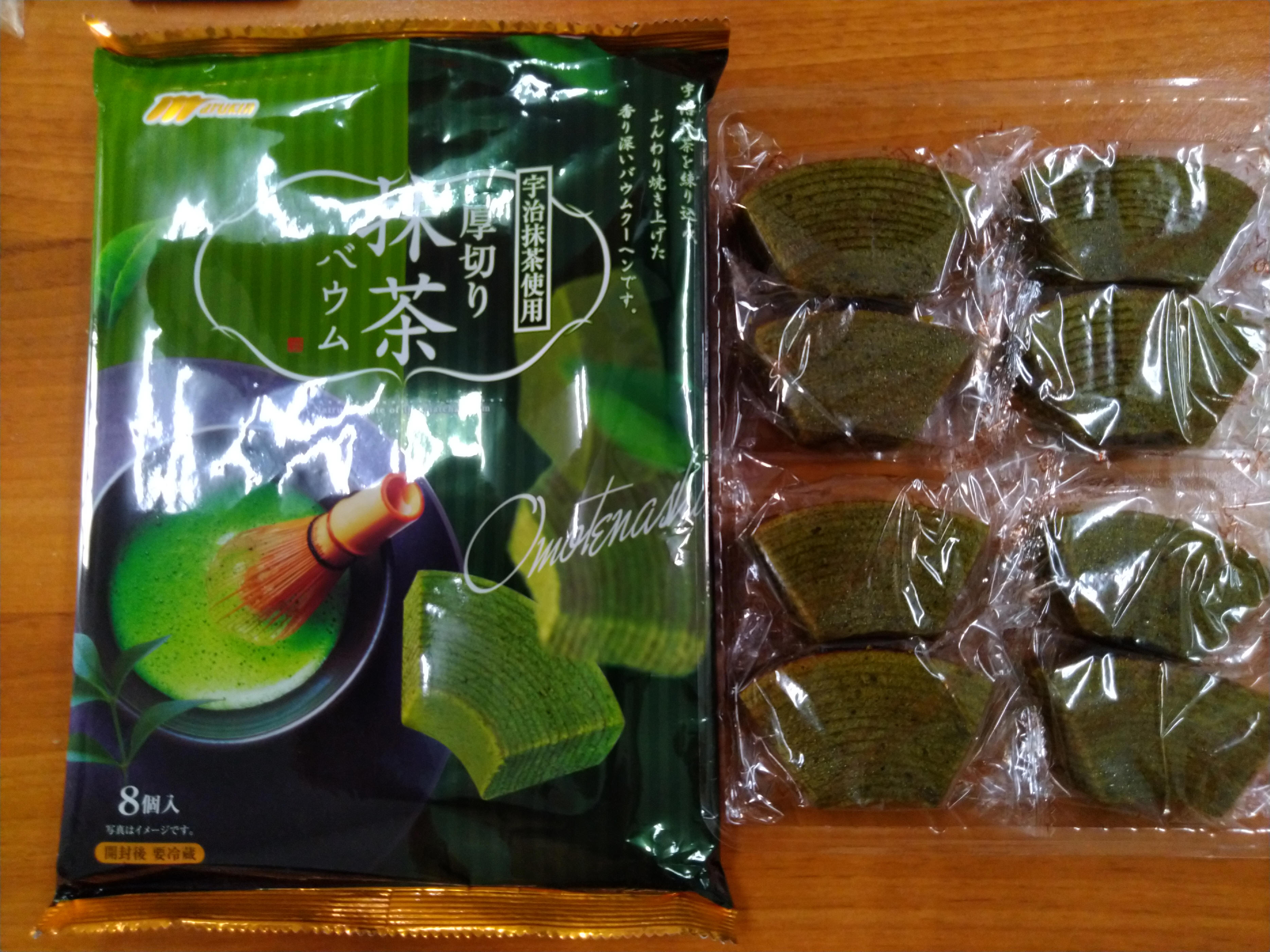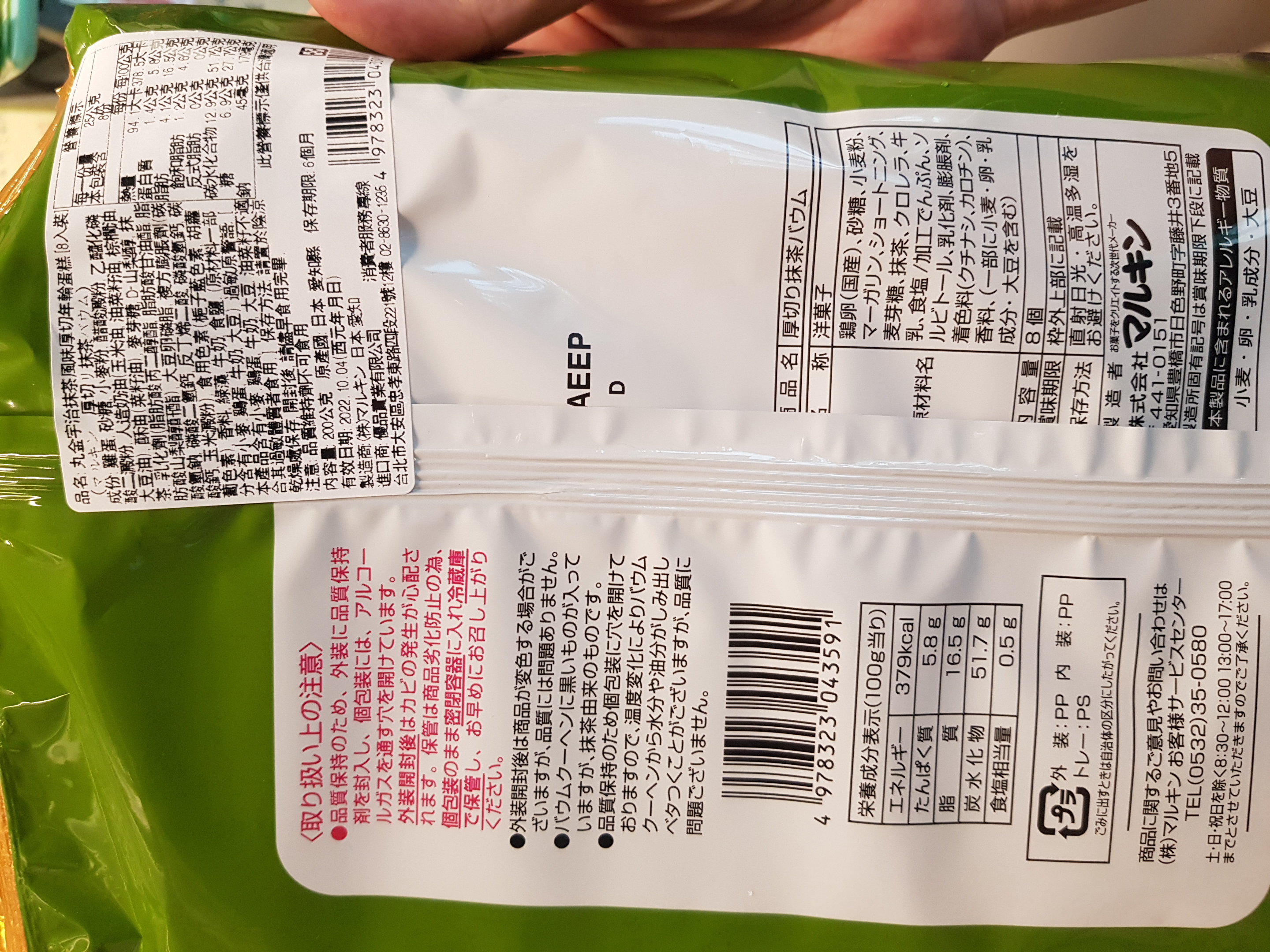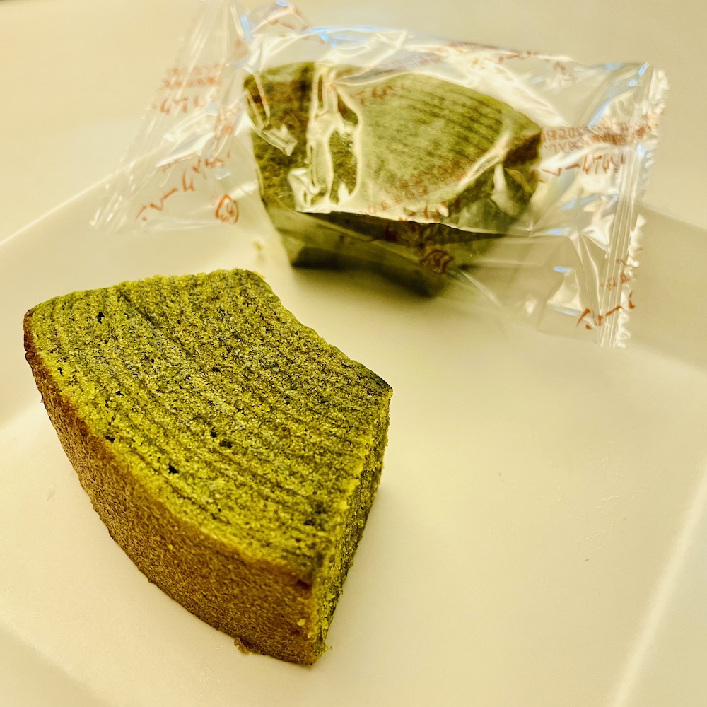 雞蛋、砂糖、小麥粉、人造奶油、酥油(芥籽油)、麥芽糖、抹茶、綠藻、牛奶、食鹽、氧化澱粉、甜味劑(D-山梨醇)、脂肪酸甘油酯、膨脹劑(碳酸氫鈉)、食用色素(黃梔子、胡蘿蔔素)、香料、(原材料的一部份含有小麥、雞蛋、牛奶、大豆)