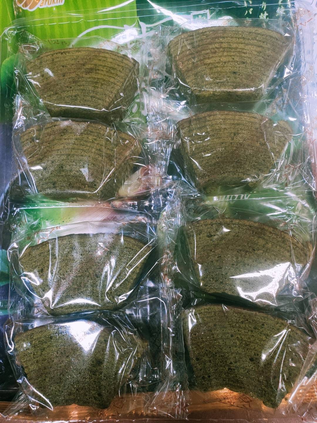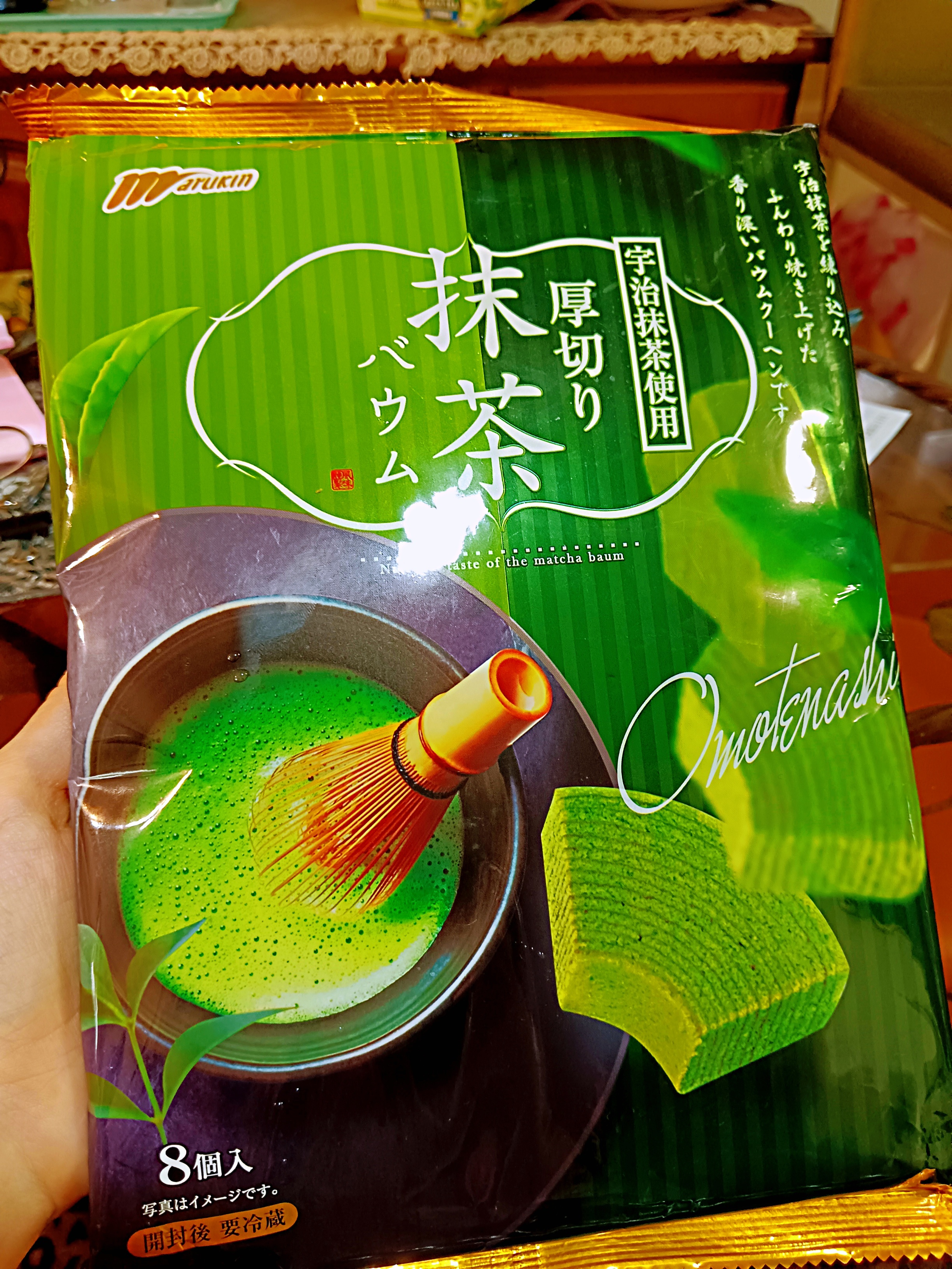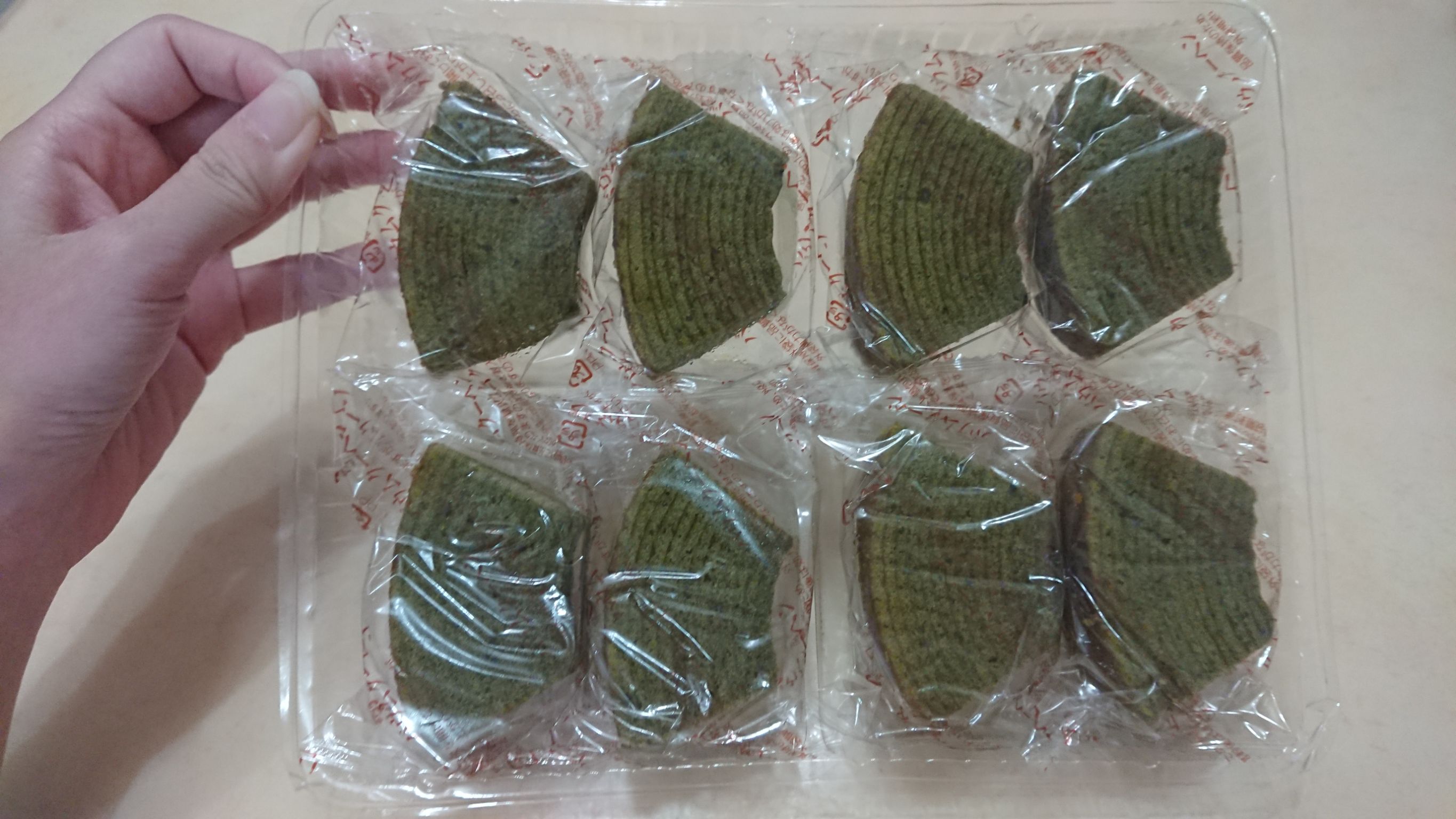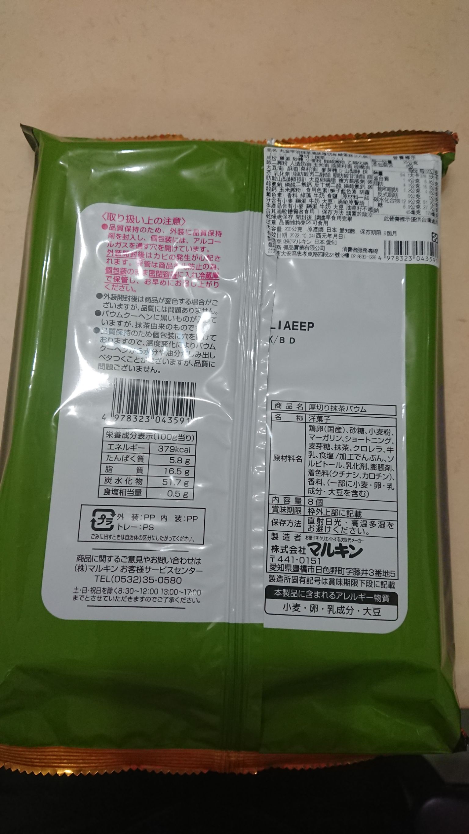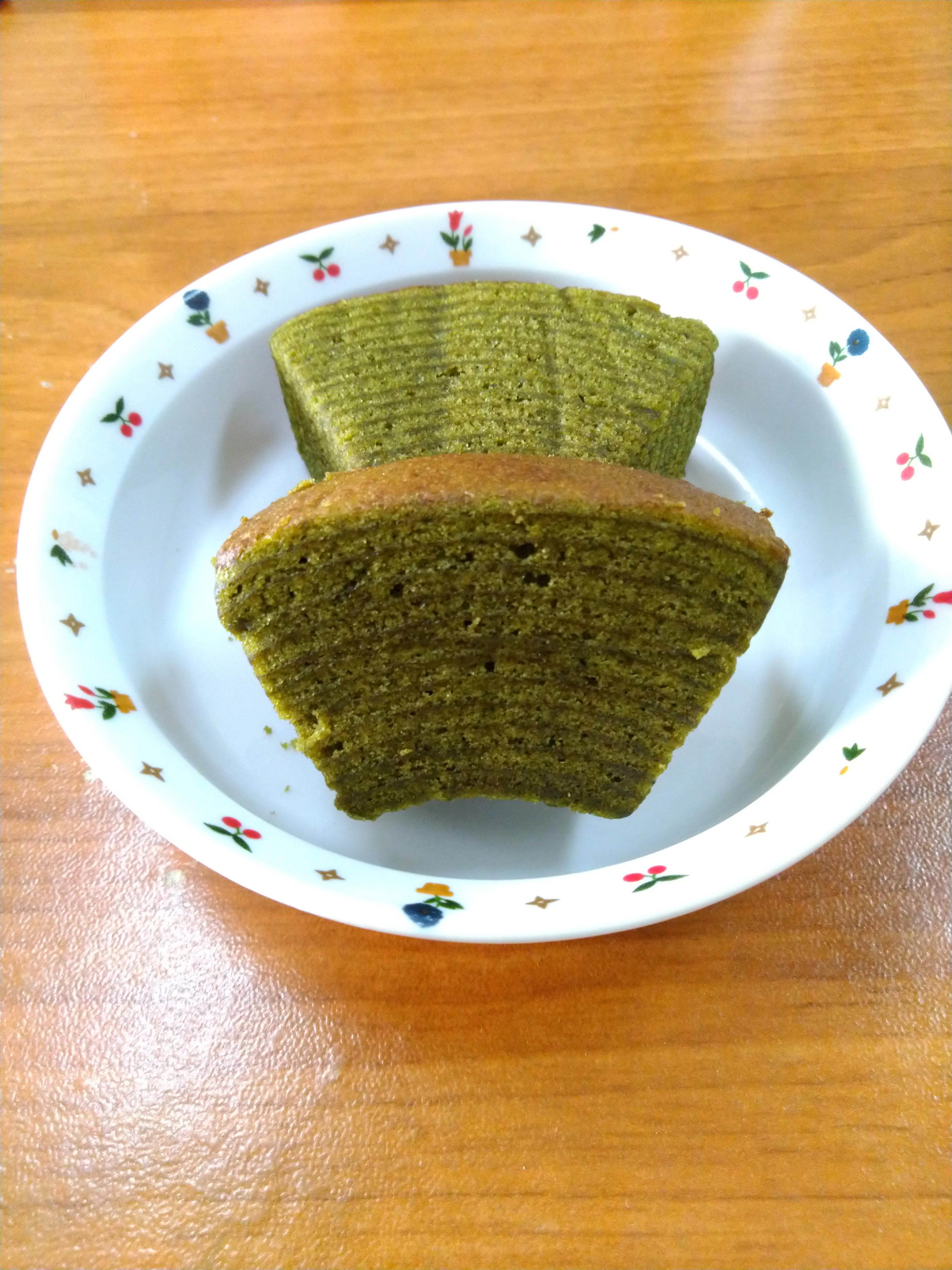 雞蛋、砂糖、小麥粉、人造奶油、酥油(芥籽油)、麥芽糖、抹茶、綠藻、牛奶、食鹽、氧化澱粉、甜味劑(D-山梨醇)、脂肪酸甘油酯、膨脹劑(碳酸氫鈉)、食用色素(黃梔子、胡蘿蔔素)、香料、(原材料的一部份含有小麥、雞蛋、牛奶、大豆)