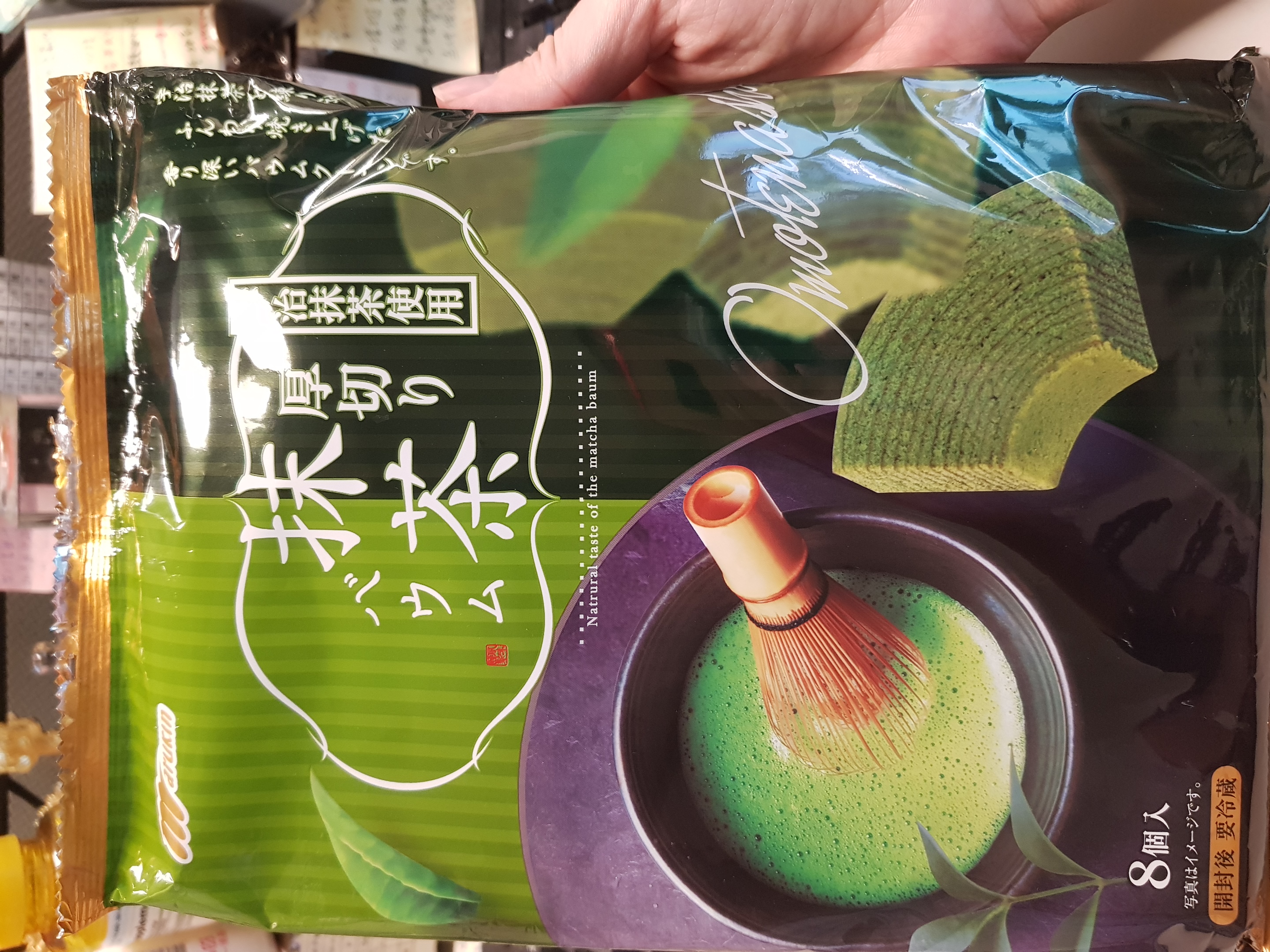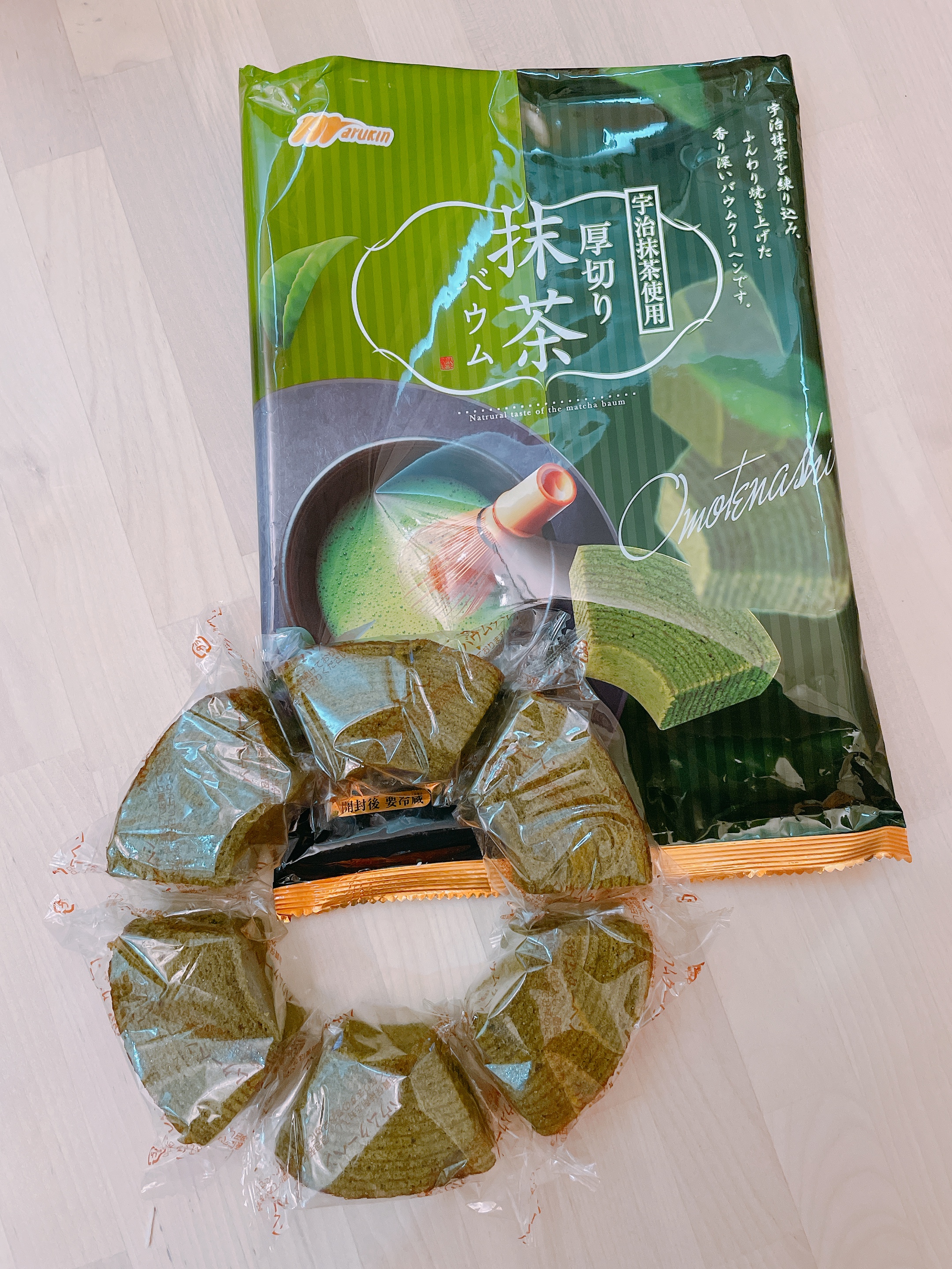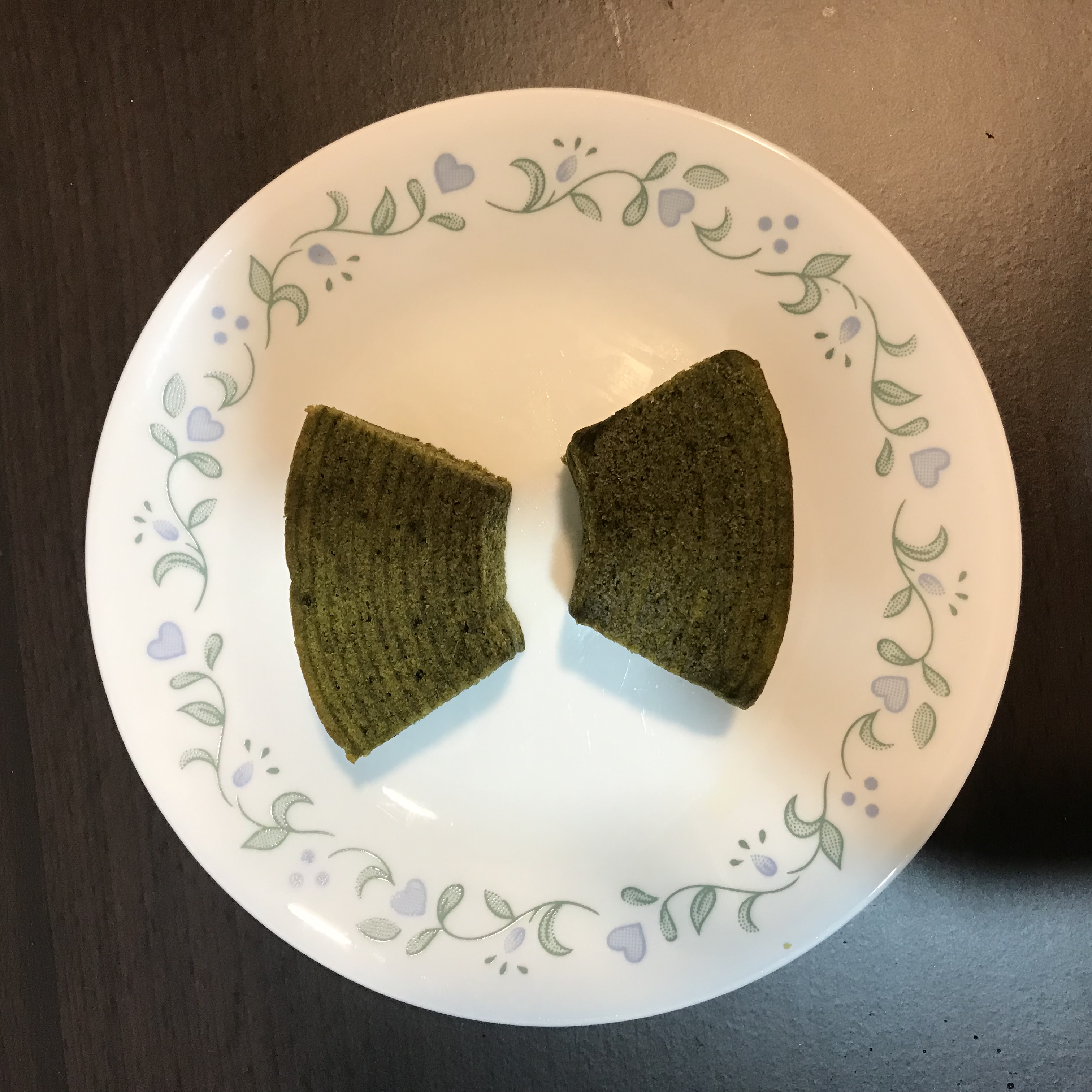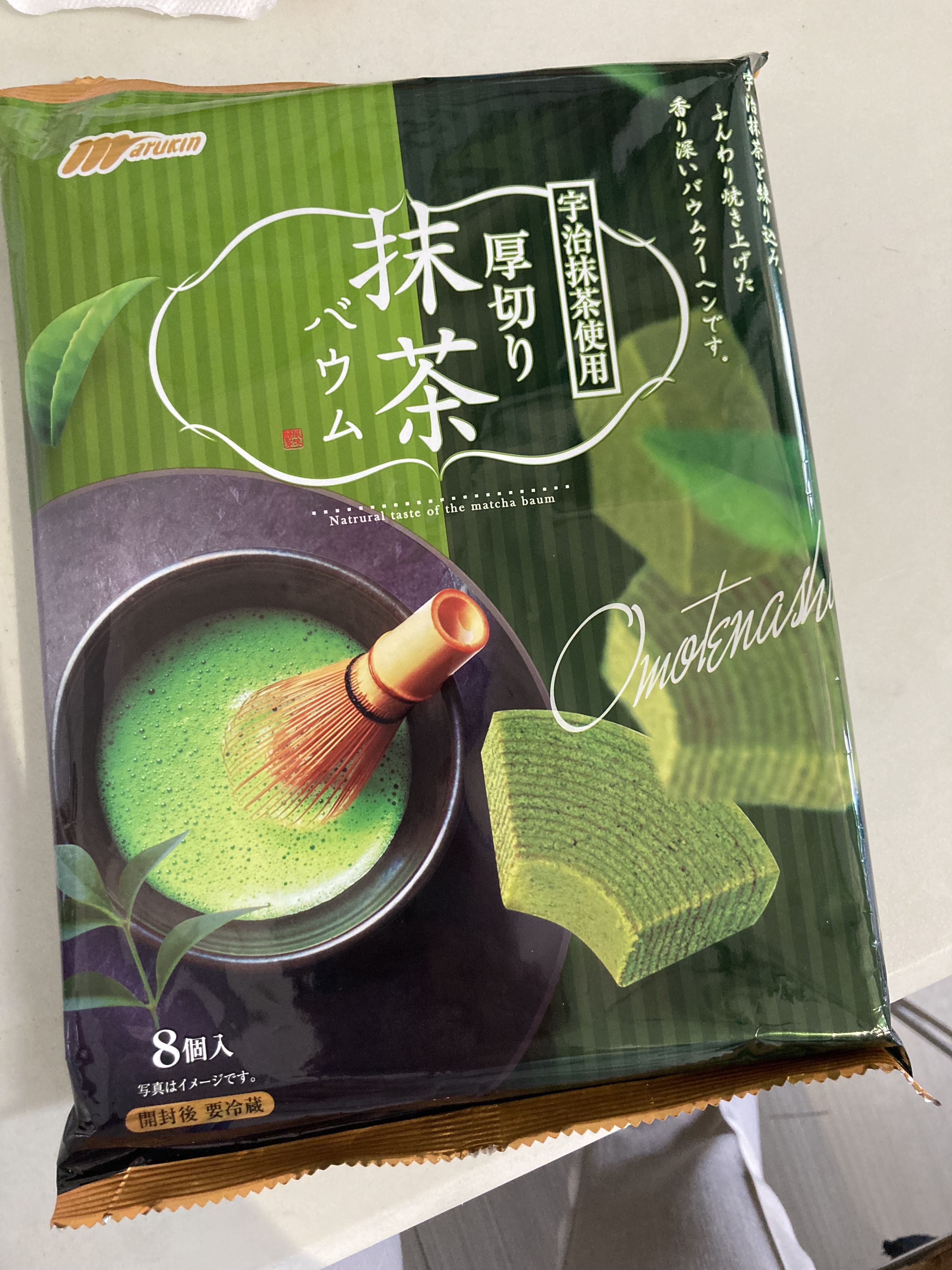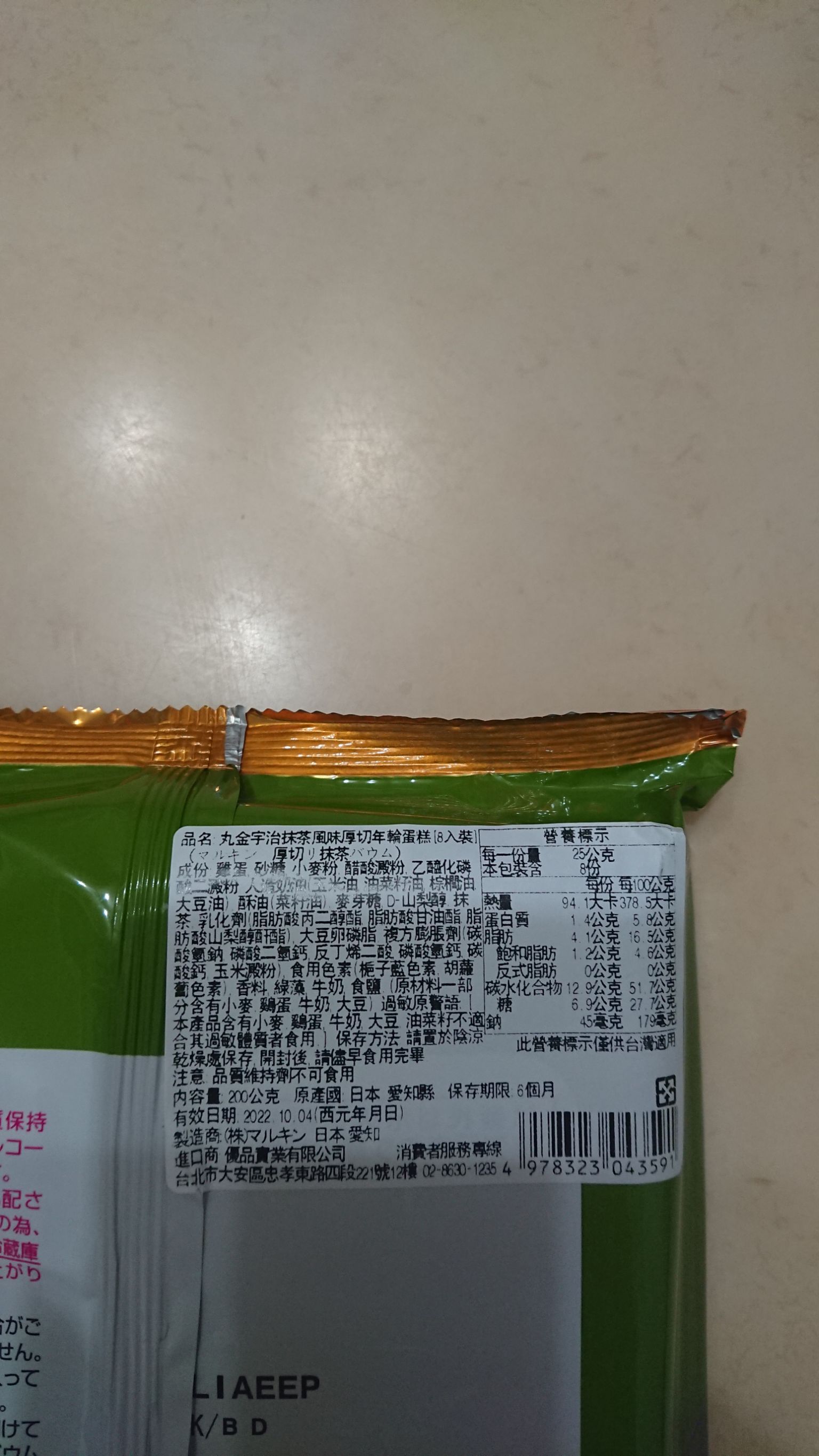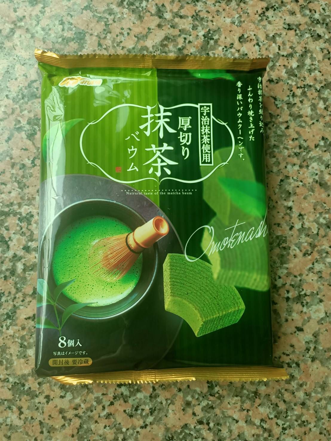 雞蛋、砂糖、小麥粉、人造奶油、酥油(芥籽油)、麥芽糖、抹茶、綠藻、牛奶、食鹽、氧化澱粉、甜味劑(D-山梨醇)、脂肪酸甘油酯、膨脹劑(碳酸氫鈉)、食用色素(黃梔子、胡蘿蔔素)、香料、(原材料的一部份含有小麥、雞蛋、牛奶、大豆)