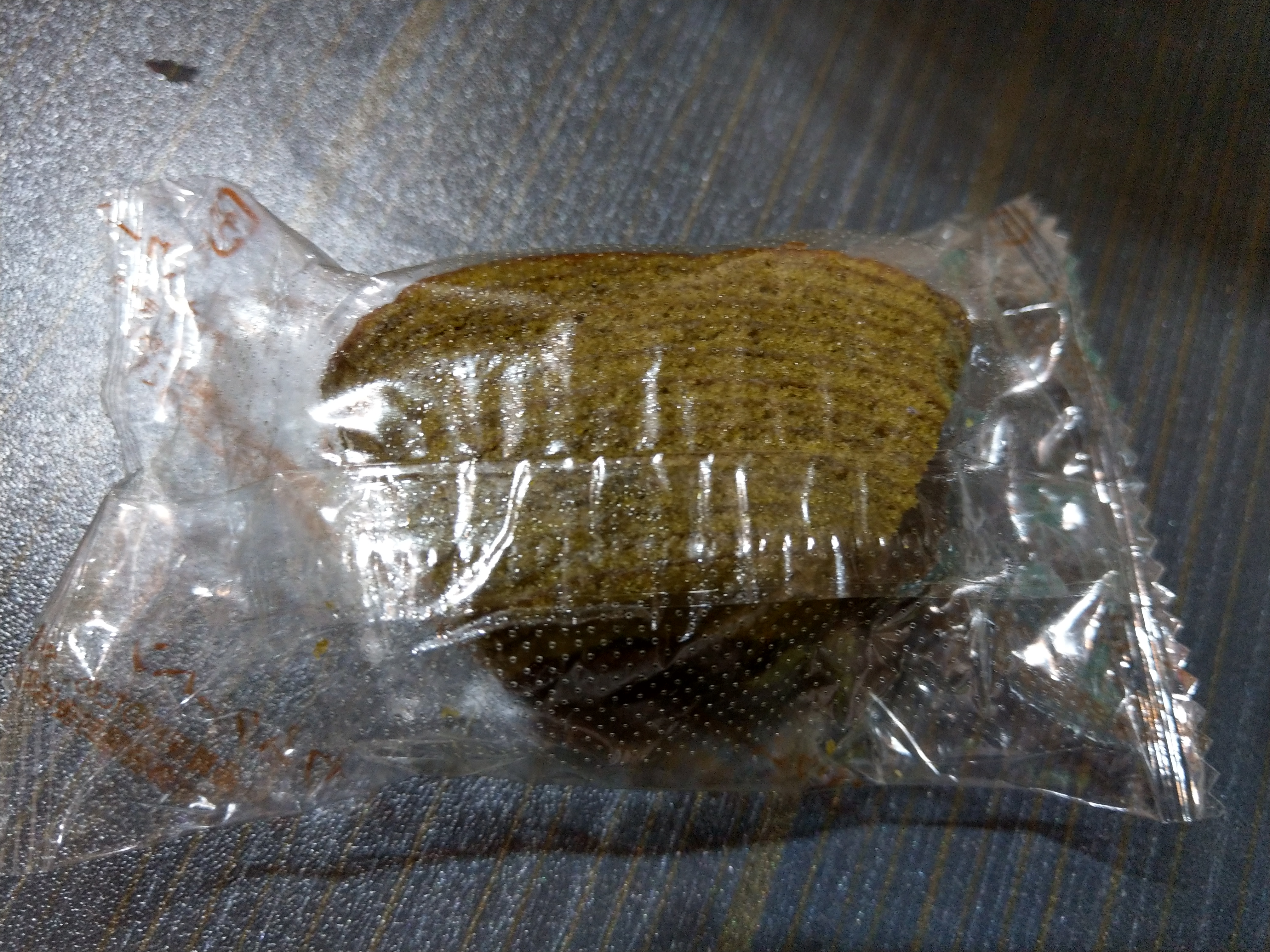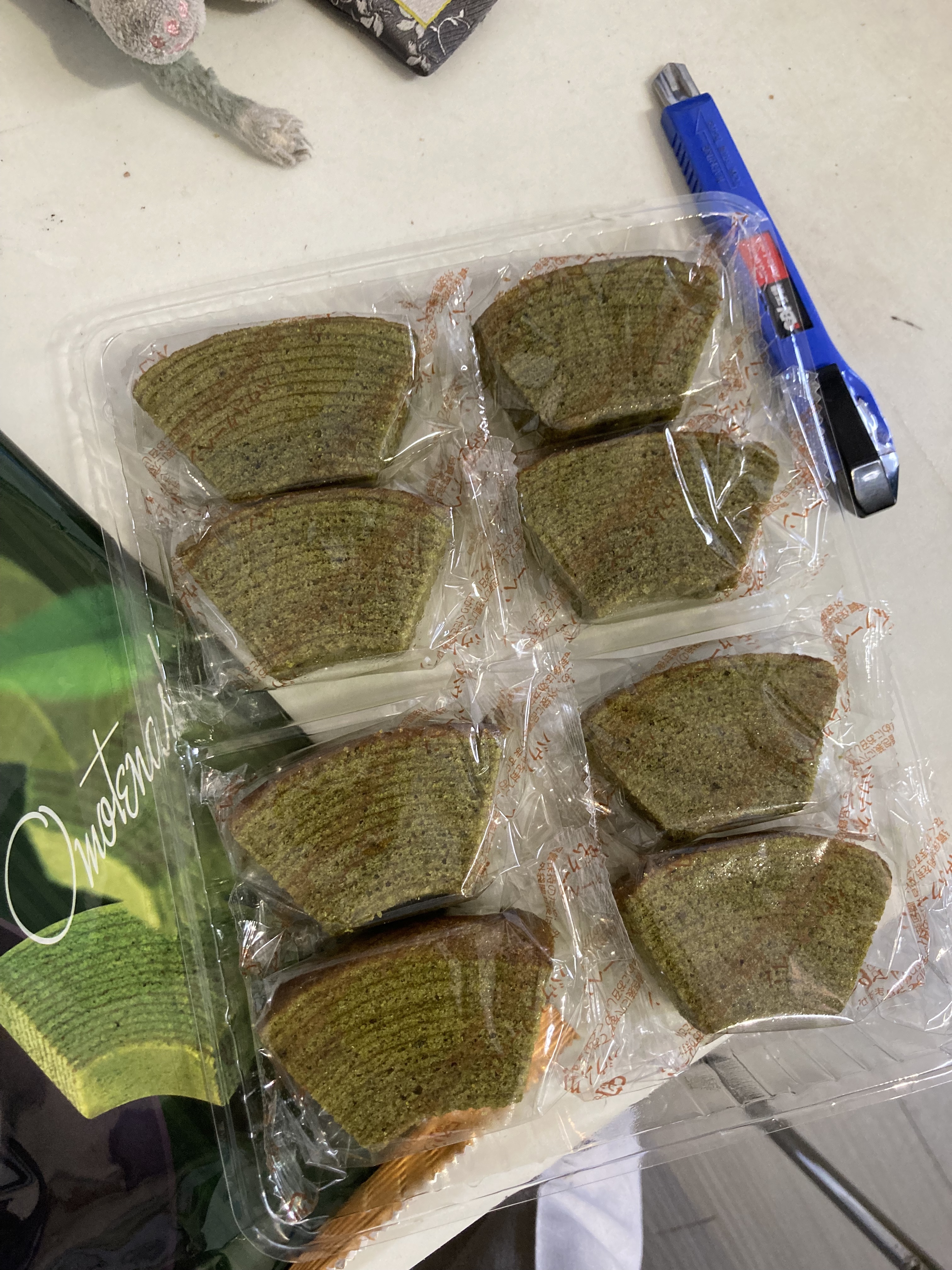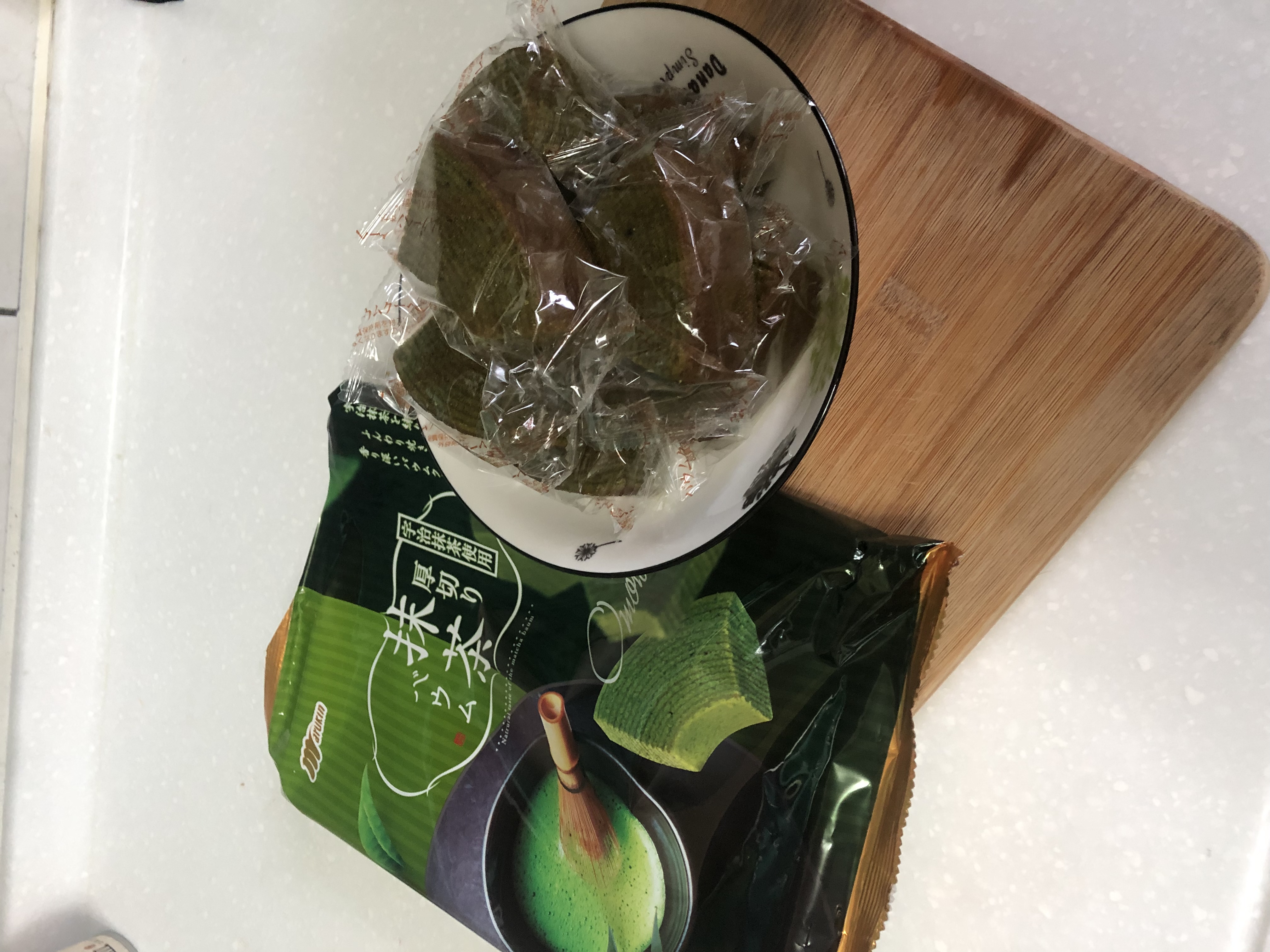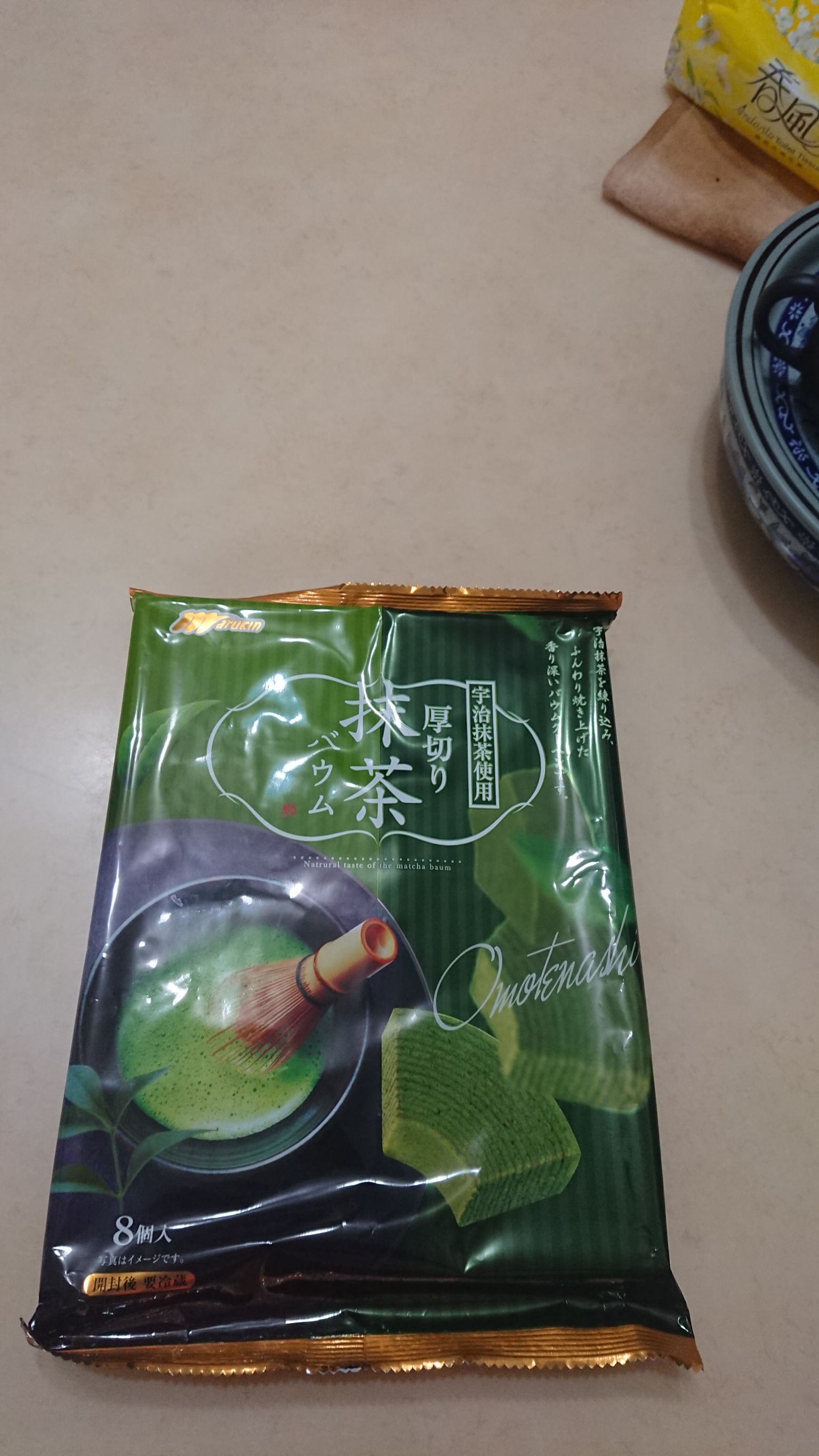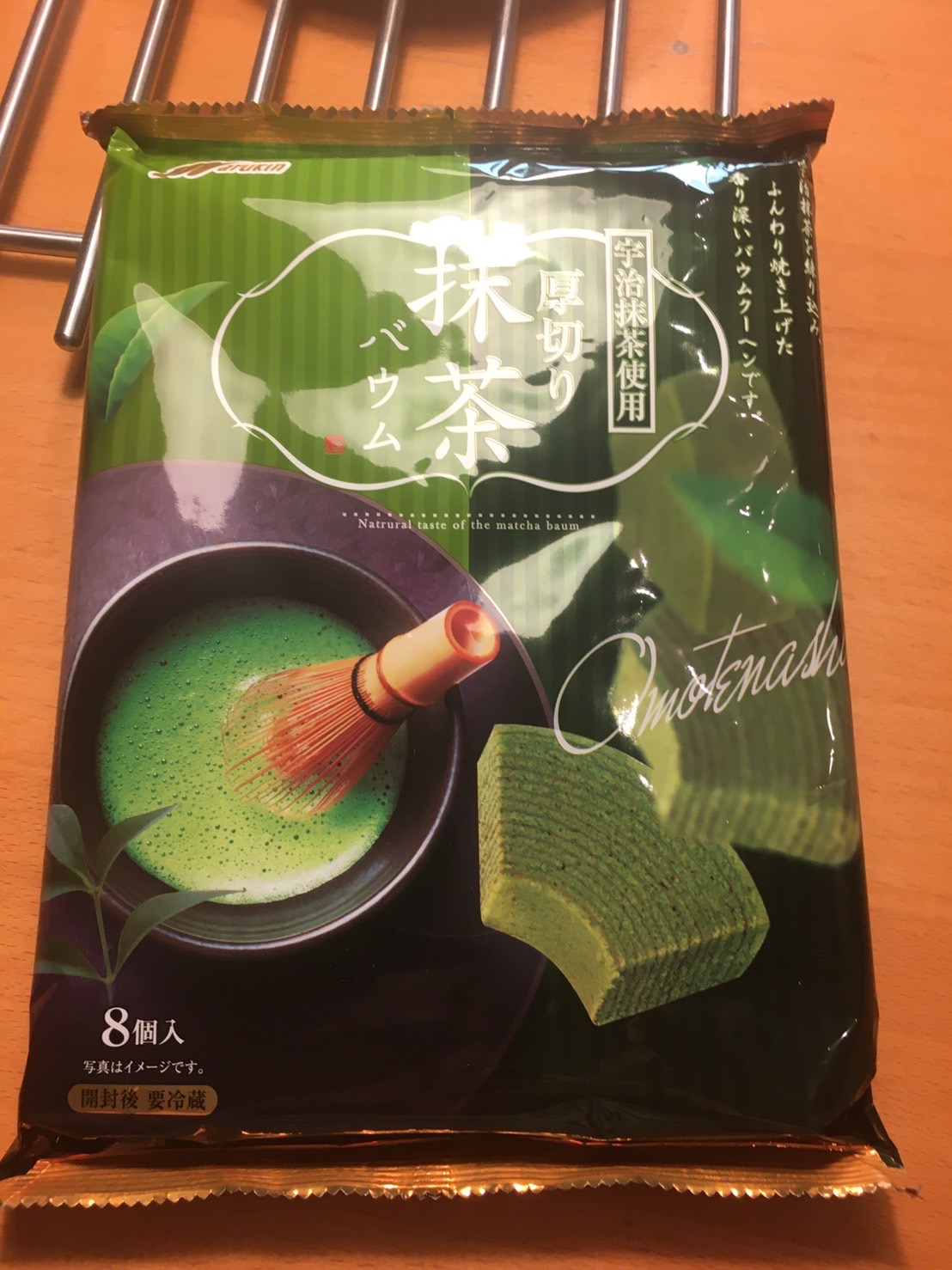 雞蛋、砂糖、小麥粉、人造奶油、酥油(芥籽油)、麥芽糖、抹茶、綠藻、牛奶、食鹽、氧化澱粉、甜味劑(D-山梨醇)、脂肪酸甘油酯、膨脹劑(碳酸氫鈉)、食用色素(黃梔子、胡蘿蔔素)、香料、(原材料的一部份含有小麥、雞蛋、牛奶、大豆)