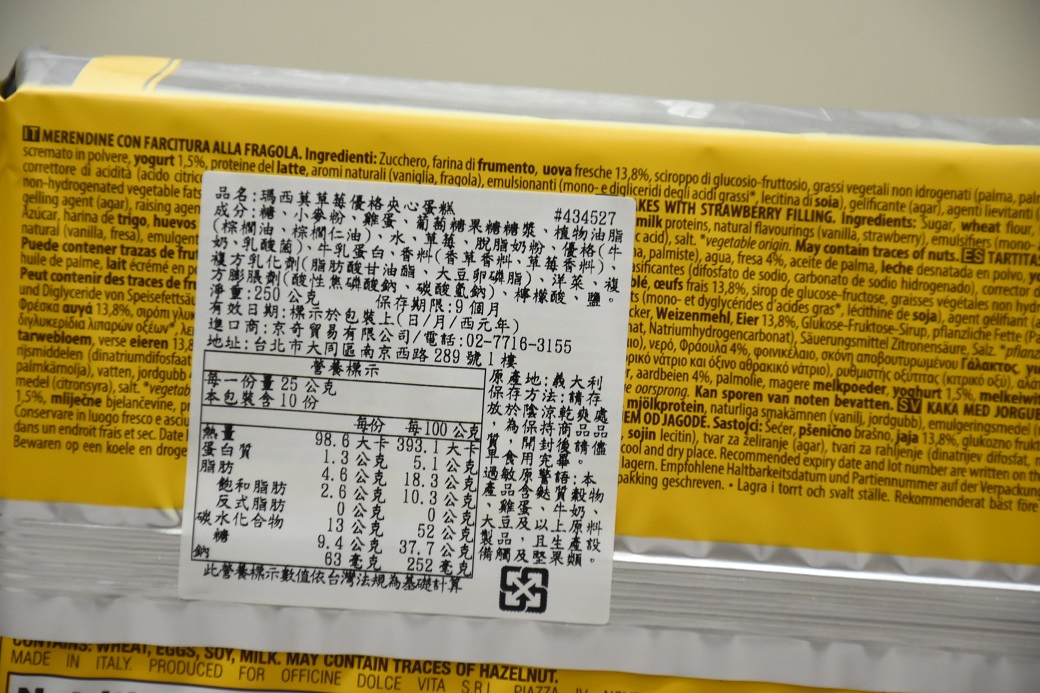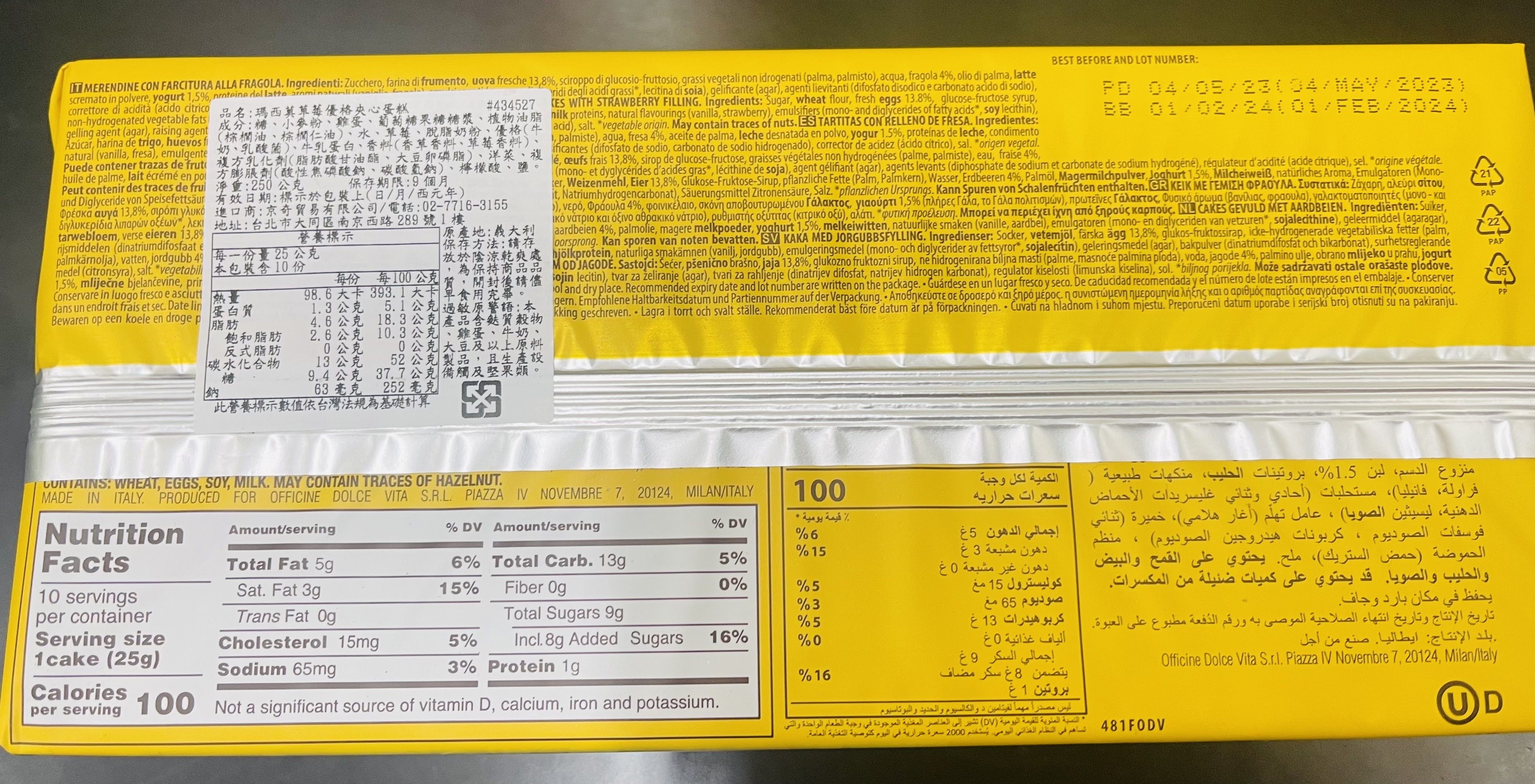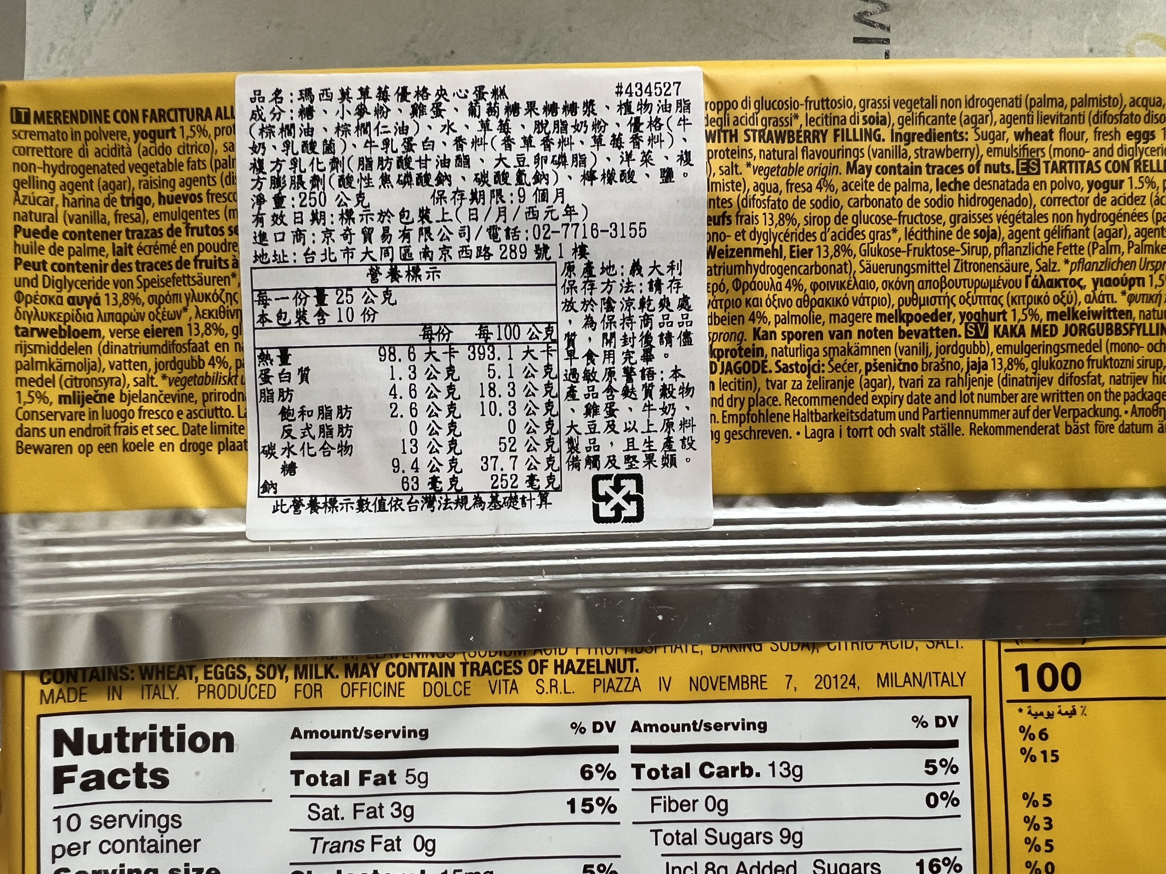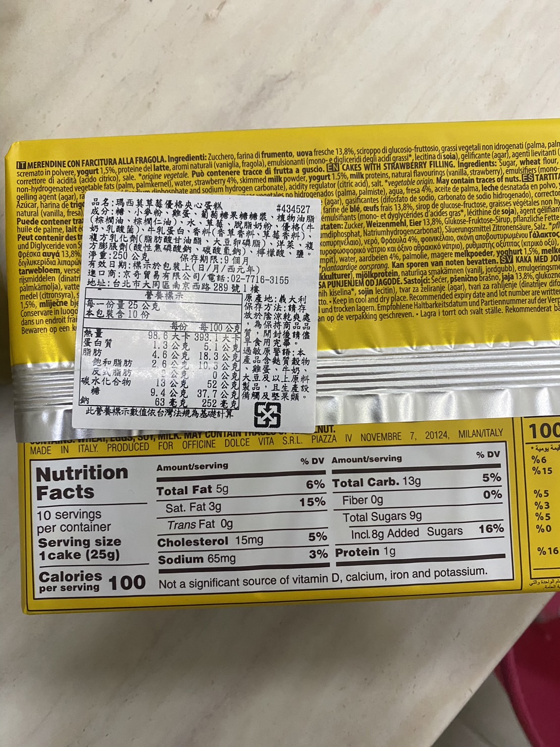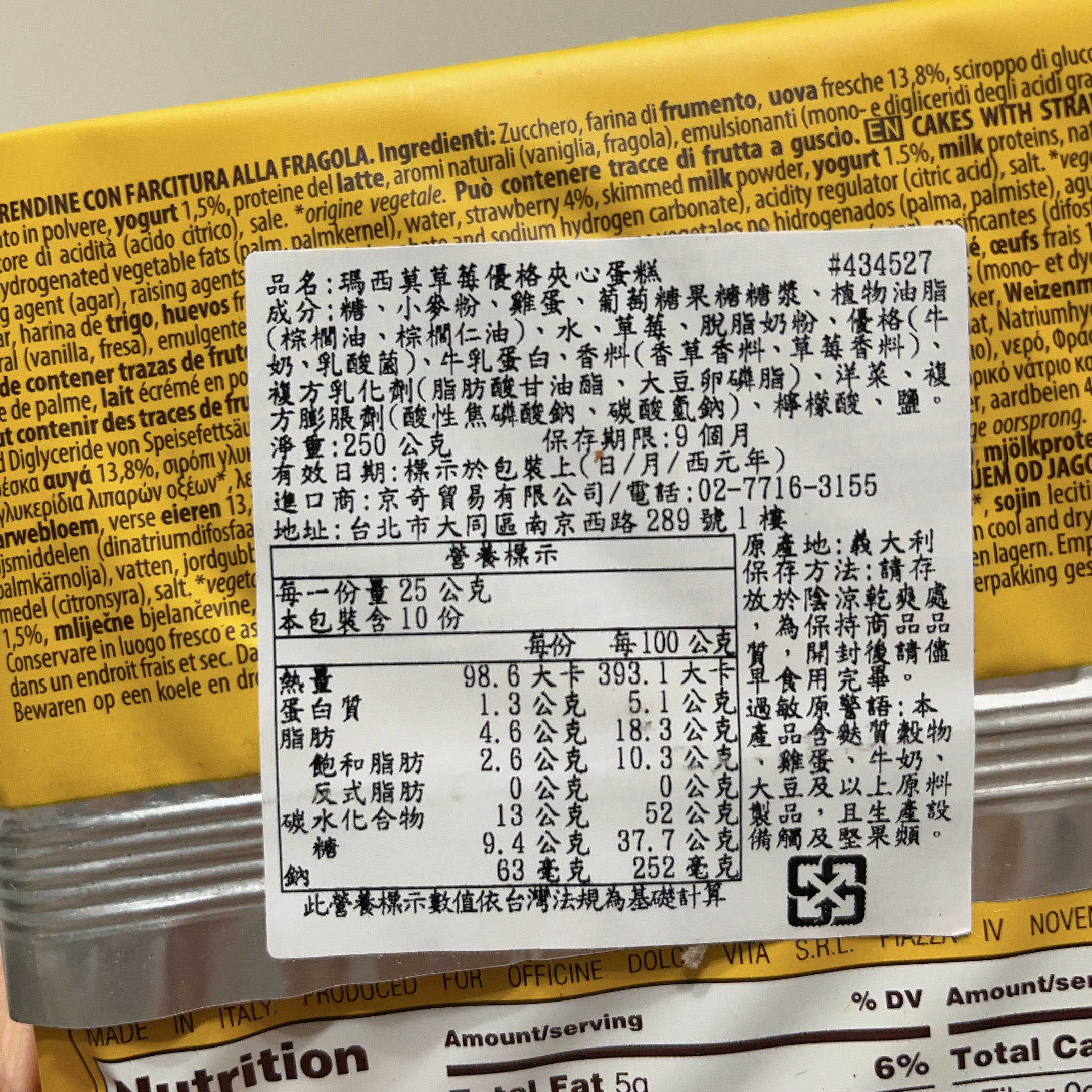 糖、小麥粉、雞蛋、葡萄糖果糖糖漿、非氫化植物油脂(棕梠油,棕梠仁油)、水、草莓、脫脂奶粉、優格(牛奶,乳酸菌)、乳蛋白