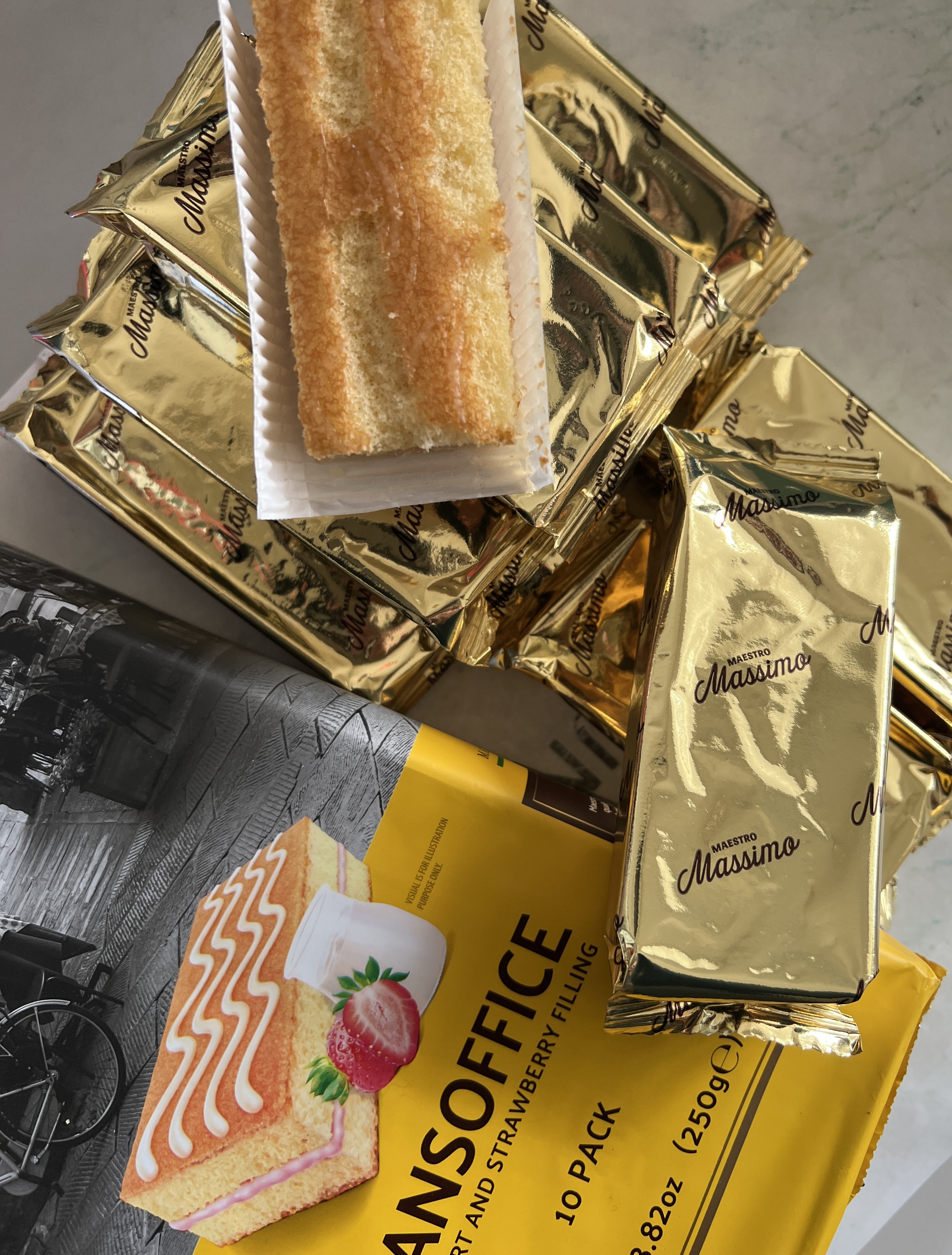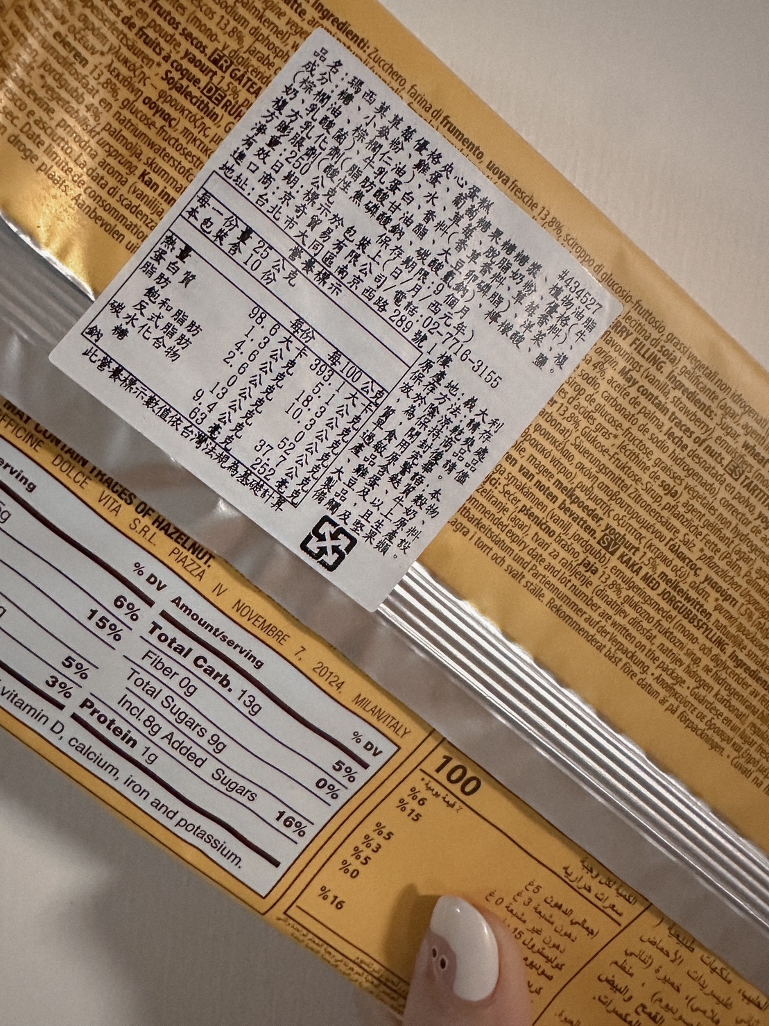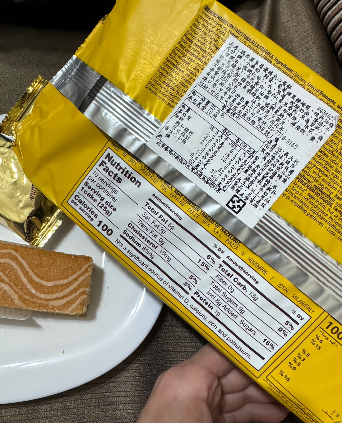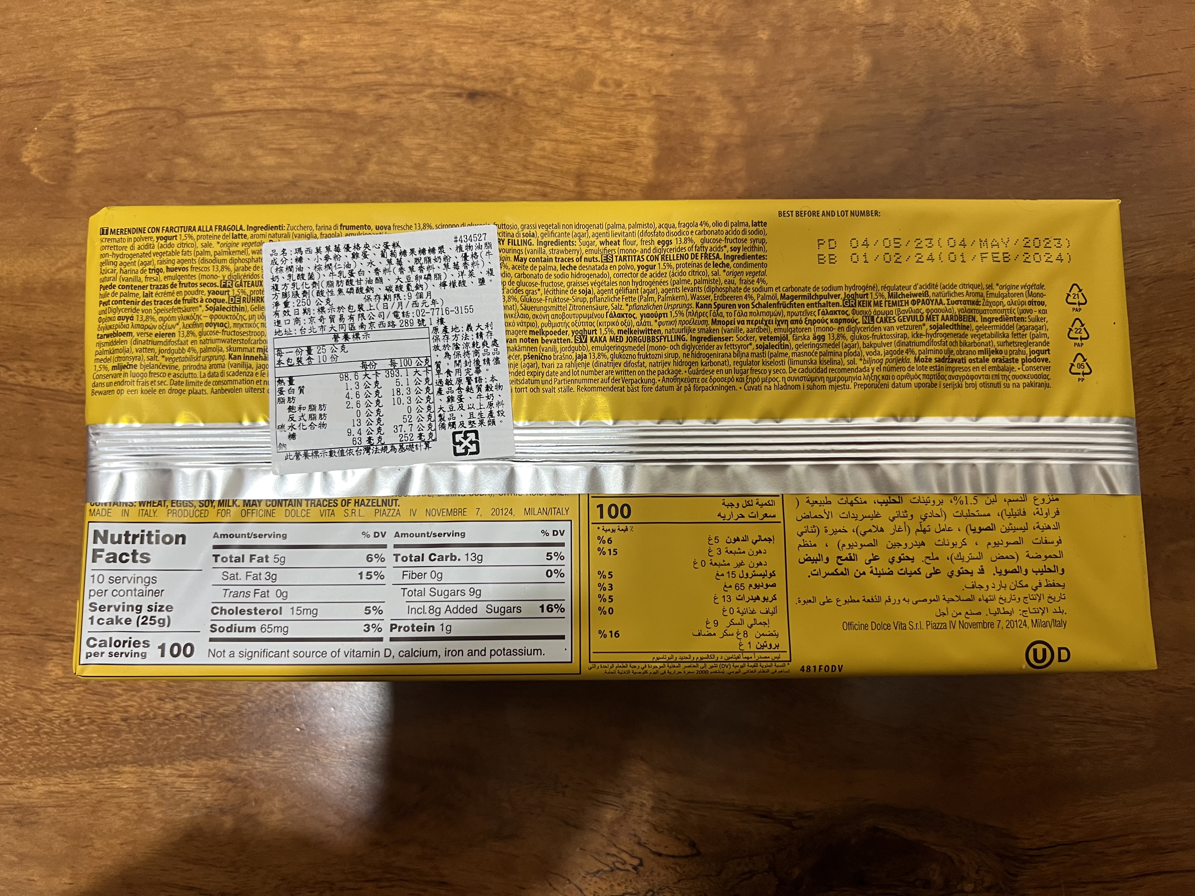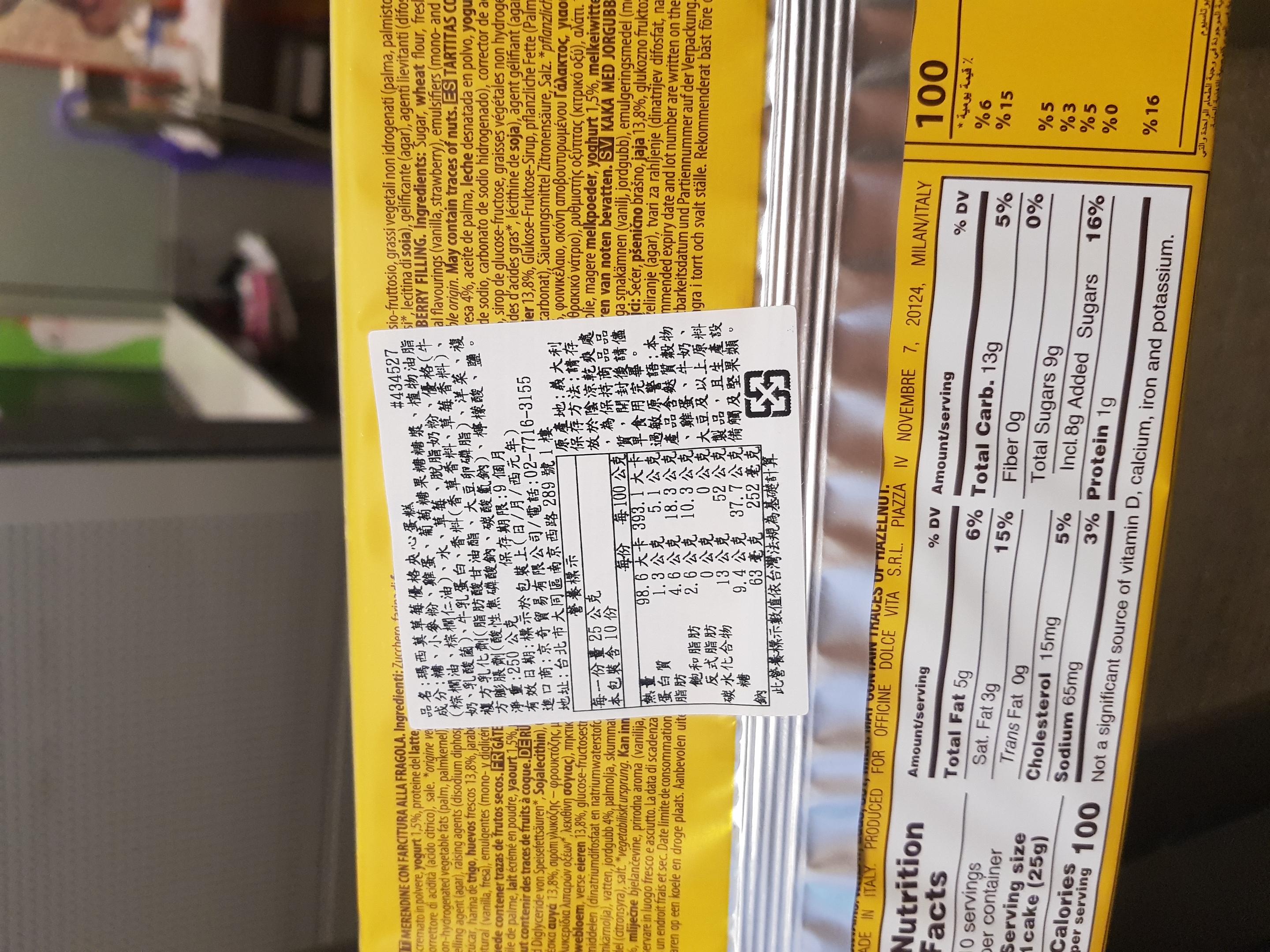 糖、小麥粉、雞蛋、葡萄糖果糖糖漿、非氫化植物油脂(棕梠油,棕梠仁油)、水、草莓、脫脂奶粉、優格(牛奶,乳酸菌)、乳蛋白