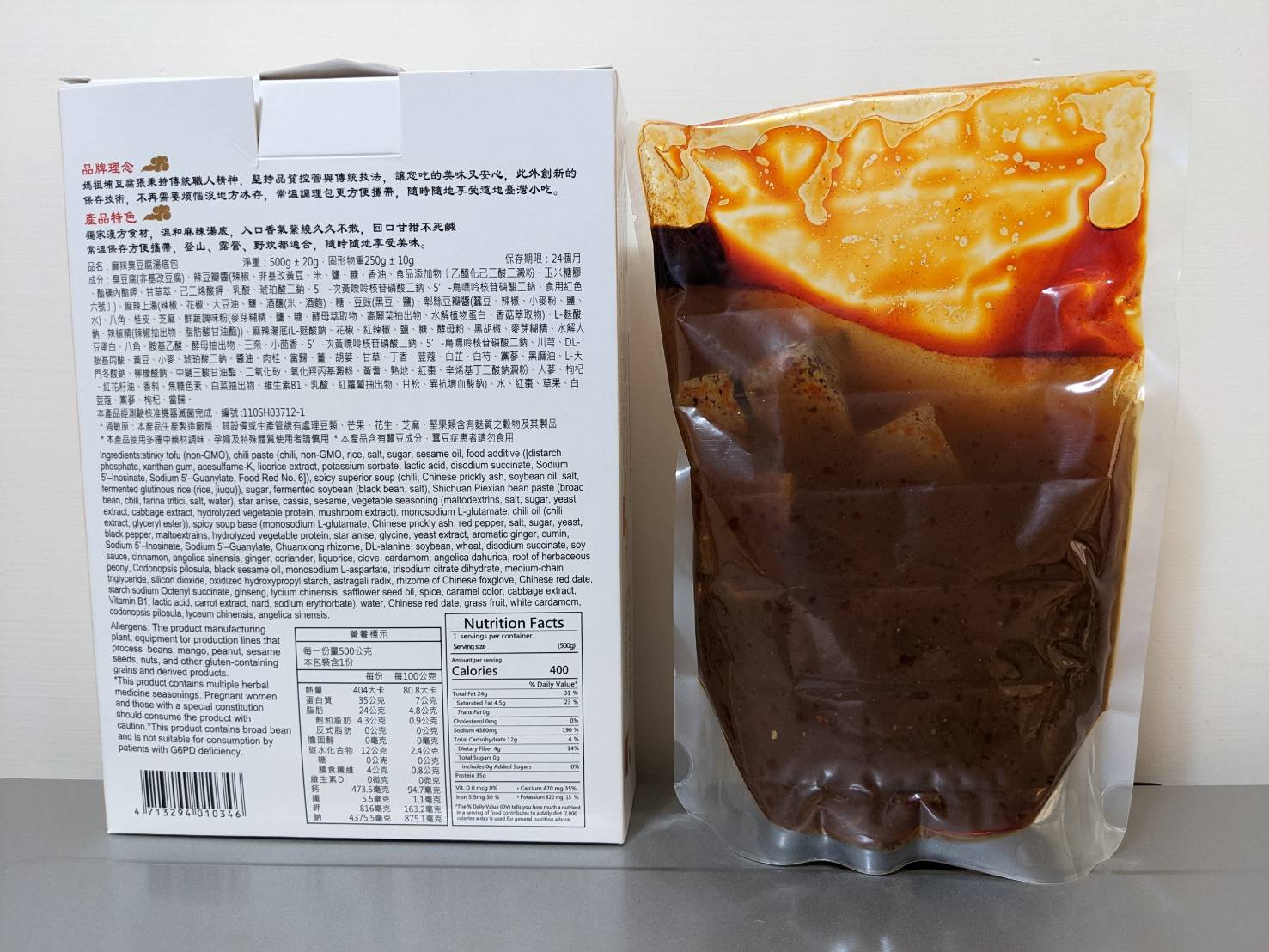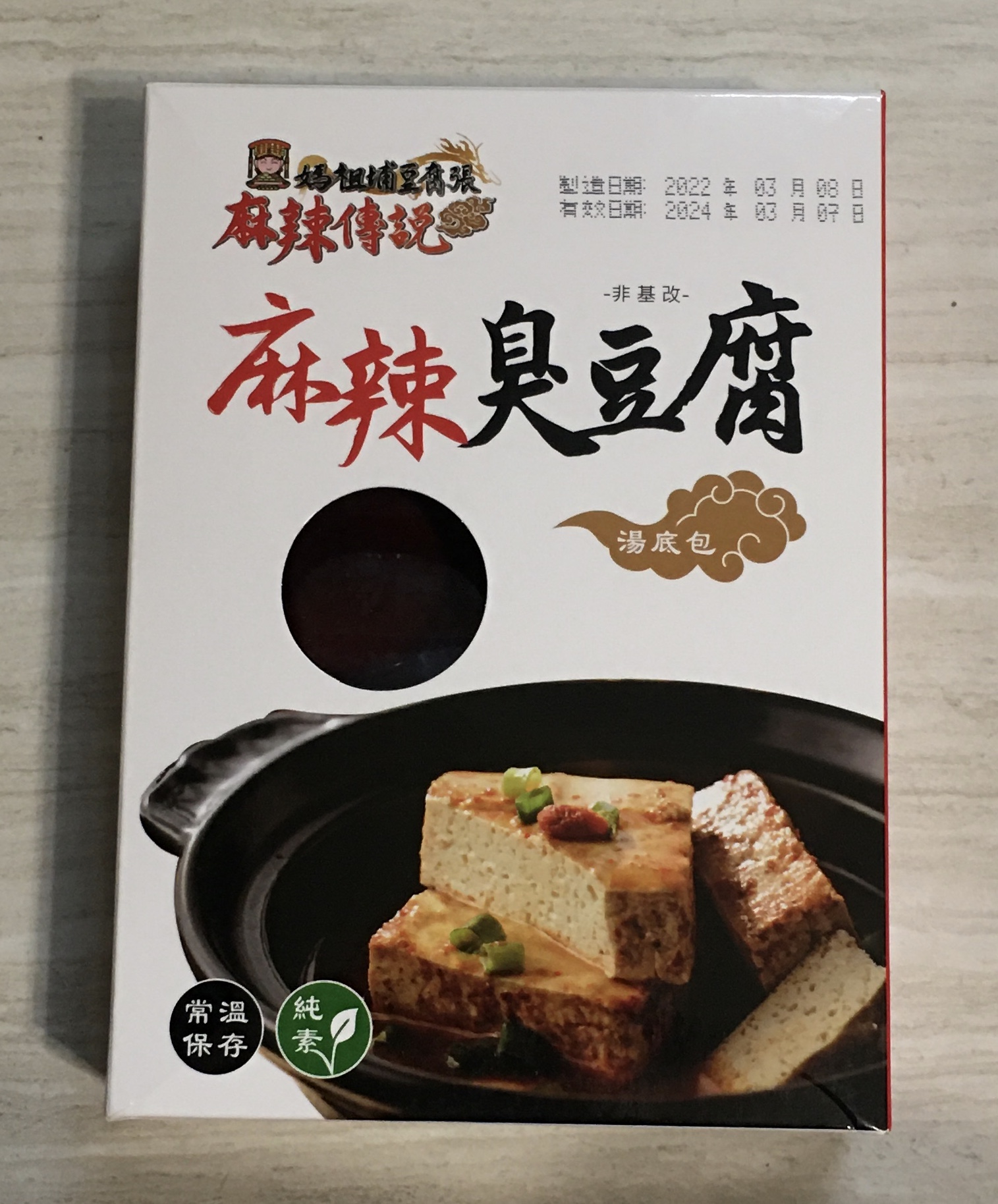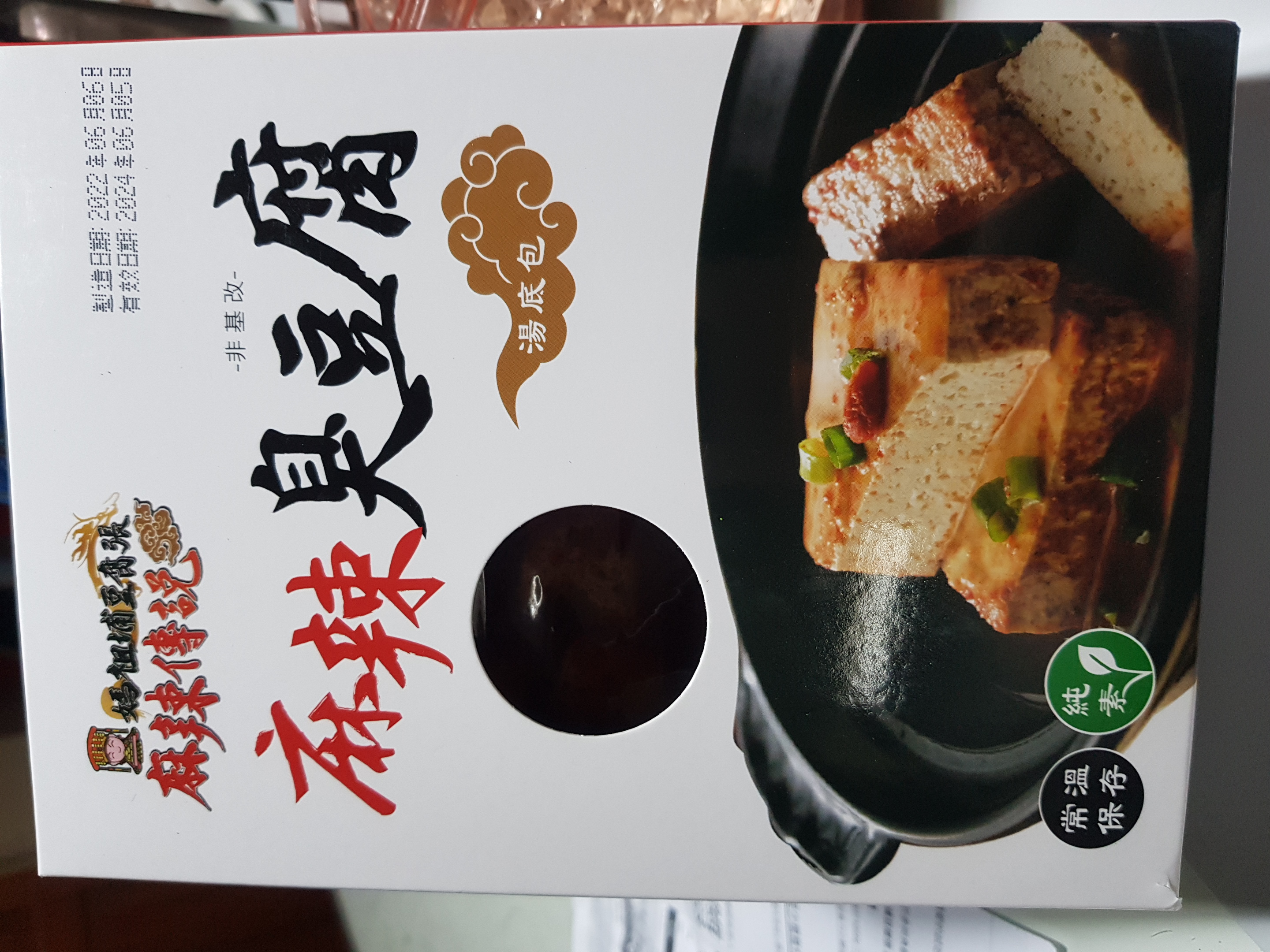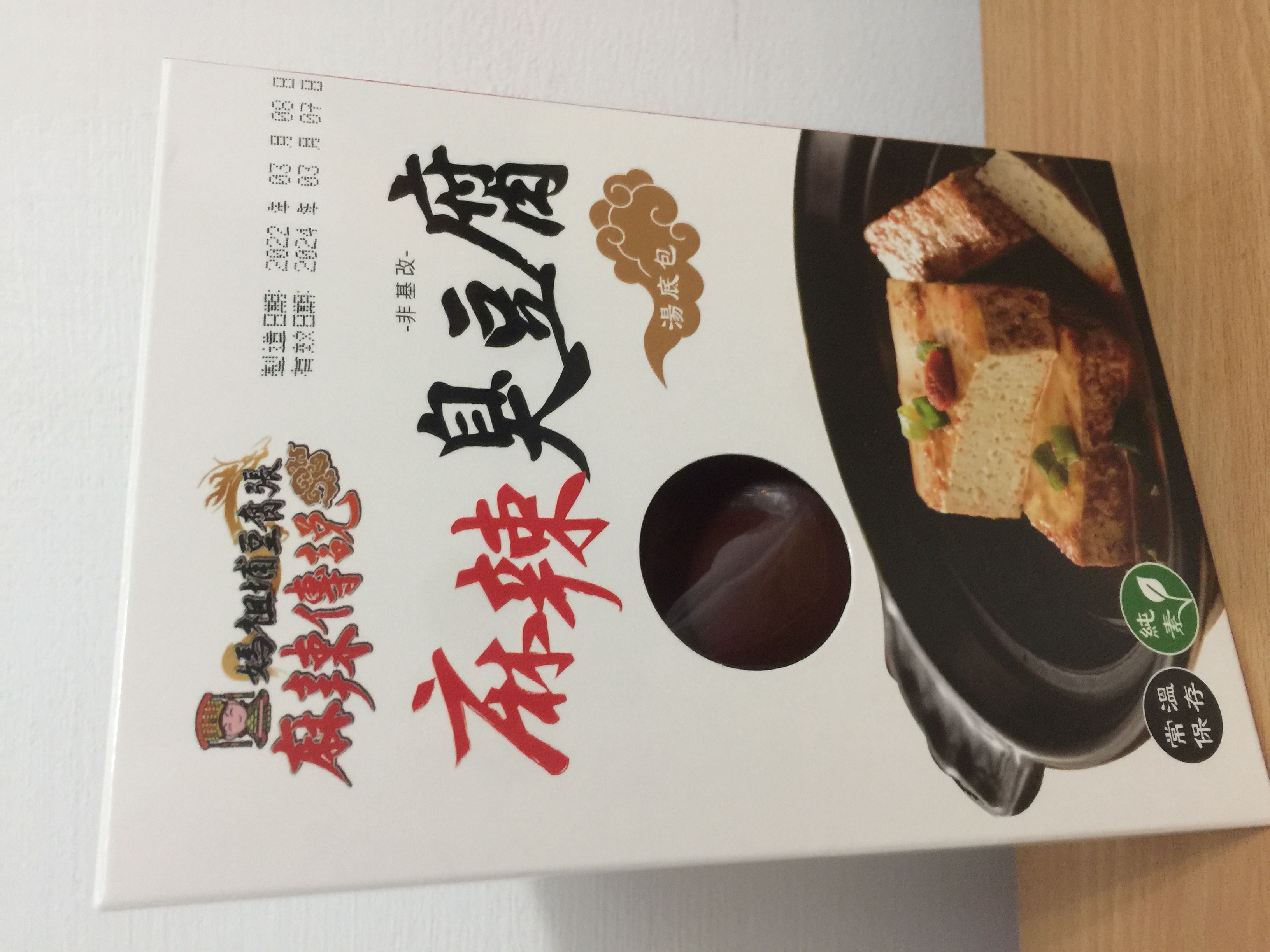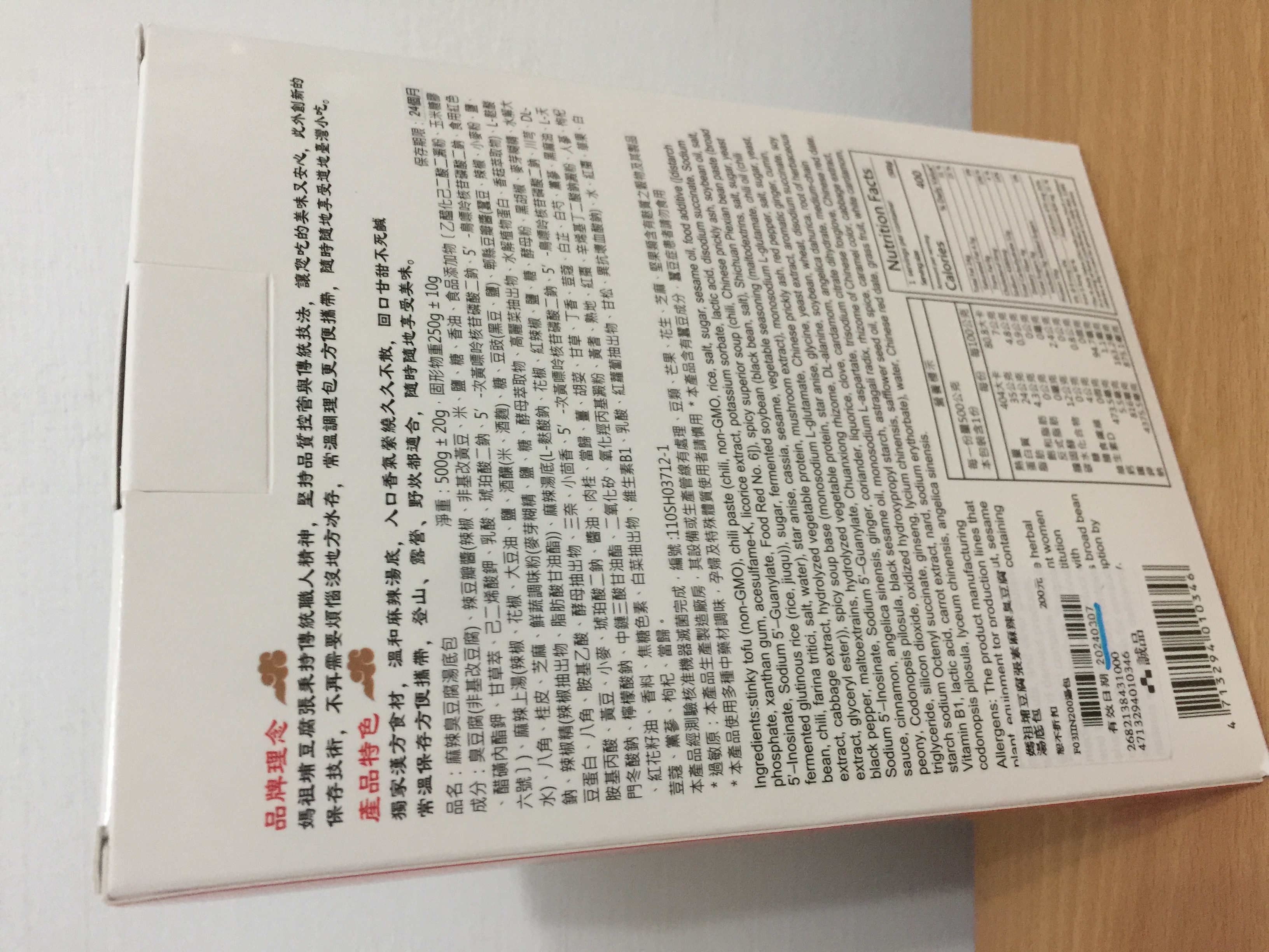 臭豆腐(非基改豆腐)、辣豆瓣醬(辣椒、非基改黃豆、米、鹽、糖、香油、食品添加物〔乙醯化己二酸二澱粉、玉米糖膠、醋磺內酯鉀、甘草萃、己二烯酸鉀、乳酸、琥珀酸二鈉、5’-次黃嘌呤核苷磷酸二鈉、5’-鳥嘌呤核苷磷酸二鈉、食用紅色六號〕)、麻辣上湯(辣椒、花椒、大豆油、鹽、酒釀(米、酒麴)、糖、豆豉(黑豆、鹽)、郫縣豆瓣醬(蠶豆、辣椒、小麥粉、鹽、水)、八角、桂皮、芝麻、鮮蔬調味粉(麥芽糊精、鹽、糖、酵母萃取物、高麗菜抽出物、水解植物蛋白、香菇萃取物)、L-麩酸鈉、辣椒精(辣椒抽出物、脂肪酸甘油酯))、麻辣湯底(L-麩酸鈉、花椒、紅辣椒、鹽、糖、酵母粉、黑胡椒、麥芽糊精、水解大豆蛋白、八角、胺基乙酸、酵母抽出物、三奈、小茴香、5’-次黃嘌呤核苷磷酸二鈉、5’-鳥嘌呤核苷磷酸二鈉、川芎、DL-胺基丙酸、黃豆、小麥、琥珀酸二鈉、醬油、肉桂、當歸、薑、胡荽、甘草、丁香、荳蔻、白芷、白芍、黨蔘、黑麻油、L-天門冬酸鈉、檸檬酸鈉、中鏈三酸甘油酯、二氧化矽、氧化羥丙基澱粉、黃耆、熟地、紅棗、辛烯基丁二酸鈉澱粉、人蔘、枸杞、紅花籽油、香料、焦糖色素、白菜抽出物、維生素B1、乳酸、紅蘿蔔抽出物、甘松、異抗壞血酸鈉)、水、紅棗、草果、白荳蔻、黨蔘、枸杞、當歸。
