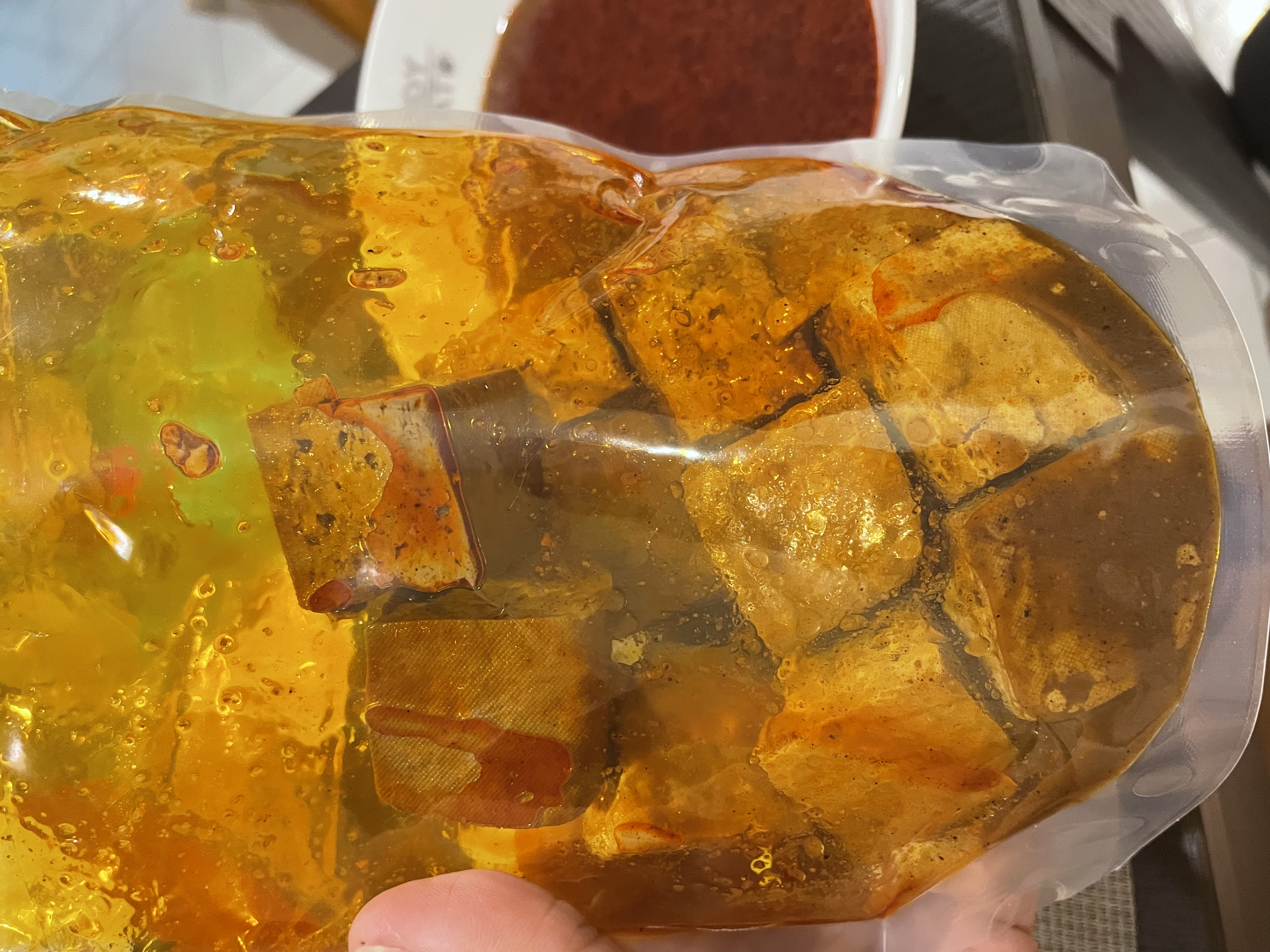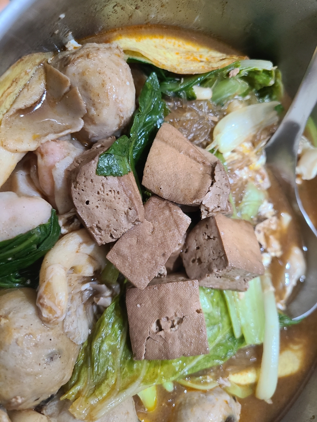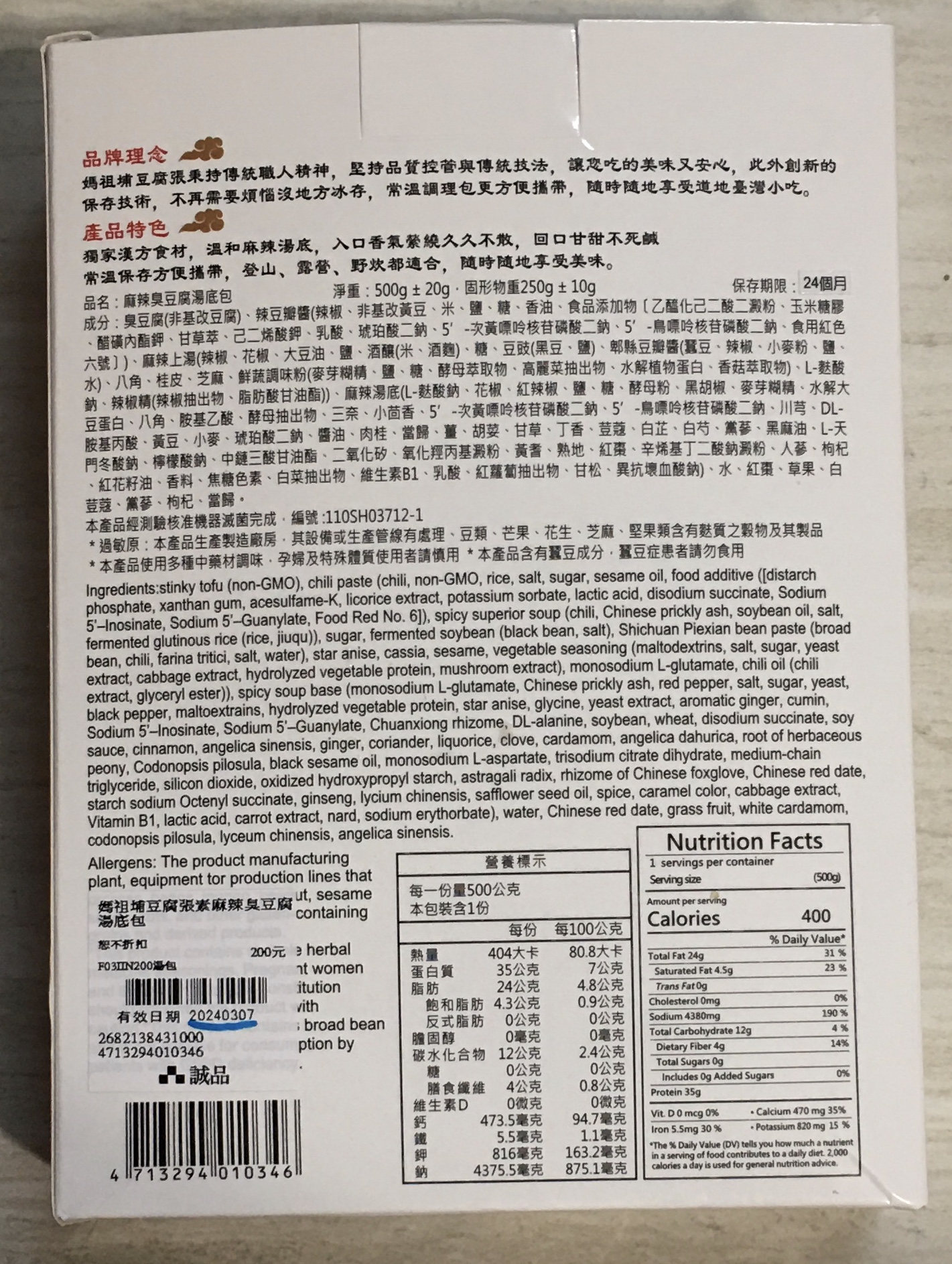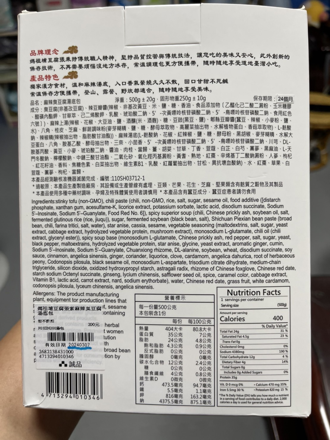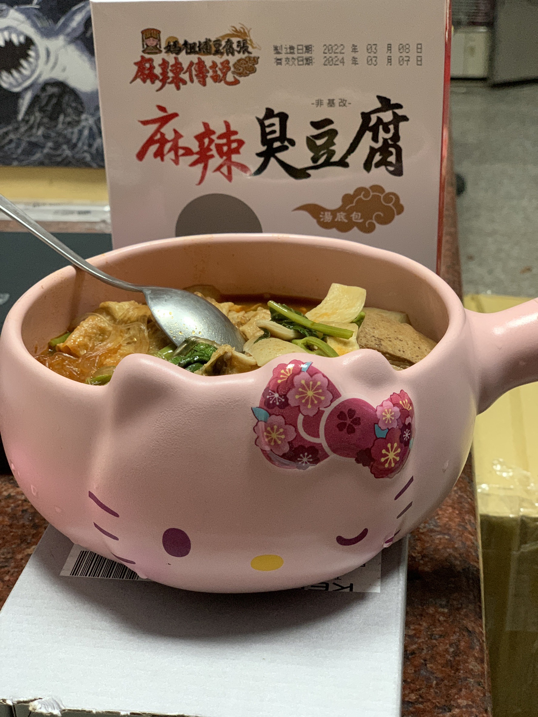 臭豆腐(非基改豆腐)、辣豆瓣醬(辣椒、非基改黃豆、米、鹽、糖、香油、食品添加物〔乙醯化己二酸二澱粉、玉米糖膠、醋磺內酯鉀、甘草萃、己二烯酸鉀、乳酸、琥珀酸二鈉、5’-次黃嘌呤核苷磷酸二鈉、5’-鳥嘌呤核苷磷酸二鈉、食用紅色六號〕)、麻辣上湯(辣椒、花椒、大豆油、鹽、酒釀(米、酒麴)、糖、豆豉(黑豆、鹽)、郫縣豆瓣醬(蠶豆、辣椒、小麥粉、鹽、水)、八角、桂皮、芝麻、鮮蔬調味粉(麥芽糊精、鹽、糖、酵母萃取物、高麗菜抽出物、水解植物蛋白、香菇萃取物)、L-麩酸鈉、辣椒精(辣椒抽出物、脂肪酸甘油酯))、麻辣湯底(L-麩酸鈉、花椒、紅辣椒、鹽、糖、酵母粉、黑胡椒、麥芽糊精、水解大豆蛋白、八角、胺基乙酸、酵母抽出物、三奈、小茴香、5’-次黃嘌呤核苷磷酸二鈉、5’-鳥嘌呤核苷磷酸二鈉、川芎、DL-胺基丙酸、黃豆、小麥、琥珀酸二鈉、醬油、肉桂、當歸、薑、胡荽、甘草、丁香、荳蔻、白芷、白芍、黨蔘、黑麻油、L-天門冬酸鈉、檸檬酸鈉、中鏈三酸甘油酯、二氧化矽、氧化羥丙基澱粉、黃耆、熟地、紅棗、辛烯基丁二酸鈉澱粉、人蔘、枸杞、紅花籽油、香料、焦糖色素、白菜抽出物、維生素B1、乳酸、紅蘿蔔抽出物、甘松、異抗壞血酸鈉)、水、紅棗、草果、白荳蔻、黨蔘、枸杞、當歸。