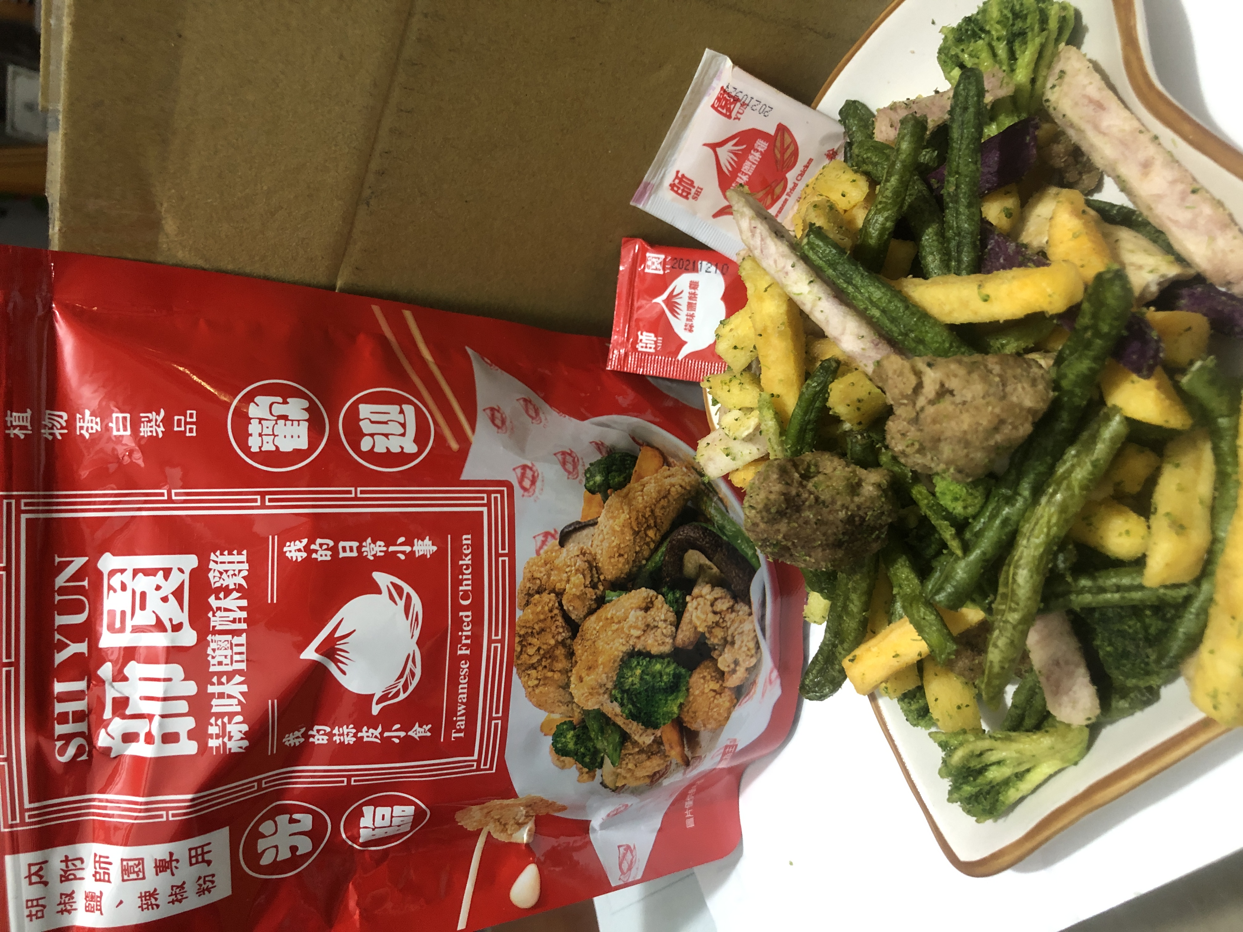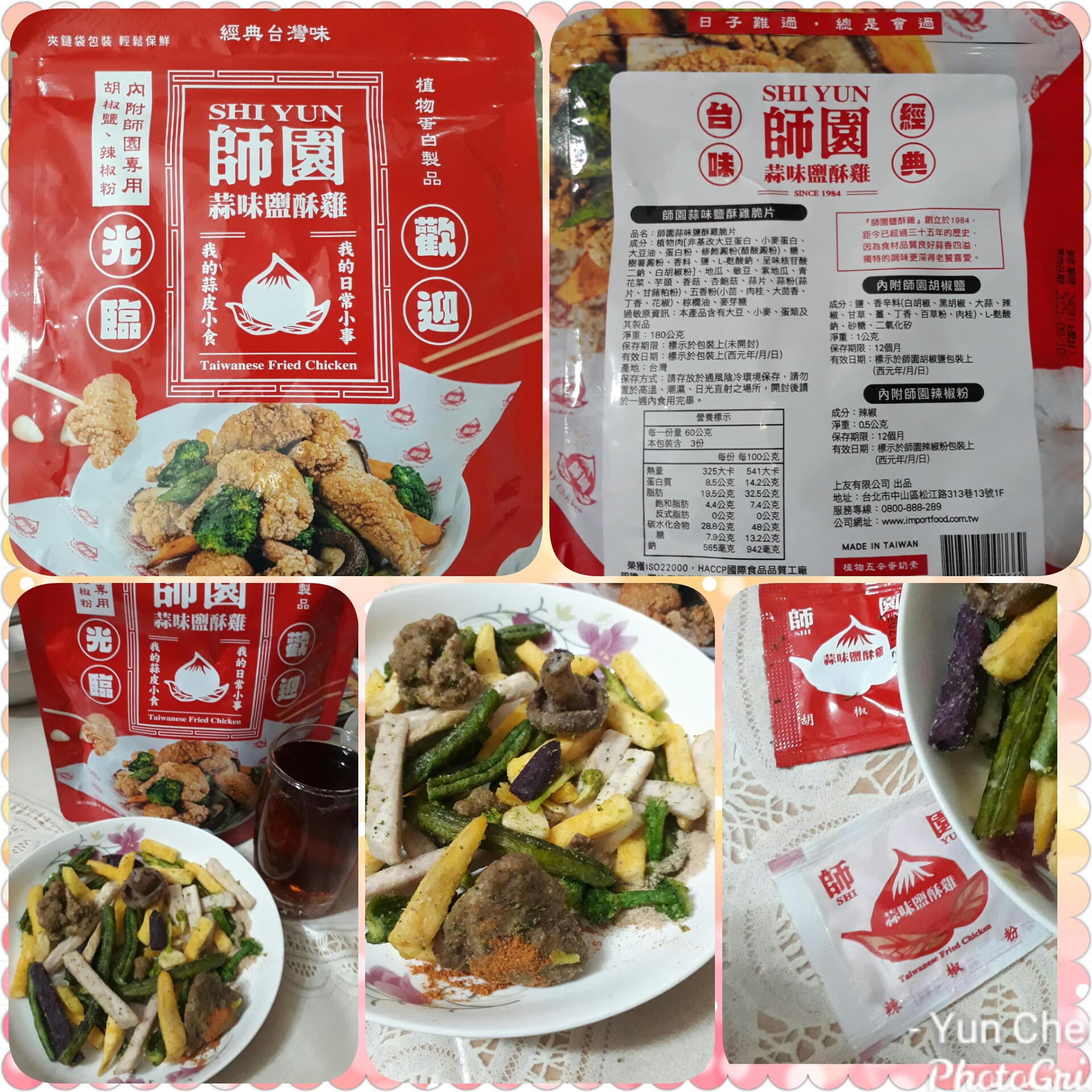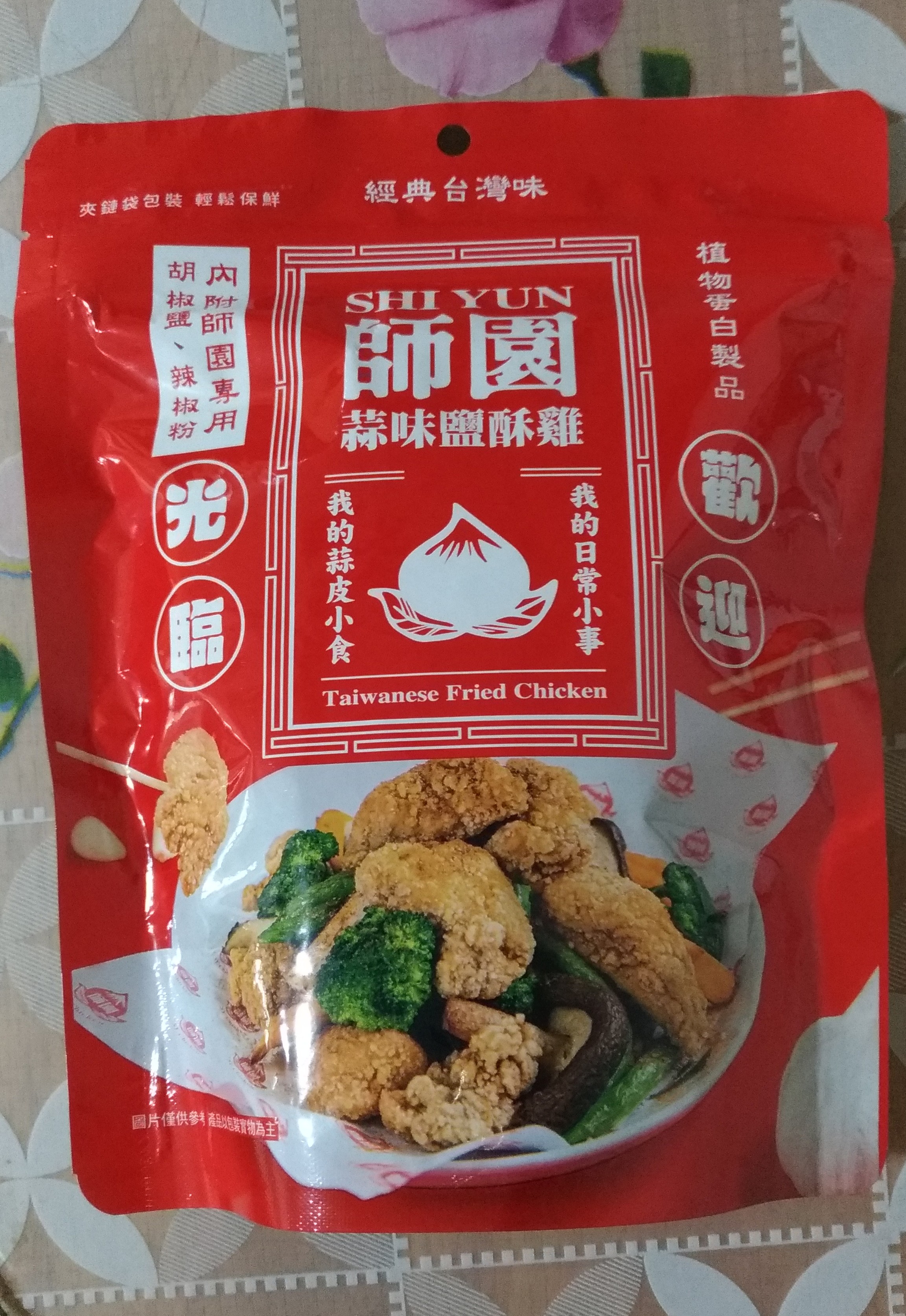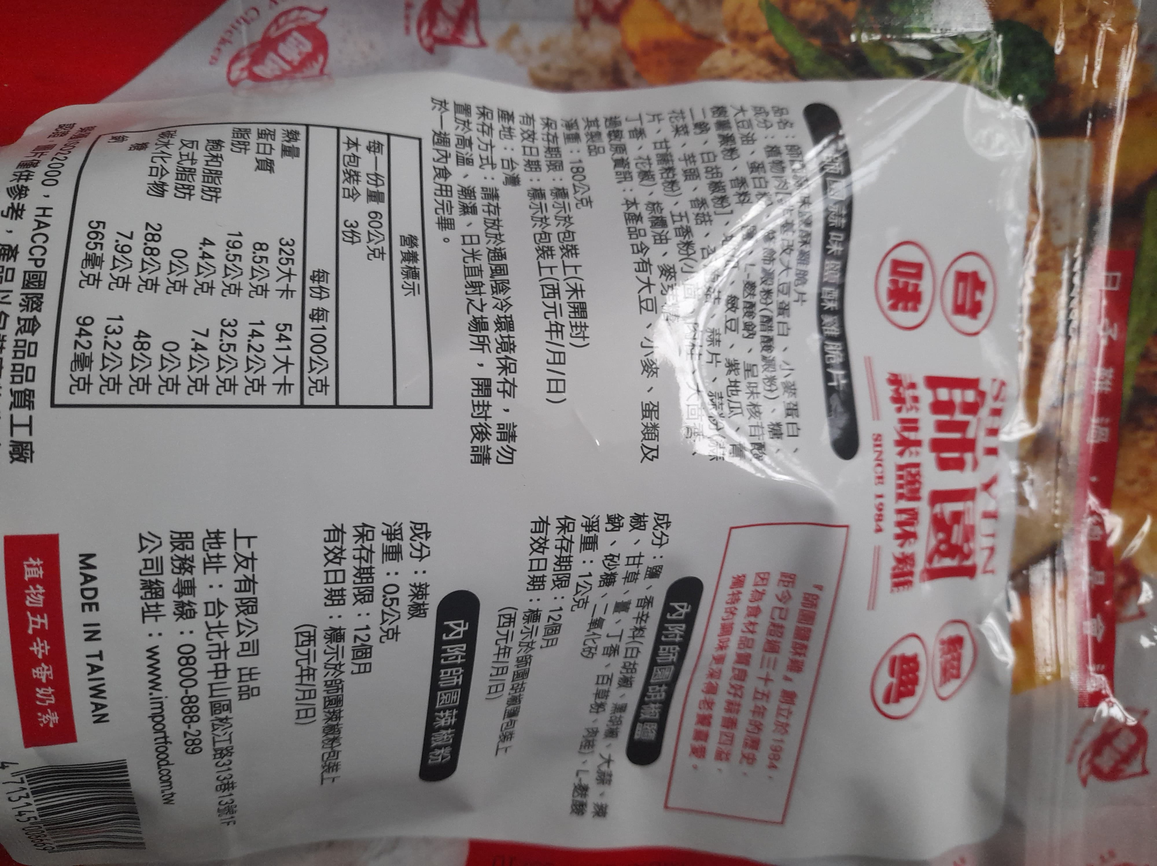 植物肉[非基改大豆蛋白、小麥蛋白、大豆油、蛋白粉、修飾澱粉(醋酸澱粉)、糖、樹薯澱粉、香料、鹽、L-麩酸鈉、呈味核苷酸二鈉、白胡椒粉]、地瓜、敏豆、紫地瓜、青花菜、芋頭、香菇、杏鮑菇、蒜片、蒜粉(蒜片、甘藷粕粉)、五香粉(小茴、肉桂、大茴香、丁香、花椒)、棕櫚油、麥芽糖 內附師園胡椒鹽 成分:鹽、香辛料(白胡椒、黑胡椒、大蒜、辣椒、甘草、薑、丁香、百草粉、肉桂)、L-麩酸鈉、砂糖、二氧化矽 內附師園辣椒粉 成分:辣椒