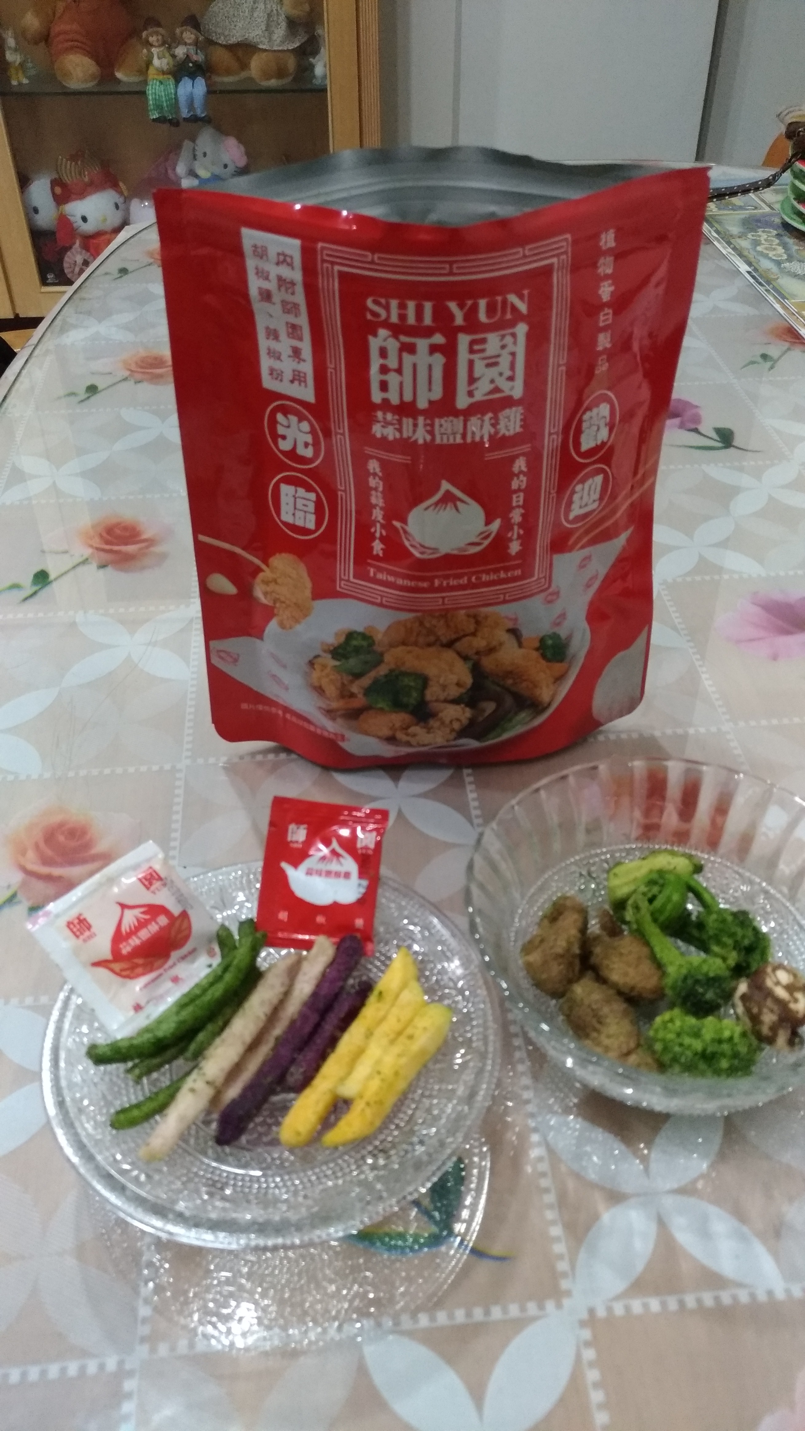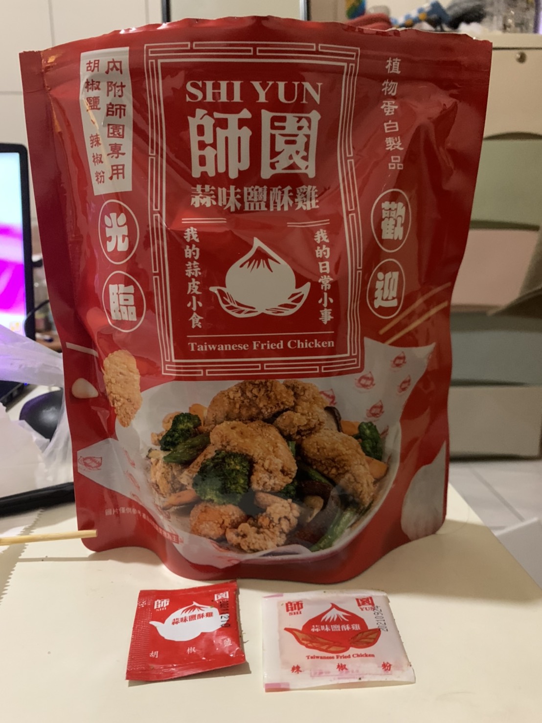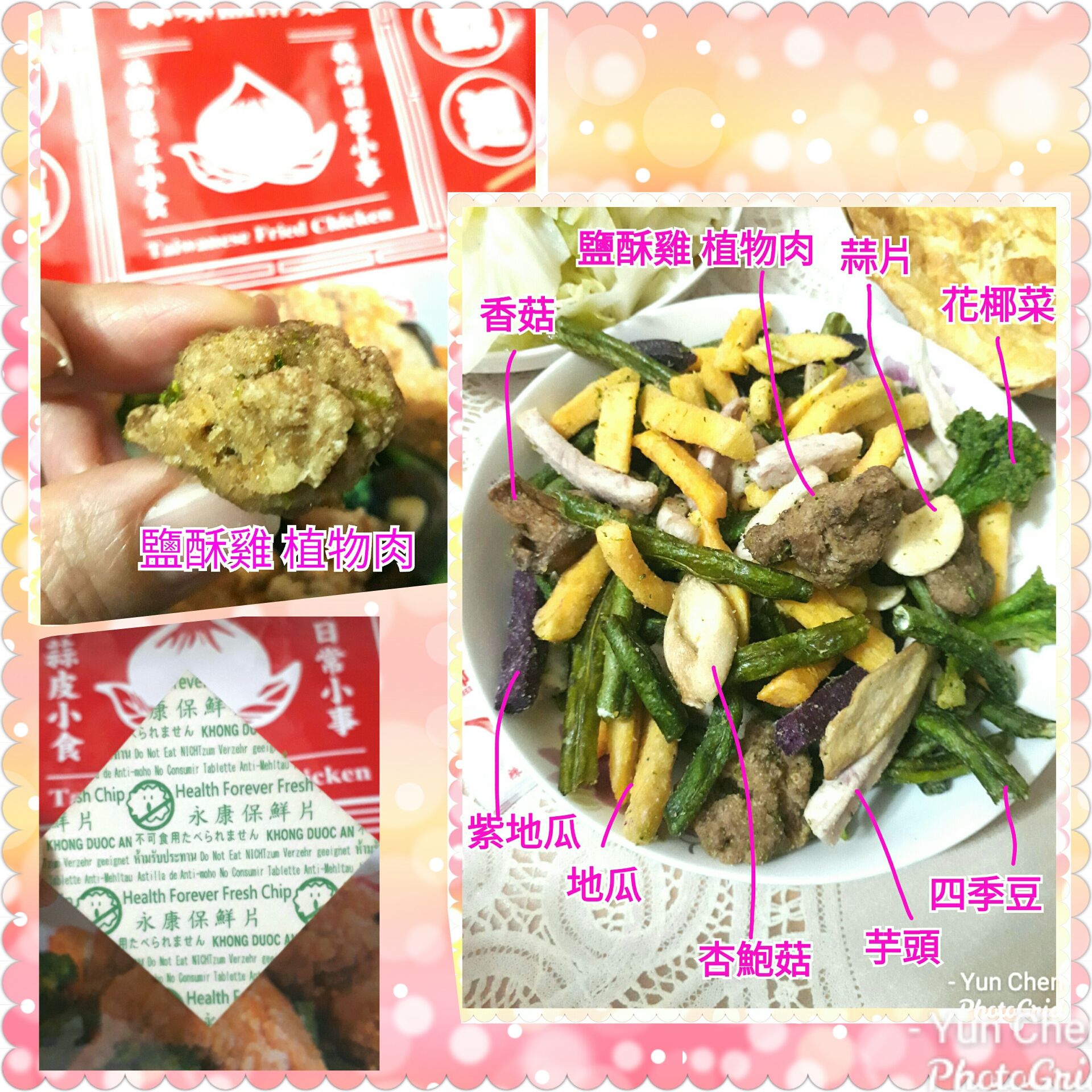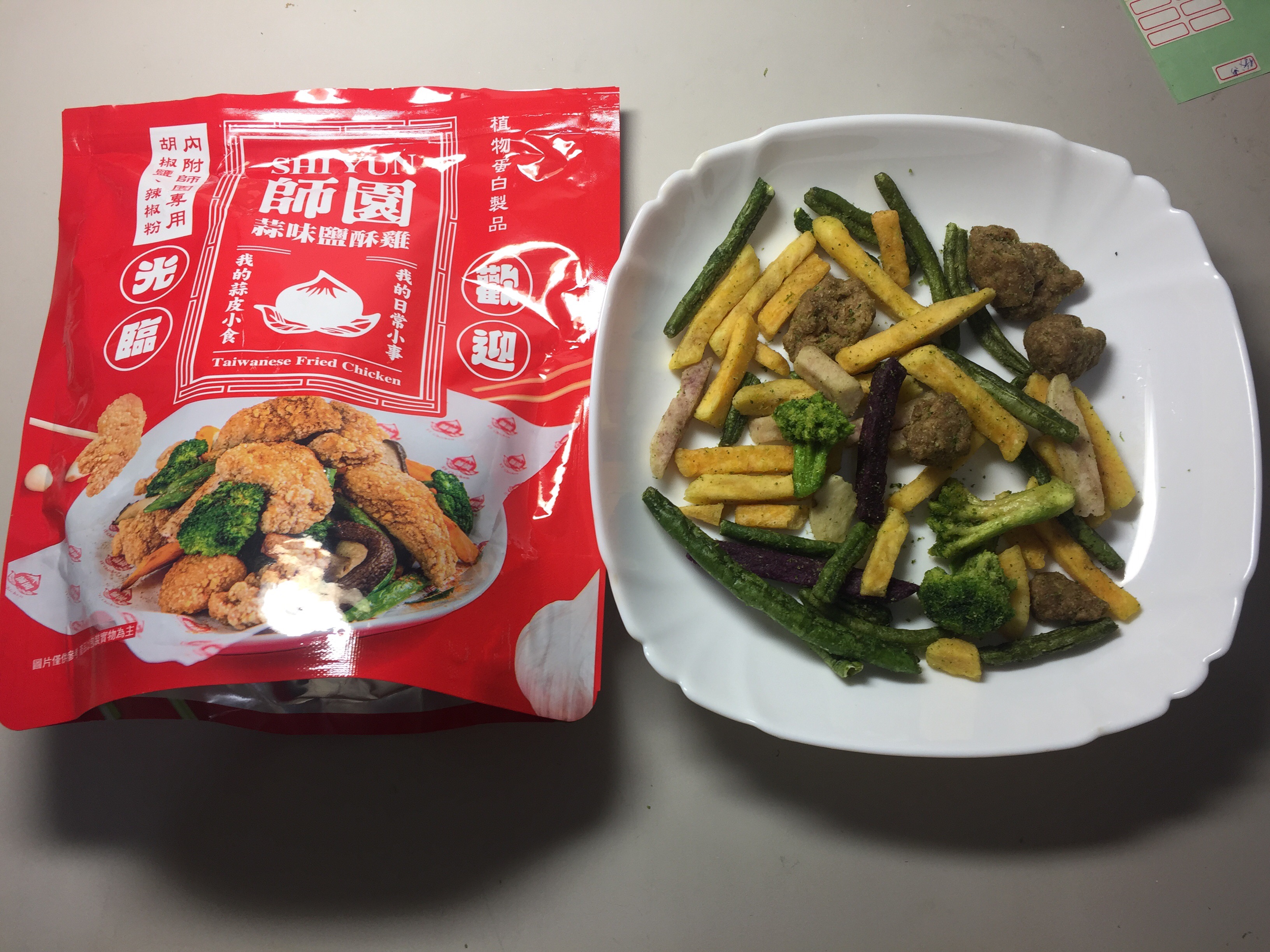 植物肉[非基改大豆蛋白、小麥蛋白、大豆油、蛋白粉、修飾澱粉(醋酸澱粉)、糖、樹薯澱粉、香料、鹽、L-麩酸鈉、呈味核苷酸二鈉、白胡椒粉]、地瓜、敏豆、紫地瓜、青花菜、芋頭、香菇、杏鮑菇、蒜片、蒜粉(蒜片、甘藷粕粉)、五香粉(小茴、肉桂、大茴香、丁香、花椒)、棕櫚油、麥芽糖 內附師園胡椒鹽 成分:鹽、香辛料(白胡椒、黑胡椒、大蒜、辣椒、甘草、薑、丁香、百草粉、肉桂)、L-麩酸鈉、砂糖、二氧化矽 內附師園辣椒粉 成分:辣椒
