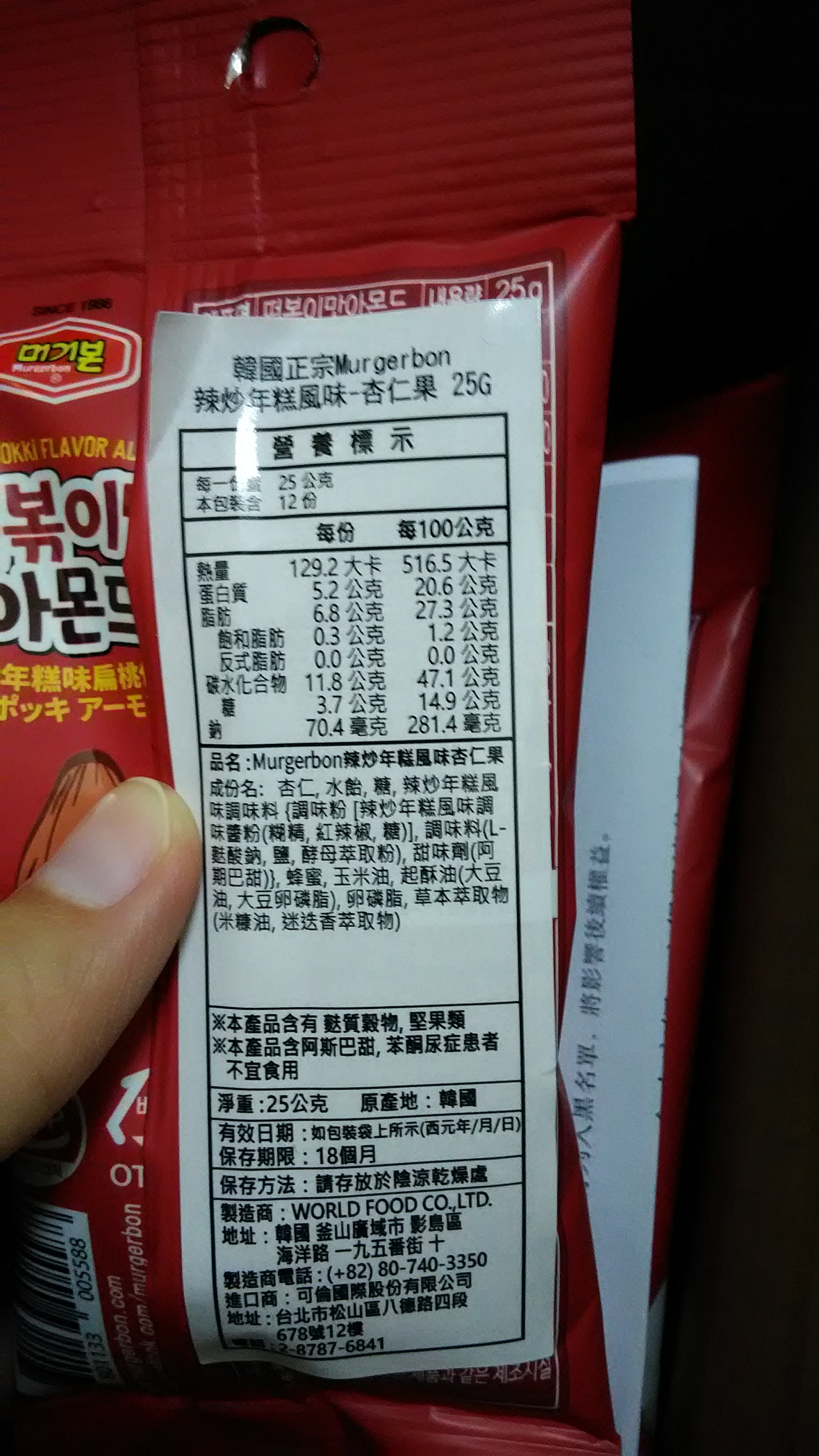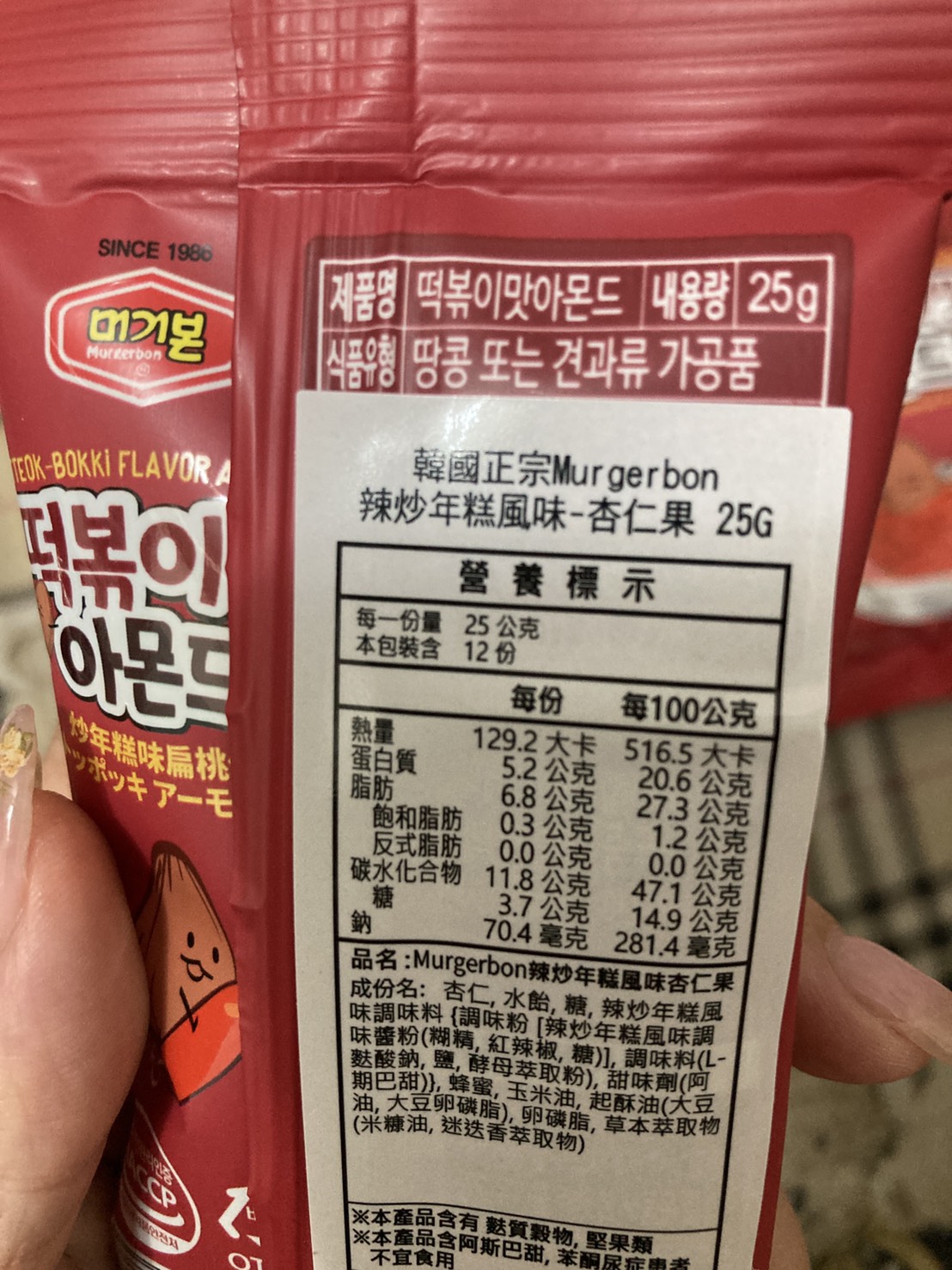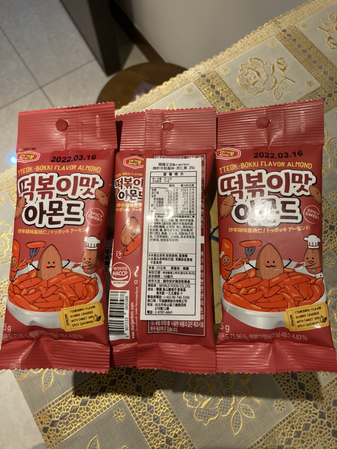 回列表 MURGERBON 辣炒年糕風味杏仁果 甜辣爽脆又健康 市價180元 所需等級 一般會員以上 所需學分 60 體驗份數 15 關注人數 1966 申請人數 316 申請截止 品牌業者:Murgerbon 負責廠商 可倫國際股份有限公司 廠商地址 台北市松山區八德路四段678號12樓 產地 韓國 產品規格 25g/包,共4包。 食品業者登錄字號 A-124744918-00000-7 投保產品責任險字號 062208A10192 心得分享 商品介紹 商品成分 使用方法 注意事項 體驗名單 8.3 MURGERBON 辣炒年糕風味杏仁果 包裝美學 8.9 風味香氣 8.9 唰嘴程度 8.9 堅果酥脆 7.7 建議推薦 8.0 心得分享 15則 Rua Yu 金食達人 34歲 臺中市 2021/07/28 對MURGERBON 辣炒年糕風味杏仁果留下評價 9 感謝抽選給予試吃的機會,首先從包裝開始說,外包裝質感和美術設計蠻不錯的,插圖很可愛很有好感,背面還有成份表的中文貼紙(原包裝是韓文),包裝非常堅固,比較可惜的是設計上面有一個EASY TEAR的標示,但實際上從那邊很難打開,這個設計引導就會讓人困惑怎麼從這裡打不開,實際上我都是用剪刀剪開,如果是出外旅遊帶幾包出去才發現沒有剪刀就有點麻煩,應該是選用的材質為了保存杏仁果的酥脆口感比較堅固,所以就變得比較難撕開,除了這個標示設計讓使用者會比較困惑以外,其他都很滿意。他邊邊的鋸齒狀加上他的材質其實並不好撕,如果有一道剪口或許容易一點。聞起來有一點點麻辣的香氣,吃下去先是有麻辣感,本來我有點擔心說像我這樣沒有很擅長吃辣的話會不會沒辦法吃,結果咀嚼幾下之後開始變甜,中和了只有麻辣的味道,而且變得很唰嘴,杏仁果很脆,不會軟軟的,搭配他調製的味道,就一包包接著吃完了。整體而言,除了包裝設計上有點可惜,以可以接受一點點辣的人來說,算是蠻推薦買來當零食的產品。 陳咖啡 金食達人 36歲 新北市 2021/07/26 對MURGERBON 辣炒年糕風味杏仁果留下評價 9 一打開包裝,辣炒年糕風味撲鼻而來,看著一顆顆紅通通的杏仁,初嚐時濃郁的韓式辣醬醃燻感微微帶點甜味,咬起來杏仁果口感清脆,到尾端韓式獨有的辣感延續,充分感受到口腔裡辣椒的香氣與辛辣感,會不自覺的一口接著一口,再搭配啤酒,是夏天最佳的零嘴,很涮嘴! 陳諭萱 鑽石達人 27歲 臺南市 2021/07/25 對MURGERBON 辣炒年糕風味杏仁果留下評價 8 辣炒年糕風味的杏仁果實在太有創意了!本來就很喜歡吃堅果的我,再搭配有點微辣的辣炒年糕風味,根本讓人想停也停不下來啊~尤其在看韓劇的時候享用也十分應景,推薦給喜歡微辣風味的堅果控!另外,小巧的包裝也十分適合想要微充飢的人,小小的內容物卻能讓人吃的很開心~ 呂羽容 金食達人 32歲 彰化縣 2021/07/25 對MURGERBON 辣炒年糕風味杏仁果留下評價 9 辣炒年糕風味杏仁果,吃起來微微的辣微微的甜,真的會讓人一口接一口停不下來!超適合當追劇的下酒菜,打開即可食用也不用冰冰箱,也很方便!只是不知道為什麼會有幾顆黏在一起有一點濕濕黏黏的,咬起來有一點點黏牙的感覺,似乎有待加強! 曾崇傑 銀食達人 24歲 高雄市 2021/07/25 對MURGERBON 辣炒年糕風味杏仁果留下評價 10 剛拿到的時候覺得蠻小包的,但是一打開來發現裡面份量很多,在點心時間吃一包就很滿足了!內容是普通杏仁果的大小,外面有包一層辣炒年糕風味的外衣,一看到外觀其實怕會辣,但是吃下去的時候是甜的!第一口會覺得:怎麼那麼衝突?後來嘴巴漸漸適應甜辣甜辣的味道,一顆接一顆停不下來!杏仁果也很脆,不會軟掉什麼的,家裡的大人小孩也都很喜歡! 洪子涵 金食達人 28歲 臺南市 2021/07/25 對MURGERBON 辣炒年糕風味杏仁果留下評價 9 辣炒年糕風味顧名思義 就是要有甜與辣這款辣炒年糕風味-杏仁果真的有做到哦~~一包的份量也很剛好(25g)完全沒有吃不完或是吃不夠的問題本身自己吃得蠻重口味的這款真的非常的唰嘴耶~~~超級喜歡味道非常的夠!!最重要的是調味粉也都有好好地裹在杏仁果上面非常優秀 平時補充一些堅果類也是非常重要的~~ 薛慧儒 金食達人 50歲 高雄市 2021/07/26 對MURGERBON 辣炒年糕風味杏仁果留下評價 7 辣炒年糕的風味屬於甜辣口味,整體風味上有表現特點,但杏仁果的口感和年糕口感是有差異的,所以如果單純以口味來說,食用時,不會與辣炒年糕連結;也能說是甜辣醬風味的杏仁果。在口感上,杏仁果是偏硬的狀態,不是酥,是硬,也有可能是個人牙口不好的感受。拆封倒出杏仁果,杏仁果上的調味粉,在我還沒拍照結束,已經全部潮解,呈現潮濕的狀態,不知道是否因為台灣氣候太潮濕,濕氣會影響口感,可能追劇還沒結束,杏仁果的口感已經改變。整體上,還是會推薦,因為台灣目前還沒有此口味的杏仁果 ,當點心、當配菜都適宜。 陳言旻(Yemmy) 銀食達人 38歲 桃園市 2021/07/26 對MURGERBON 辣炒年糕風味杏仁果留下評價 7 外包裝卡通圖案,印象鮮明,吸引力強烈;開封後內部無其他包裝,可直接倒入盤中,較方便食用;口味微辣、微甜,適合當作茶几小點心或餐間零食;或許是糖衣的緣故,內部杏仁的口感不如預期般酥脆;考量單價、淨重等整體因素,可以考慮購買。 林嬋語-製一 鑽石達人 38歲 高雄市 2021/07/27 對MURGERBON 辣炒年糕風味杏仁果留下評價 10 很榮幸可以獲得【MURGERBON】辣炒年糕風味杏仁果試吃機會,之前就常常在賣場看到這個品牌的其他口味就很想吃看看,這次終於吃到了,雖然產品是使用調味粉製成,但是感覺超級道地又夠味,感覺自己像在吃真的辣