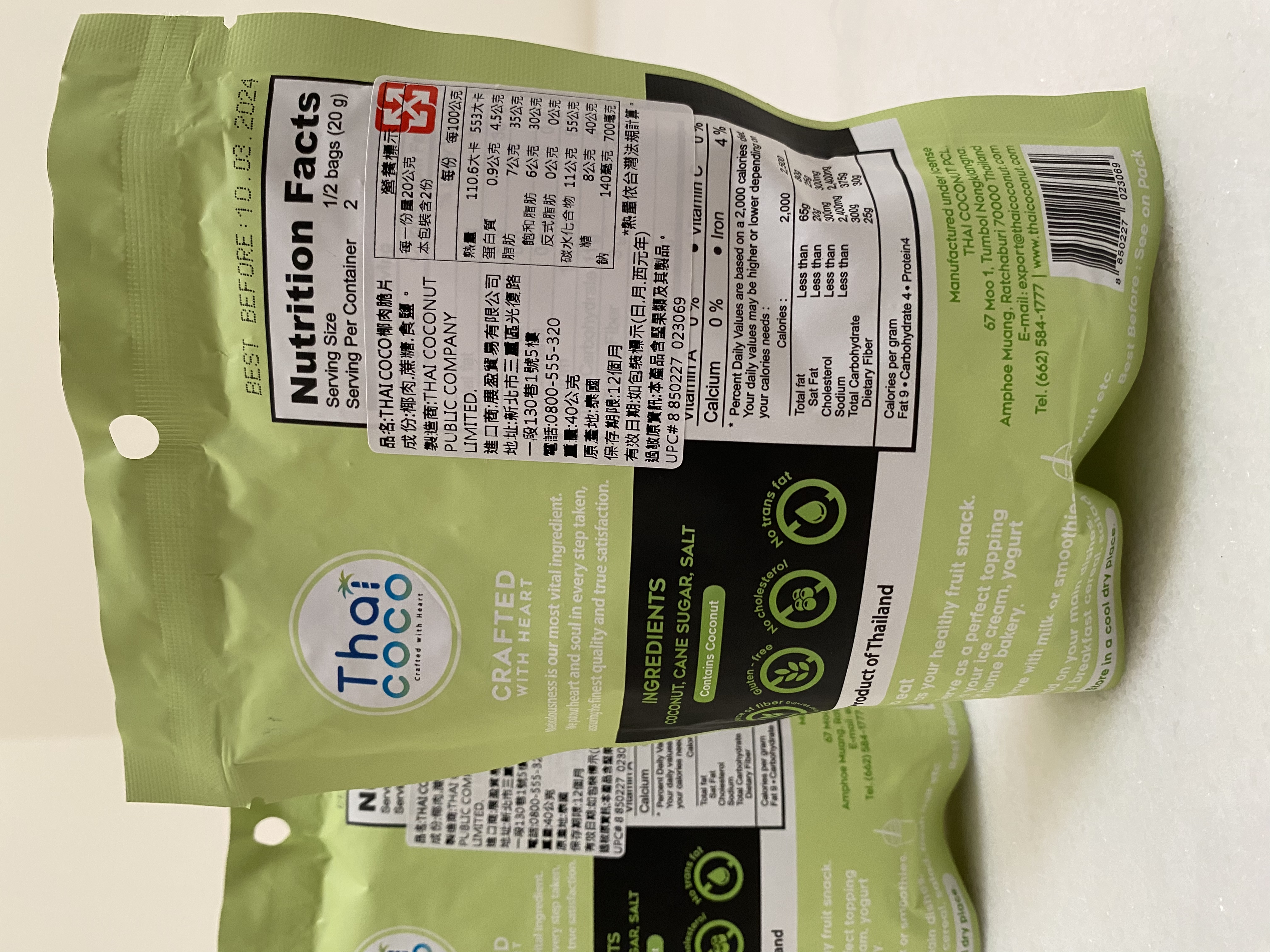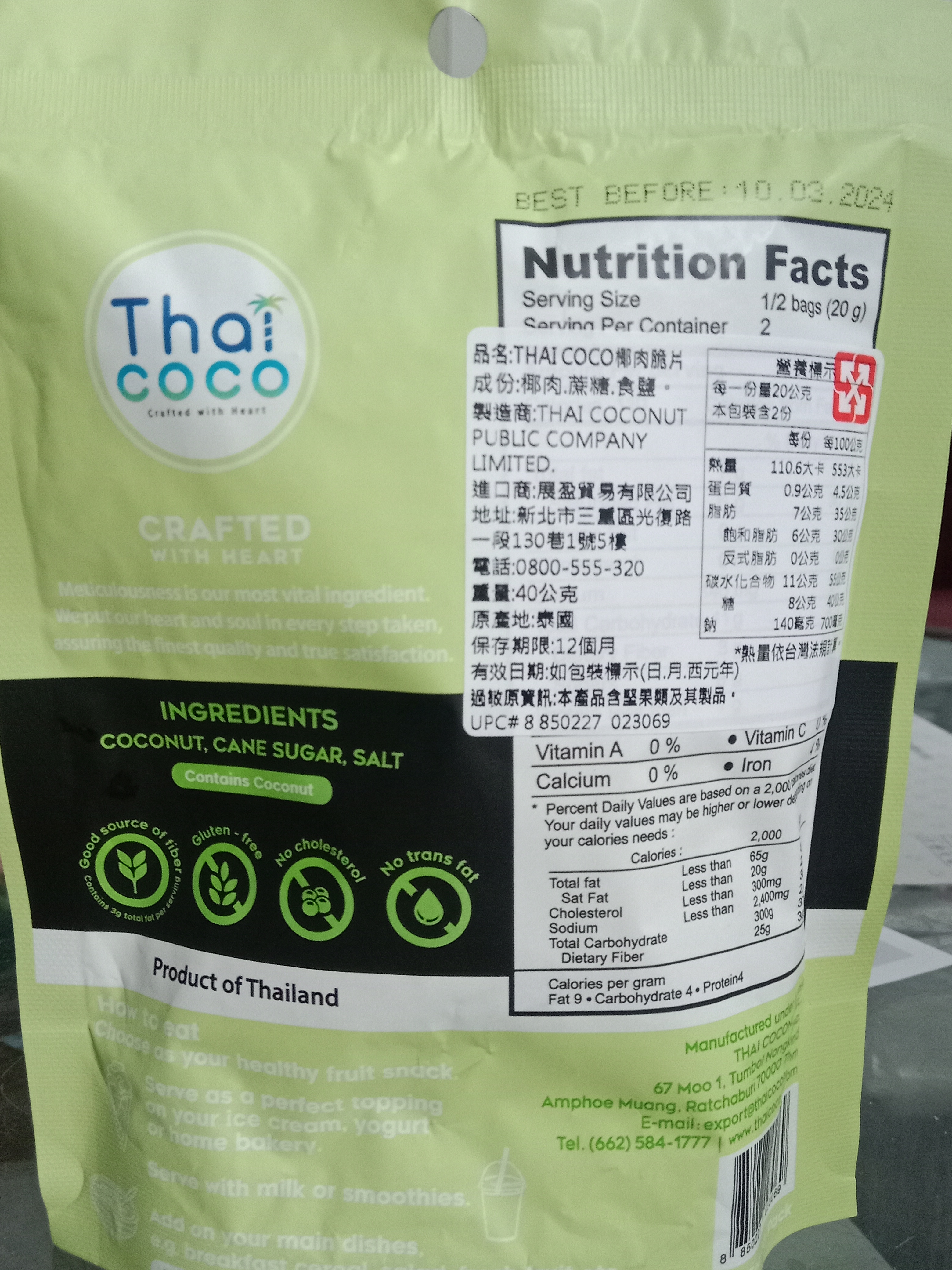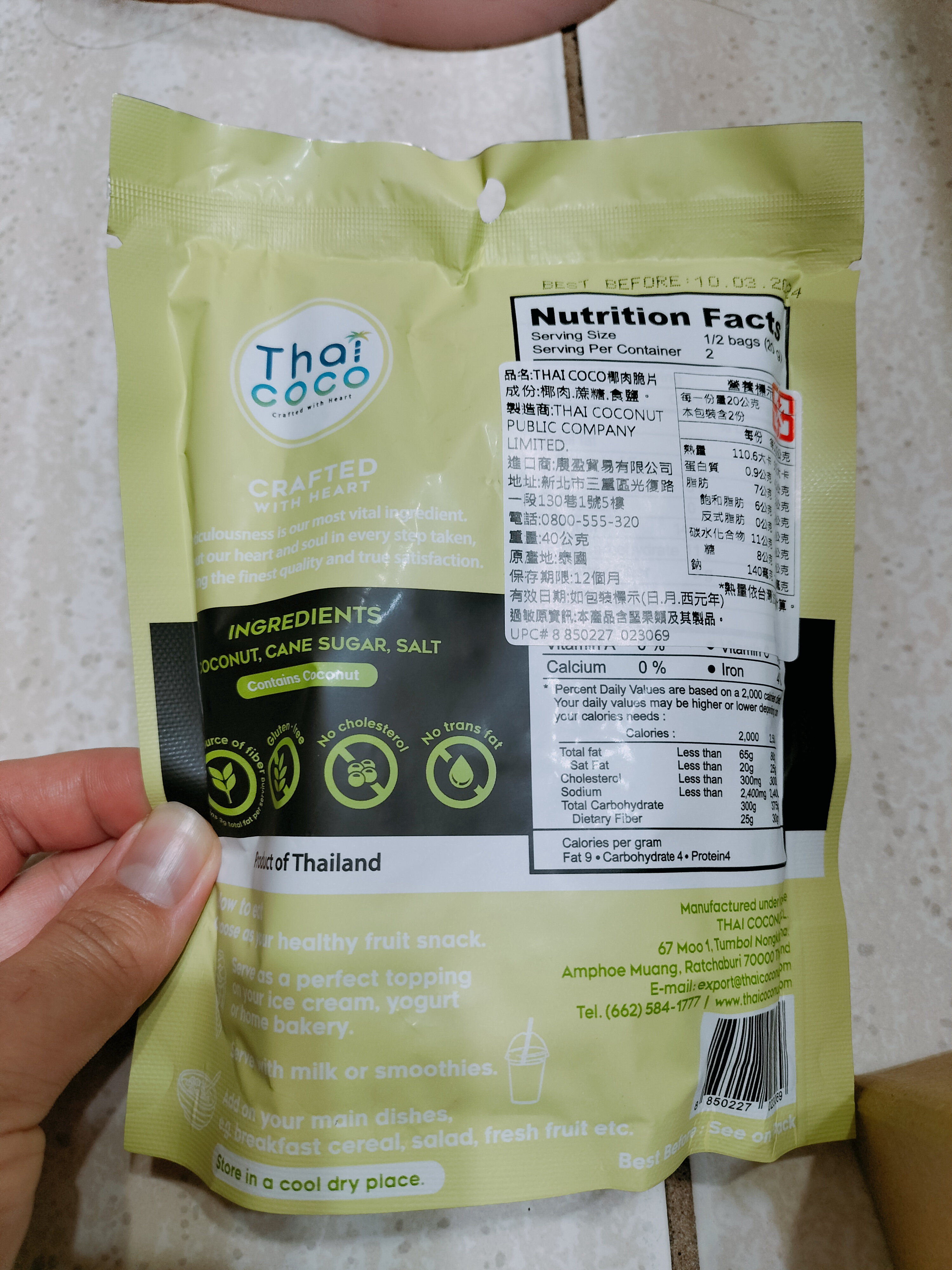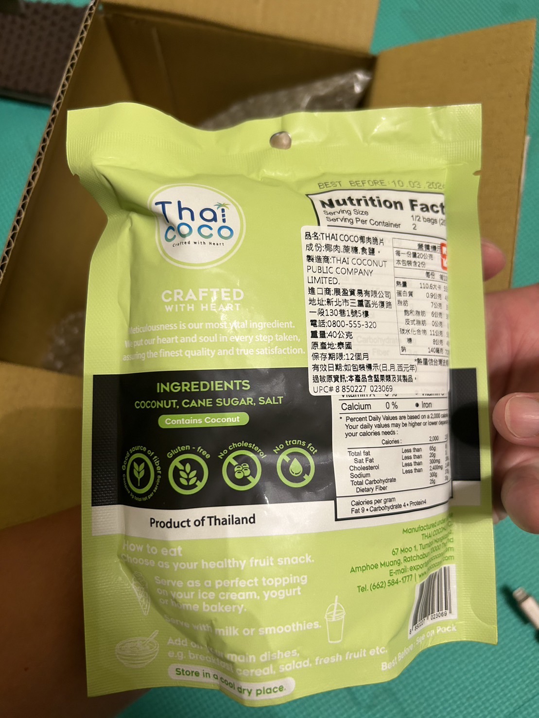 這次試吃的是Thai CoCo 椰肉脆片(原味) 滿滿椰肉香氣 高纖香脆的健康零嘴。 它的成份十分的簡單,只有椰肉、蔗糖、食鹽。 除去椰肉脆片直接食用,它的包裝上還介紹了可以摻入冰淇淋、優格、牛奶或奶昔等增添口感。 並且主打 Good source of fiber 良好的膳食纖維來源 Gluten-free 不含麩質 No cholesterol 無膽固醇 No trans fat 不含反式脂肪 當作零食享用,可以吃的快樂又安心。 包裝一打開來就有椰子的香氣,口感很香脆,咬碎後會有留有吃到渣渣的顆粒感。 不過包裝是沒有封口的,所以會建議打開來就趕快吃完,跟同事(朋友)分享還不錯,但個人吃完一包有點點多。