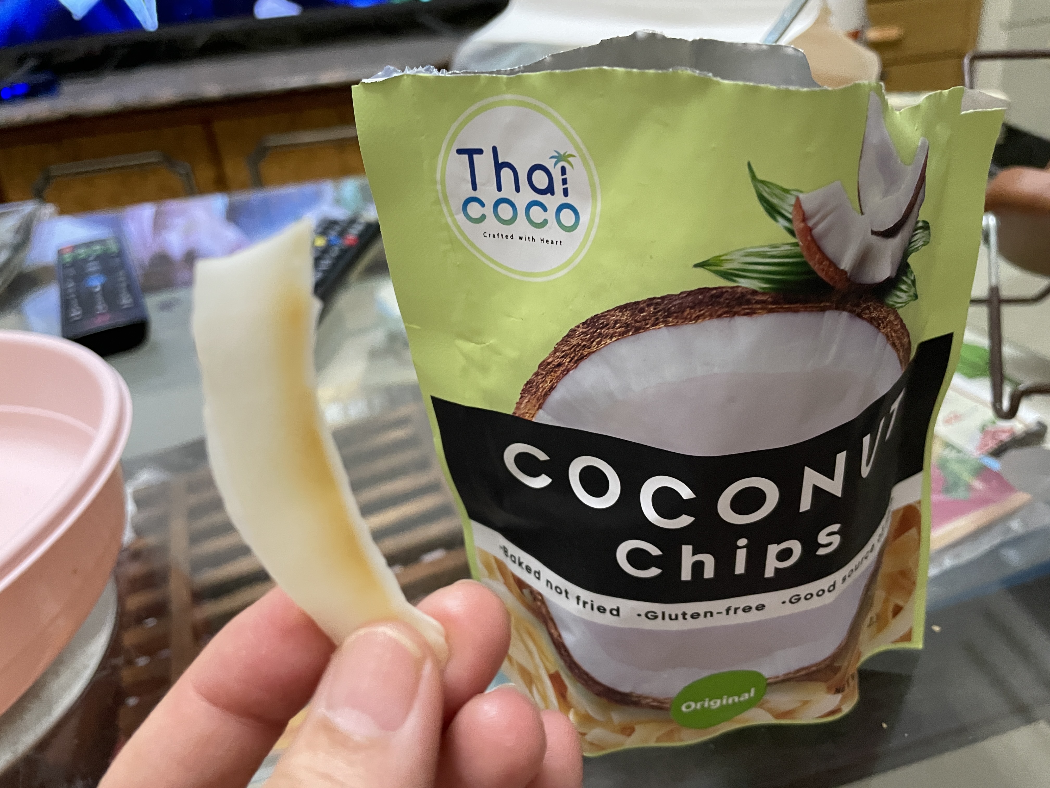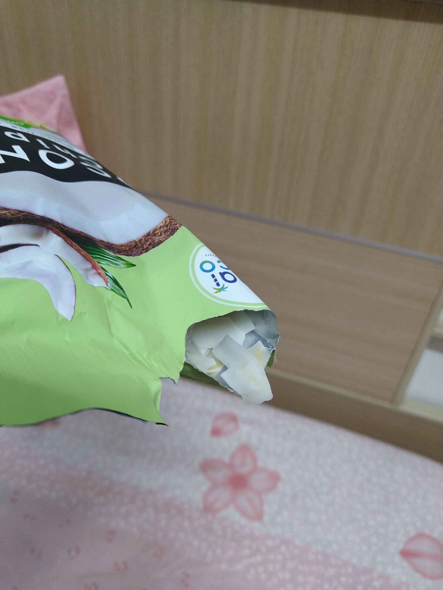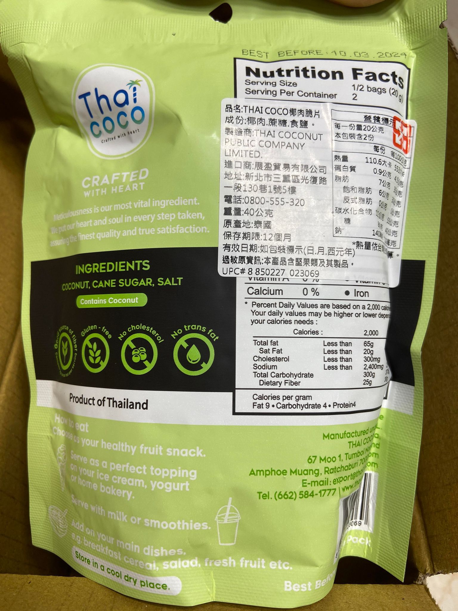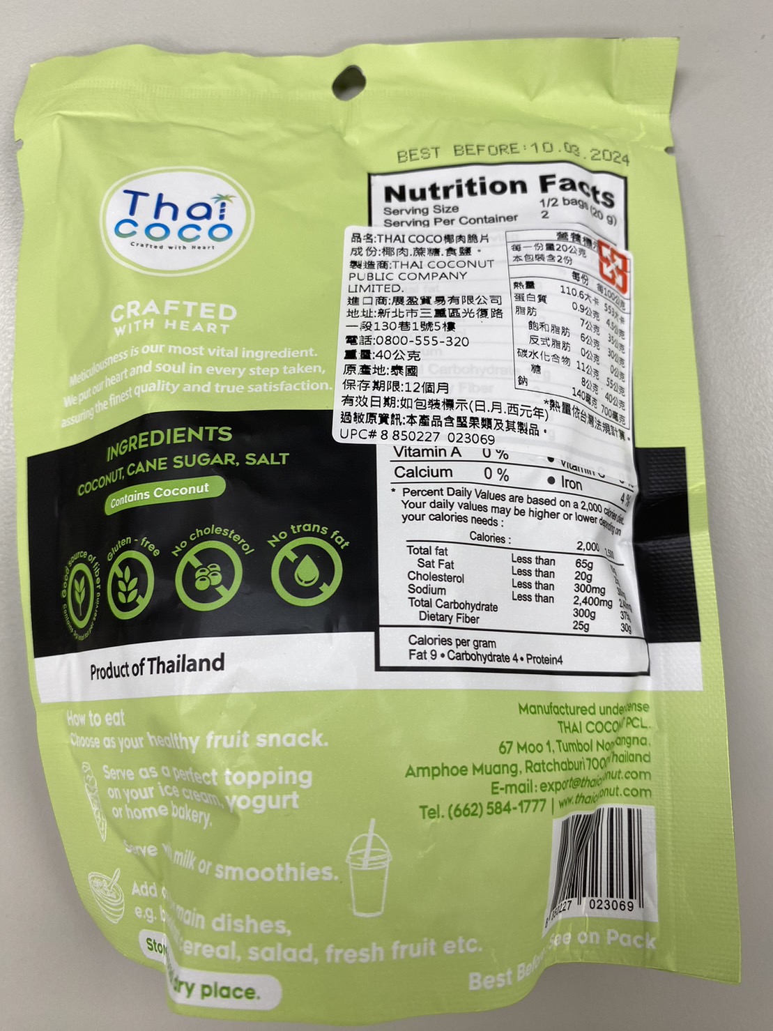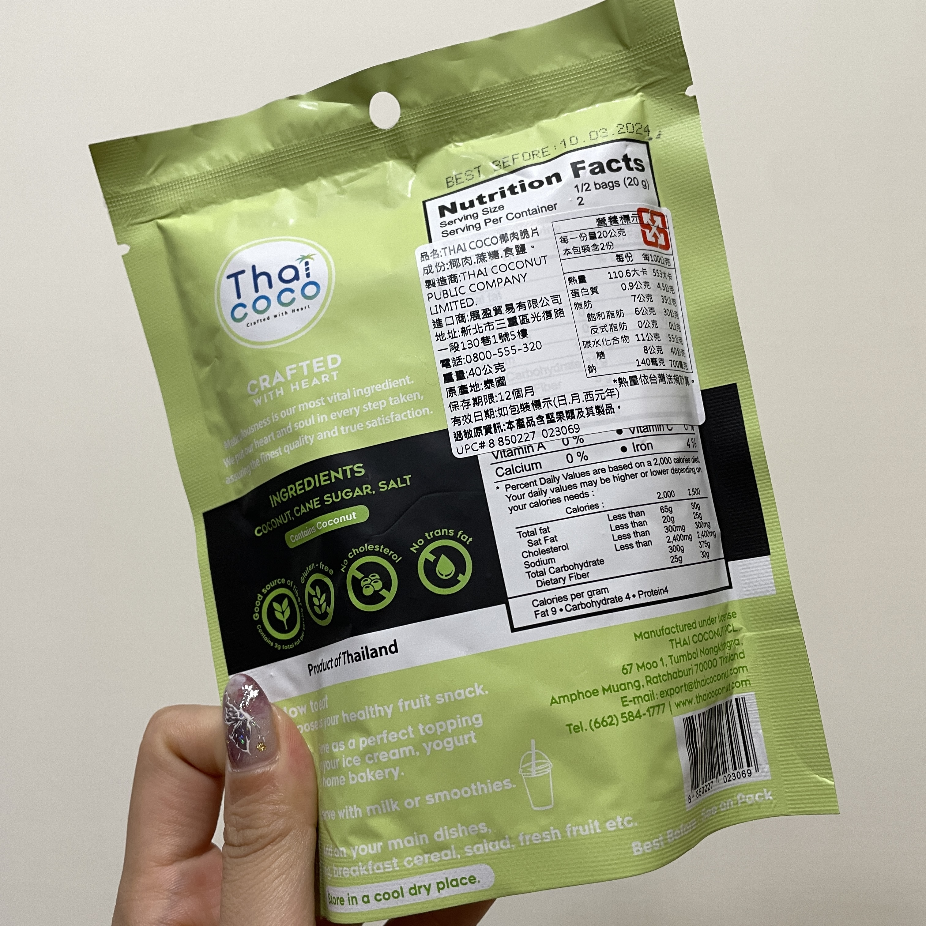 這次試吃的是Thai CoCo 椰肉脆片(原味) 滿滿椰肉香氣 高纖香脆的健康零嘴。 它的成份十分的簡單,只有椰肉、蔗糖、食鹽。 除去椰肉脆片直接食用,它的包裝上還介紹了可以摻入冰淇淋、優格、牛奶或奶昔等增添口感。 並且主打 Good source of fiber 良好的膳食纖維來源 Gluten-free 不含麩質 No cholesterol 無膽固醇 No trans fat 不含反式脂肪 當作零食享用,可以吃的快樂又安心。 包裝一打開來就有椰子的香氣,口感很香脆,咬碎後會有留有吃到渣渣的顆粒感。 不過包裝是沒有封口的,所以會建議打開來就趕快吃完,跟同事(朋友)分享還不錯,但個人吃完一包有點點多。