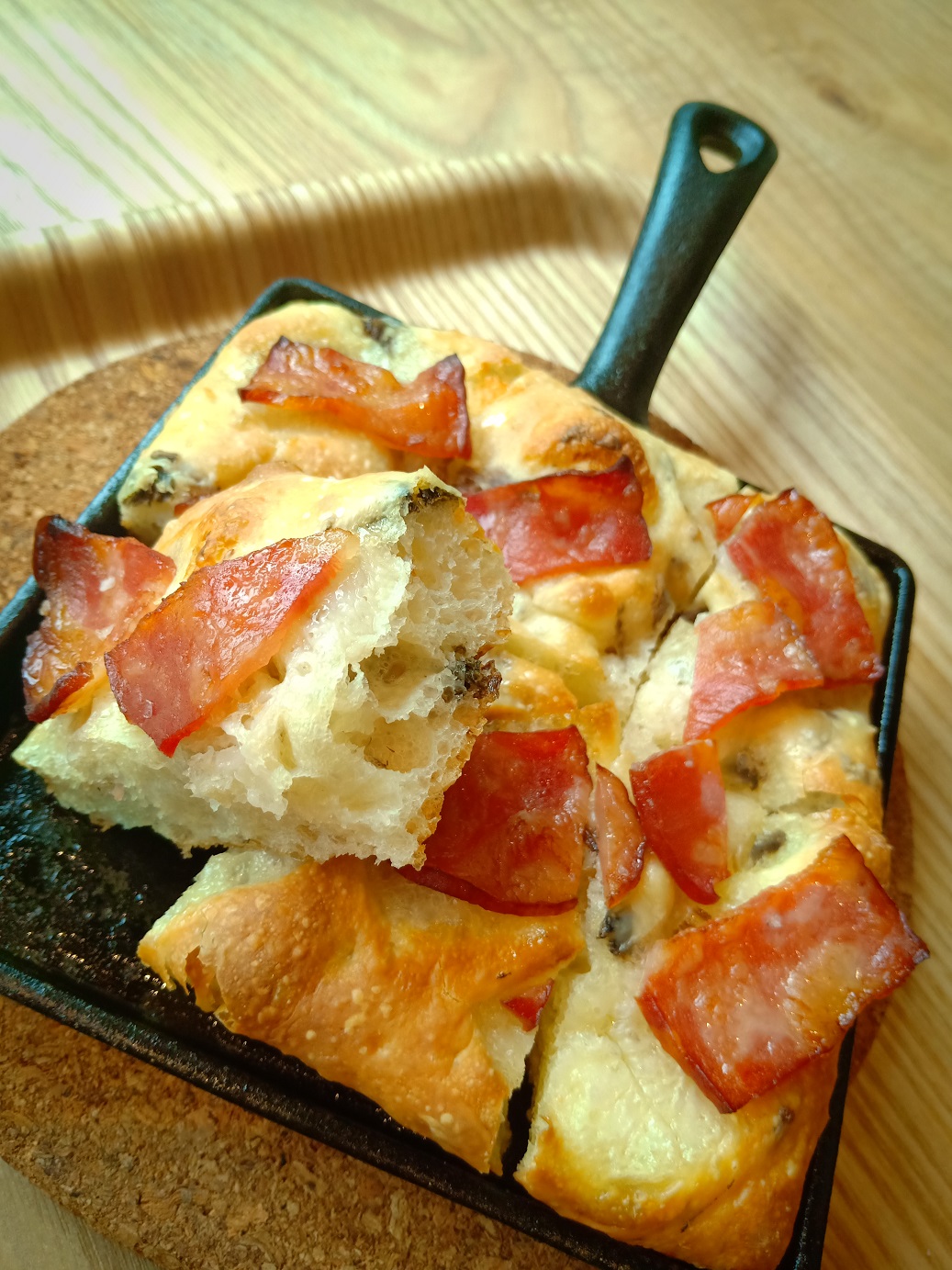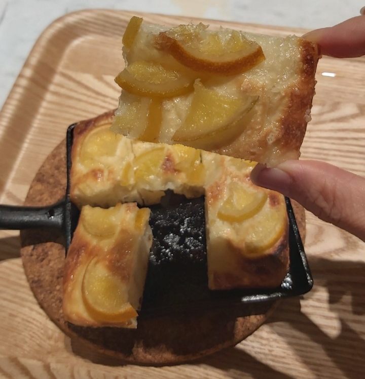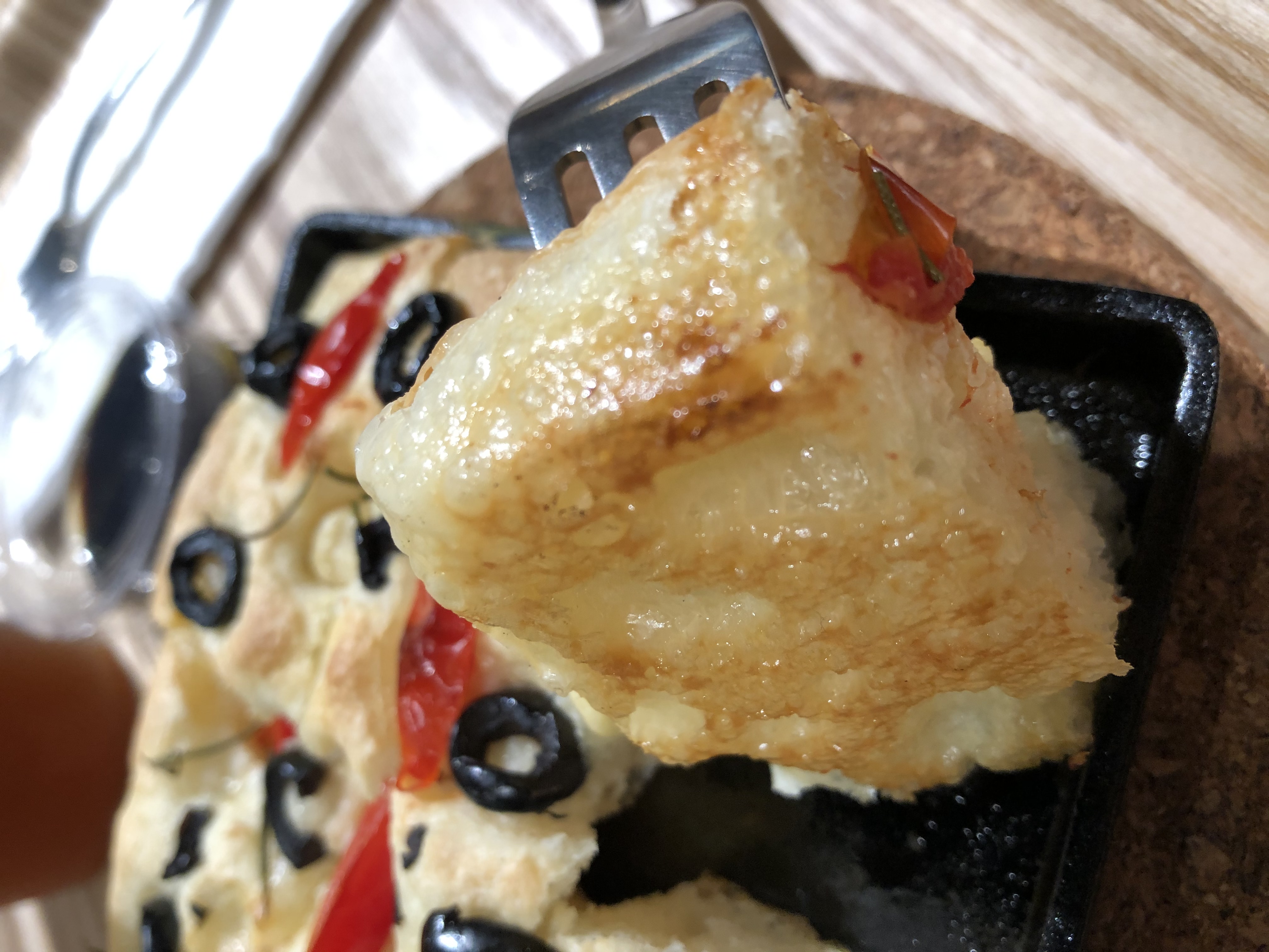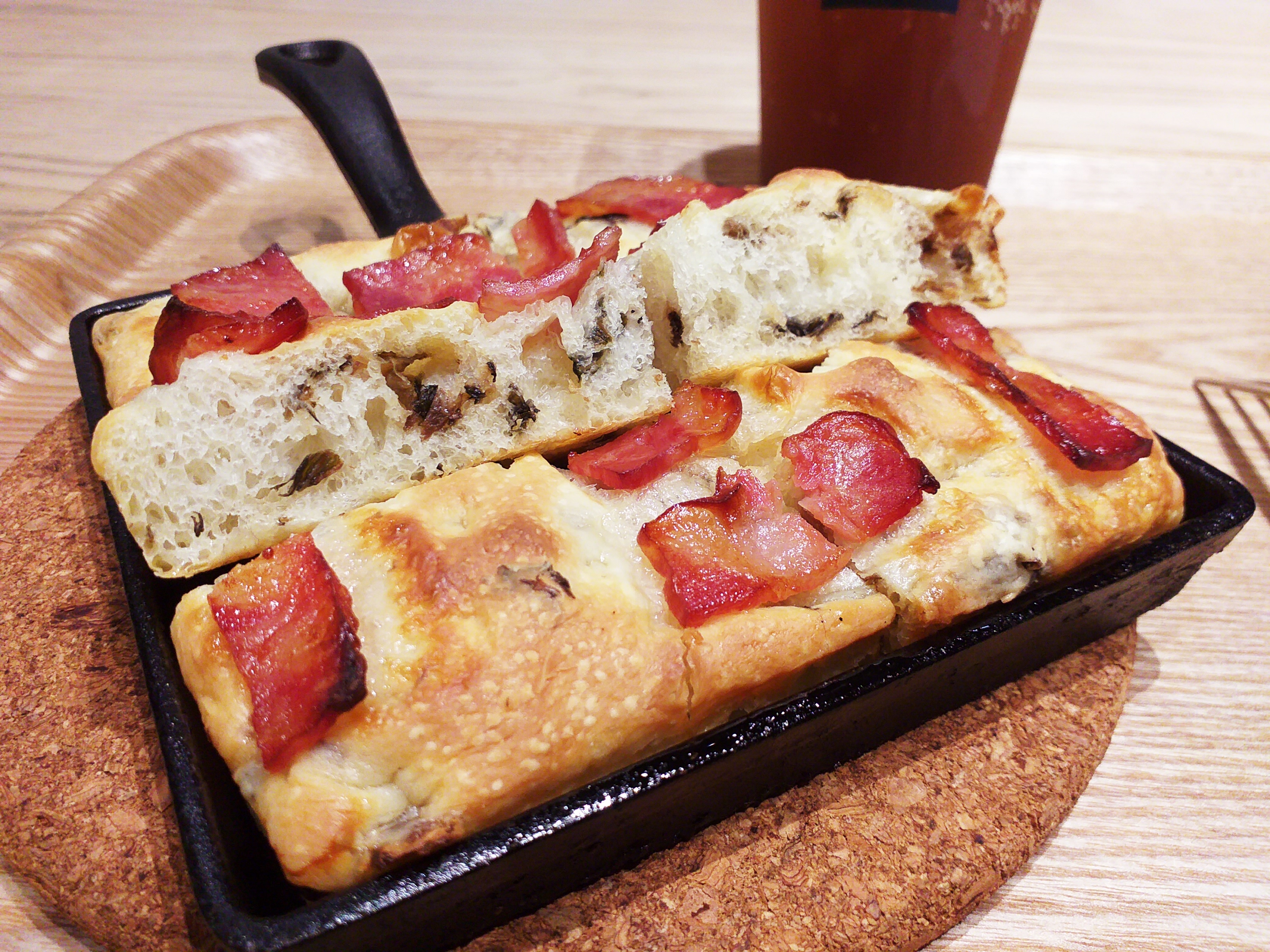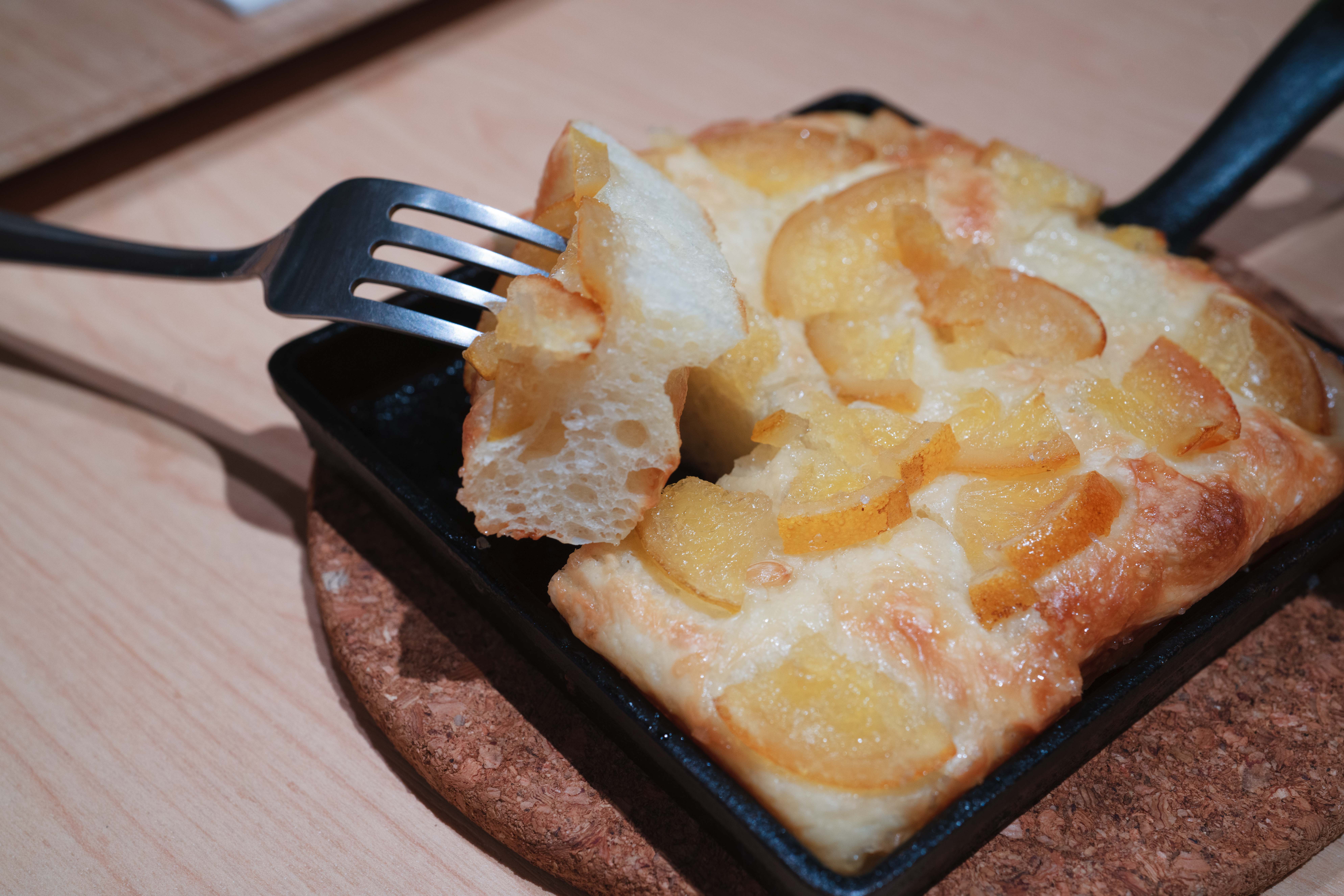 橄欖油烘烤後往鍋底滲透,不只讓麵包體充滿香氣,更在表層形成薄脆外皮,