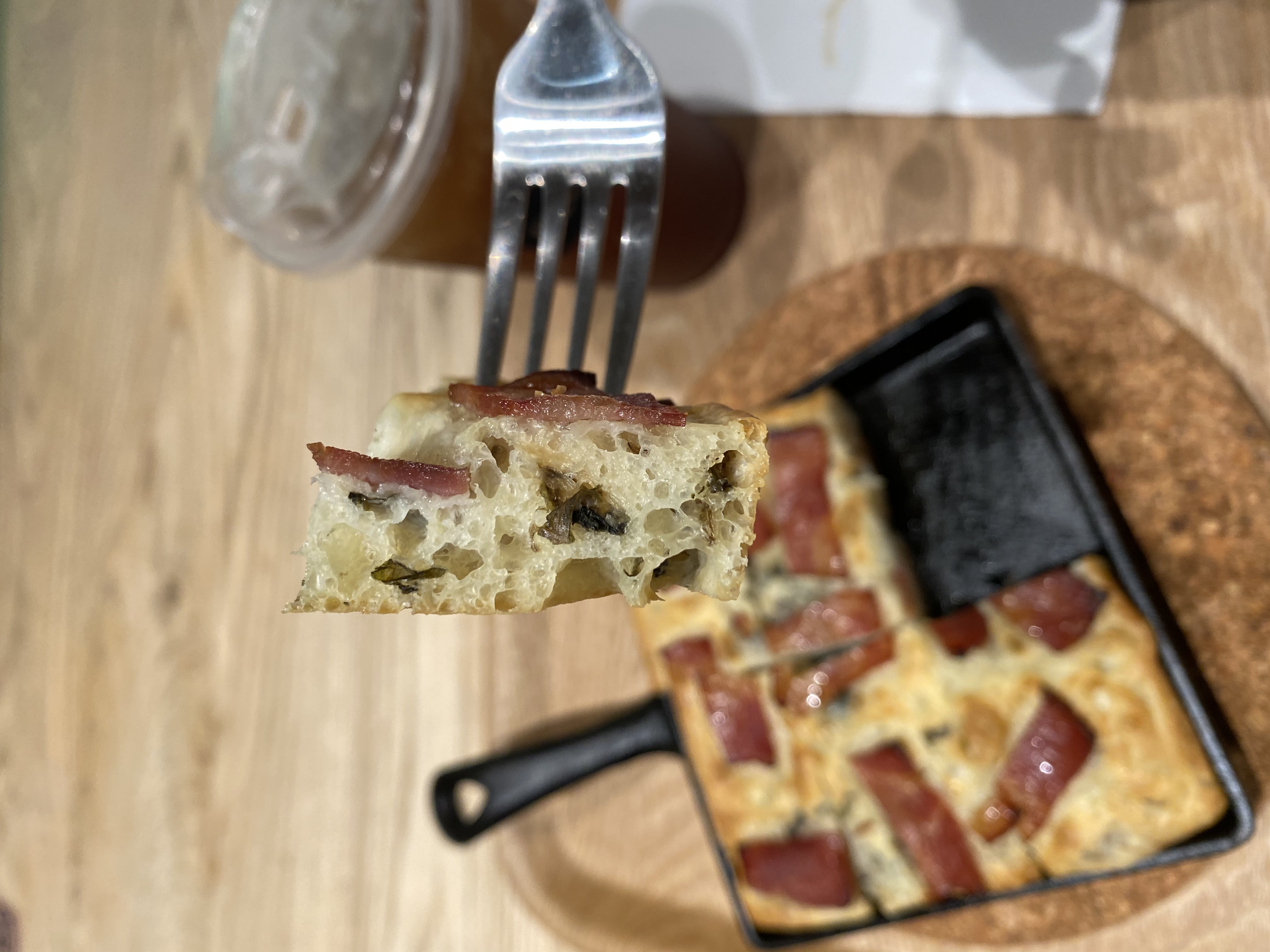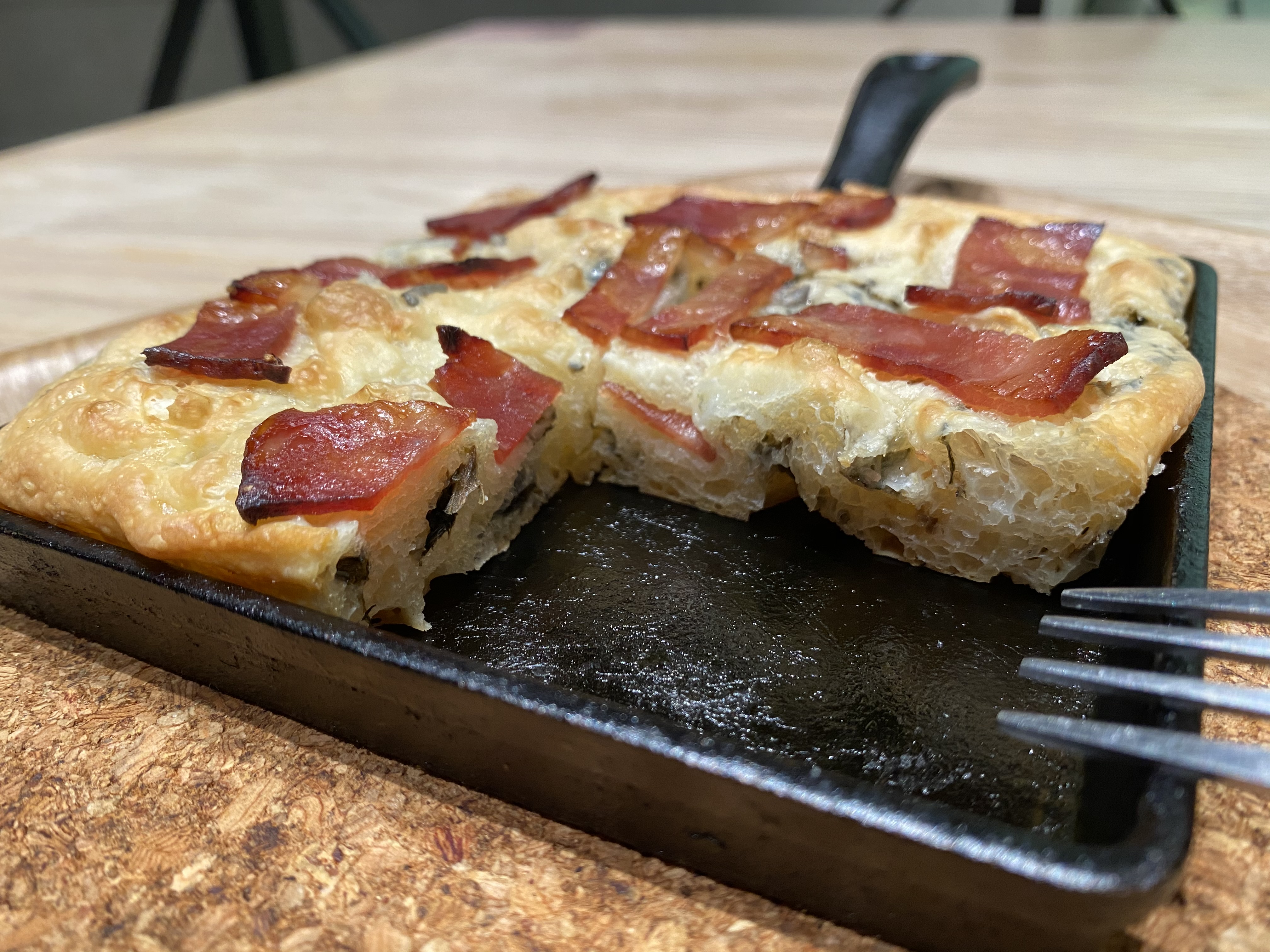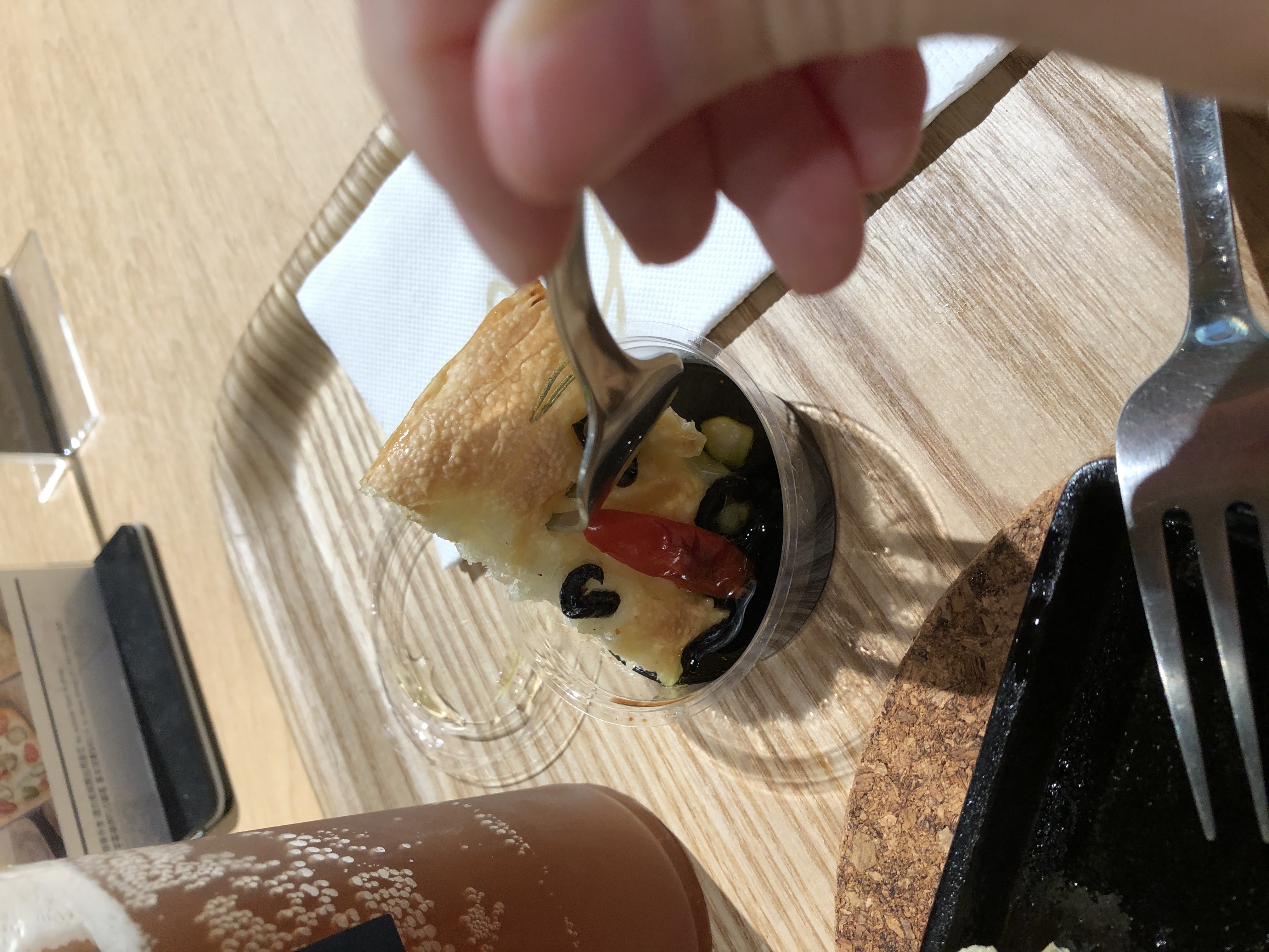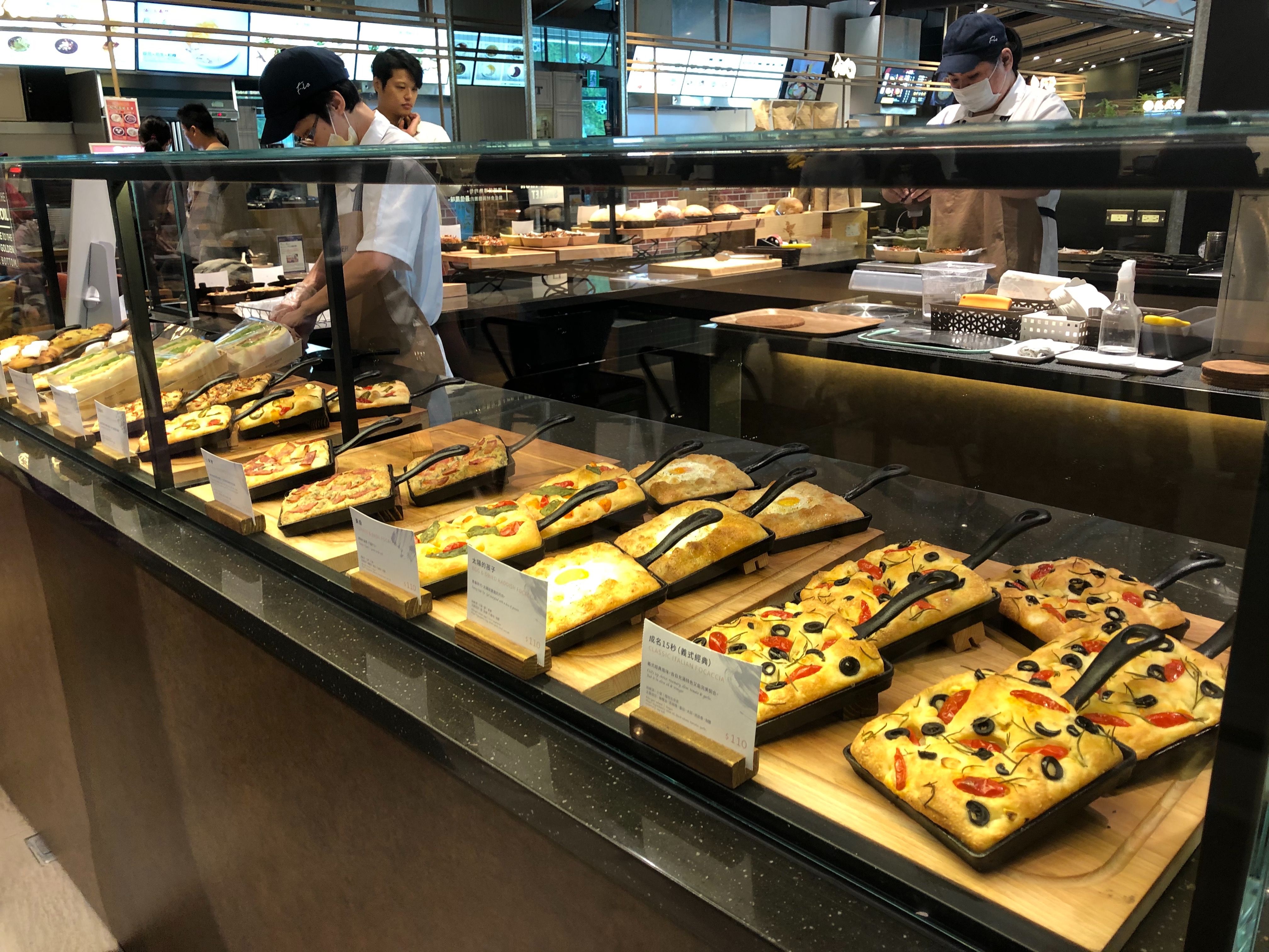 採用高含水量老麵團,將其放入鑄鐵鍋,淋上特級初榨橄欖油,雙手像彈琴一樣,在麵團上戳洞並均勻推開,