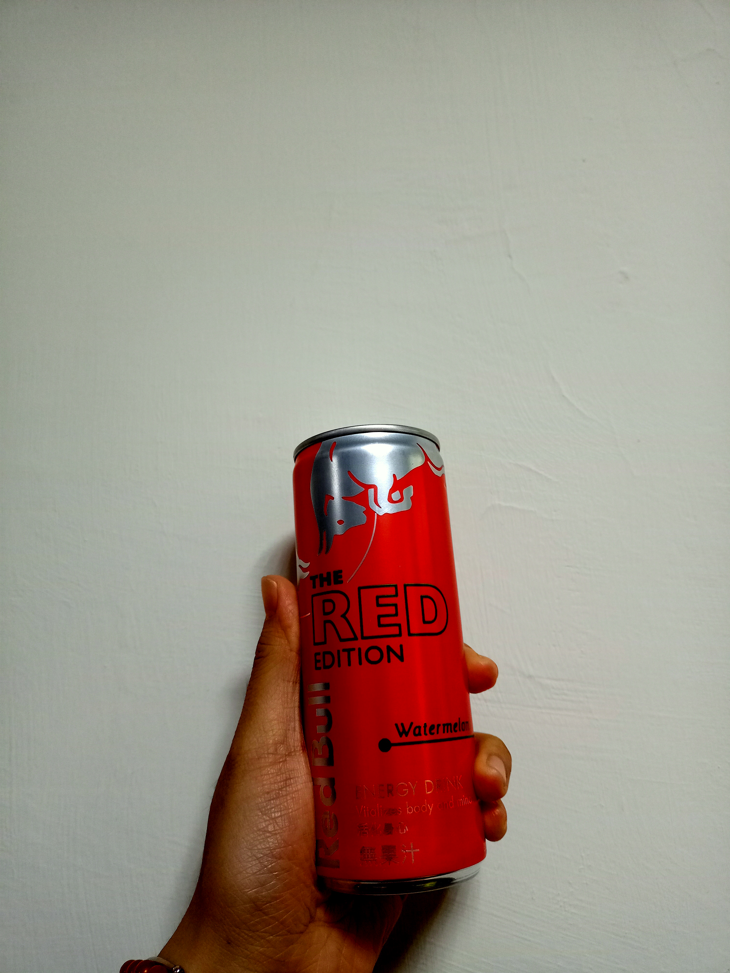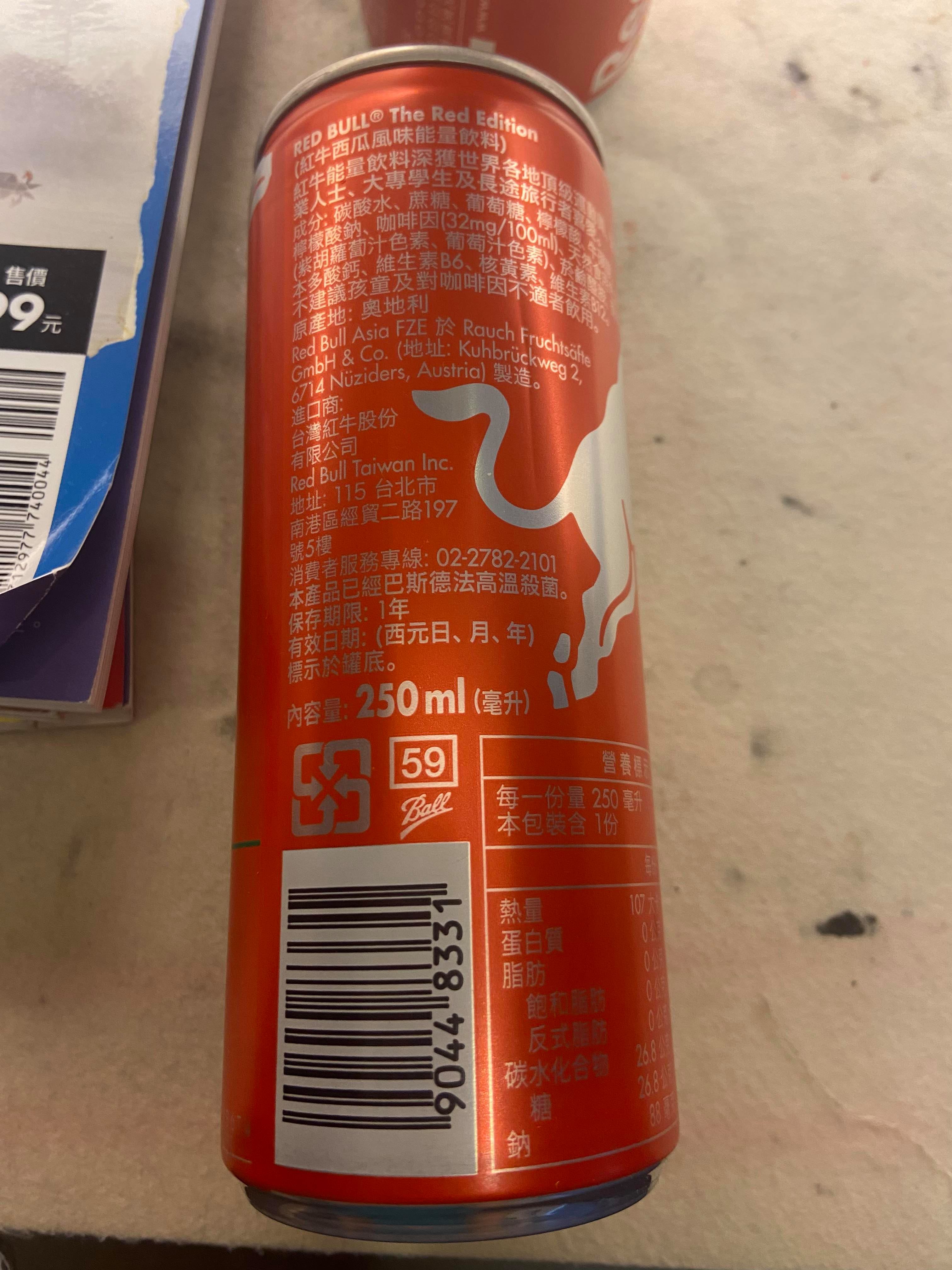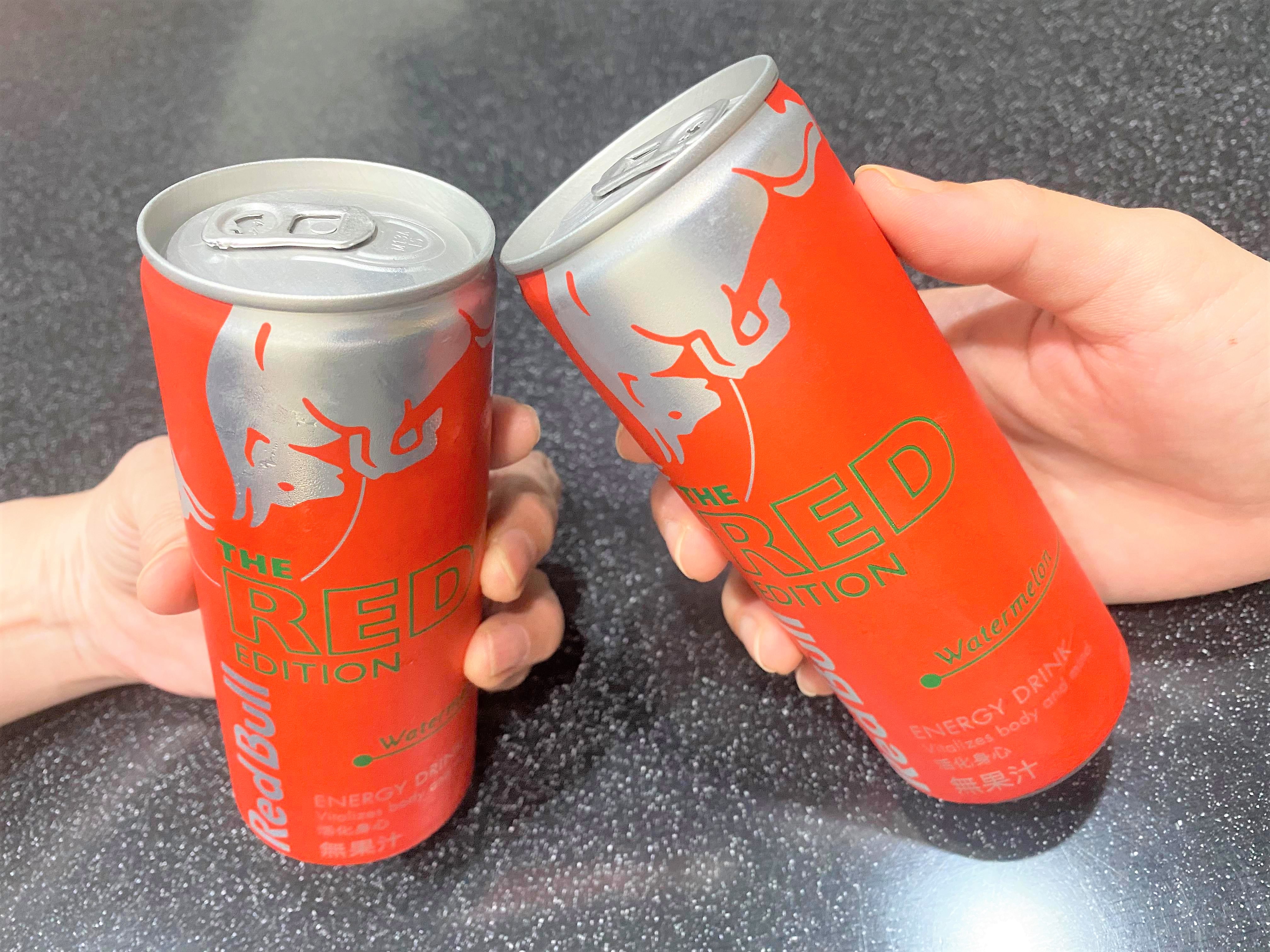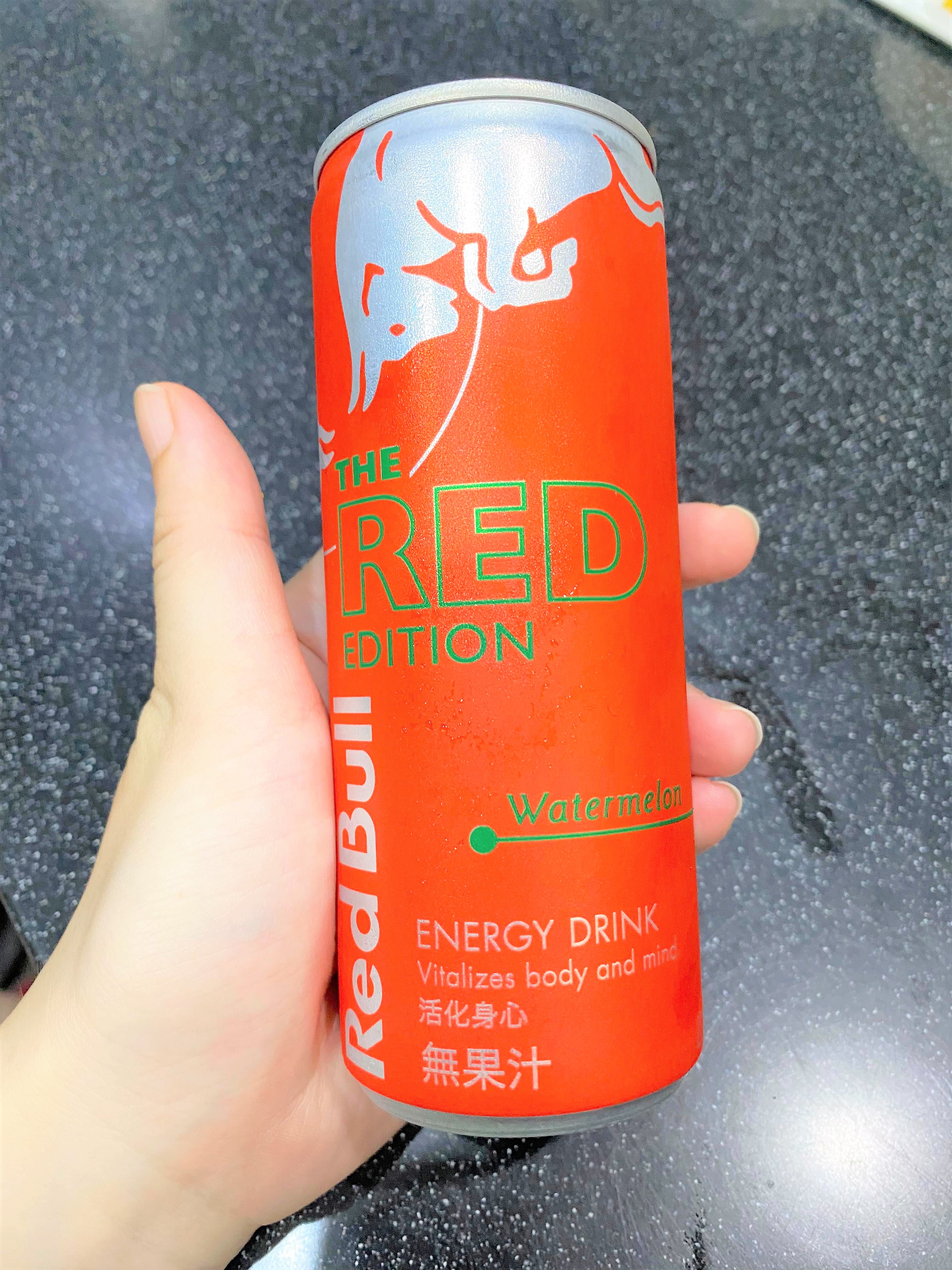 炎熱的夏天,來瓶冰涼的能量飲,清爽又解渴。(冰的風味最佳) Red Bull 西瓜風味是夏天限定,市面上真的很少見。 易開罐包裝方便飲用,亮麗紅色瓶身,給人一種熱血活力的感覺。 紅色的飲品,沒什麼西瓜的味道,氣泡的口感帶著酸甜味,沁涼暢快。 含有牛磺酸、維生素B群,它能給運動員、旅行者、大學生、辛勤的工作者滿滿能量。 Red Bull 給你一對翅膀