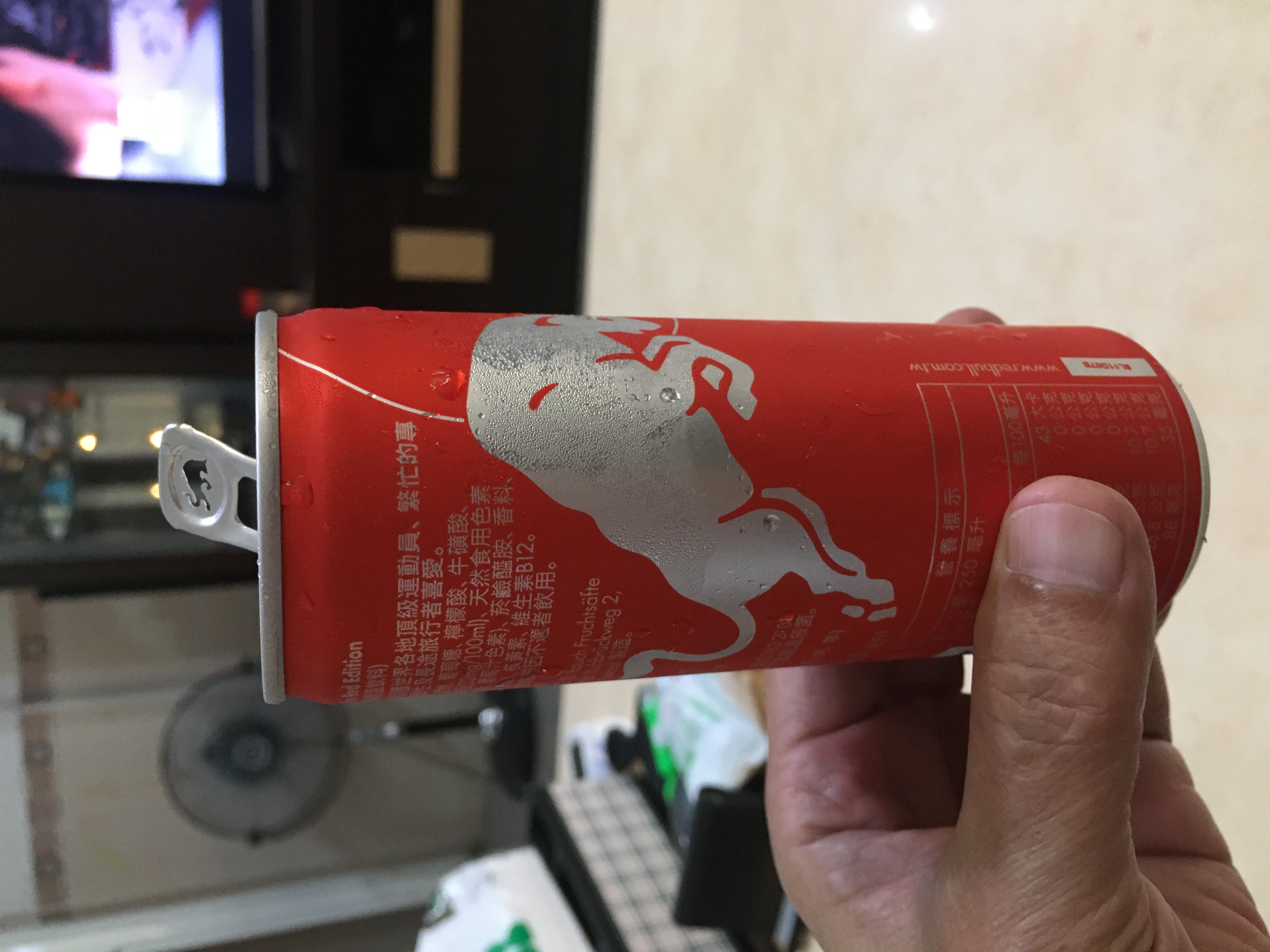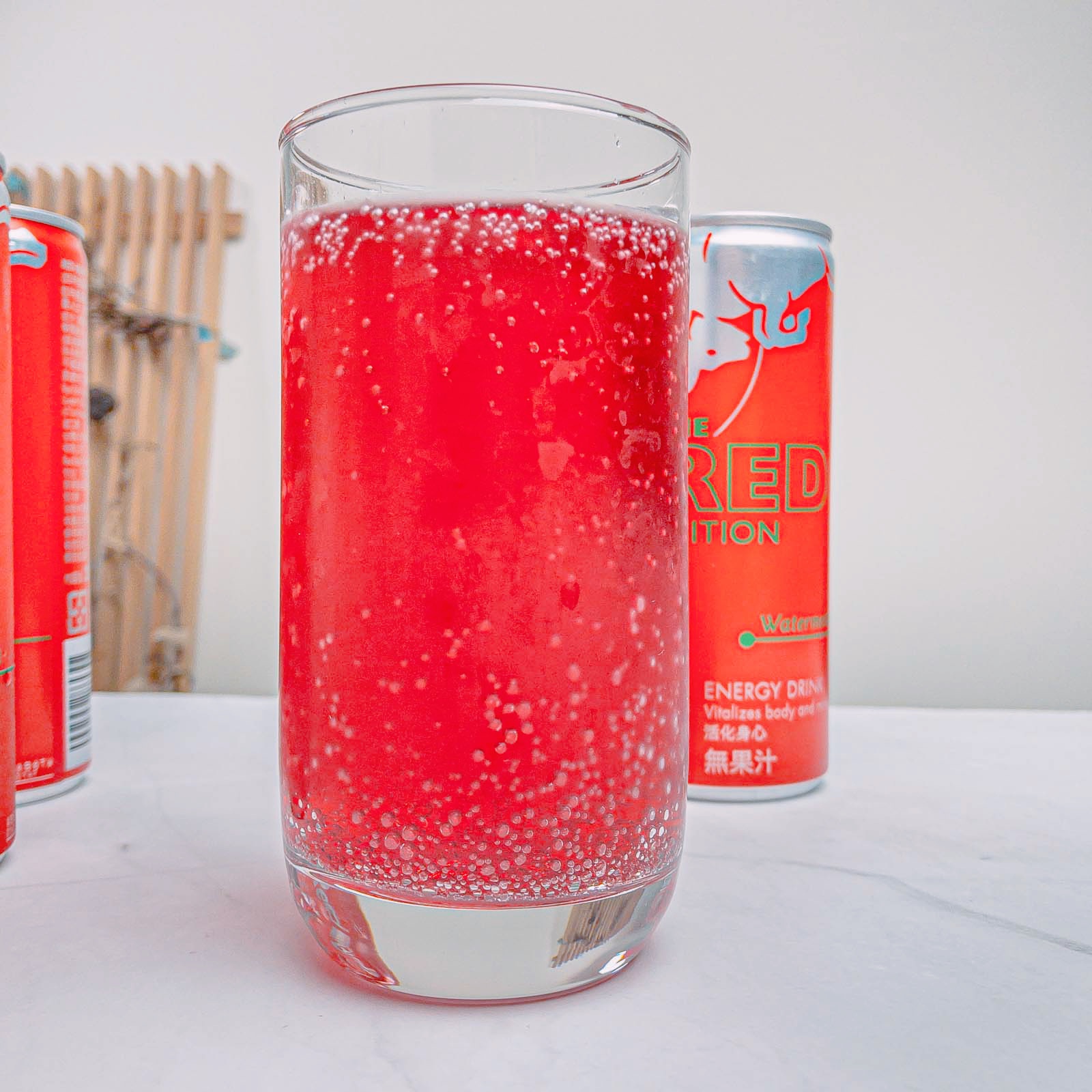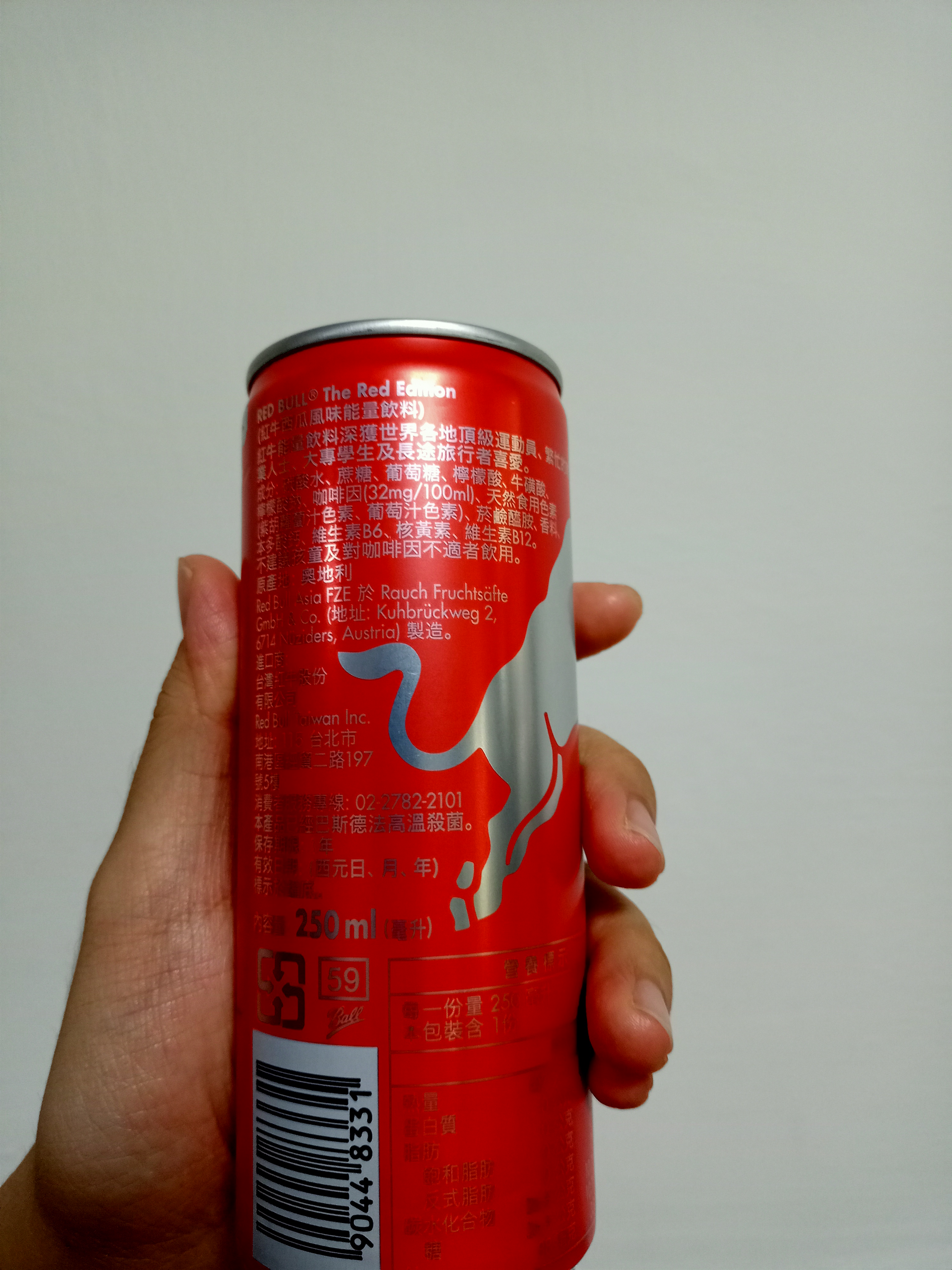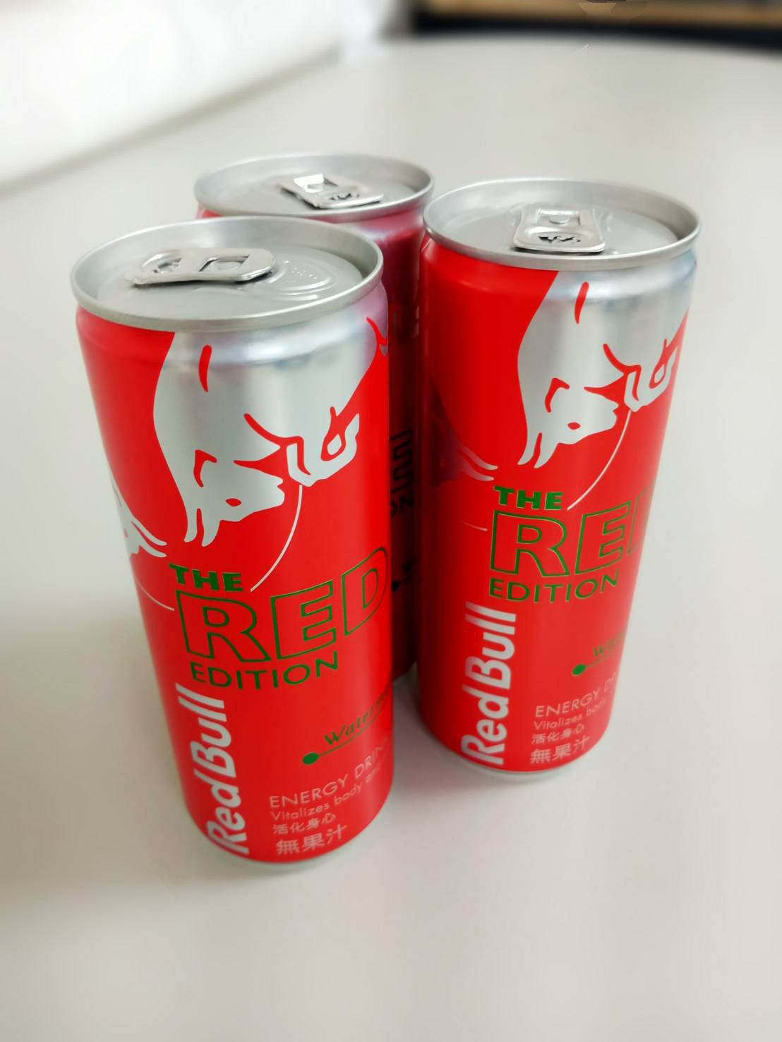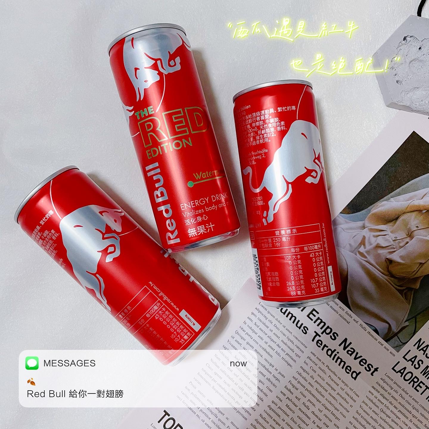炎熱的夏天,來瓶冰涼的能量飲,清爽又解渴。(冰的風味最佳) Red Bull 西瓜風味是夏天限定,市面上真的很少見。 易開罐包裝方便飲用,亮麗紅色瓶身,給人一種熱血活力的感覺。 紅色的飲品,沒什麼西瓜的味道,氣泡的口感帶著酸甜味,沁涼暢快。 含有牛磺酸、維生素B群,它能給運動員、旅行者、大學生、辛勤的工作者滿滿能量。 Red Bull 給你一對翅膀