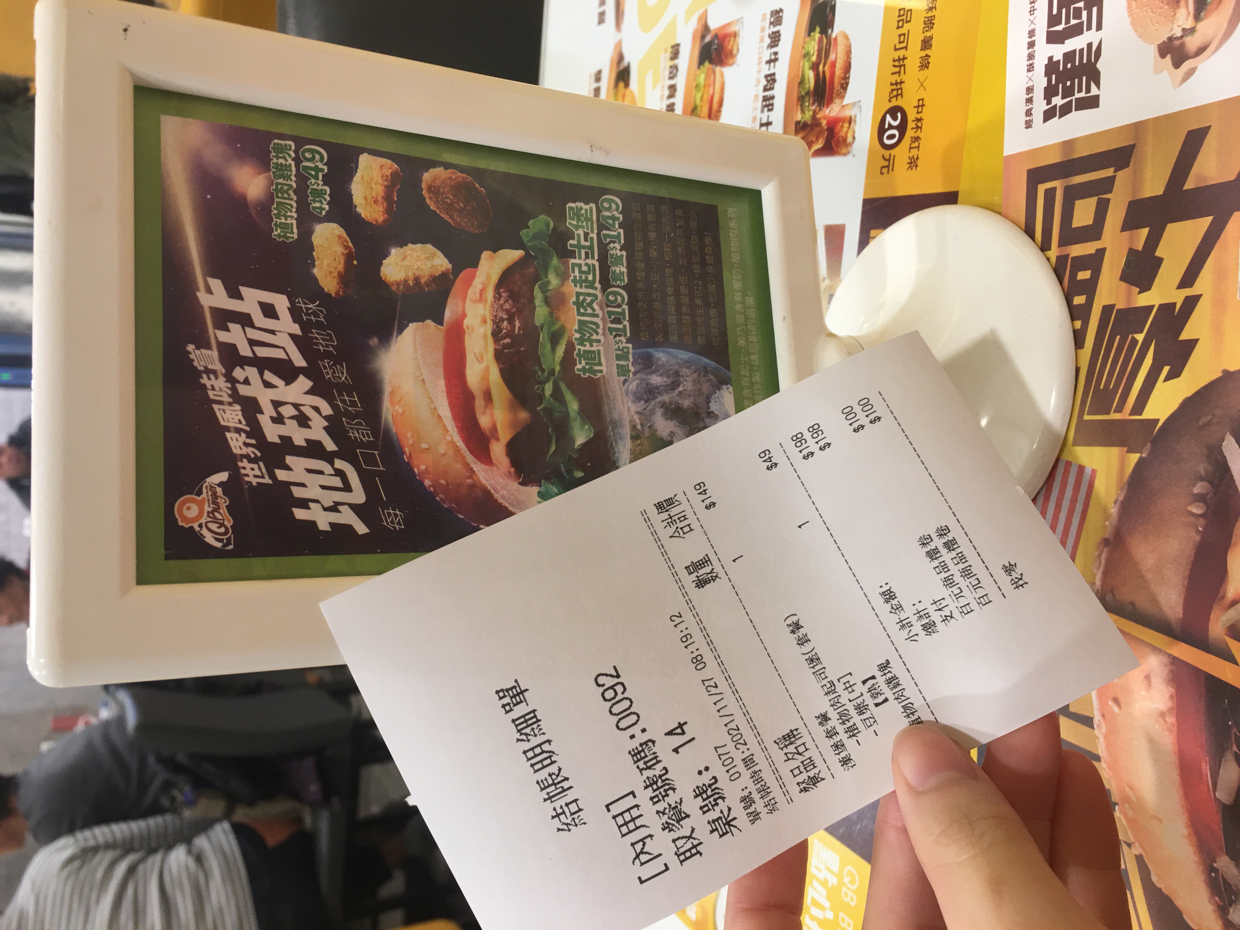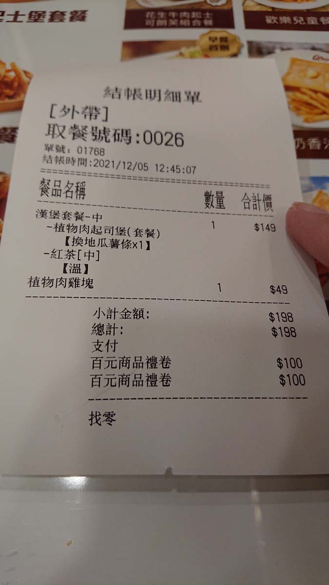 攜帶百元禮券至門市自行點餐(限兌換植物肉起士堡套餐+植物肉雞塊),於結帳時使用百元禮券結帳即可。此禮券不可找零,可加點其他產品至禮券面額門檻。