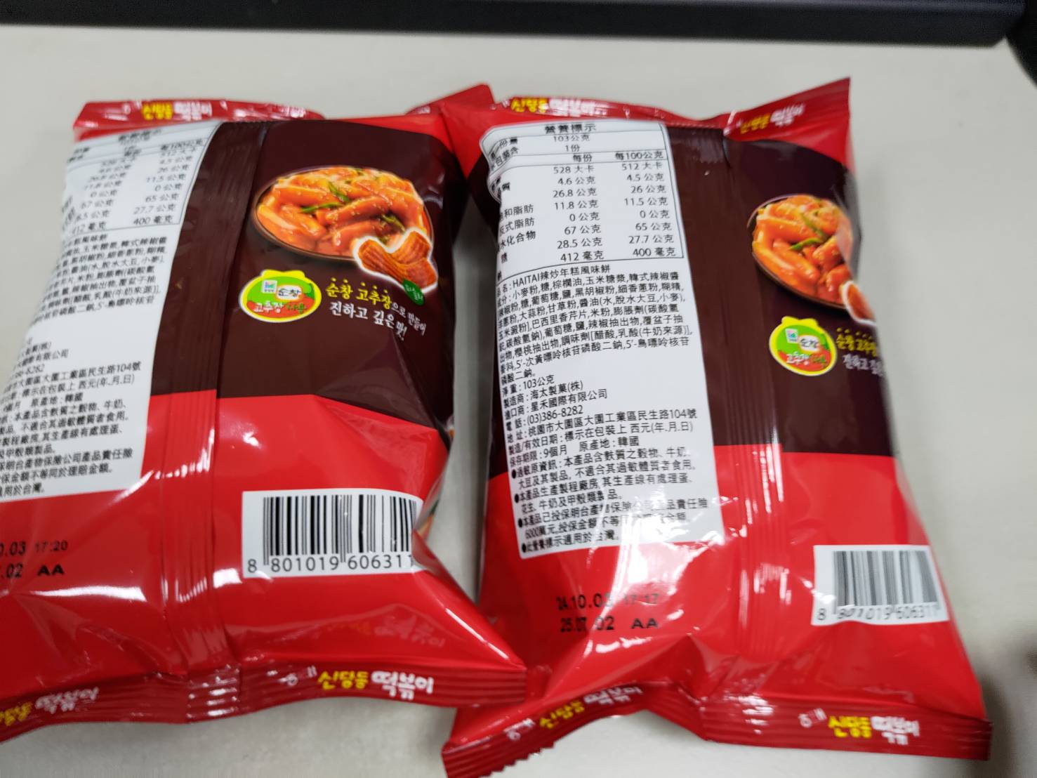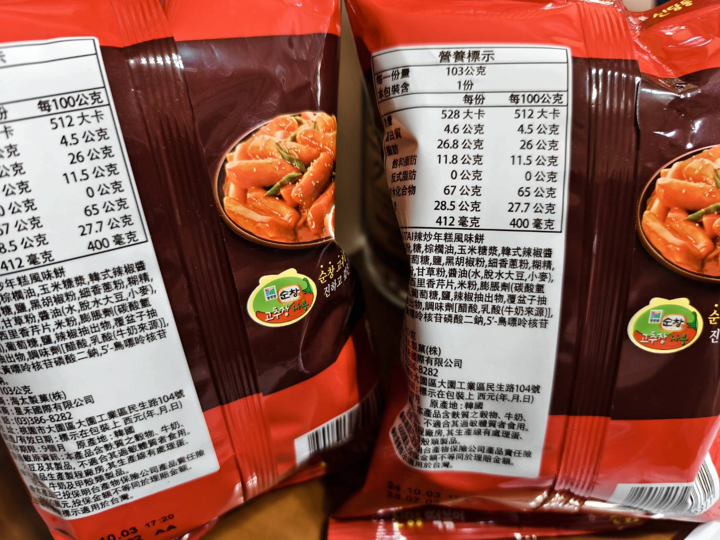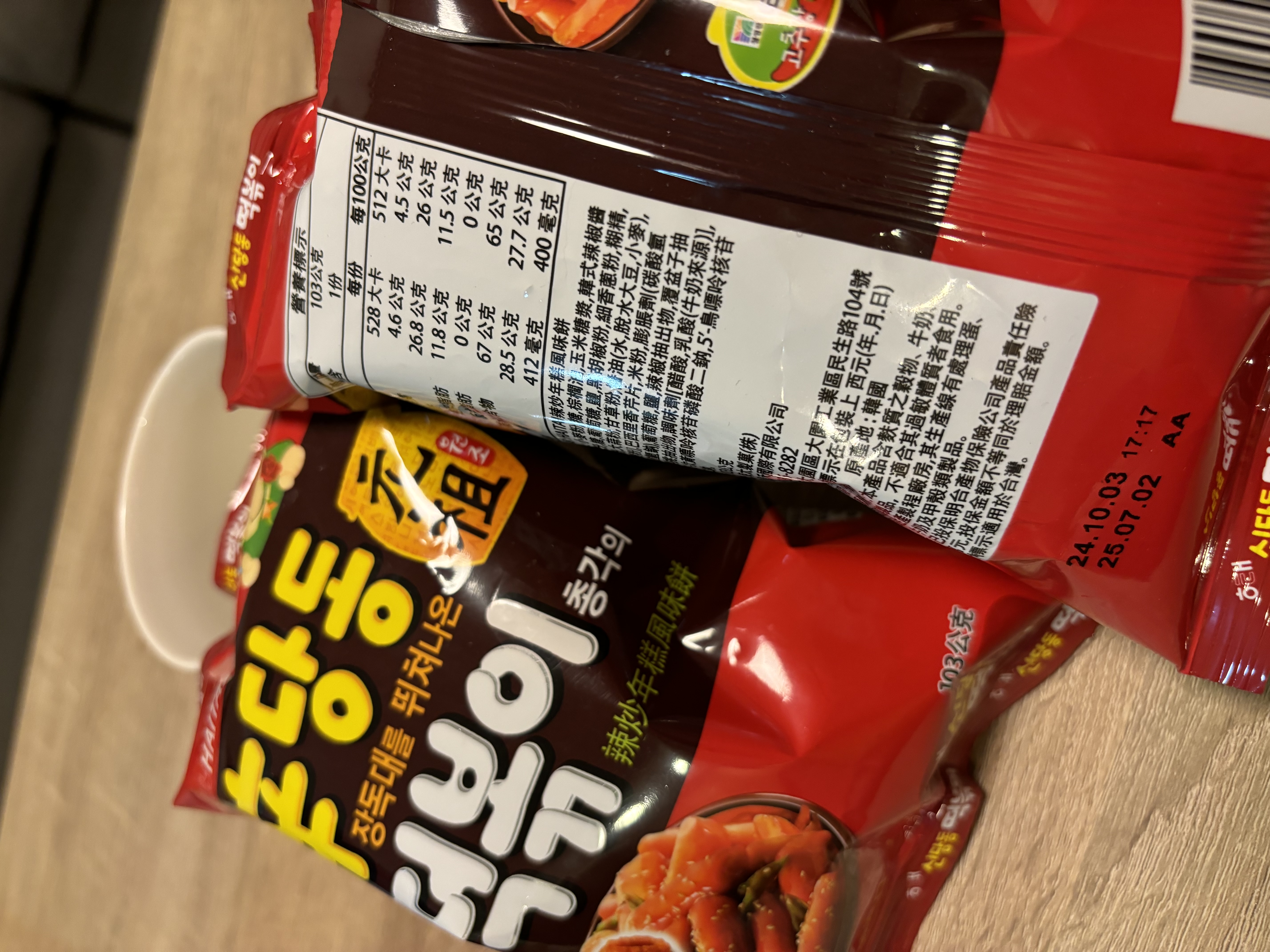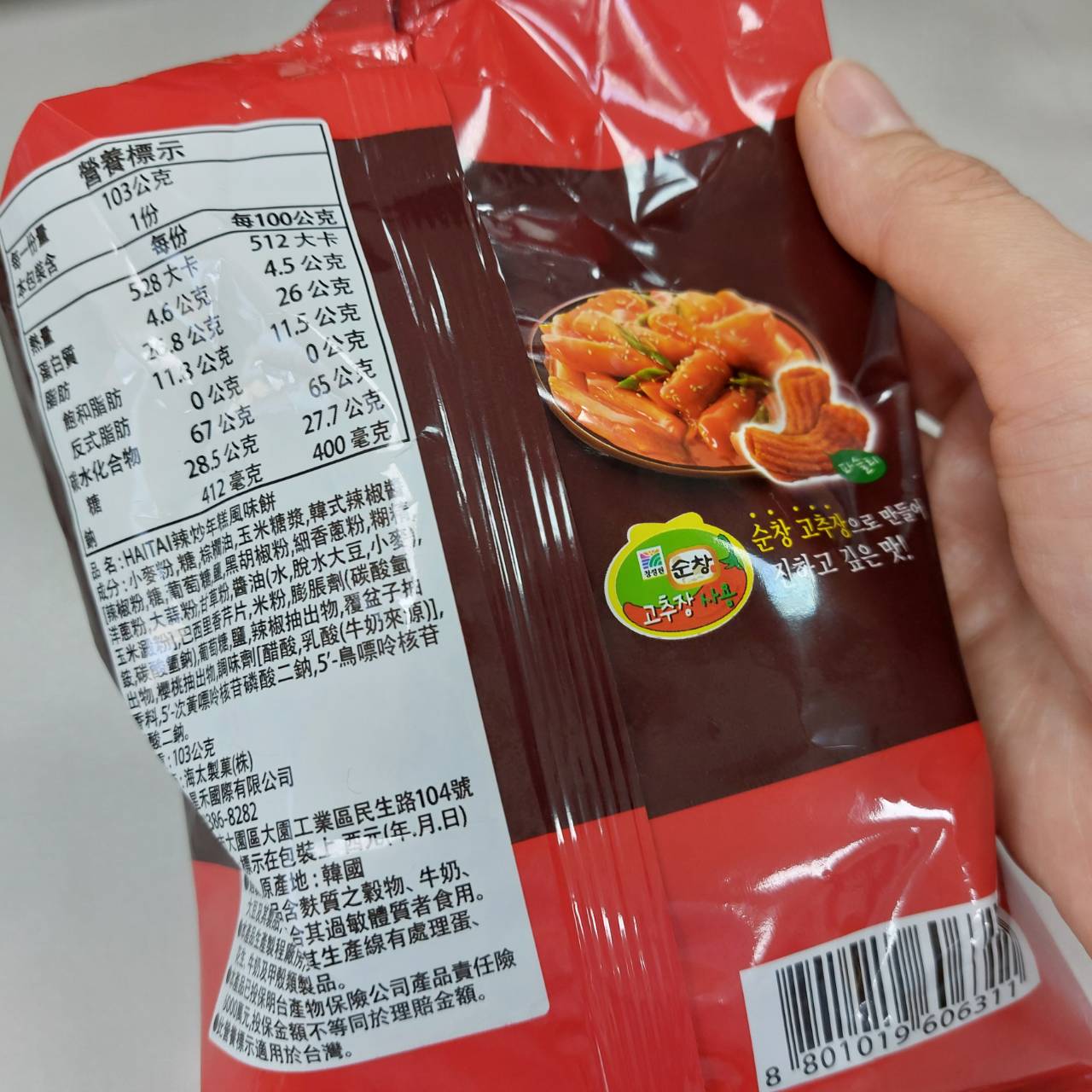 成分:小麥粉,糖,棕櫚油,玉米糖漿,韓式辣椒醬[辣椒粉,糖,葡萄糖,鹽,黑胡椒粉,細香蔥粉,糊精,洋蔥粉,大蒜粉,甘草粉,醬油(水,脫水大豆,小麥),玉米澱粉],巴西里香芹片,米粉,膨脹劑(碳酸氫銨,碳酸氫鈉),葡萄糖,鹽,辣椒抽出物,覆盆子抽出物,櫻桃抽出物,調味劑[醋酸,乳酸(牛奶來源)],香料,5'-次黃嘌呤核苷磷酸二鈉,5'-鳥嘌呤核苷磷酸二鈉。