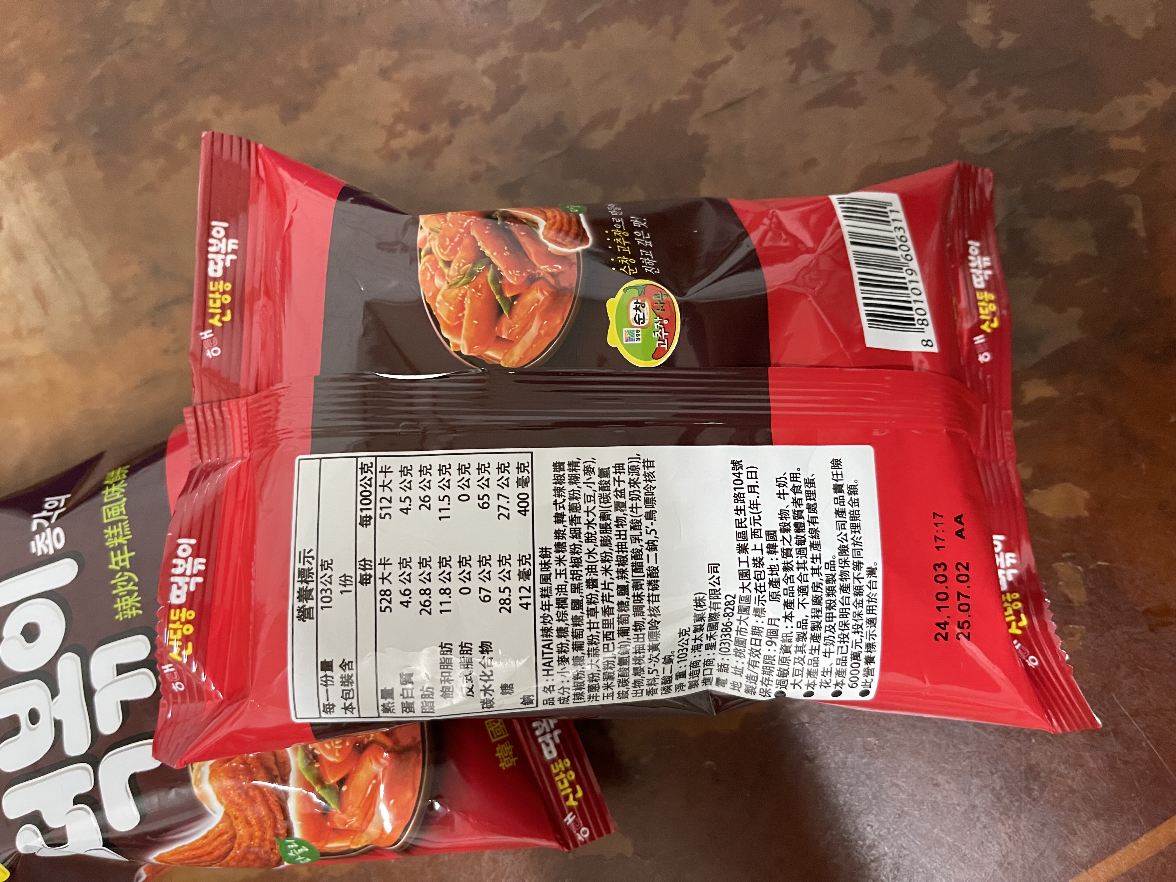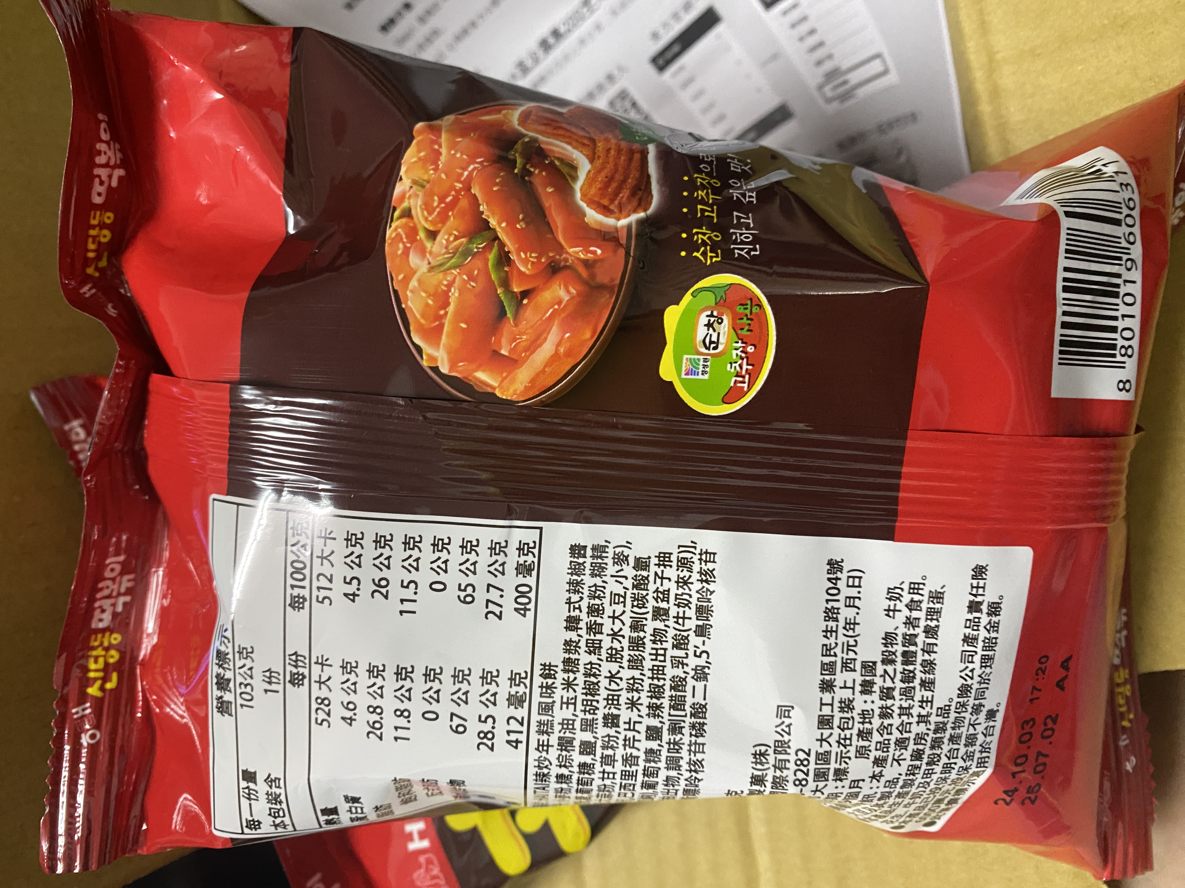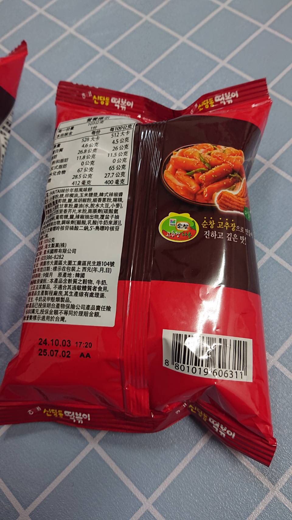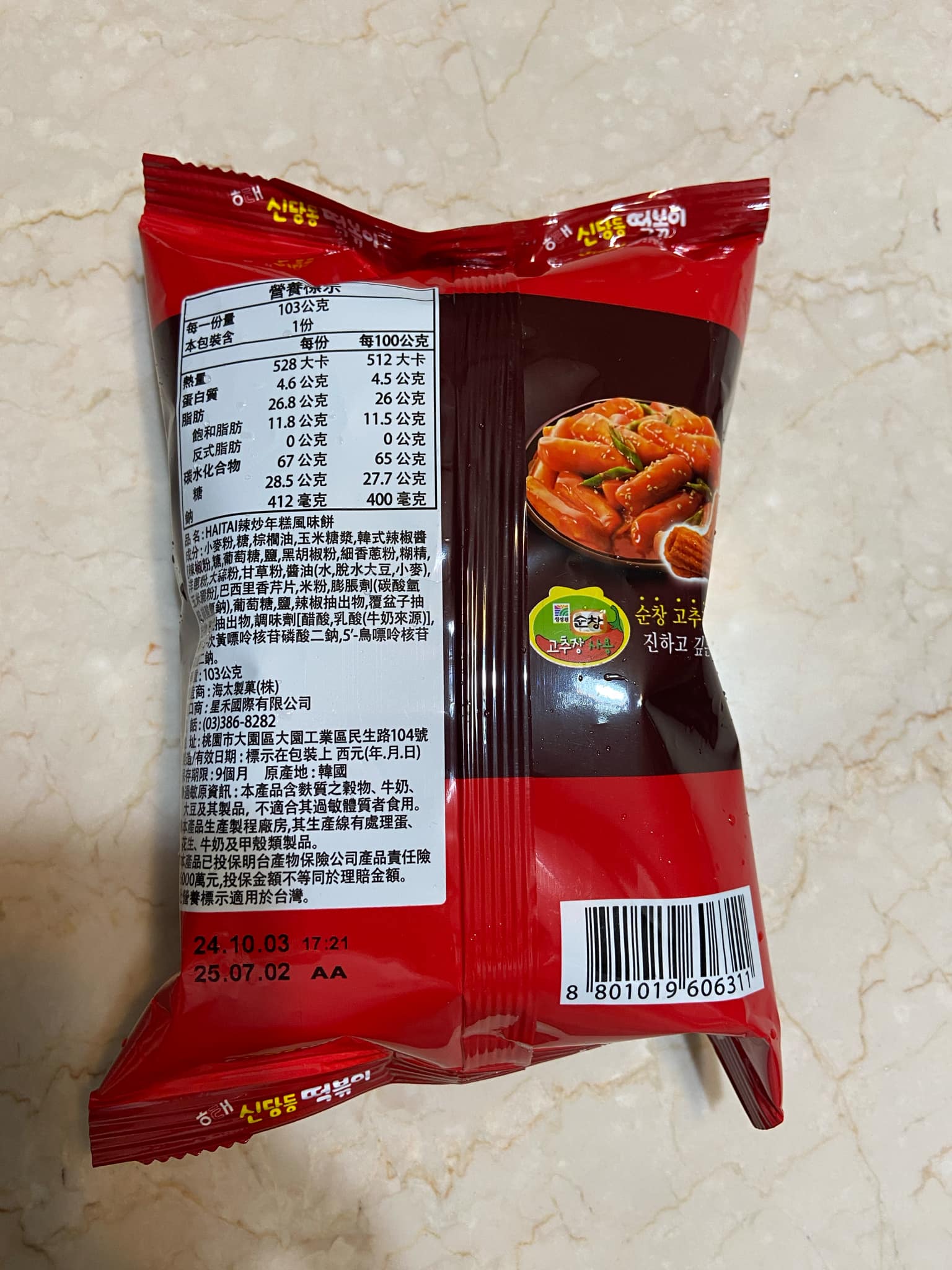 成分:小麥粉,糖,棕櫚油,玉米糖漿,韓式辣椒醬[辣椒粉,糖,葡萄糖,鹽,黑胡椒粉,細香蔥粉,糊精,洋蔥粉,大蒜粉,甘草粉,醬油(水,脫水大豆,小麥),玉米澱粉],巴西里香芹片,米粉,膨脹劑(碳酸氫銨,碳酸氫鈉),葡萄糖,鹽,辣椒抽出物,覆盆子抽出物,櫻桃抽出物,調味劑[醋酸,乳酸(牛奶來源)],香料,5'-次黃嘌呤核苷磷酸二鈉,5'-鳥嘌呤核苷磷酸二鈉。