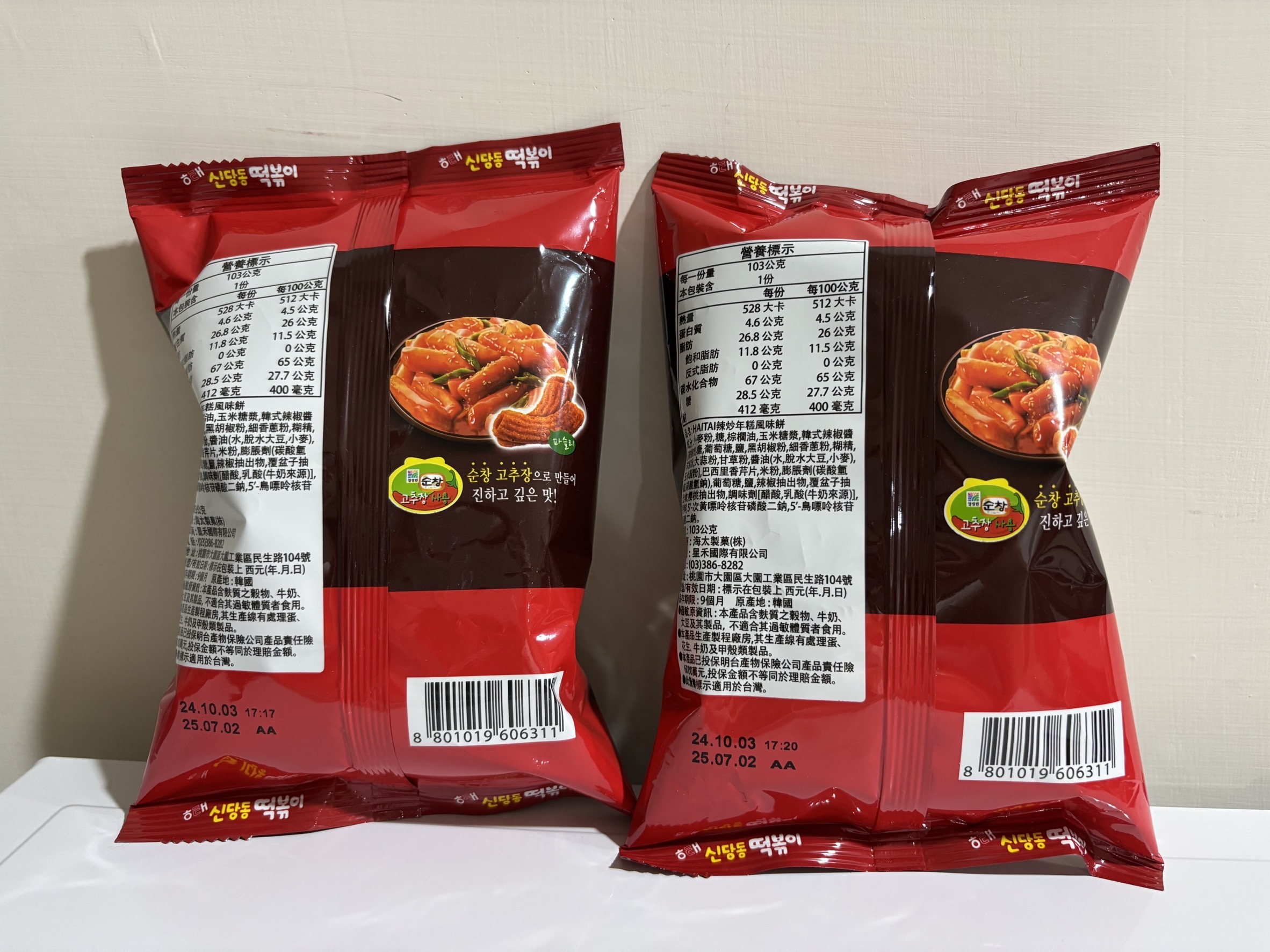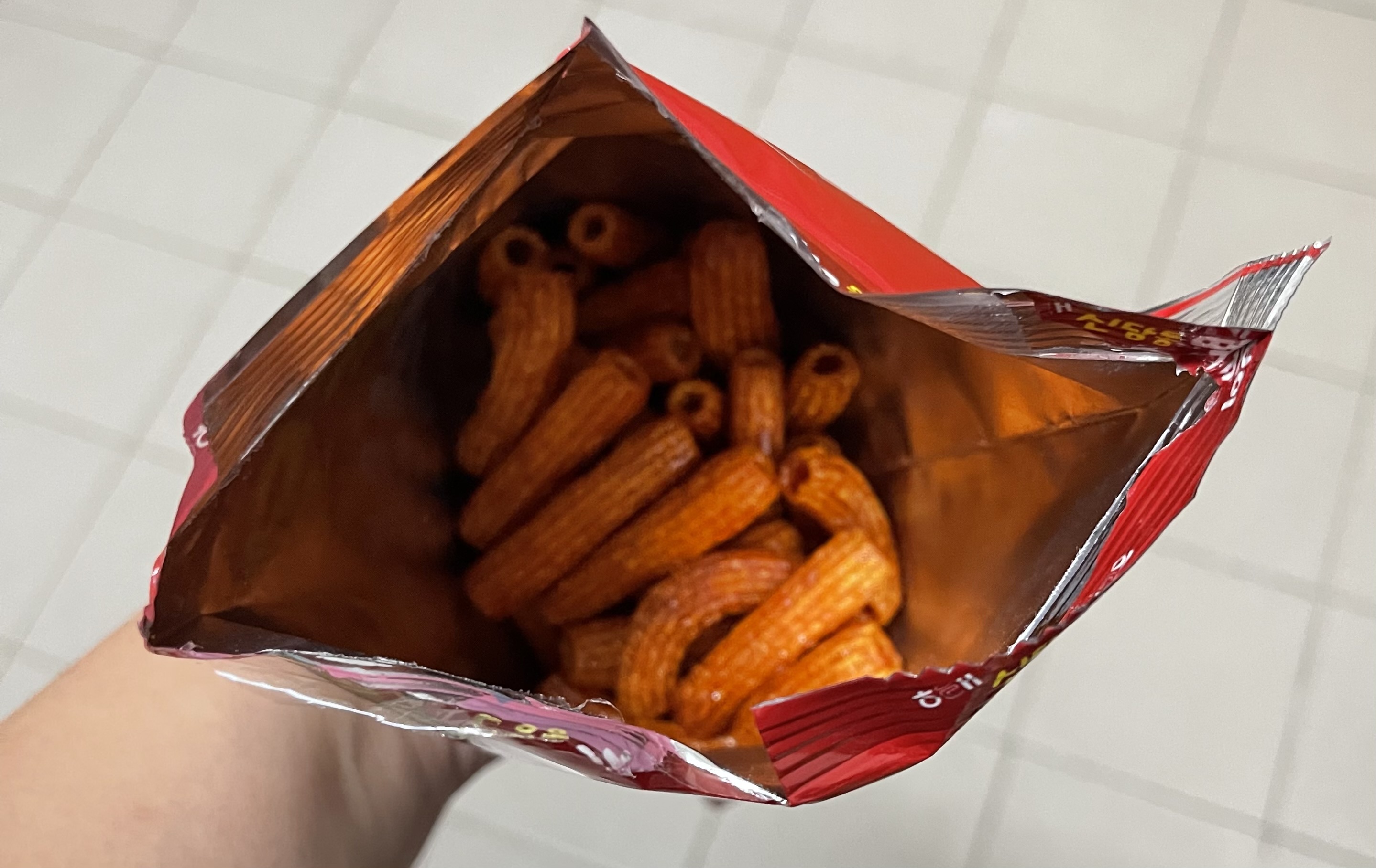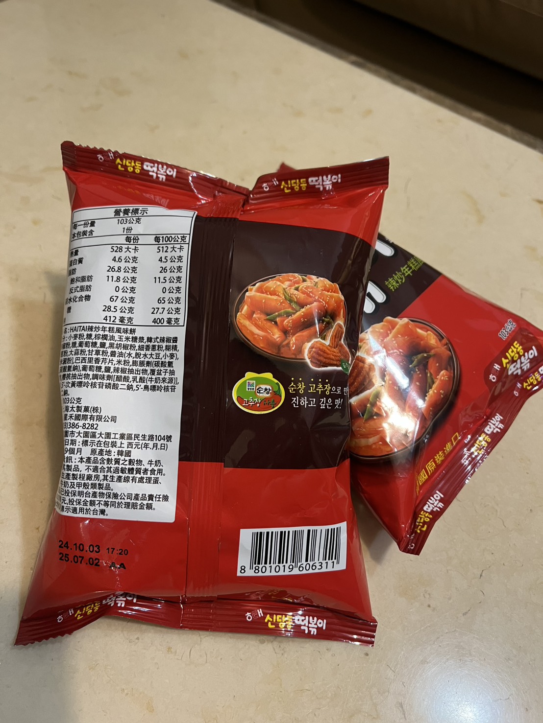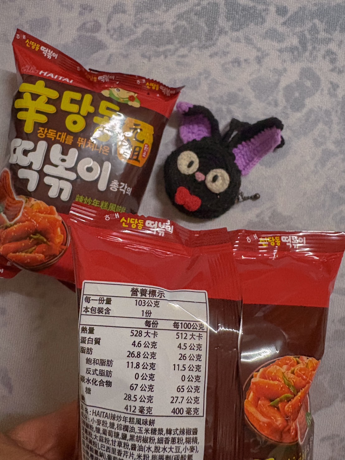 成分:小麥粉,糖,棕櫚油,玉米糖漿,韓式辣椒醬[辣椒粉,糖,葡萄糖,鹽,黑胡椒粉,細香蔥粉,糊精,洋蔥粉,大蒜粉,甘草粉,醬油(水,脫水大豆,小麥),玉米澱粉],巴西里香芹片,米粉,膨脹劑(碳酸氫銨,碳酸氫鈉),葡萄糖,鹽,辣椒抽出物,覆盆子抽出物,櫻桃抽出物,調味劑[醋酸,乳酸(牛奶來源)],香料,5'-次黃嘌呤核苷磷酸二鈉,5'-鳥嘌呤核苷磷酸二鈉。