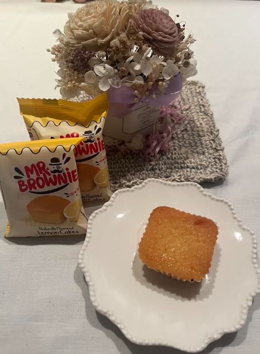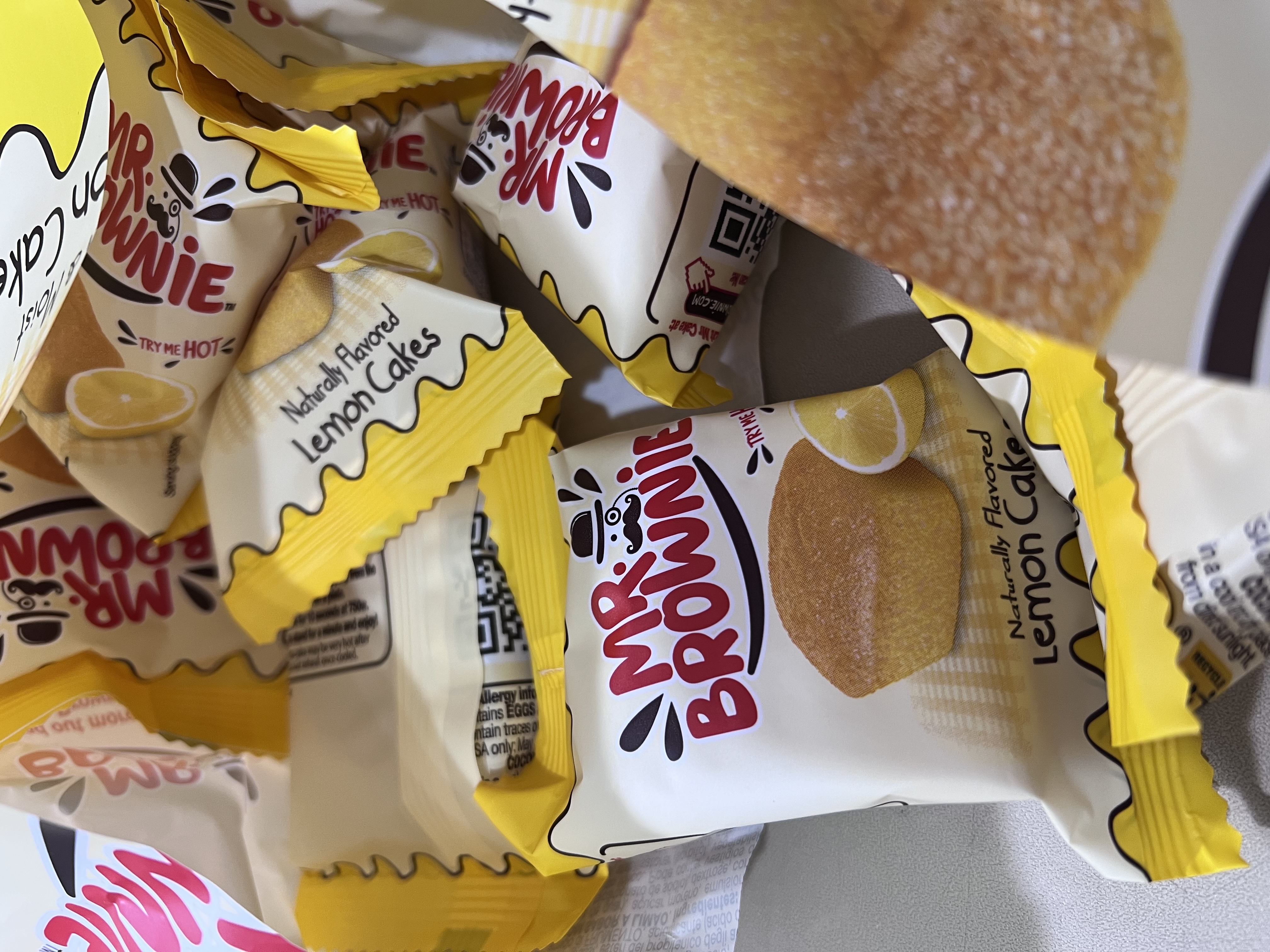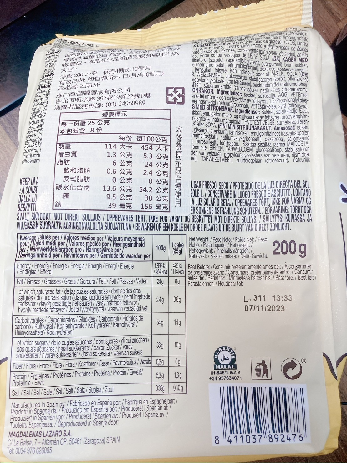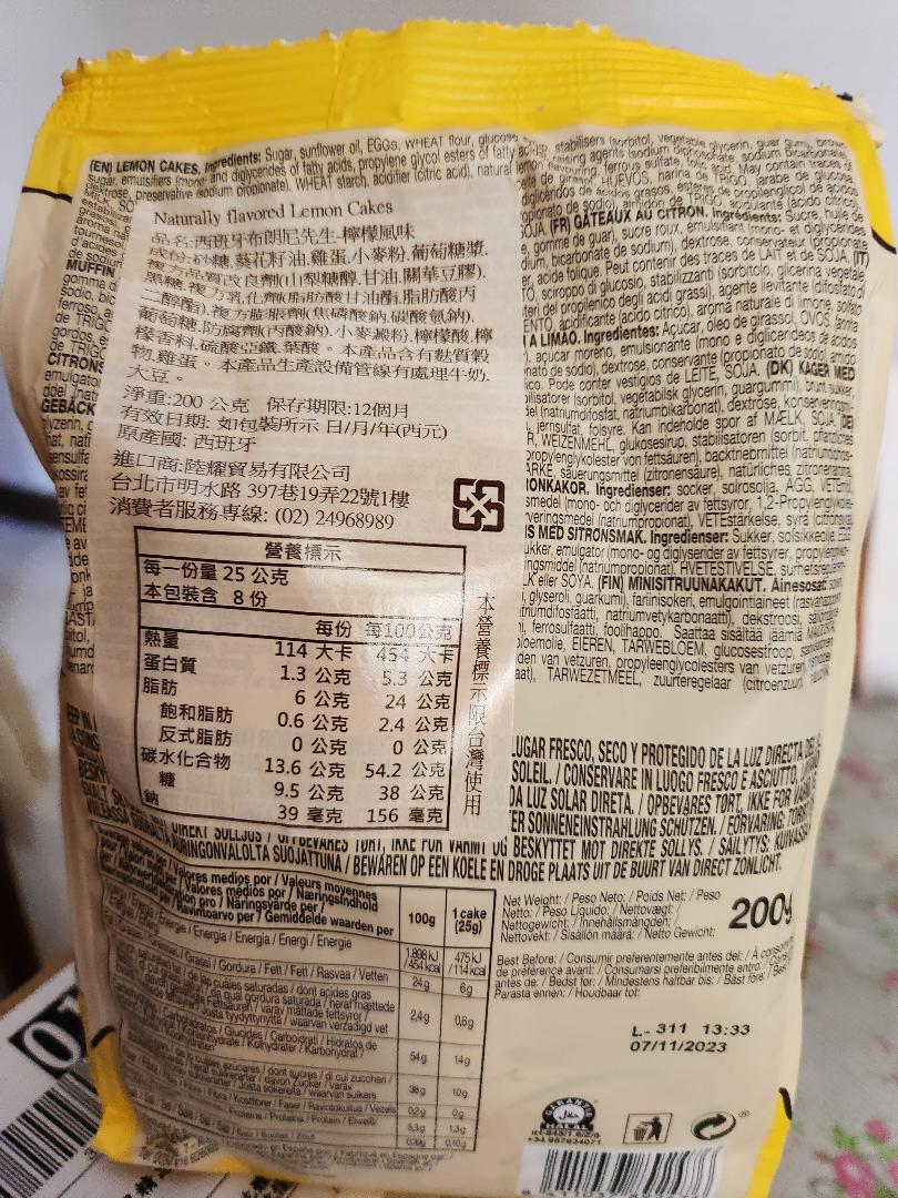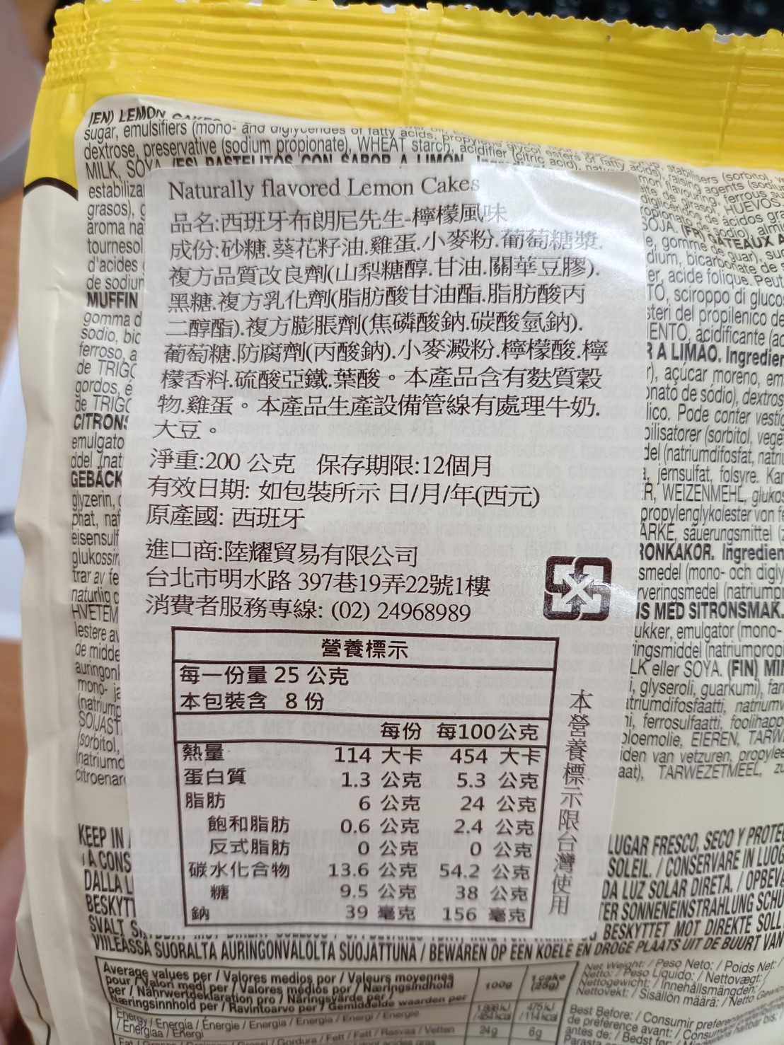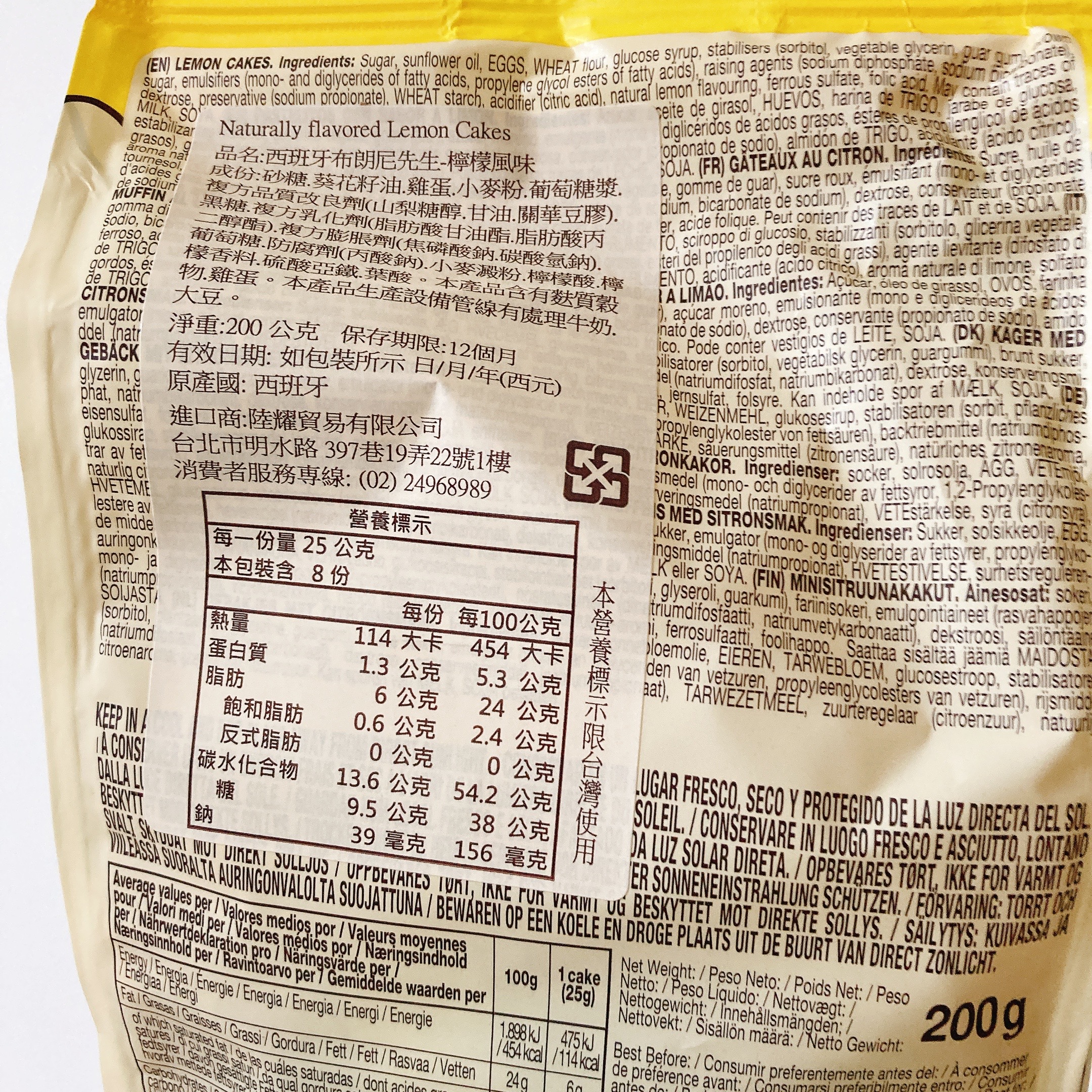 砂糖.葵花籽油.雞蛋.小麥粉.葡萄糖漿.複方品質改良劑(山梨糖醇.甘油.關華豆膠).黑糖.複方乳化劑(脂肪酸甘油酯.脂肪酸丙二醇酯).複方膨脹劑(焦磷酸鈉.碳酸氫鈉).葡萄糖.防腐劑(丙酸鈉).小麥澱粉.檸檬酸.檸檬香料.硫酸亞鐵.葉酸。 本產品含有麩質穀物.雞蛋。 本產品生產設備管線有處理牛奶.大豆。