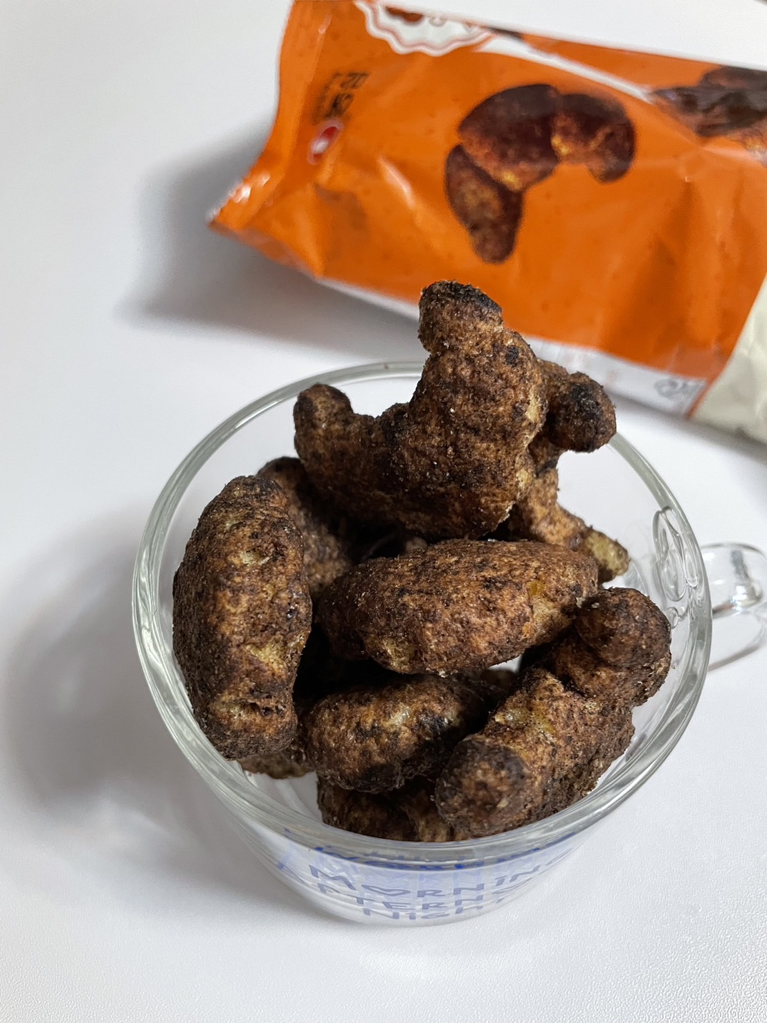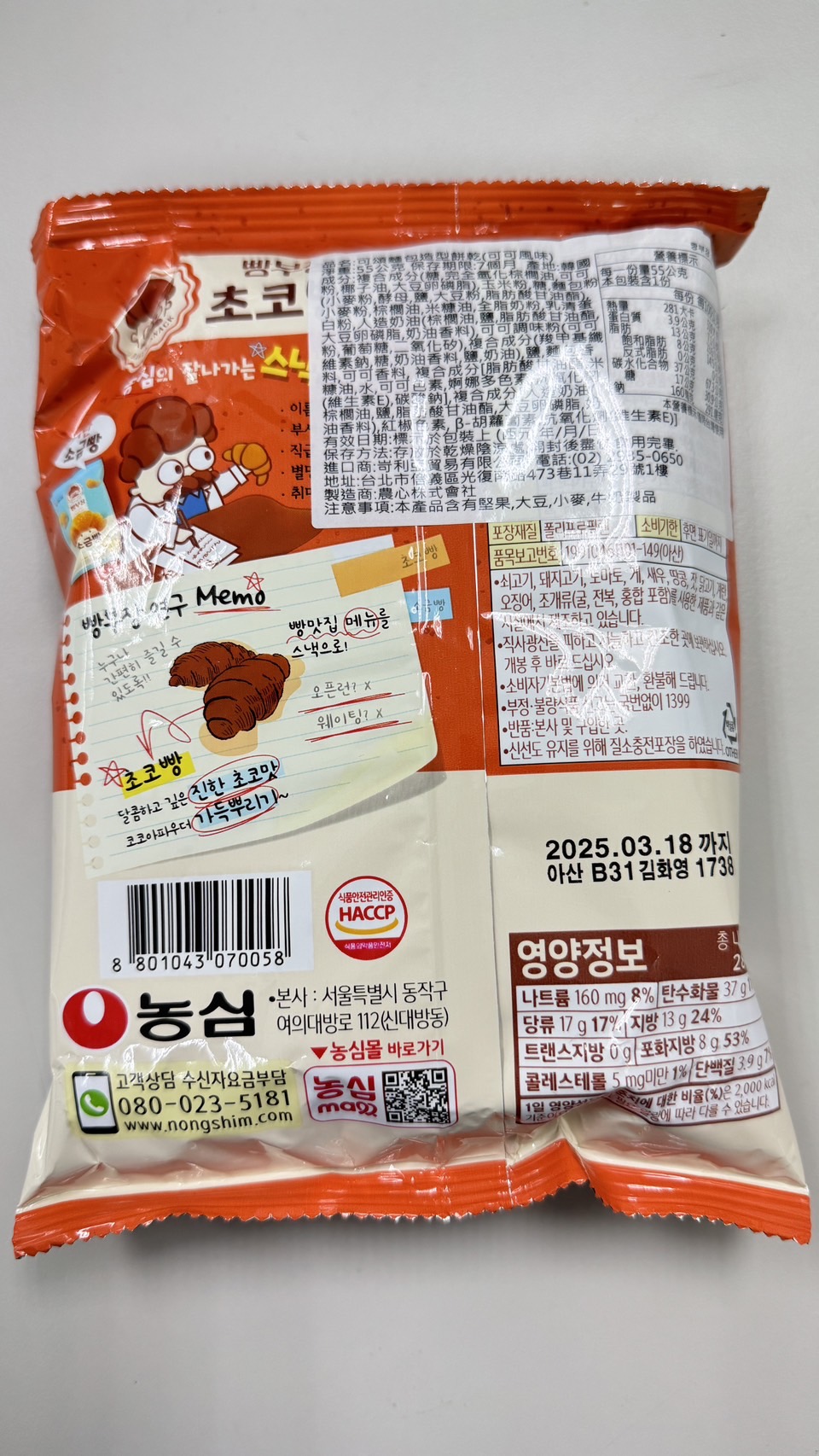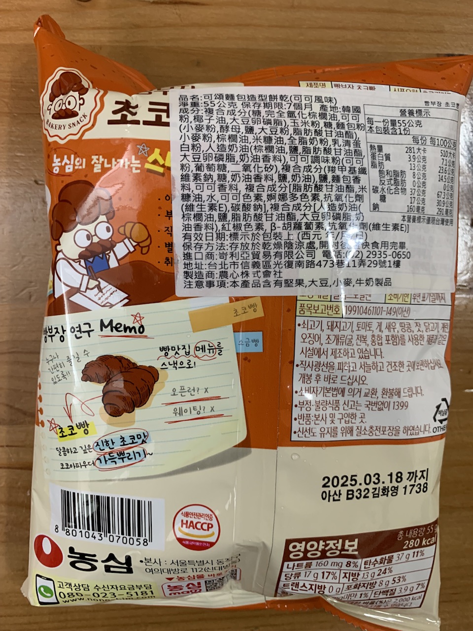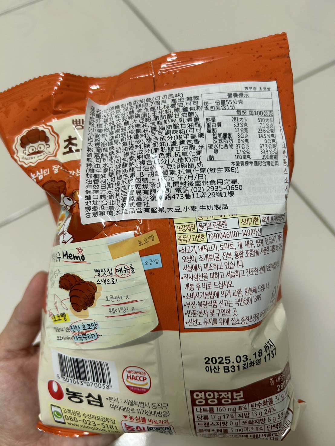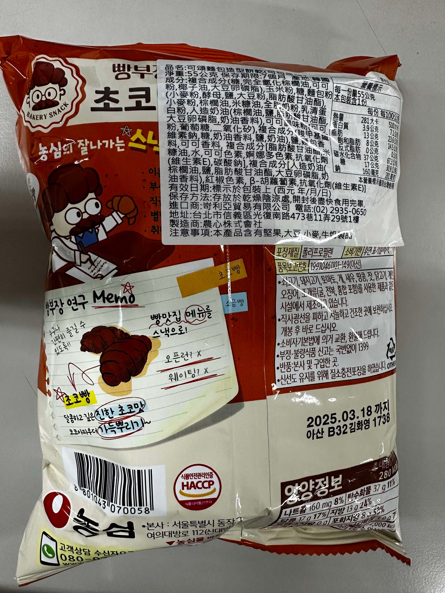 複合成分(糖,完全氫化棕櫚油,可可粉,椰子油,大豆卵磷脂),玉米粉,糖,麵包粉(小麥粉,酵母,鹽,大豆粉,脂肪酸甘油酯),小麥粉,棕櫚油,米糠油,全脂奶粉,乳清蛋白粉,人造奶油(棕櫚油,鹽,脂肪酸甘油酯,大豆卵磷脂,奶油香料),可可調味粉(可可粉,葡萄糖,二氧化矽),複合成分(羧甲基纖維素鈉,糖,奶油香料,鹽,奶油),鹽,麵包香料,可可香料,複合成分[脂肪酸甘油酯,米糠油,水,可可色素,婀娜多色素,抗氧化劑(維生素E),碳酸鈉],複合成分[人造奶油(棕櫚油,鹽,脂肪酸甘油酯,大豆卵磷脂,奶油香料),紅椒色素,B-胡蘿蔔素,抗氧化劑(維生素E)]