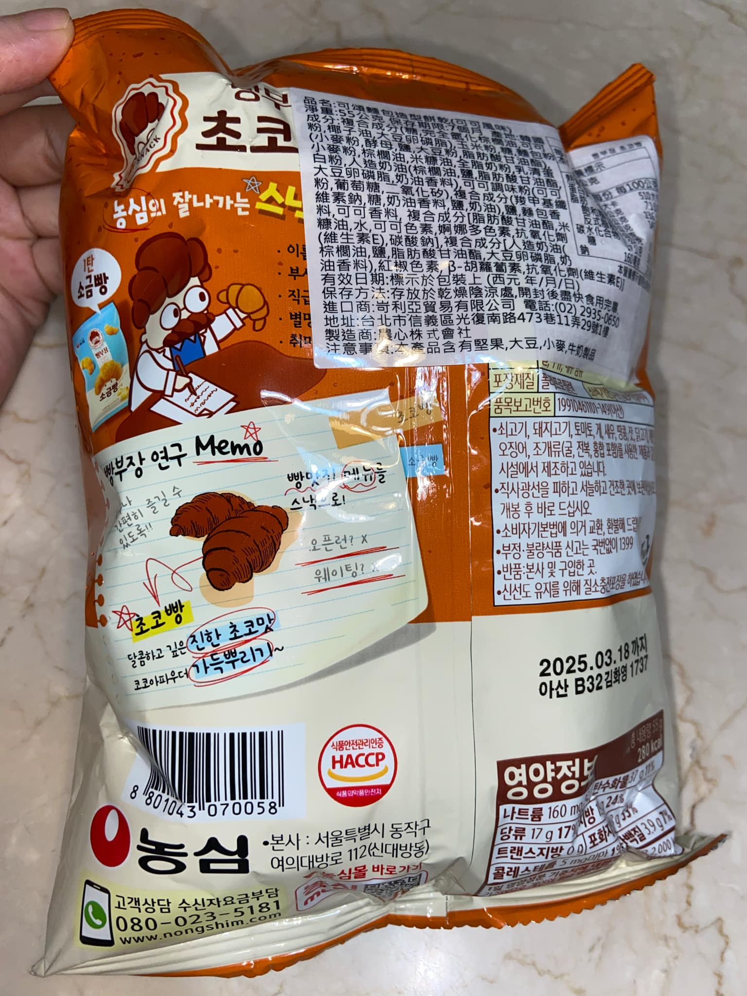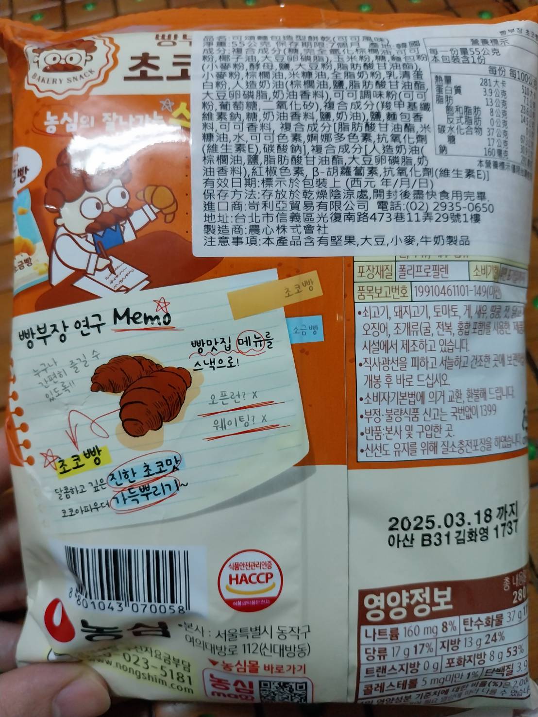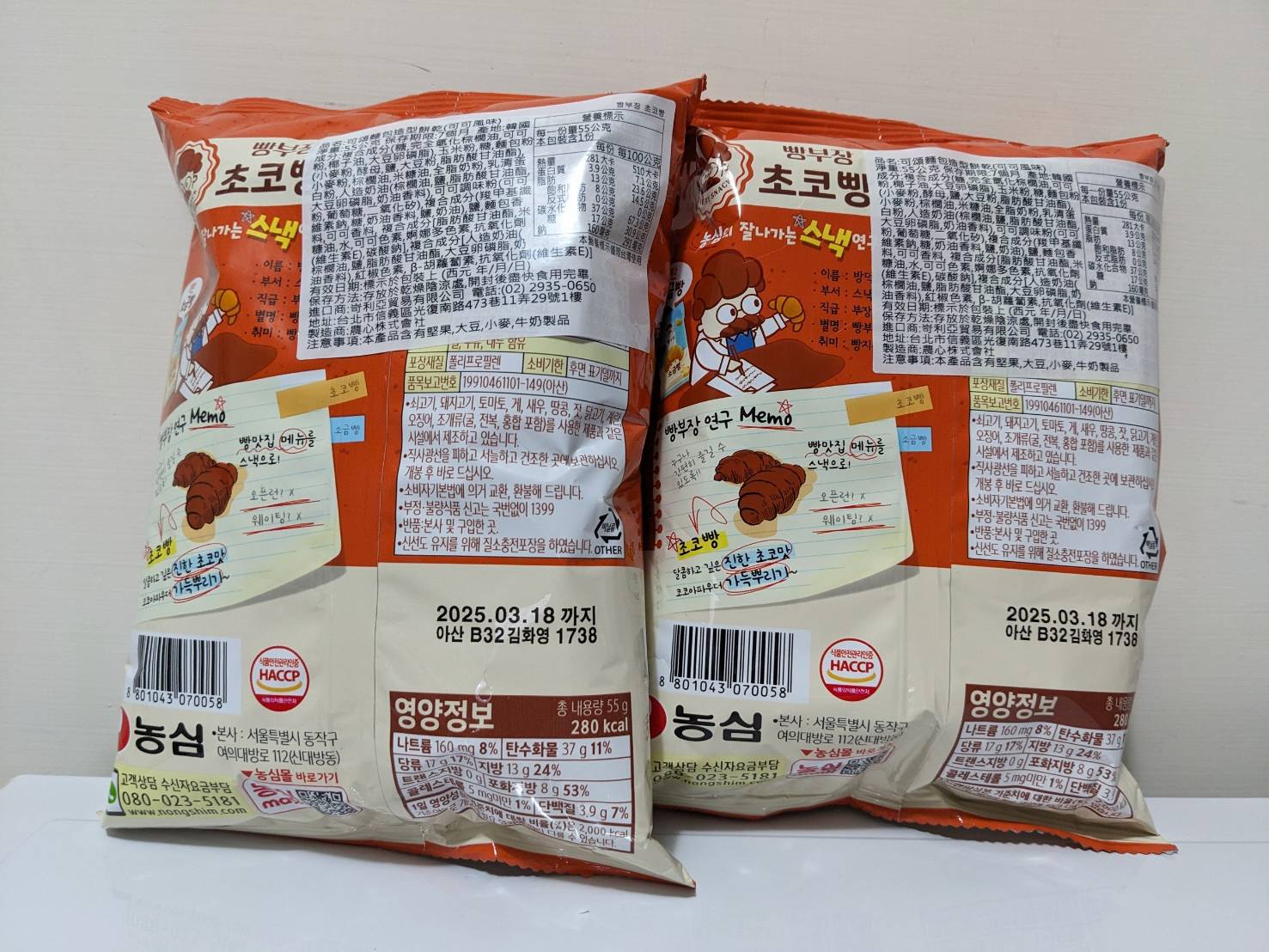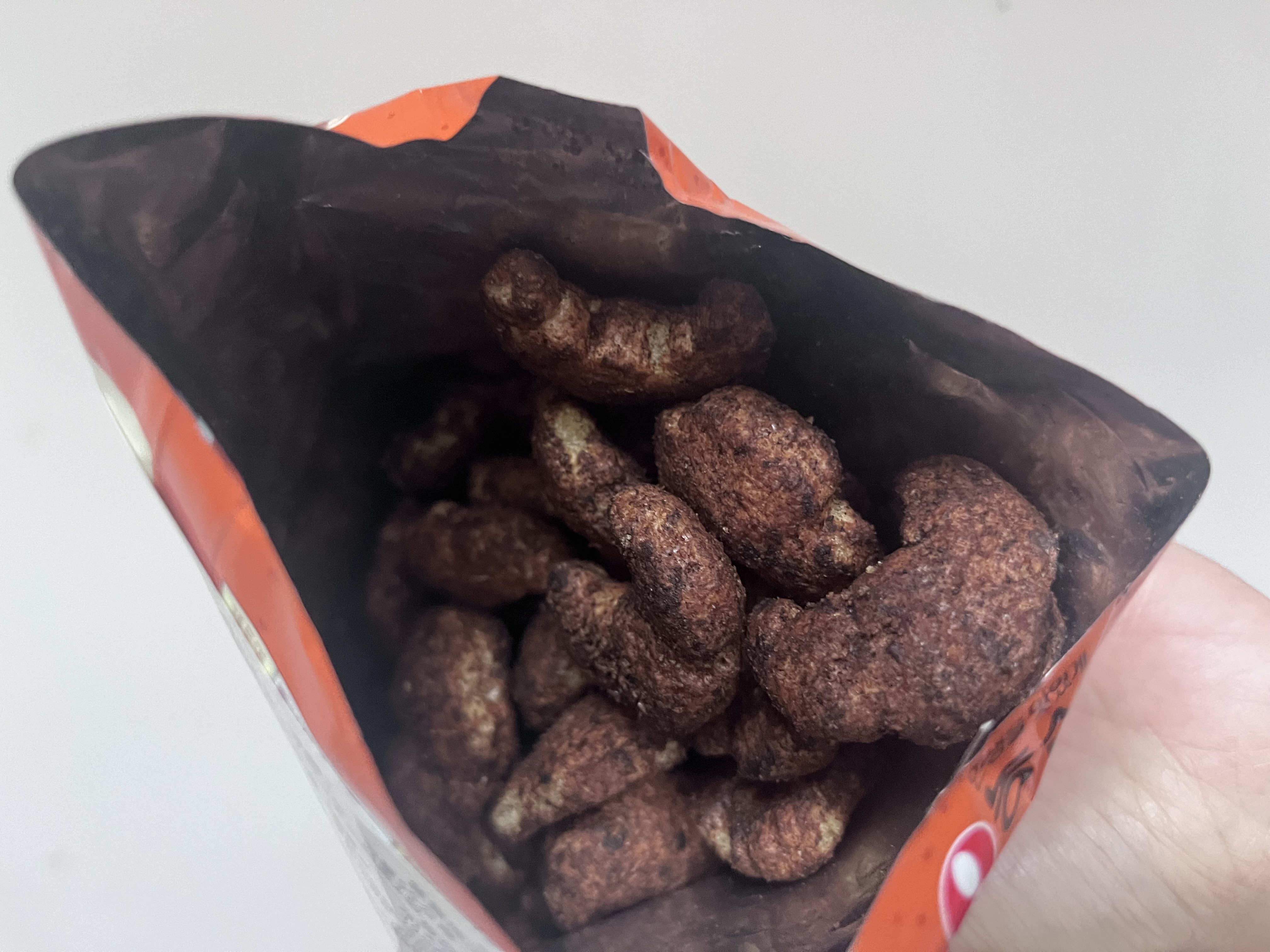 複合成分(糖,完全氫化棕櫚油,可可粉,椰子油,大豆卵磷脂),玉米粉,糖,麵包粉(小麥粉,酵母,鹽,大豆粉,脂肪酸甘油酯),小麥粉,棕櫚油,米糠油,全脂奶粉,乳清蛋白粉,人造奶油(棕櫚油,鹽,脂肪酸甘油酯,大豆卵磷脂,奶油香料),可可調味粉(可可粉,葡萄糖,二氧化矽),複合成分(羧甲基纖維素鈉,糖,奶油香料,鹽,奶油),鹽,麵包香料,可可香料,複合成分[脂肪酸甘油酯,米糠油,水,可可色素,婀娜多色素,抗氧化劑(維生素E),碳酸鈉],複合成分[人造奶油(棕櫚油,鹽,脂肪酸甘油酯,大豆卵磷脂,奶油香料),紅椒色素,B-胡蘿蔔素,抗氧化劑(維生素E)]