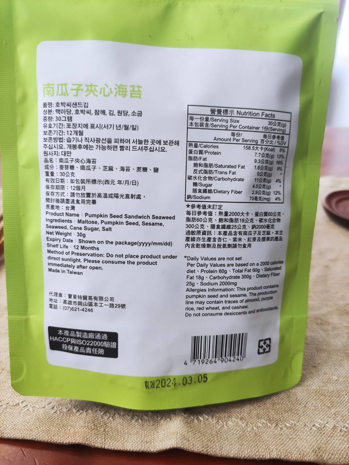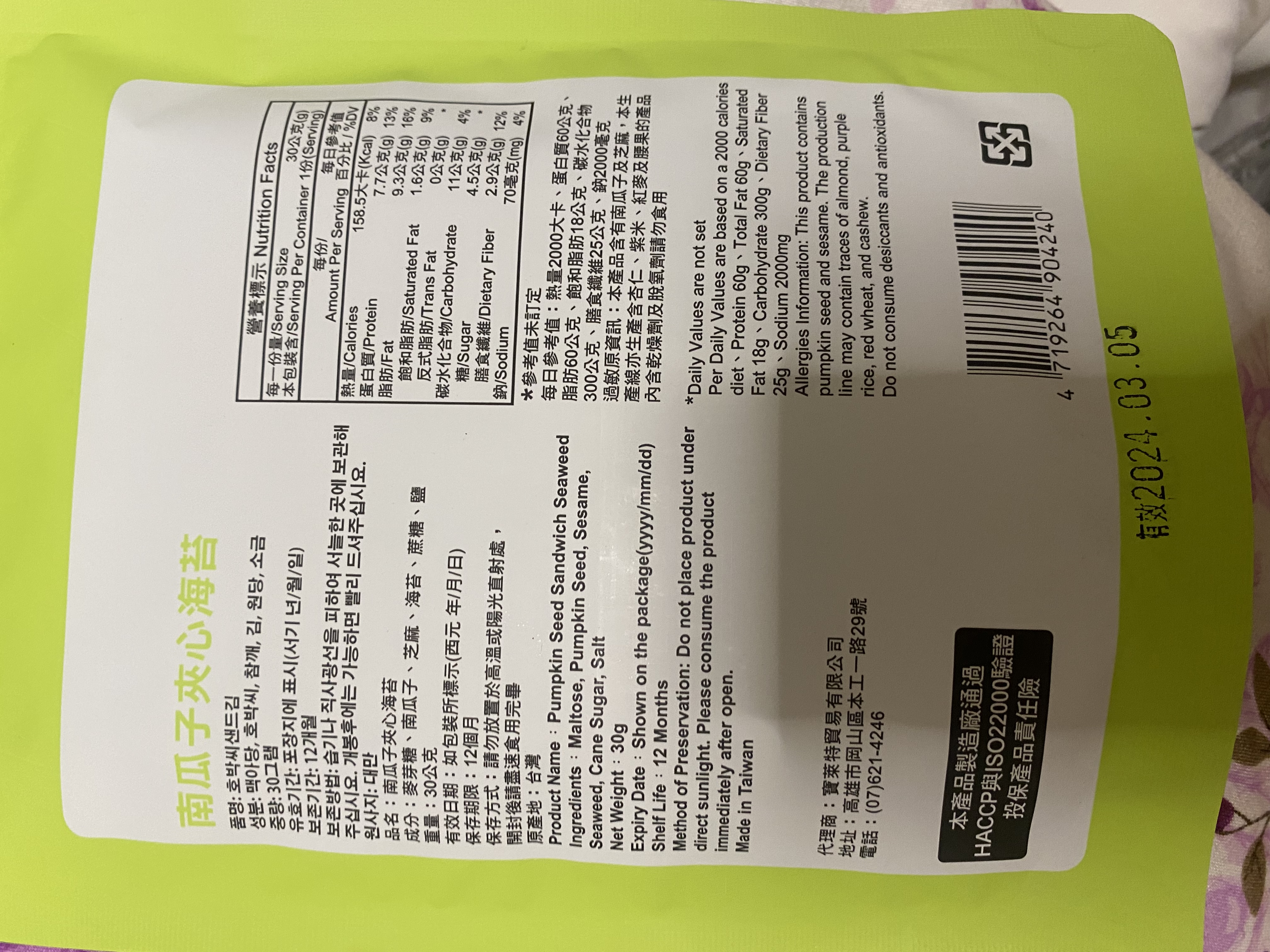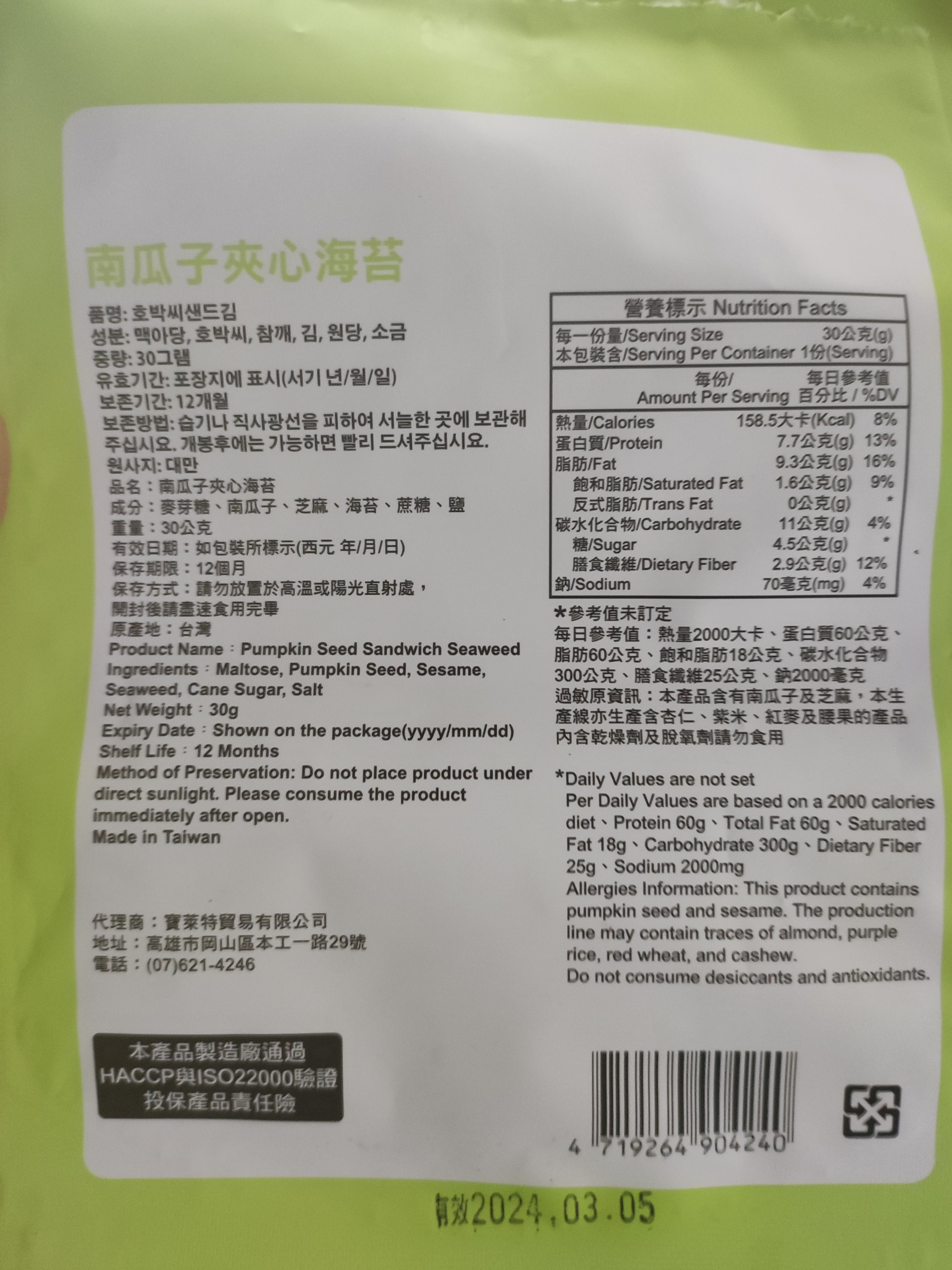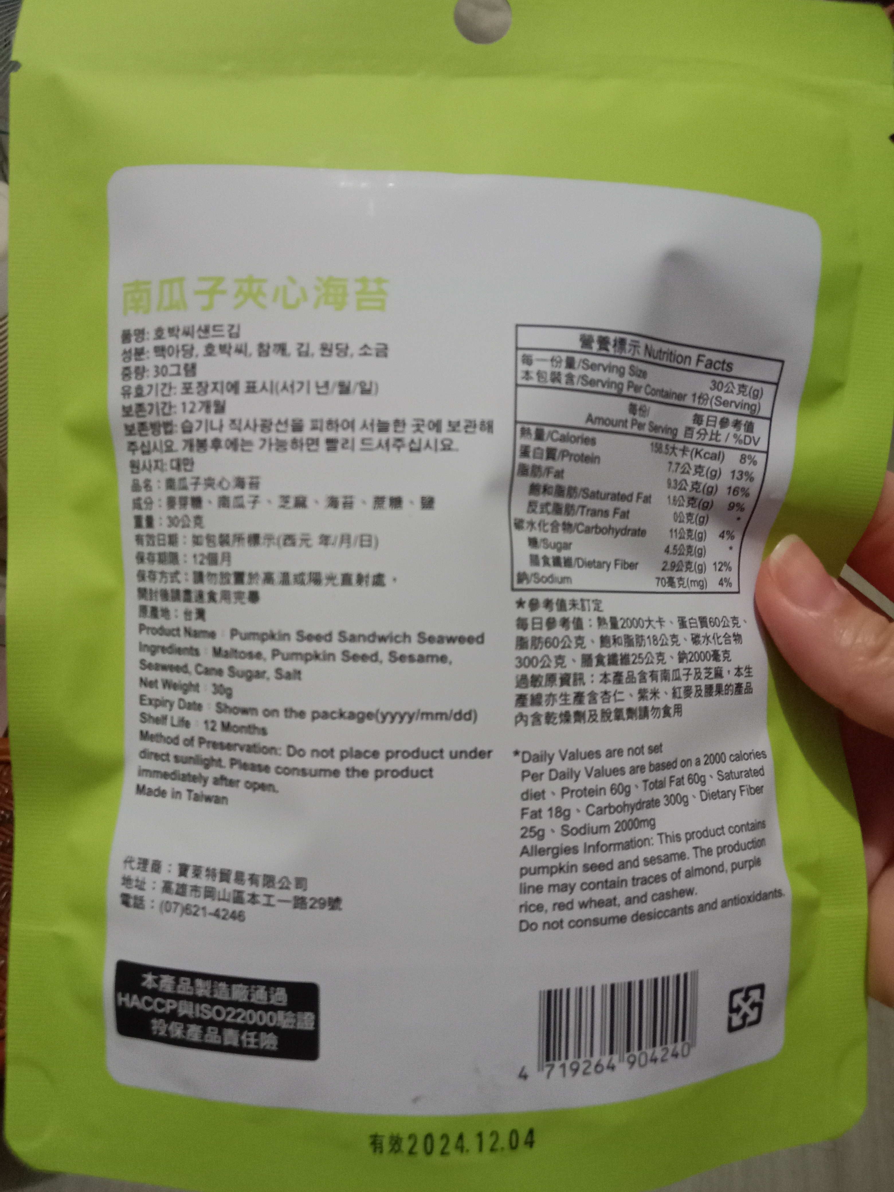 回列表 CHUN PIN 雋品 小怪獸夾心海苔(南瓜子口味)韓國超可愛小怪獸旋風來襲 王子公主請上車 市價156元 / 兩入 (免費申請) 所需等級 一般會員以上 所需學分 60 體驗份數 15 關注人數 1491 申請人數 362 申請截止 品牌業者:CHUN PIN 雋品 負責廠商 寶萊特貿易有限公司 廠商地址 高雄市岡山區本工一路29號 產地 台灣 試用產品規格 30g/盒 食品業者登錄字號 E-189365925-00001-0 投保產品責任險字號 70-109-06921780-00013-PDL 心得分享 商品介紹 商品成分 使用方法 注意事項 體驗名單 9.0 CHUN PIN 雋品 小怪獸夾心海苔(南瓜子口味) 堅果香氣 8.9 酥脆程度 9.2 南瓜子口感 8.8 包裝美學 8.8 建議推薦 8.8 心得分享 13則 李宜軒 銀食達人 24歲 彰化縣 2024/01/13 對CHUN PIN 雋品 小怪獸夾心海苔(南瓜子口味)留下評價 9 包裝上的張嘴小怪獸很吸睛且左右兩側有小缺口,不須太費力就可撕開比較可惜的是感覺做成夾鏈袋會更方便外出攜帶一打開濃郁的海苔香撲鼻而來,酥脆且不油膩每片海苔夾心內都有滿滿的南瓜子與芝麻能夠吃得健康又美味每一口都能吃出層出不窮的滋味是一款老少咸宜的零嘴,也非常適合送禮唷! 振發 金食達人 53歲 高雄市 2024/01/14 對CHUN PIN 雋品 小怪獸夾心海苔(南瓜子口味)留下評價 8 外包裝很可愛有時尚感,封口處如果有夾鏈的包裝方式更好,不會讓海苔的香氣淡掉,很脆很香,可當下午茶點心,平時的零食。是老少咸宜的營養食品,如果有其他堅果風味更好,因易氧化造成風味流失,小怪獸夾心海苔的包裝是可一次吃完的量。如果朋友聚會可能就需要大包裝的量才夠了。 Niki 鑽石達人 47歲 新北市 2024/01/14 對CHUN PIN 雋品 小怪獸夾心海苔(南瓜子口味)留下評價 9 CHUN PIN 雋品 小怪獸夾心海苔(南瓜子口味)包裝可愛吸睛,吃起來酥脆可口,一咬下去,芝麻、南瓜子和海苔的香氣一起溢散在嘴巴裡,讓人忍不住一口接一口非常涮嘴又營養滿點,大人小孩都很喜歡,好吃又健康。可以是喝酒時下酒點心;也可以是品茗的茶點;或是小孩放學的飯前點心,大推!吃完會再回購。唯一美中不足的是包裝沒能採夾鏈袋方式,沒吃完的話,保存不便易受潮。 洪鼎軒 金食達人 31歲 臺中市 2024/01/15 對CHUN PIN 雋品 小怪獸夾心海苔(南瓜子口味)留下評價 10 今日喜獲得到食力公司寄送:由寶萊特貿易有限公司所提供之品名:南瓜子夾心海苔內容量淨重:30公克成分名稱:麥芽糖,南瓜子,芝麻,海苔,蔗糖,鹽等組成。熱量:158.5大卡蛋白質:7.7公克脂肪:9.3公克碳水化合物:11公克試吃心得:濃郁的芝麻香加入南瓜子夾心海苔,在午後吃了一包,精神提振了不少,純植物性配方,味蕾更加豐富,上班族應該都非常喜歡吃,配上下午茶,絕美的組合。真幸福感,又有滿足感。市場又多了一種零食食品的選擇。香脆的海苔芝麻香,在唇舌間留香,久久不能忘懷! Harper 金食達人 43歲 臺南市 2024/01/15 對CHUN PIN 雋品 小怪獸夾心海苔(南瓜子口味)留下評價 8 感謝食力讓我有機會試吃『CHUN PIN 雋品 小怪獸夾心海苔(南瓜子口味)韓國超可愛小怪獸旋風來襲 王子公主請上車』,這口味我蠻喜歡的,可能本身喜歡南瓜子,吃起來感覺脆度夠,鹹鹹甜甜的滋味剛剛好,但如果是本身喜歡吃重口味的話可能會覺得清淡或沒味道。但對於我來說,是剛好的口味。此款夾心海苔,大小適口,是適合闔家老少咸宜的點心喔~ 王小蘋 金食達人 46歲 桃園市 2024/01/16 對CHUN PIN 雋品 小怪獸夾心海苔(南瓜子口味)留下評價 10 南瓜子夾心海苔以海苔夾心方式,經過烘烤,中間鋪上南瓜子.白芝麻.香氣十足.口感真是絕配一片一口咬下散發芝麻海苔南瓜子的層層香味.一吃就停不下來。雙重口感表現出多層次滋味,止飢、解饞不油.是健康低負擔的點心、也是輕食下午茶的必選零嘴.太好吃了.一定要來囤貨的 林哲因 金食達人 39歲 臺北市 2024/01/16 對CHUN PIN 雋品 小怪獸夾心海苔(南瓜子口味)留下評價 8 就外包裝來說十分可愛吸引人,沒有過多空氣鼓起的包裝在購買攜帶也比較方便。拆開包裝將海苔倒出來時,有發現這次試吃的產品沒有其他海苔那麼油,且十分酥脆的感覺。吃起來也的確是,很輕盈,沒有負擔,沒有過多的鹹味,但甜味也很適中,夾在其中的芝麻很香,口感很棒,但可惜南瓜籽的存在感較低,不管是香氣或是口感都沒有芝麻那麼明顯,是唯一可惜的地方。 劉貴鈴 金食達人 45歲 新北市 2024/01/17 對CHUN PIN 雋品 小怪獸夾心海苔(南瓜子口味)留下評價 9 很高興能夠參與試吃「CHUN PIN 雋品 小怪獸夾心海苔(南瓜子口味) 」它的成份很單純,只有「麥芽糖、南瓜子、芝麻、海苔、蔗糖、鹽」,大人小孩都可以很放心的食用。是很好的點心、下午茶的首選,嘴饞也適合;由於沒有添加油,吃起來很清爽,無負擔,海苔丶南瓜子丶白芝麻三者之間不會相互衝突,反而更帶出各自的香氣,讓人一口接一口停不下來,難怪包裝不是那種夾鏈袋的,因為真的一不小心就會把整包給嗑完了~呵 蔡定芳 金食達人 38歲 彰化縣 2024/01/17 對CHUN PIN 雋品 小怪獸夾心海苔(南瓜子口味)留下評價 9 我真的很喜歡這個海苔南瓜子,首先他的成分表列出來,每一個都是我看得懂的..(麥芽糖、南瓜子、芝麻、海苔、蔗糖、鹽)味道部分,鹹香的海苔與淡雅甜密的南瓜子,結合了芝麻的香氣,美味滿分。口感不用說,就像現烘烤的,海苔酥酥脆脆,南瓜子的鋪疊讓口感更紮實豐富,卡滋卡滋的體驗是口感派不能錯過的小點心,一包打