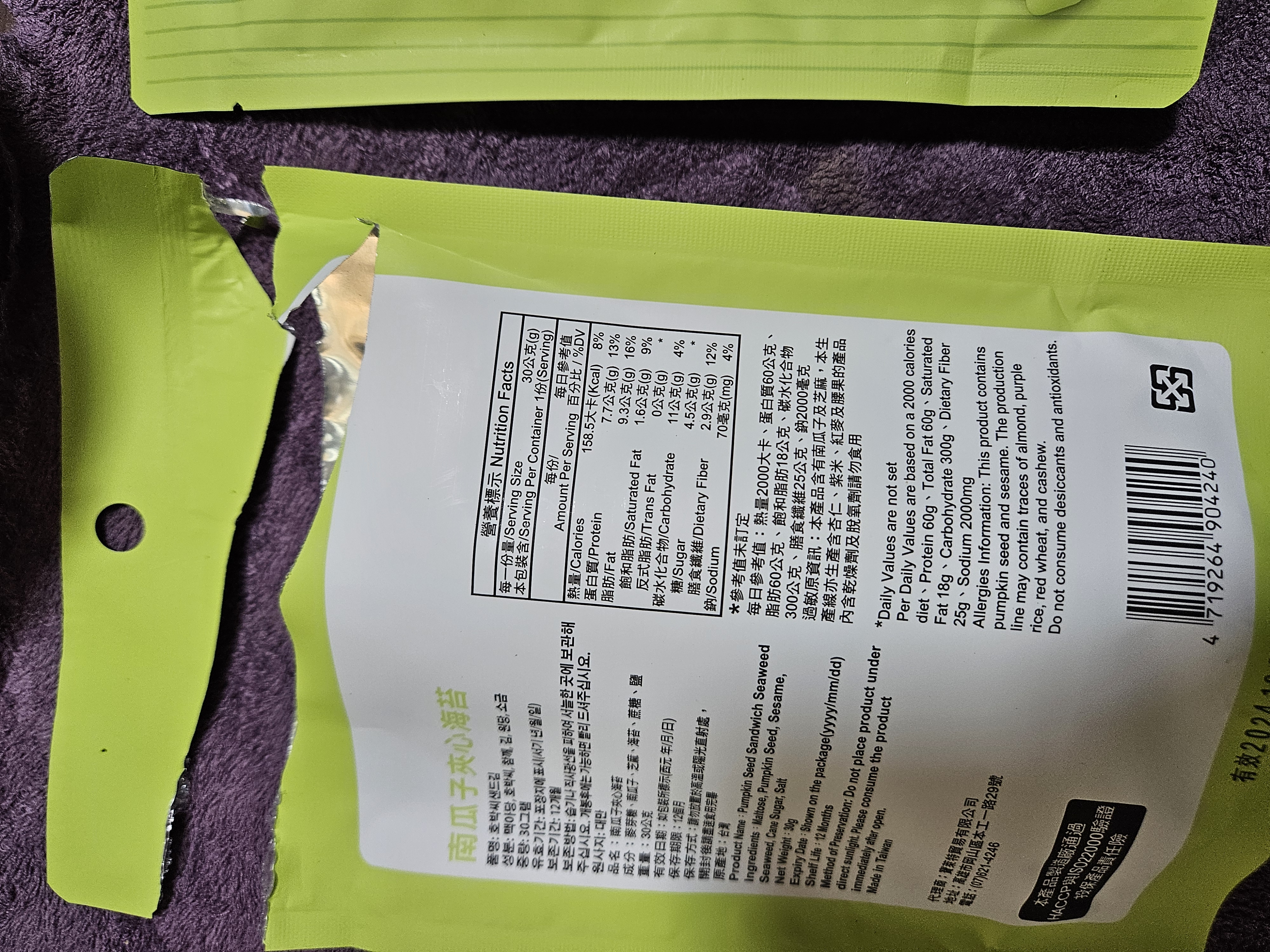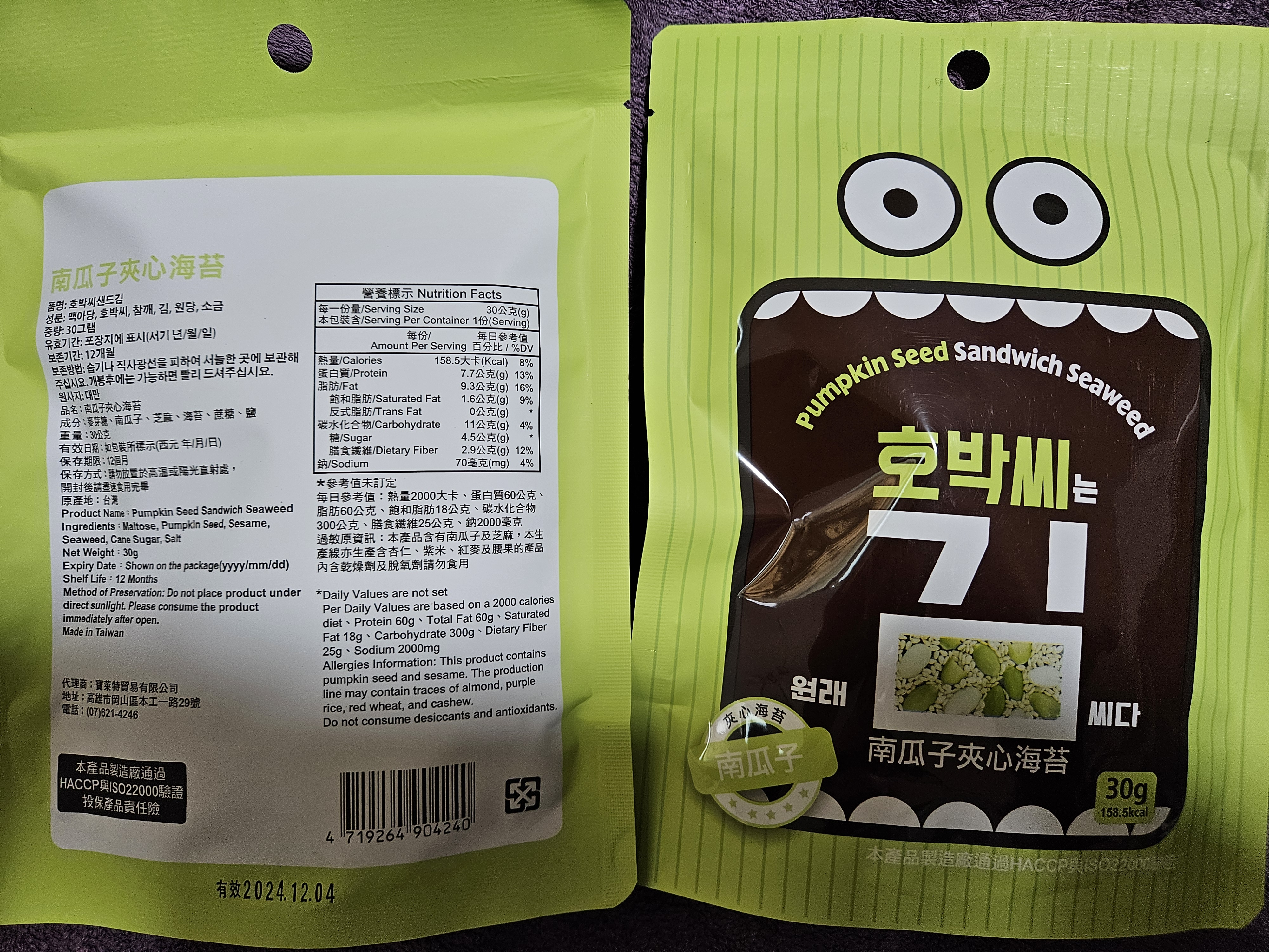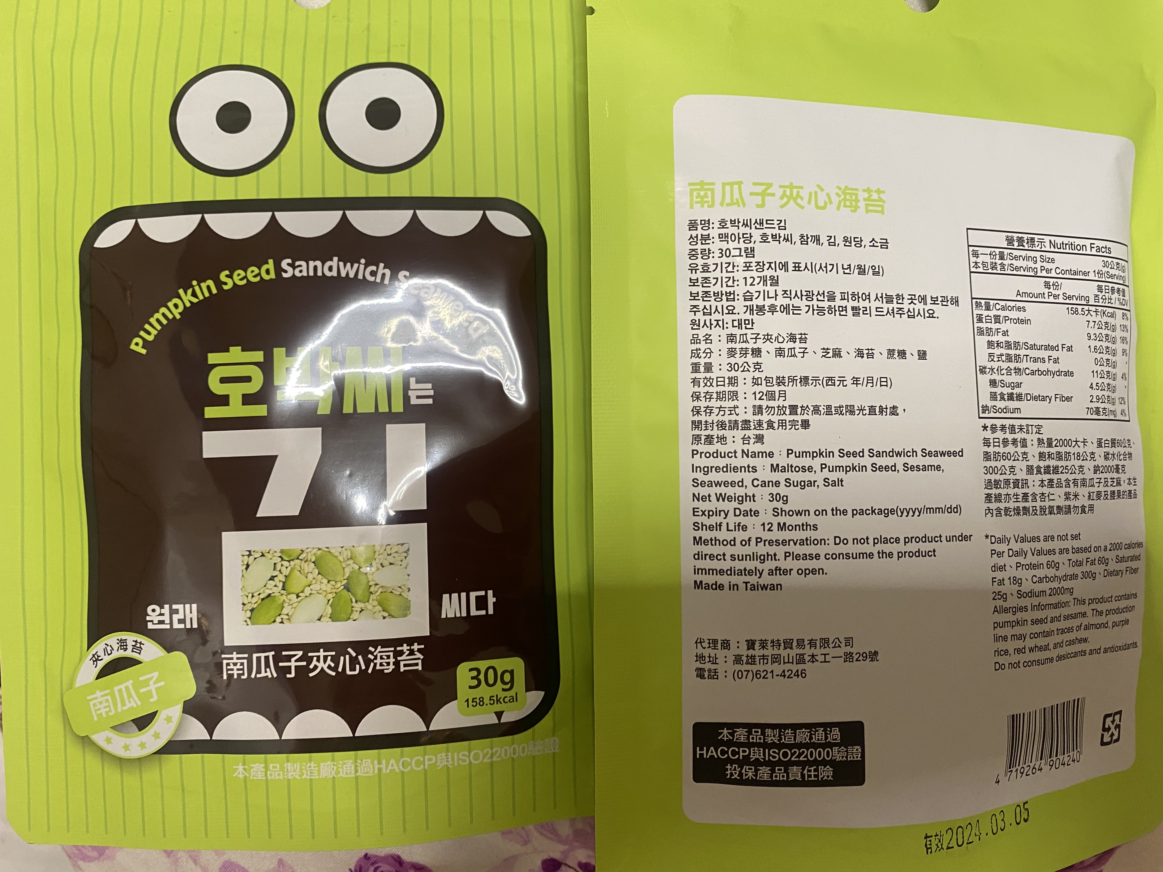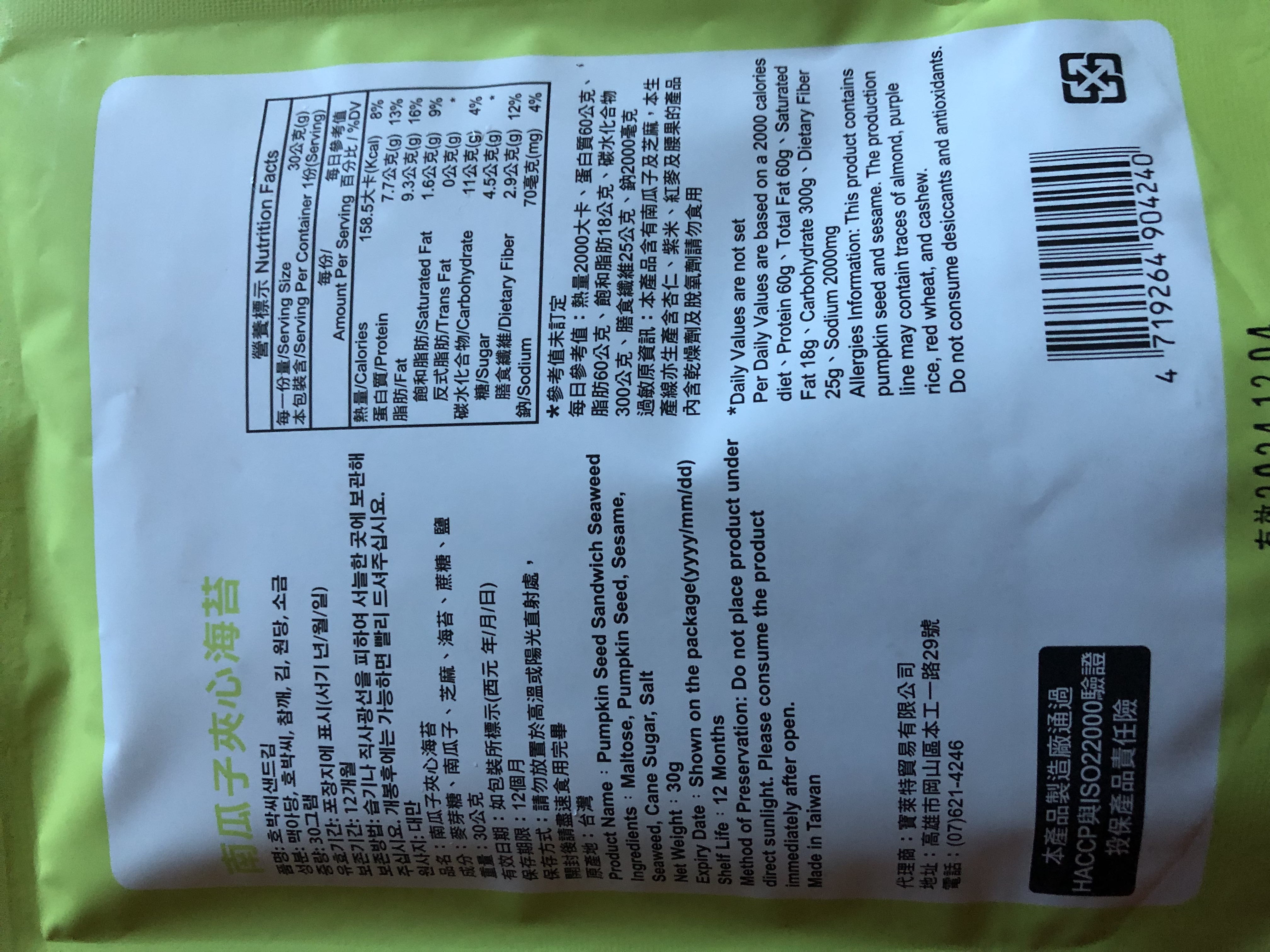 回列表 CHUN PIN 雋品 小怪獸夾心海苔(南瓜子口味)韓國超可愛小怪獸旋風來襲 王子公主請上車 市價156元 / 兩入 (免費申請) 所需等級 一般會員以上 所需學分 60 體驗份數 15 關注人數 1491 申請人數 362 申請截止 品牌業者:CHUN PIN 雋品 負責廠商 寶萊特貿易有限公司 廠商地址 高雄市岡山區本工一路29號 產地 台灣 試用產品規格 30g/盒 食品業者登錄字號 E-189365925-00001-0 投保產品責任險字號 70-109-06921780-00013-PDL 心得分享 商品介紹 商品成分 使用方法 注意事項 體驗名單 9.0 CHUN PIN 雋品 小怪獸夾心海苔(南瓜子口味) 堅果香氣 8.9 酥脆程度 9.2 南瓜子口感 8.8 包裝美學 8.8 建議推薦 8.8 心得分享 13則 李宜軒 銀食達人 24歲 彰化縣 2024/01/13 對CHUN PIN 雋品 小怪獸夾心海苔(南瓜子口味)留下評價 9 包裝上的張嘴小怪獸很吸睛且左右兩側有小缺口,不須太費力就可撕開比較可惜的是感覺做成夾鏈袋會更方便外出攜帶一打開濃郁的海苔香撲鼻而來,酥脆且不油膩每片海苔夾心內都有滿滿的南瓜子與芝麻能夠吃得健康又美味每一口都能吃出層出不窮的滋味是一款老少咸宜的零嘴,也非常適合送禮唷! 振發 金食達人 53歲 高雄市 2024/01/14 對CHUN PIN 雋品 小怪獸夾心海苔(南瓜子口味)留下評價 8 外包裝很可愛有時尚感,封口處如果有夾鏈的包裝方式更好,不會讓海苔的香氣淡掉,很脆很香,可當下午茶點心,平時的零食。是老少咸宜的營養食品,如果有其他堅果風味更好,因易氧化造成風味流失,小怪獸夾心海苔的包裝是可一次吃完的量。如果朋友聚會可能就需要大包裝的量才夠了。 Niki 鑽石達人 47歲 新北市 2024/01/14 對CHUN PIN 雋品 小怪獸夾心海苔(南瓜子口味)留下評價 9 CHUN PIN 雋品 小怪獸夾心海苔(南瓜子口味)包裝可愛吸睛,吃起來酥脆可口,一咬下去,芝麻、南瓜子和海苔的香氣一起溢散在嘴巴裡,讓人忍不住一口接一口非常涮嘴又營養滿點,大人小孩都很喜歡,好吃又健康。可以是喝酒時下酒點心;也可以是品茗的茶點;或是小孩放學的飯前點心,大推!吃完會再回購。唯一美中不足的是包裝沒能採夾鏈袋方式,沒吃完的話,保存不便易受潮。 洪鼎軒 金食達人 31歲 臺中市 2024/01/15 對CHUN PIN 雋品 小怪獸夾心海苔(南瓜子口味)留下評價 10 今日喜獲得到食力公司寄送:由寶萊特貿易有限公司所提供之品名:南瓜子夾心海苔內容量淨重:30公克成分名稱:麥芽糖,南瓜子,芝麻,海苔,蔗糖,鹽等組成。熱量:158.5大卡蛋白質:7.7公克脂肪:9.3公克碳水化合物:11公克試吃心得:濃郁的芝麻香加入南瓜子夾心海苔,在午後吃了一包,精神提振了不少,純植物性配方,味蕾更加豐富,上班族應該都非常喜歡吃,配上下午茶,絕美的組合。真幸福感,又有滿足感。市場又多了一種零食食品的選擇。香脆的海苔芝麻香,在唇舌間留香,久久不能忘懷! Harper 金食達人 43歲 臺南市 2024/01/15 對CHUN PIN 雋品 小怪獸夾心海苔(南瓜子口味)留下評價 8 感謝食力讓我有機會試吃『CHUN PIN 雋品 小怪獸夾心海苔(南瓜子口味)韓國超可愛小怪獸旋風來襲 王子公主請上車』,這口味我蠻喜歡的,可能本身喜歡南瓜子,吃起來感覺脆度夠,鹹鹹甜甜的滋味剛剛好,但如果是本身喜歡吃重口味的話可能會覺得清淡或沒味道。但對於我來說,是剛好的口味。此款夾心海苔,大小適口,是適合闔家老少咸宜的點心喔~ 王小蘋 金食達人 46歲 桃園市 2024/01/16 對CHUN PIN 雋品 小怪獸夾心海苔(南瓜子口味)留下評價 10 南瓜子夾心海苔以海苔夾心方式,經過烘烤,中間鋪上南瓜子.白芝麻.香氣十足.口感真是絕配一片一口咬下散發芝麻海苔南瓜子的層層香味.一吃就停不下來。雙重口感表現出多層次滋味,止飢、解饞不油.是健康低負擔的點心、也是輕食下午茶的必選零嘴.太好吃了.一定要來囤貨的 林哲因 金食達人 39歲 臺北市 2024/01/16 對CHUN PIN 雋品 小怪獸夾心海苔(南瓜子口味)留下評價 8 就外包裝來說十分可愛吸引人,沒有過多空氣鼓起的包裝在購買攜帶也比較方便。拆開包裝將海苔倒出來時,有發現這次試吃的產品沒有其他海苔那麼油,且十分酥脆的感覺。吃起來也的確是,很輕盈,沒有負擔,沒有過多的鹹味,但甜味也很適中,夾在其中的芝麻很香,口感很棒,但可惜南瓜籽的存在感較低,不管是香氣或是口感都沒有芝麻那麼明顯,是唯一可惜的地方。 劉貴鈴 金食達人 45歲 新北市 2024/01/17 對CHUN PIN 雋品 小怪獸夾心海苔(南瓜子口味)留下評價 9 很高興能夠參與試吃「CHUN PIN 雋品 小怪獸夾心海苔(南瓜子口味) 」它的成份很單純,只有「麥芽糖、南瓜子、芝麻、海苔、蔗糖、鹽」,大人小孩都可以很放心的食用。是很好的點心、下午茶的首選,嘴饞也適合;由於沒有添加油,吃起來很清爽,無負擔,海苔丶南瓜子丶白芝麻三者之間不會相互衝突,反而更帶出各自的香氣,讓人一口接一口停不下來,難怪包裝不是那種夾鏈袋的,因為真的一不小心就會把整包給嗑完了~呵 蔡定芳 金食達人 38歲 彰化縣 2024/01/17 對CHUN PIN 雋品 小怪獸夾心海苔(南瓜子口味)留下評價 9 我真的很喜歡這個海苔南瓜子,首先他的成分表列出來,每一個都是我看得懂的..(麥芽糖、南瓜子、芝麻、海苔、蔗糖、鹽)味道部分,鹹香的海苔與淡雅甜密的南瓜子,結合了芝麻的香氣,美味滿分。口感不用說,就像現烘烤的,海苔酥酥脆脆,南瓜子的鋪疊讓口感更紮實豐富,卡滋卡滋的體驗是口感派不能錯過的小點心,一包打
