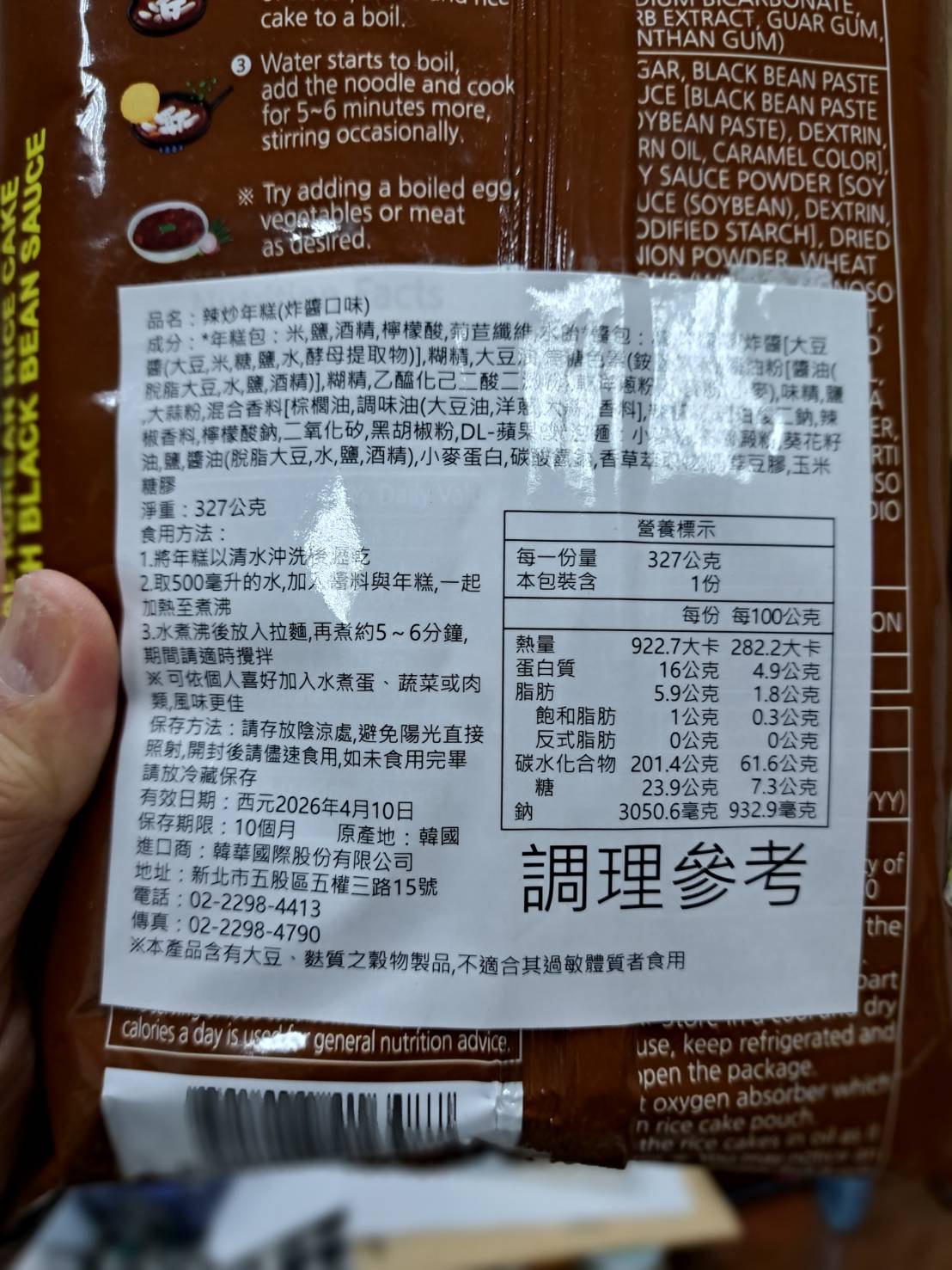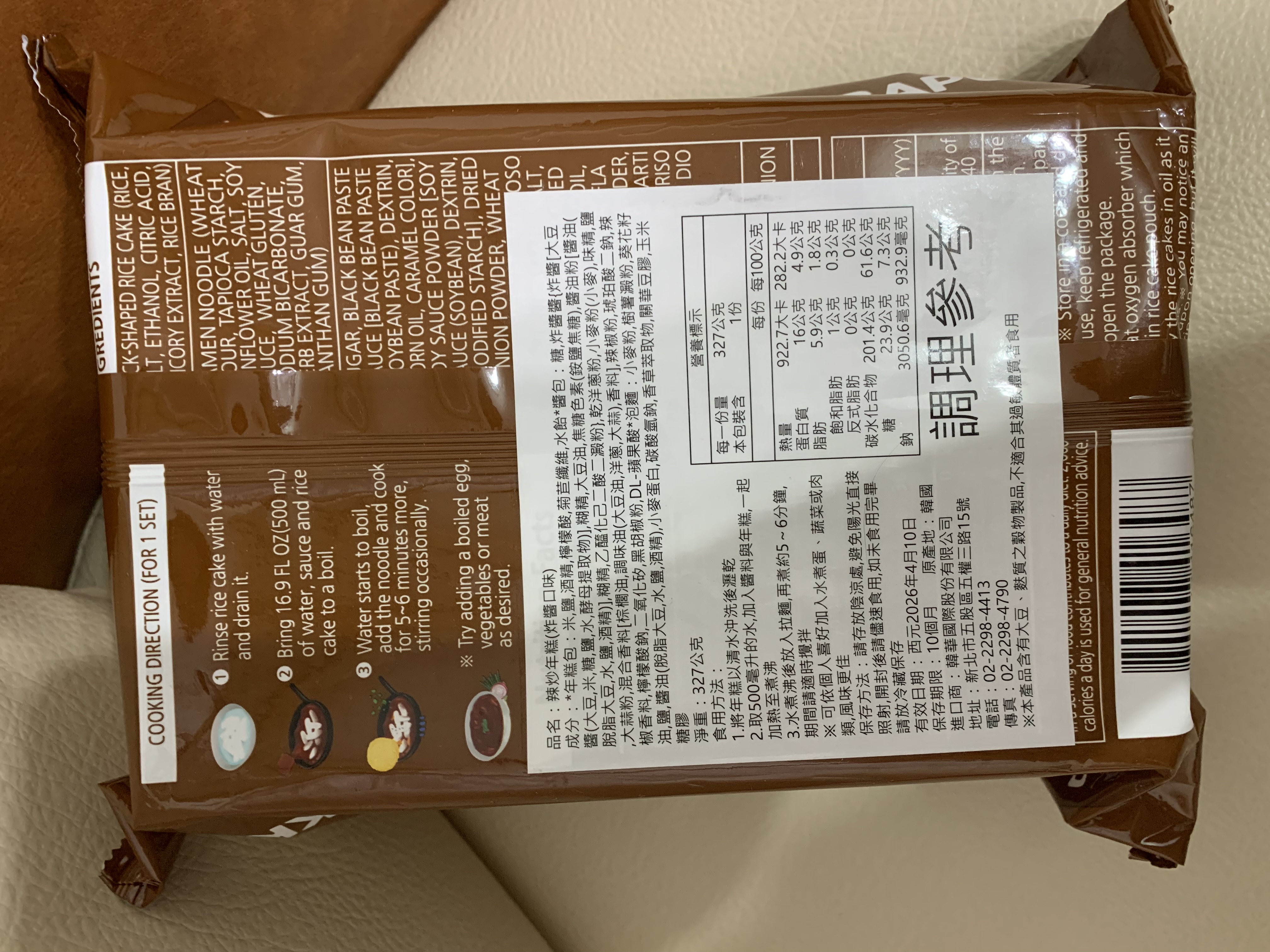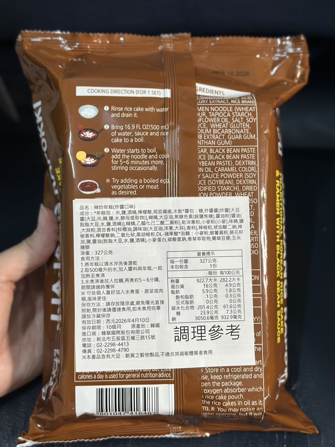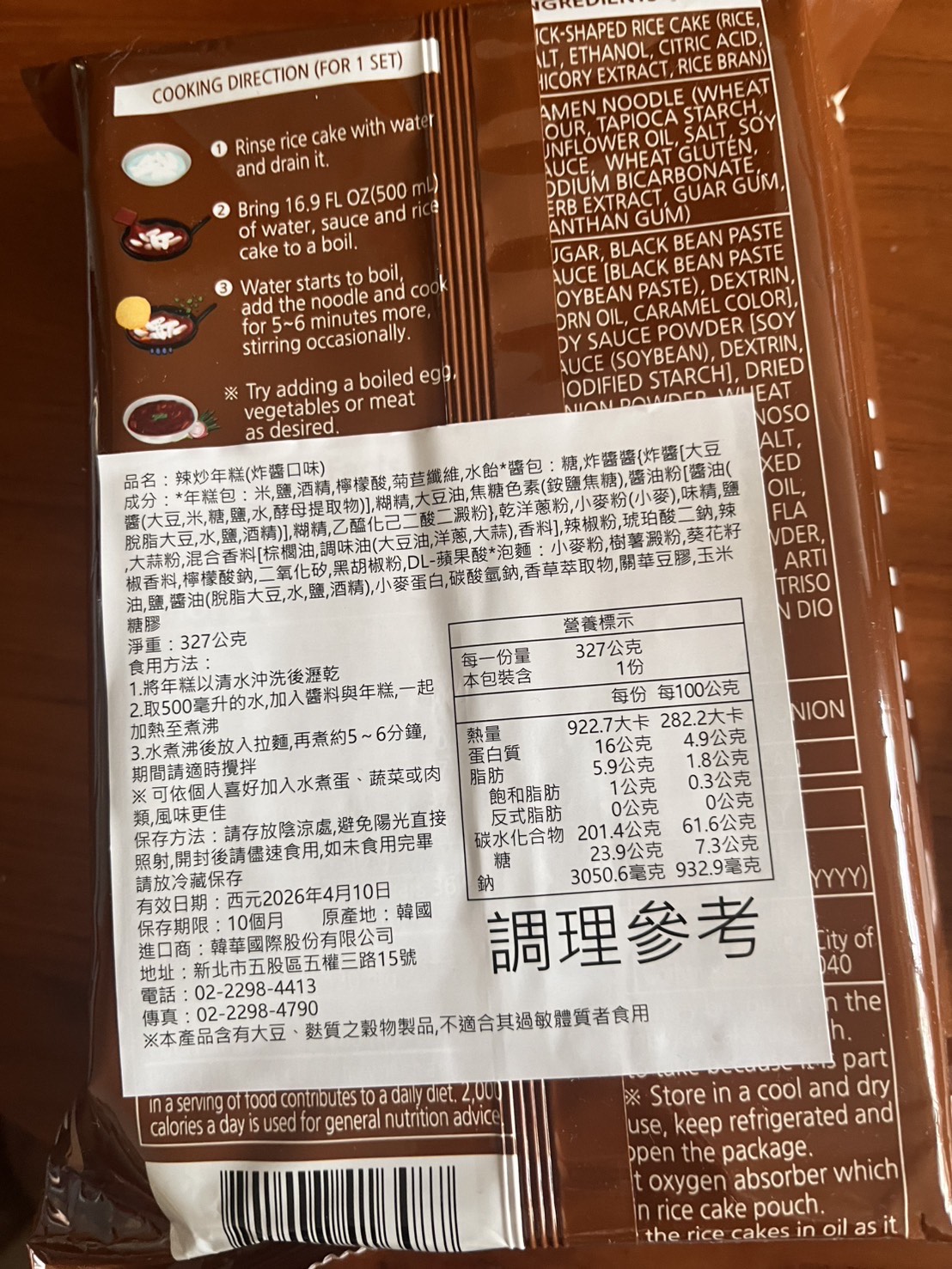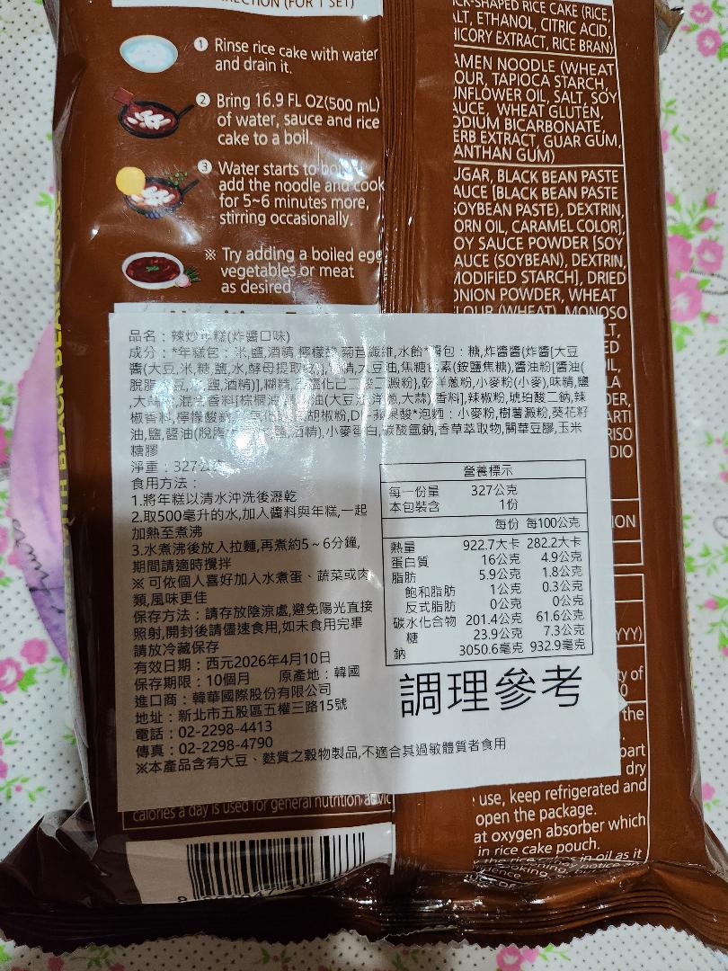 ●年糕:米、食鹽、酒精、檸檬酸 ●調味粉包:炸醬粉{小麥粉、春醬粉[春醬(大豆、小麥粉、焦糖色素、酒精)、焦糖色素、糊精]、白糖、食鹽、春醬粉[春醬1(大豆、小麥粉、焦糖色素、酒精)、糊精、玉米澱粉、食鹽、春醬2(大豆、小麥粉、焦糖色素、酒精)]、洋蔥調味粉(洋蔥、食鹽、砂糖)、馬鈴薯澱粉、混合食用油(軟質棕櫚油、硬質棕櫚油)、混合製品(樹薯澱粉、白糖、糊精)、焦糖色素、洋蔥粉、米粉(米)、醬油粉(大豆