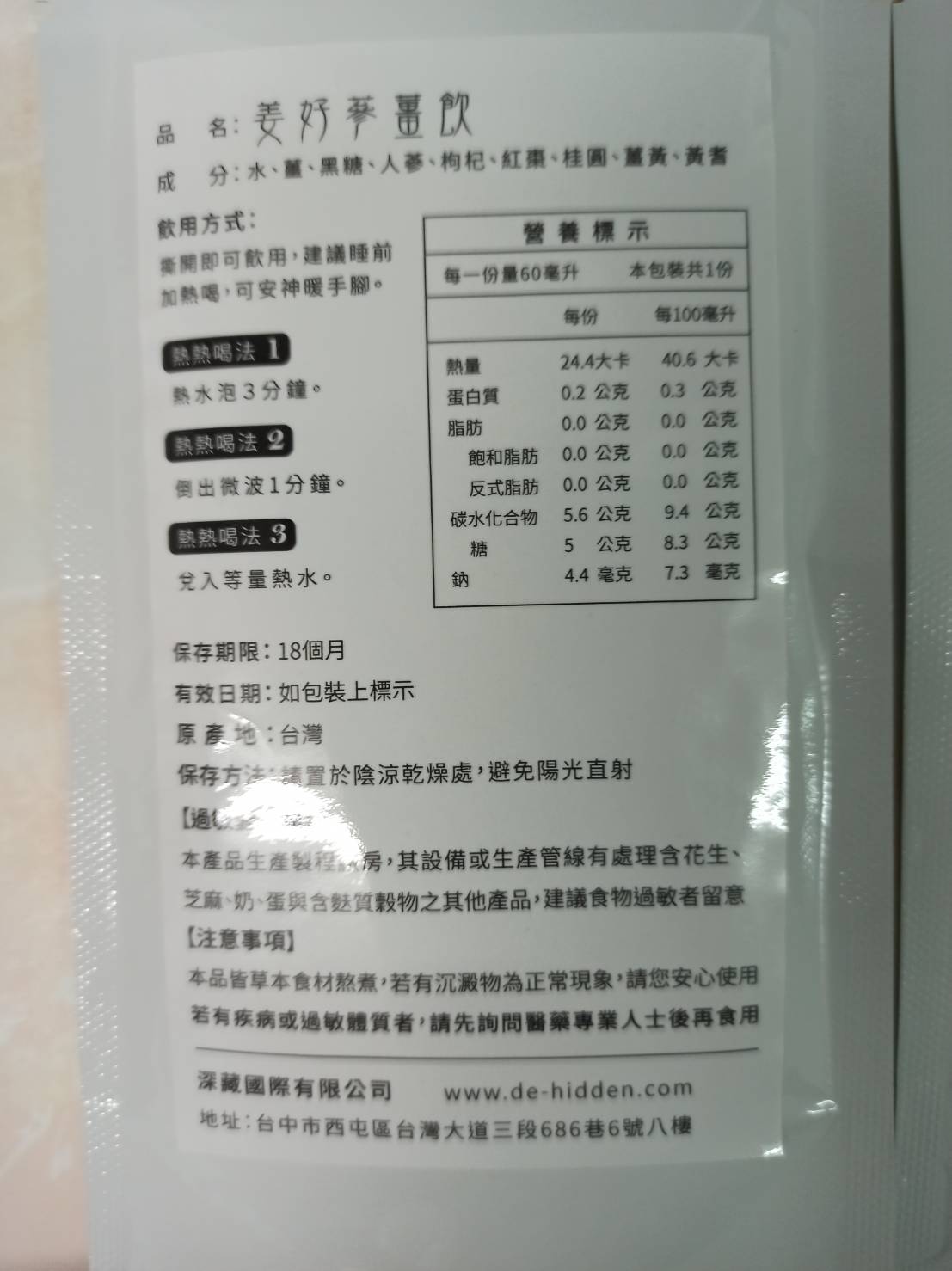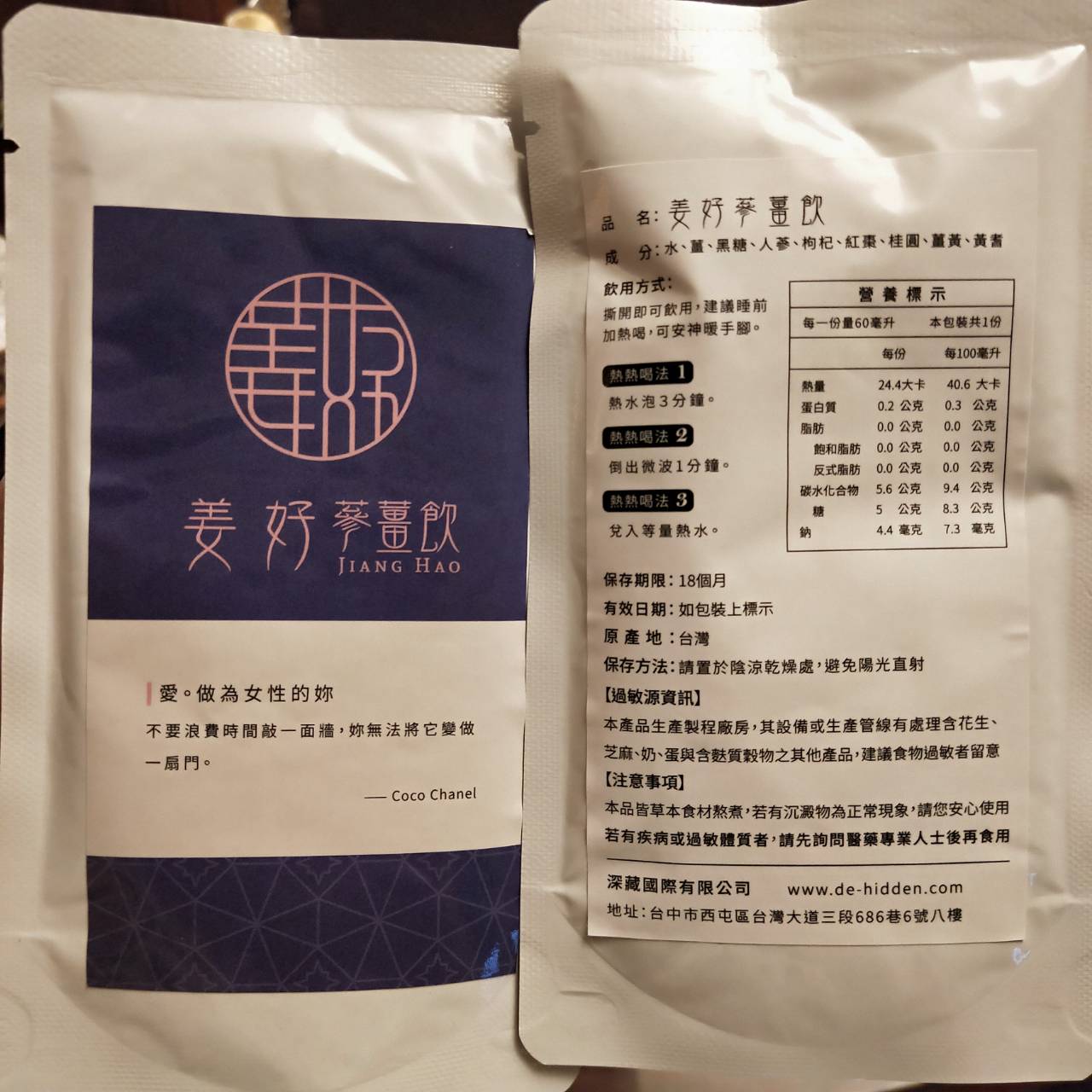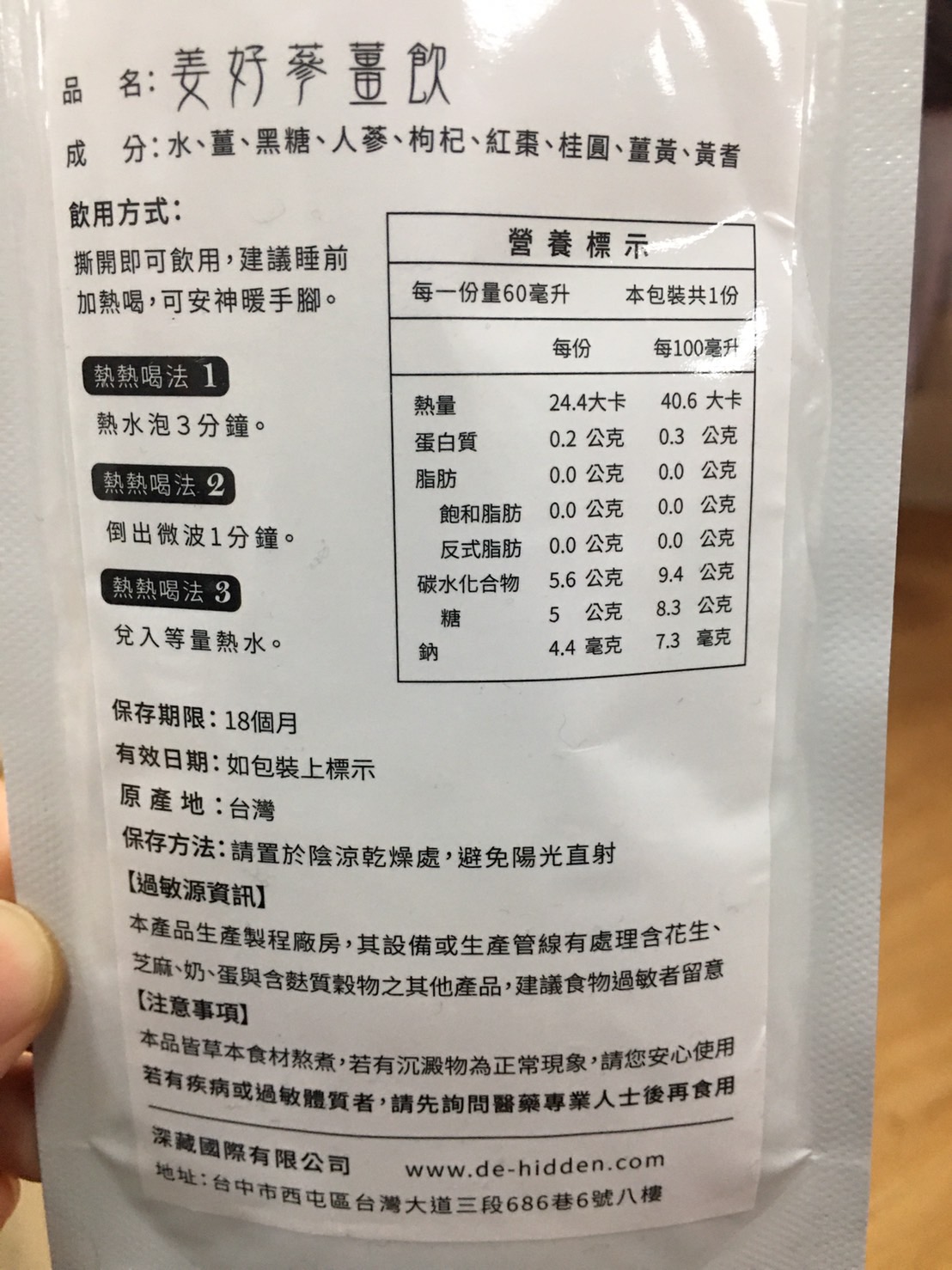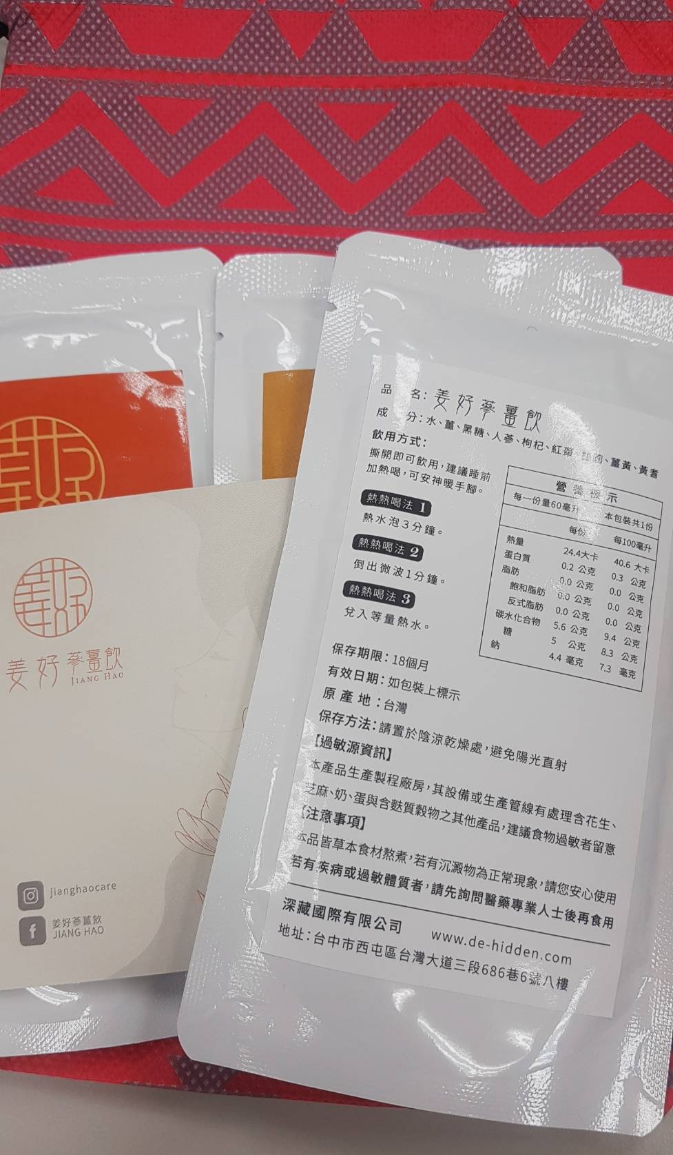 回列表 姜好 蔘薑飲 補氣暖身給妳薑姜好的溫補 180元/包,共三包,共540元 所需等級 一般會員以上 所需學分 20 體驗份數 50 關注人數 1093 申請人數 281 申請截止 品牌業者:深藏國際有限公司 負責廠商 深藏國際有限公司 廠商地址 台中市西屯區台灣大道三段686巷6號8樓 產地 台灣 試用產品規格 每包60ml,共3包 食品業者登錄字號 B-191087053-00000-2 心得分享 商品介紹 商品成分 使用方法 注意事項 體驗名單 8.6 姜好 蔘薑飲 我需要漢方五行的溫補 8.7 飲用便利 9.3 原料天然 9.2 攜帶方便 9.3 建議推薦 8.6 心得分享 50則 黃秀雯 鑽石達人 50歲 新北市 2022/04/14 對姜好 蔘薑飲留下評價 10 收到姜好 蔘薑飲 時,真的很高興,因為心中一直想要試喝,所以收到時有無限的驚喜,拿回來後,迫不及待的打開包裝,裏面是用一個精美的包裝布織布袋裝著,真的是好漂亮又精緻,讓人很驚艷不已的說,蔘薑飲包也是很文青又好看,真的讓人很捨不得打開來試喝的說,不管是送人或自用都是很體面的。剛好說這幾天天氣又要變冷,所以收到蔘薑飲包最合試,可以感受到暖心又暖身的說,打開有一陣濃濃的薑味撲鼻而來,聞起來很香,尤如自家熬的薑湯一樣,很香很濃,如果是喜歡薑味的人會很喜歡,但是如果是排斥薑味的人就要考慮一下了,喝下口時,有薑的辣味和人蔘的香氣,還有紅棗枸杞的味道,入喉有種暖潤的口感,讓人身體暖和起來,謝謝廠商和食力提供試飲。 李海萍 鑽石達人 61歲 新北市 2022/04/15 對姜好 蔘薑飲留下評價 9 姜好 蔘薑飲 補氣暖身給妳薑姜好的溫補最近世界很不平靜,身心都大受影響,女性要學習好好照顧自己。由中醫師專為現代女性研發,來自漢方的五行調和智慧,嚴選東方補氣聖品「人蔘」,搭配讓人發熱的「薑」,給女生需要的滋補,與身體共好。嘿~ 超級luck 收到立馬滋補去 ~*Q* ~■試飲實測&推薦理由大解密◎即開即飲的方式試喝~打開包裝袋聞得到淡淡的薑香,不是強列刺鼻的薑味;聞不到蔘味、也無可怕的中藥味。喝起來的味道是薑味多些,薑味較蔘味重~沒有薑的辛辣味,蔘屬後味,帶點苦。顏色接近咖啡色、裡頭沒有什麼雜質,蠻清澈的,只有喝到最後才有少許渾濁沉澱。雖然有加入黑糖,但味道不甜,滿順口的。◆包裝袋上清礎標示成分/飲用方式/保存期限/有效日期/產地等......都在包裝袋上~包裝簡約、精緻高雅!◆採用100%天然中藥材,無添加其它物質~讓人好安心◆原料皆通過SGS食品標準檢測~棒 !◆成分看得懂~六年根以上高麗蔘、薑、黑糖、枸杞、紅棗、桂圓、薑黃、黃耆 ◆輕巧密封包裝,方便攜帶◆即開即飲,隨時想就能輕鬆喝!◆蔘與薑,打造屬於女性的漢方調養補品◆薑富含薑辣素,可推動身體的循環,讓末梢循環變好。女人終其一生都要關愛自己,由內而外地健康美麗,如花般盛開。女性滋補不再是苦澀難懂,而是平易近人,值得推薦!~~~棒 ! 棒 ! 讚啦 ! 廖利珈 金食達人 28歲 臺中市 2022/04/15 對姜好 蔘薑飲留下評價 9 入口溫順不苦澀,有別於一般養生飲,此款姜好蔘薑飲不僅好入口,而且調理包的包裝只需浸泡於熱水中數分鐘即可飲用,大大省去了在家自行熬煮的麻煩,且此款養生飲不會過於的甜膩,濃稠度剛好絲滑,若覺得過濃也可添加部分熱水做調配,相當不錯 陳諭萱 鑽石達人 27歲 臺南市 2022/04/16 對姜好 蔘薑飲留下評價 9 自己在經期的時候總是沒元氣,手腳冰冷、臉色也不太好,這次試了中醫特別為現代女性調製的蔘薑飲,希望由內開始調整體質,達到養神、養顏、補氣的功效,讓身體暖和。對於想改善經期痛苦感覺的我實在覺得很有幫助,飲用這款姜好蔘薑飲活出更好的自己! 夏鳳寶 鑽石達人 62歲 臺南市 2022/04/16 對姜好 蔘薑飲留下評價 10 姜好篸薑飲是由人篸,黃耆,枸杞,紅棗,薑黃等中藥,加上桂圓,黑糖調製而成的飲品,喝起來微甜,微苦,很好入喉!它承襲百年來中藥漢方精華,由內而外滋養精氣神,如果每天都能喝一包,長期下來保健身體,對我們女性尤其重要!而且它隨身包很輕便,隨開隨喝很方便!每包上面還有名人語錄,很富巧思! 張杏英 鑽石達人 70歲 彰化縣 2022/04/16 對姜好 蔘薑飲留下評價 10 薑茶一直是女性朋友不可缺的補氣養神的飲品,這次姜好蔘薑飮,專為現代女性困擾所研發,市面上唯一走漢方五行調和飲品,採用100%天然中藥材(人蔘,薑,枸杞,桂圓,黃耆,黑糖,薑黃,紅棗)溫補食療配方,讓我們從體內調理氣血,去寒溫暖,手腳身體不濕冷,拿到試吃驗品,這兩天剛好冷氣團報到,晚上熱熱的喝,身體暖暖的,又安神一夜好眠,而貼心的方便包裝,一包剛剛好,(做為女性朋友照顧好自己,將來會更好),好貼心的標語,讓我們一起讓生活「姜姜好」。 Jerry 金食達人 56歲 嘉義市 2022/04/16 對姜好 蔘薑飲留下評價 8 這款「姜好 蔘薑飲」的外觀設計個人是還蠻喜歡的,內容物都是中藥材,開封聞味道算是溫和不刺激的,我的喝法是兌等量的水去嘗試,喝起來是很清淡的沒有很重的中藥味。整體感覺有比較重的薑味,其他的中藥材就感覺喝不太出來,雖然如此,還是有一點像再喝中藥湯。單包設計是蠻適合上班族的,但看DM單包的價錢不斐,那這樣單包的容量似乎有點小貴,如果要推薦給上班族的話,可能要調整一下價錢,這是個人的淺見。 葉惠裕 金食達人 41歲 臺北市 2022/04/17 對姜好 蔘薑飲留下評價 7 1.一撕開包裝,倒在杯子裡時,就聞到薑味了,倒是沒聞到人蔘味。我是有再加熱水喝(有