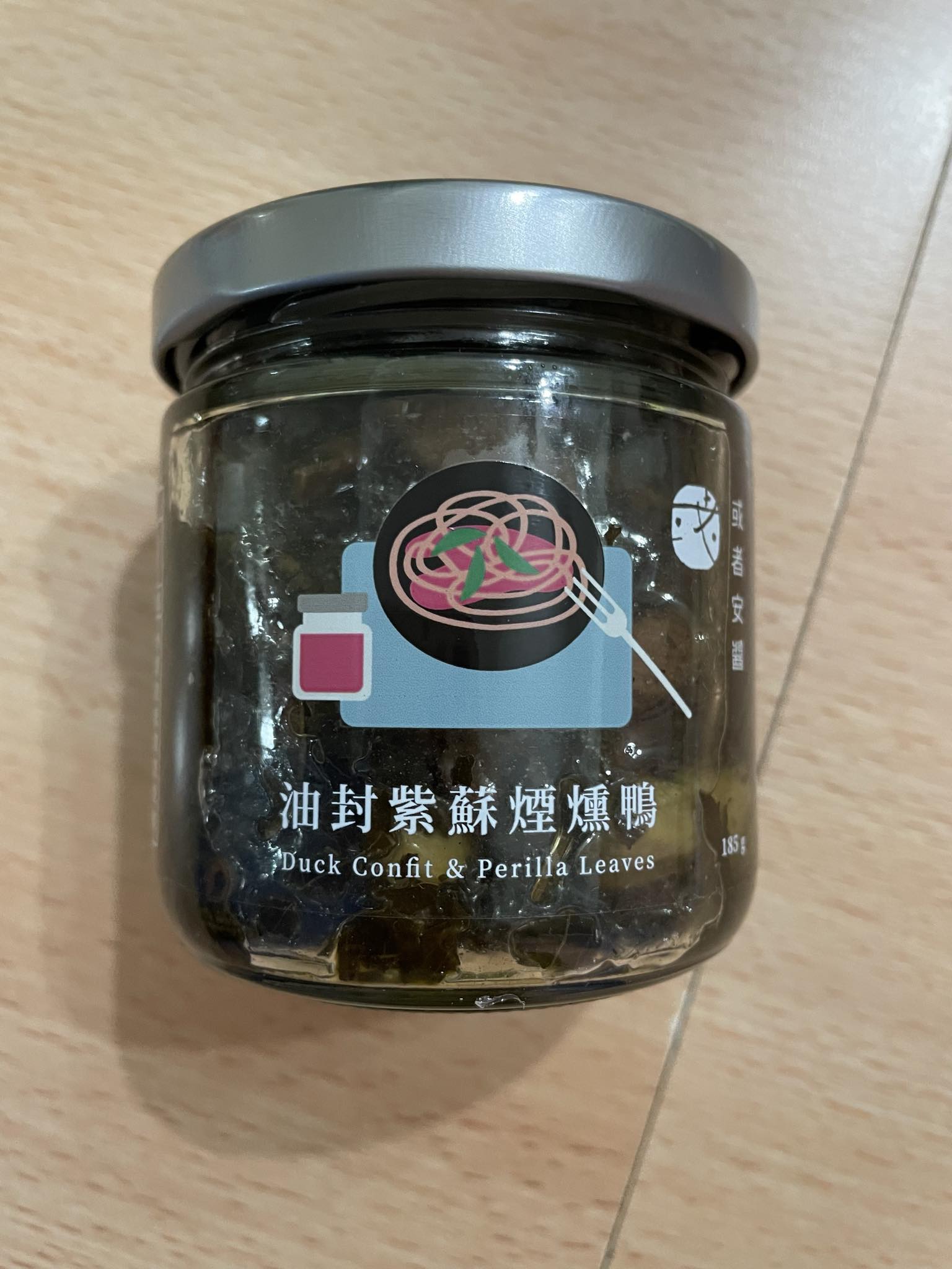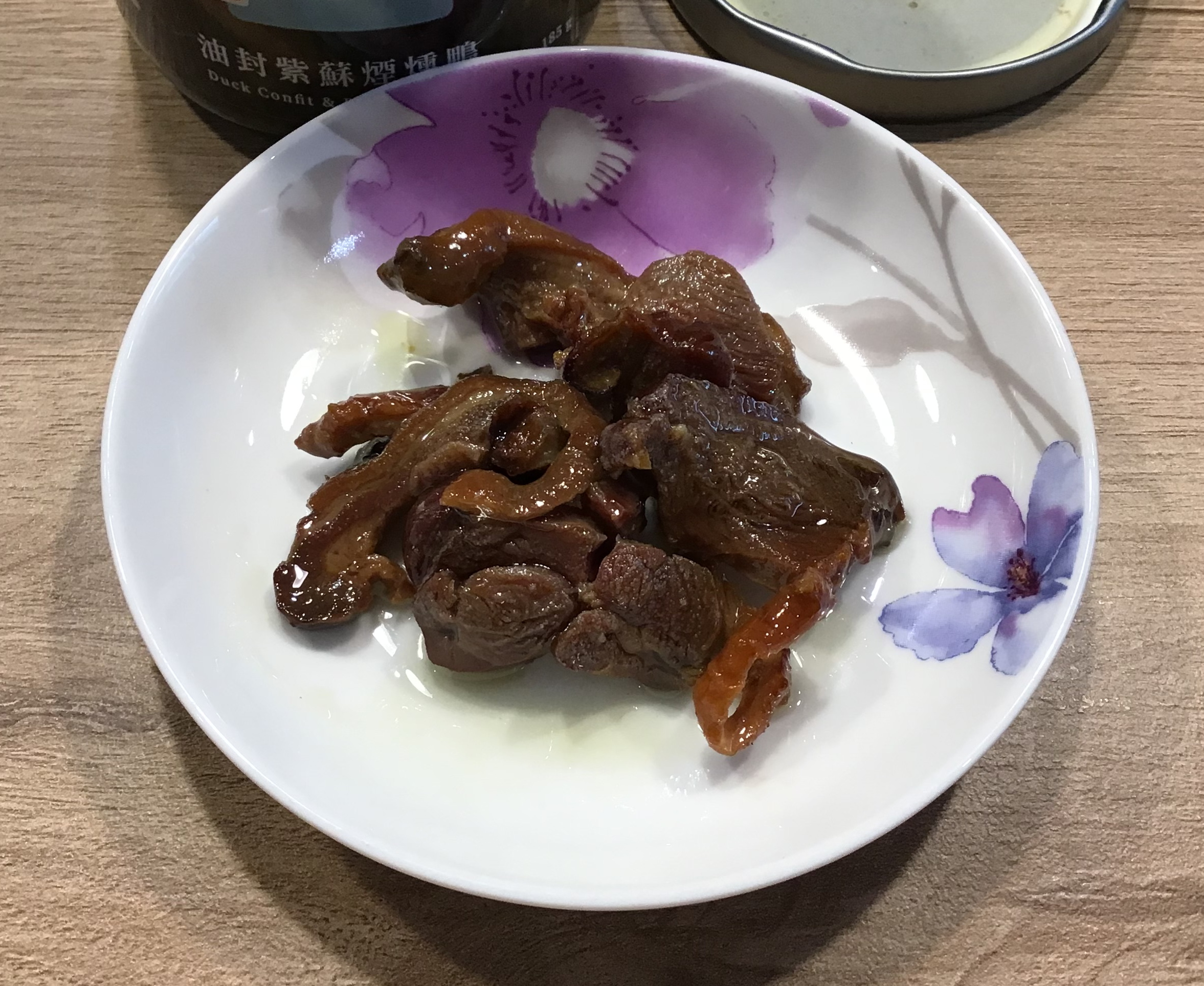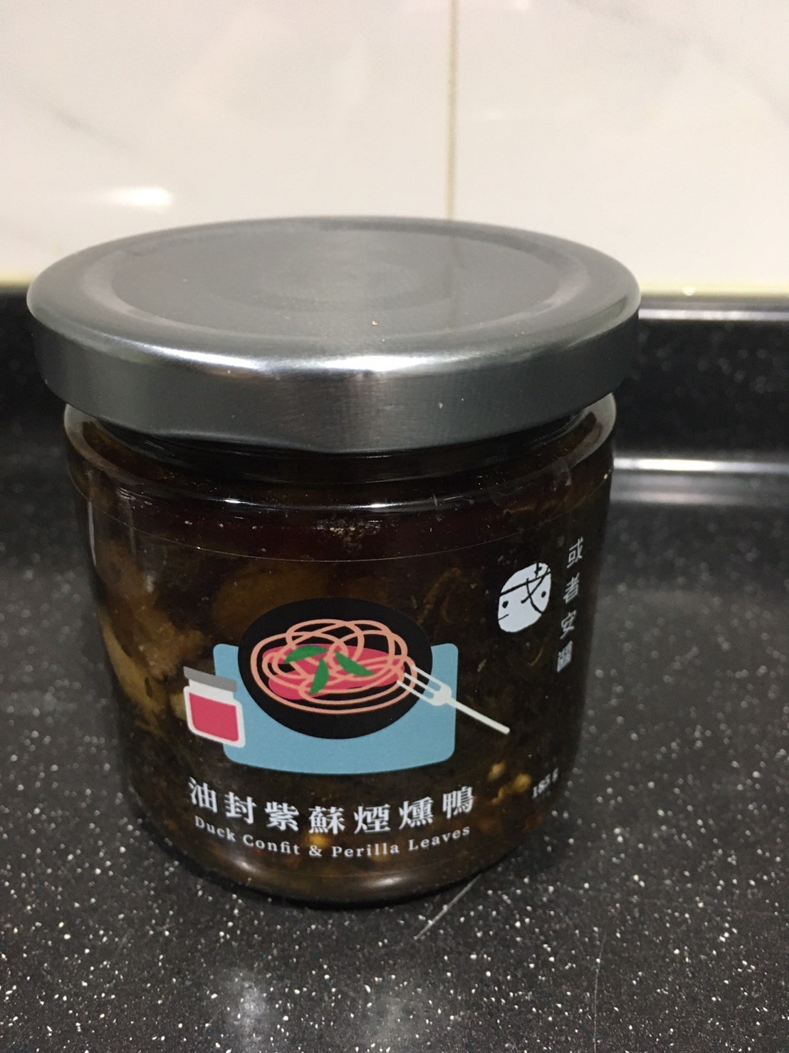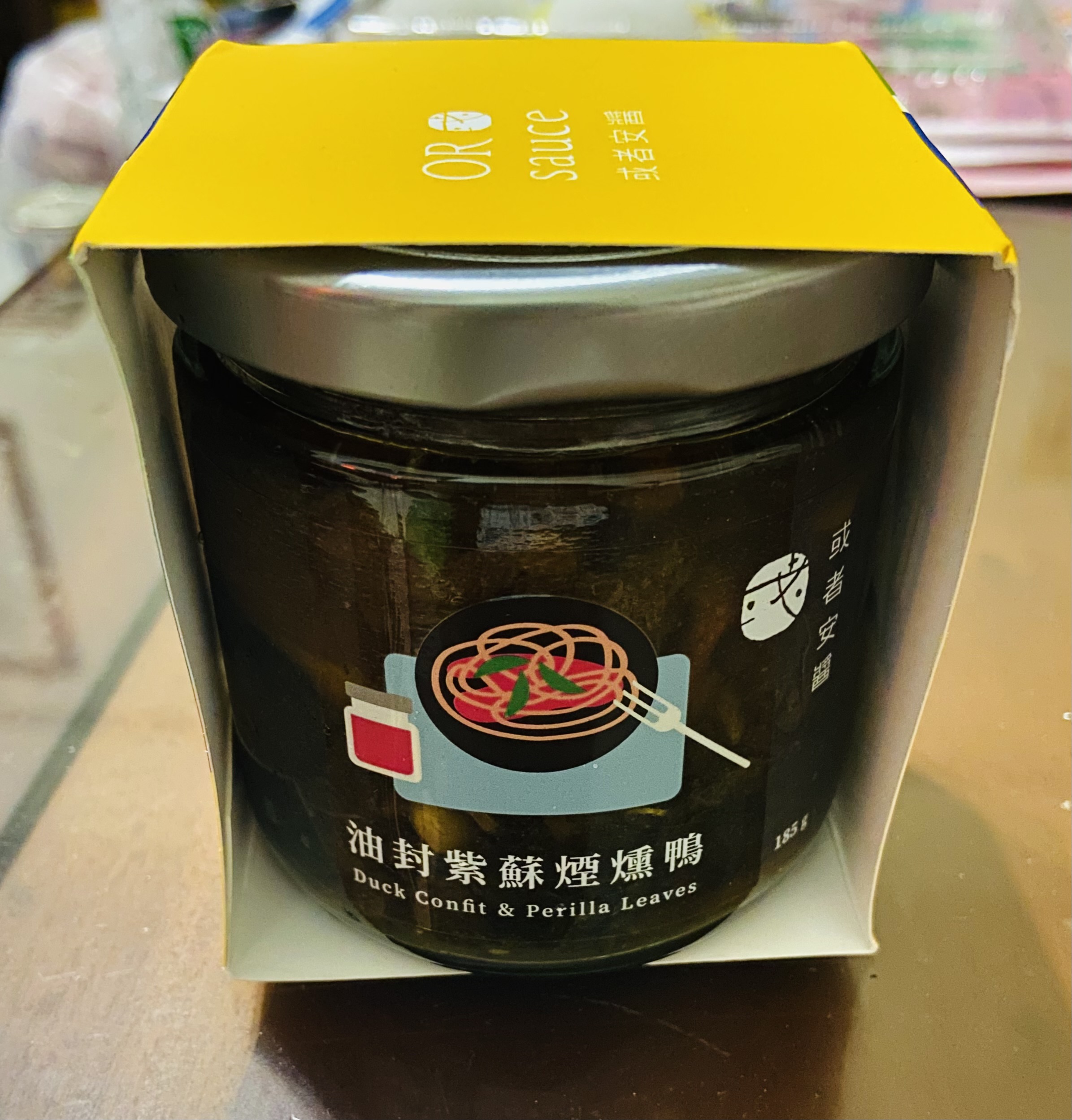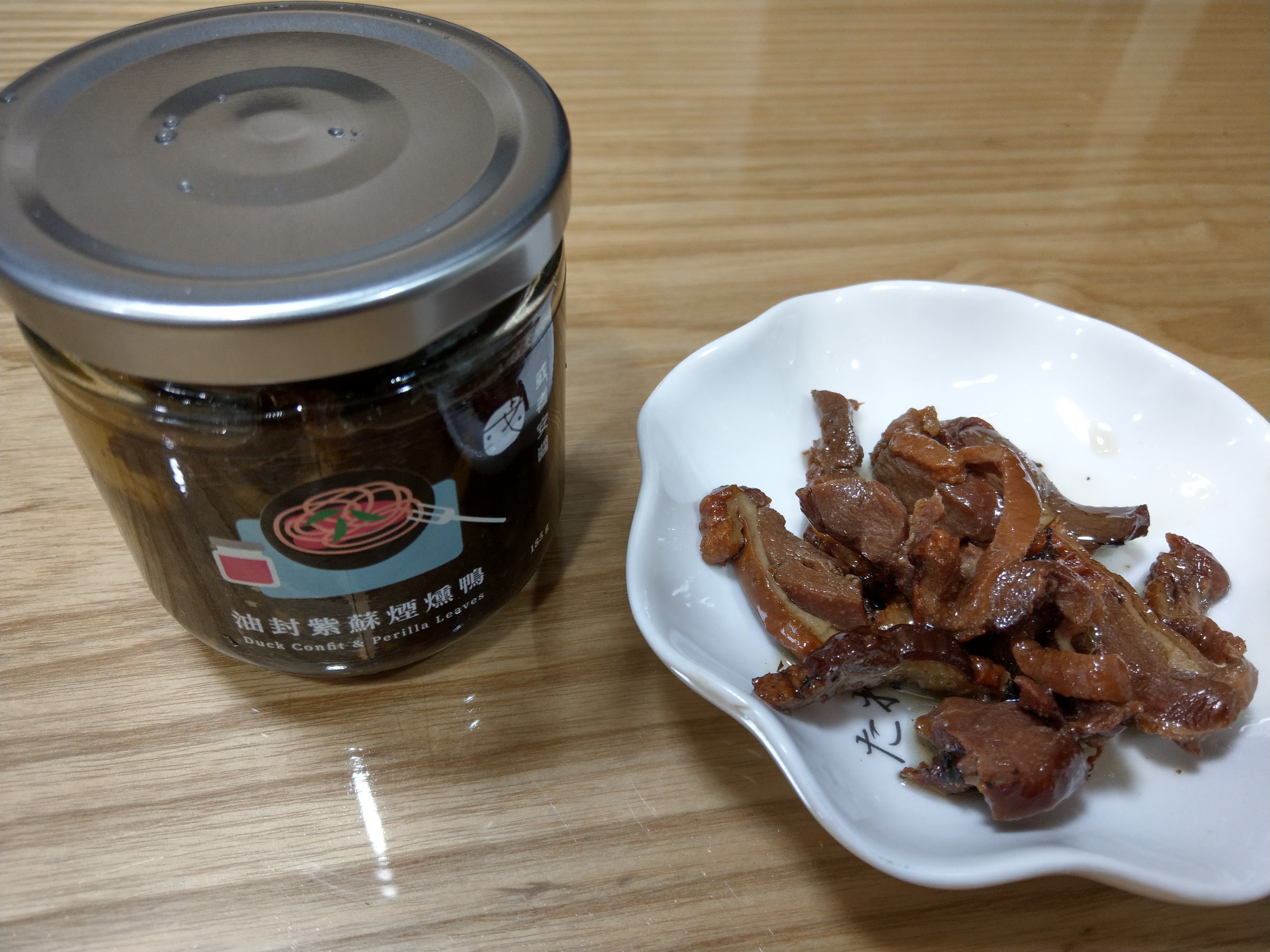 煙燻鴨腿[鴨肉、食鹽、糖、白胡椒、多磷酸鈉、L-麩酸鈉、異抗壞血酸鈉(抗氧化劑)、亞硝酸鈉]、芥花油、蒜頭、紫蘇、昆布調味粉[食鹽、調味劑(L-麩酸鈉、5’-次黃嘌呤核苷磷酸二鈉、5’-鳥嘌呤核苷磷酸二鈉、琥珀酸二鈉)、葡萄糖、昆布粉、昆布萃取物]、醬油粉[純釀造醬油、麥芽糊精、食鹽、砂糖、琥珀酸二鈉、I+G(5’-次黃嘌呤核苷磷酸二鈉、5’-鳥嘌呤核苷磷酸二鈉)]、白胡椒、海鹽、胡荽子、青花椒