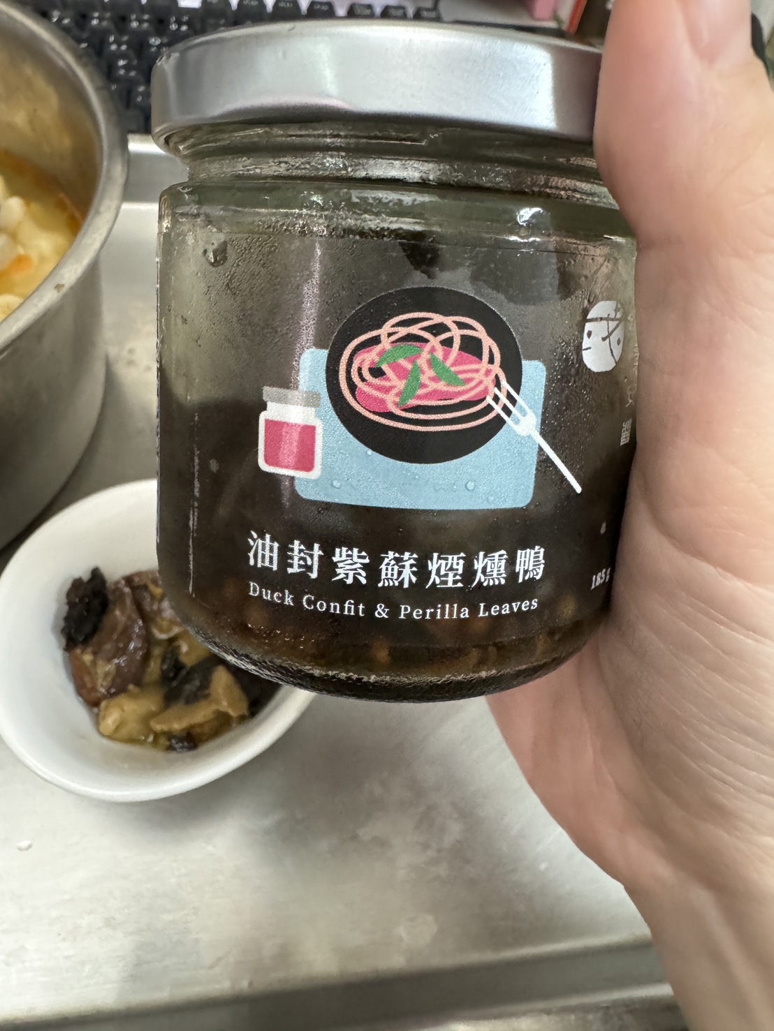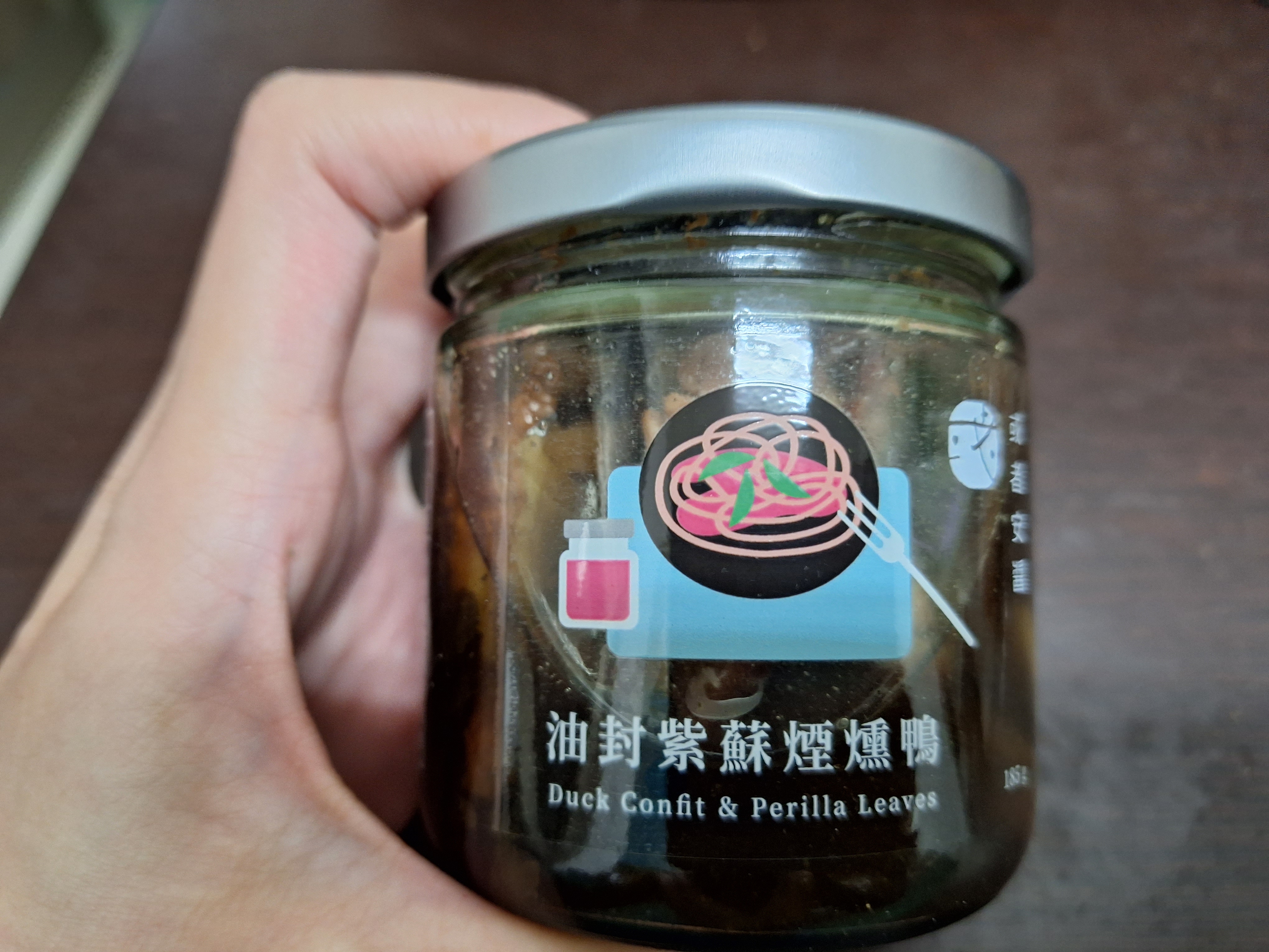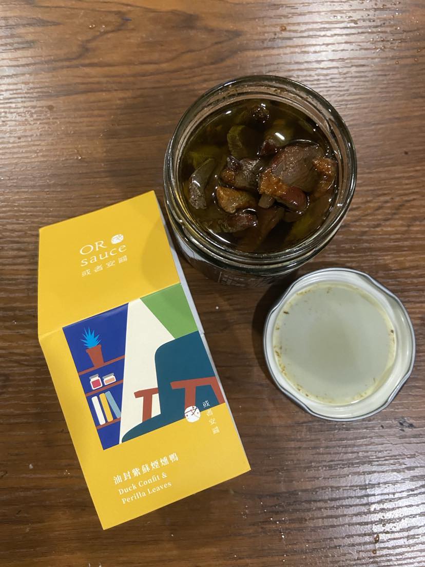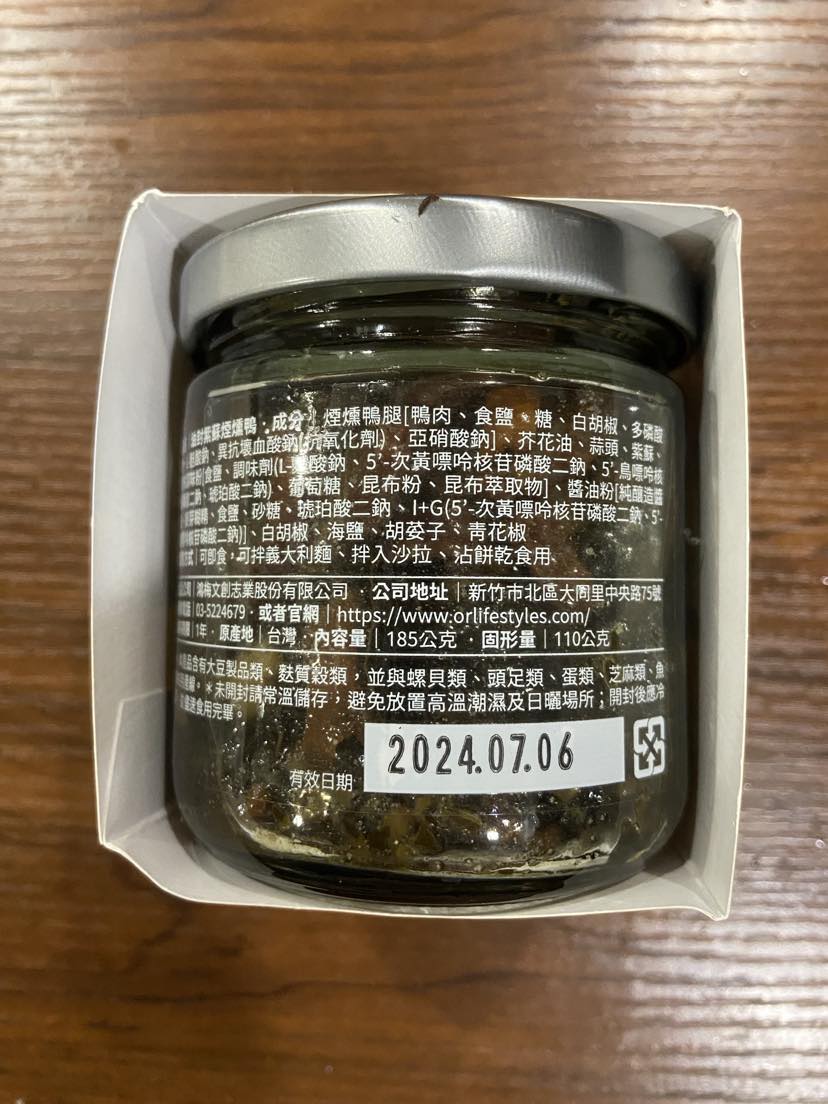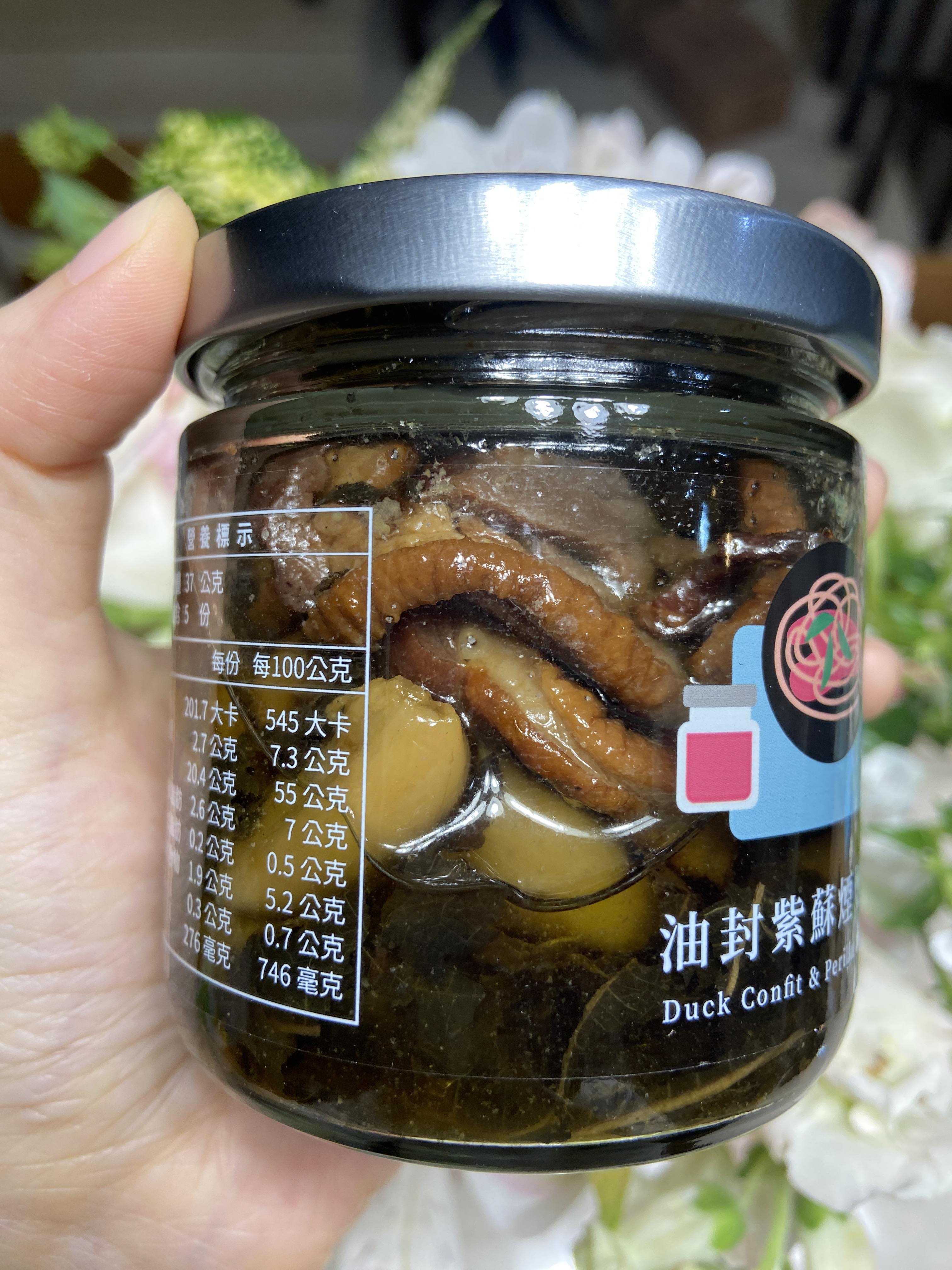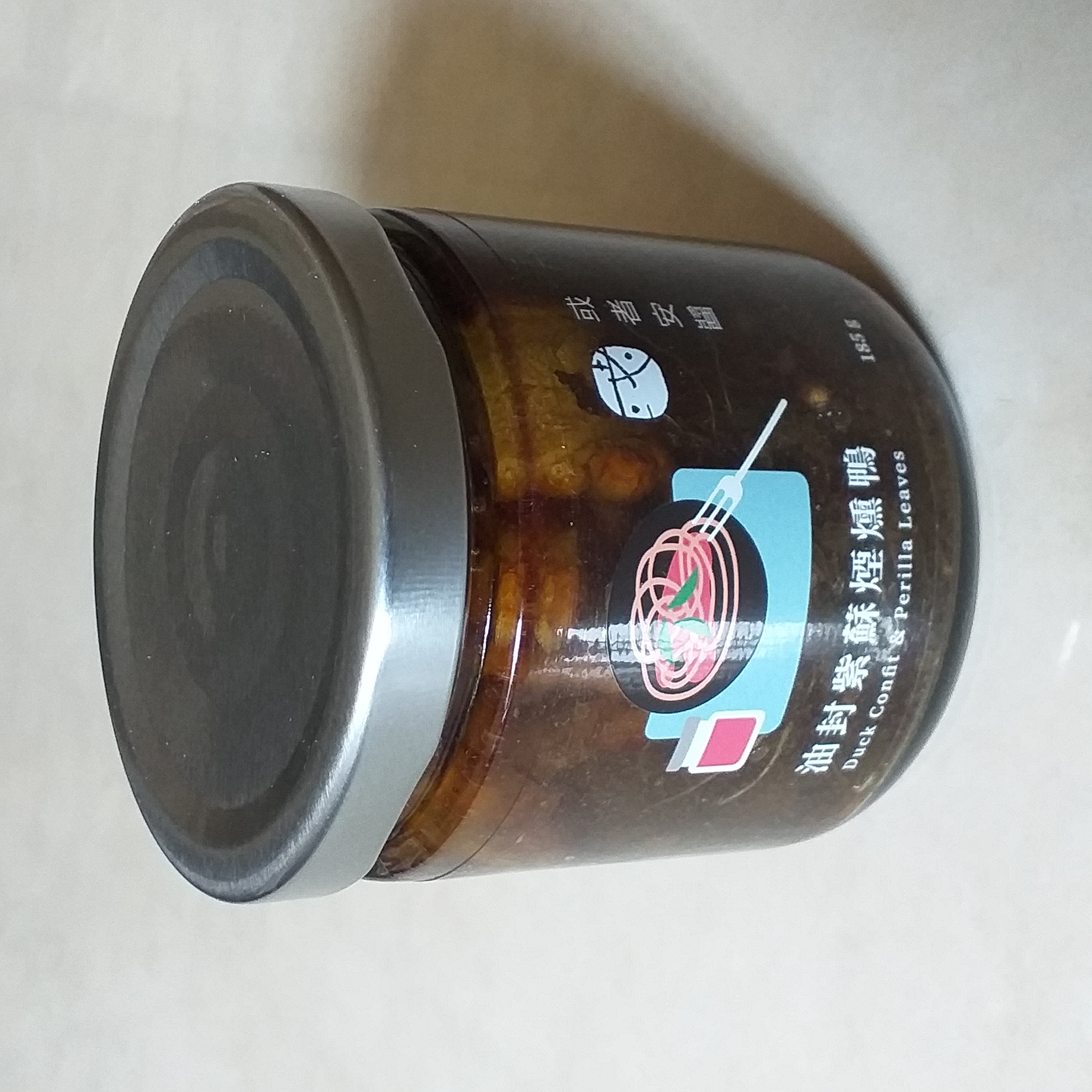 煙燻鴨腿[鴨肉、食鹽、糖、白胡椒、多磷酸鈉、L-麩酸鈉、異抗壞血酸鈉(抗氧化劑)、亞硝酸鈉]、芥花油、蒜頭、紫蘇、昆布調味粉[食鹽、調味劑(L-麩酸鈉、5’-次黃嘌呤核苷磷酸二鈉、5’-鳥嘌呤核苷磷酸二鈉、琥珀酸二鈉)、葡萄糖、昆布粉、昆布萃取物]、醬油粉[純釀造醬油、麥芽糊精、食鹽、砂糖、琥珀酸二鈉、I+G(5’-次黃嘌呤核苷磷酸二鈉、5’-鳥嘌呤核苷磷酸二鈉)]、白胡椒、海鹽、胡荽子、青花椒