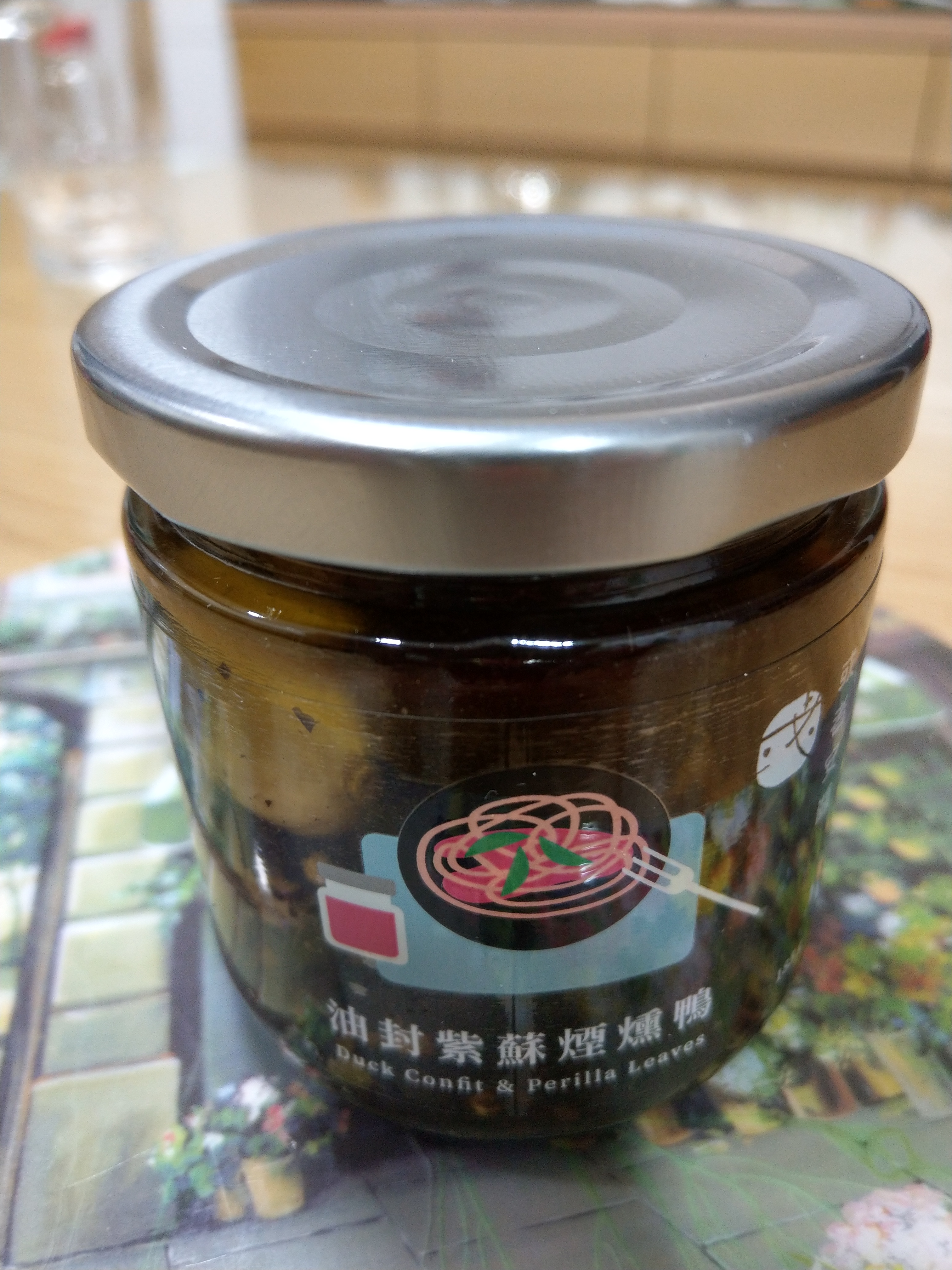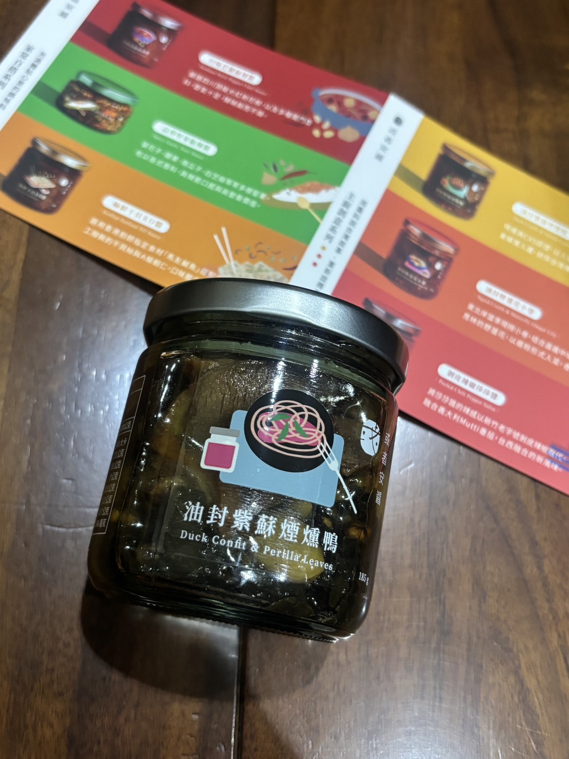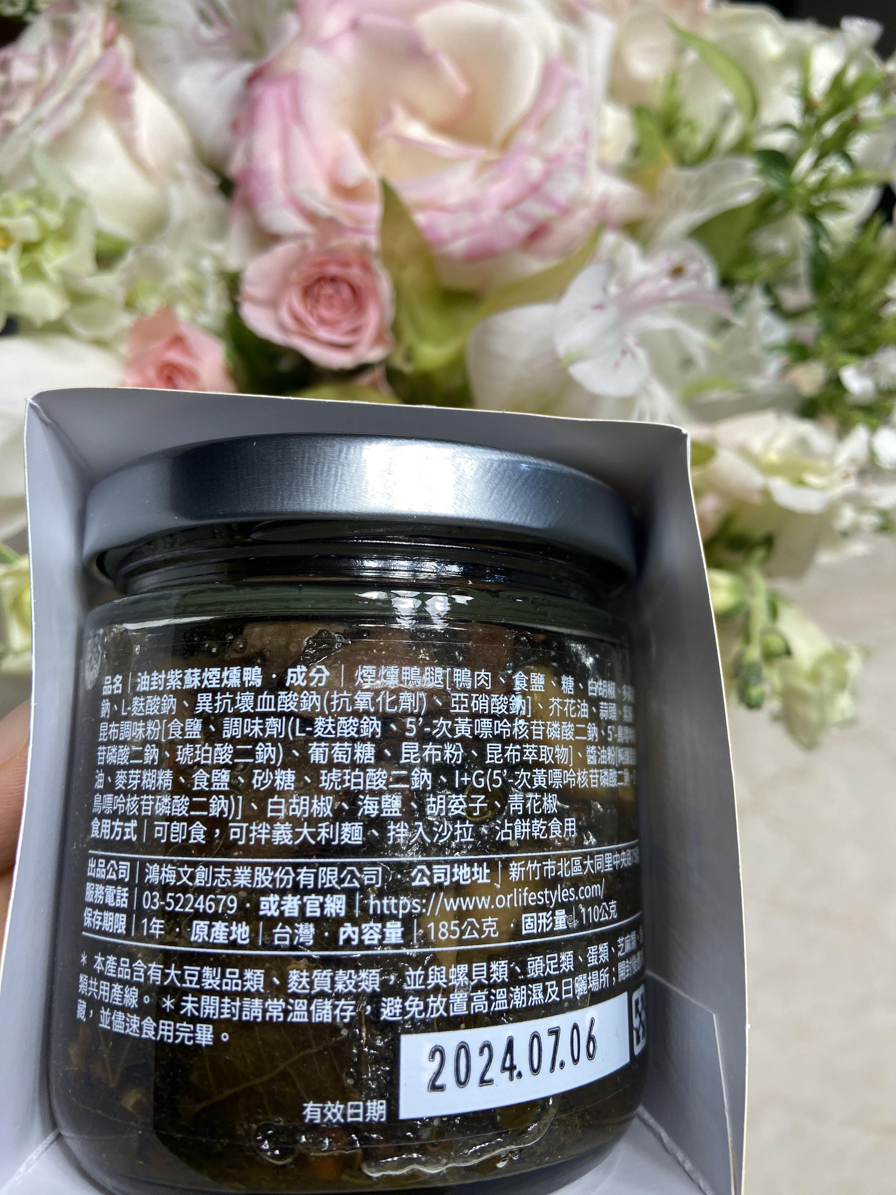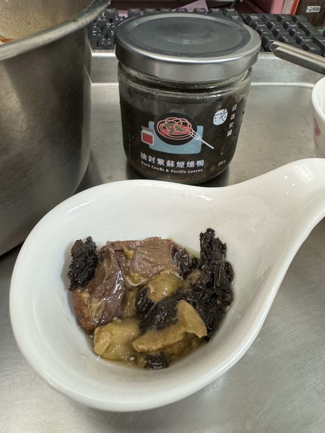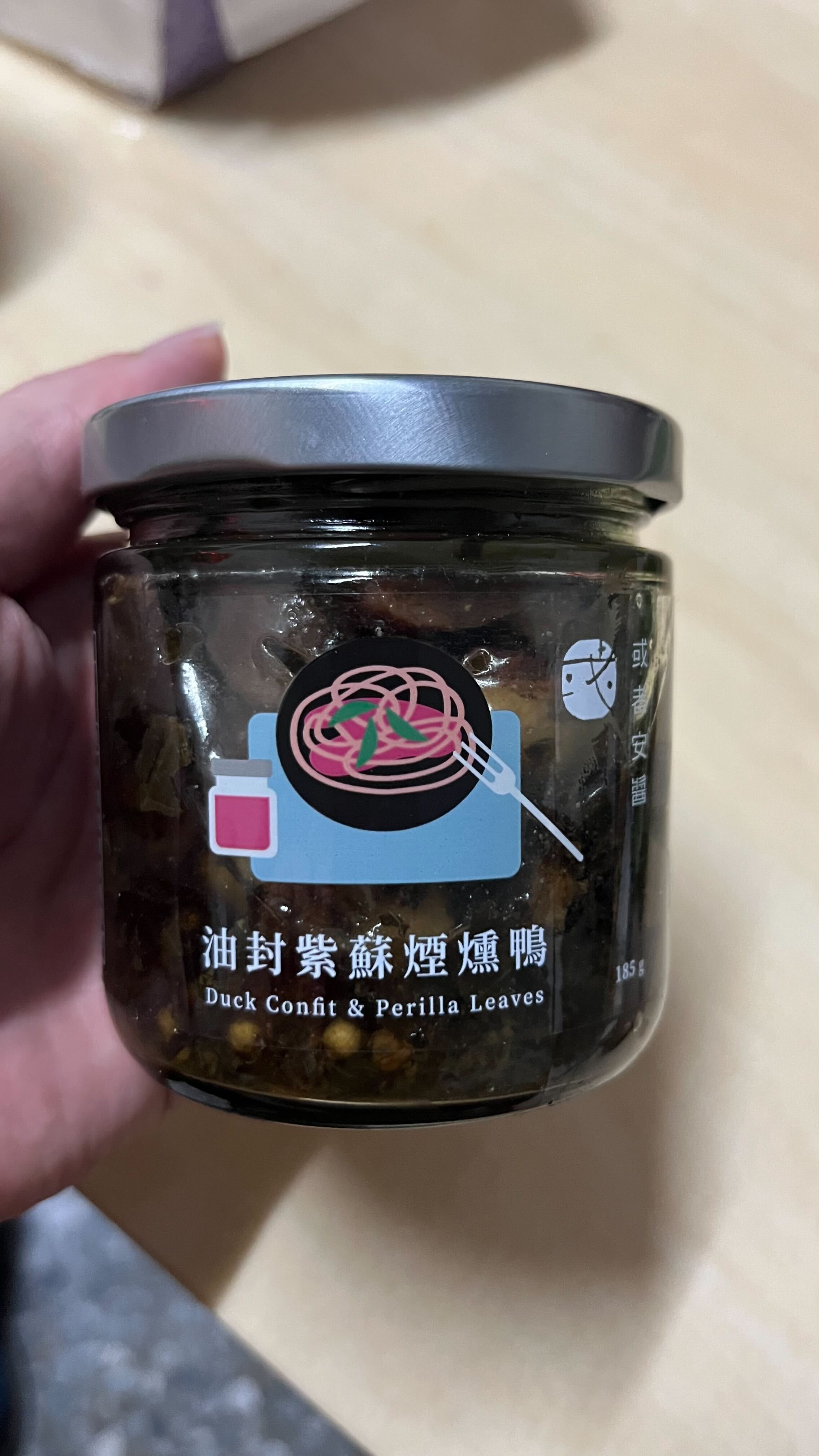煙燻鴨腿[鴨肉、食鹽、糖、白胡椒、多磷酸鈉、L-麩酸鈉、異抗壞血酸鈉(抗氧化劑)、亞硝酸鈉]、芥花油、蒜頭、紫蘇、昆布調味粉[食鹽、調味劑(L-麩酸鈉、5’-次黃嘌呤核苷磷酸二鈉、5’-鳥嘌呤核苷磷酸二鈉、琥珀酸二鈉)、葡萄糖、昆布粉、昆布萃取物]、醬油粉[純釀造醬油、麥芽糊精、食鹽、砂糖、琥珀酸二鈉、I+G(5’-次黃嘌呤核苷磷酸二鈉、5’-鳥嘌呤核苷磷酸二鈉)]、白胡椒、海鹽、胡荽子、青花椒
