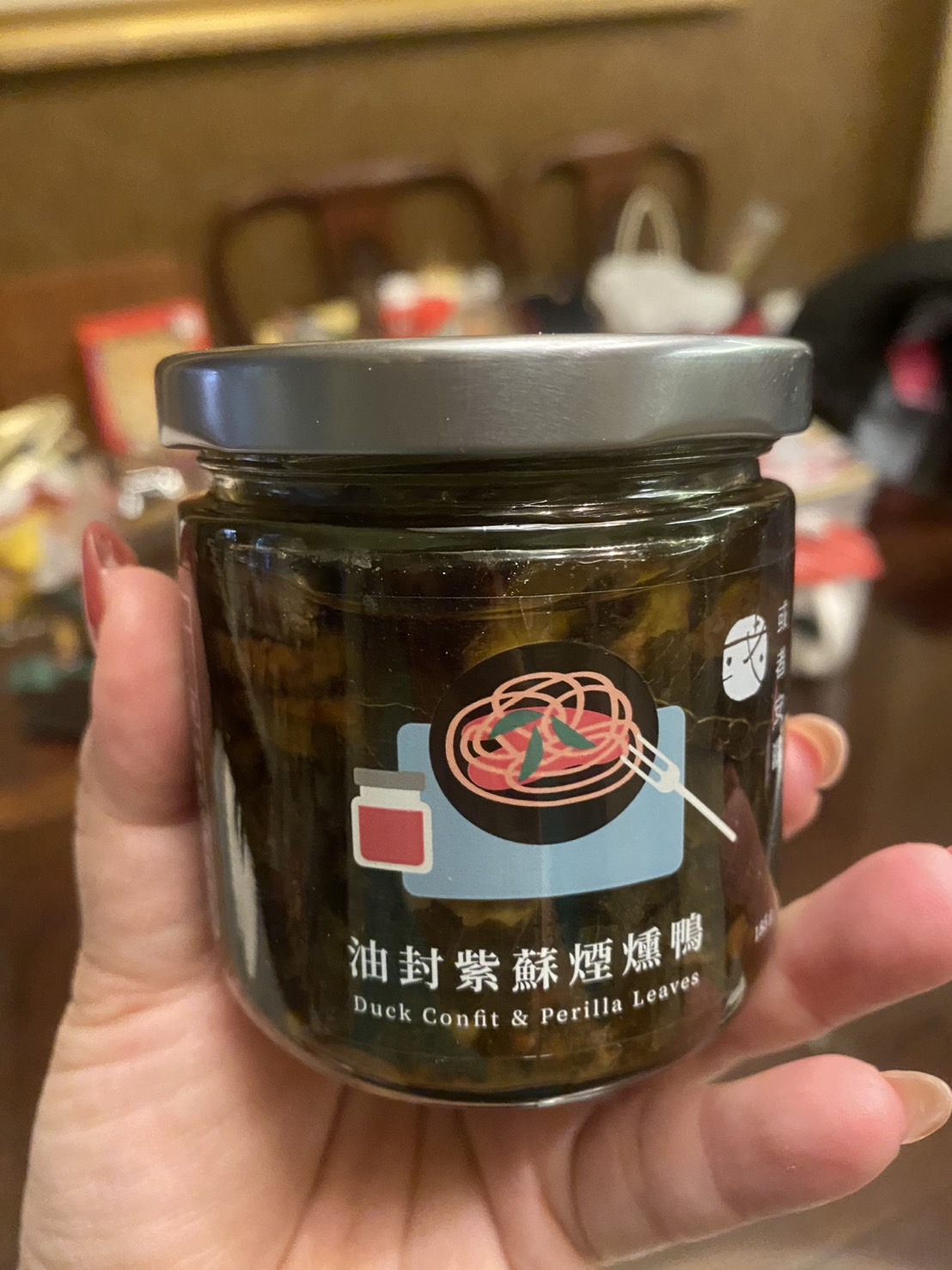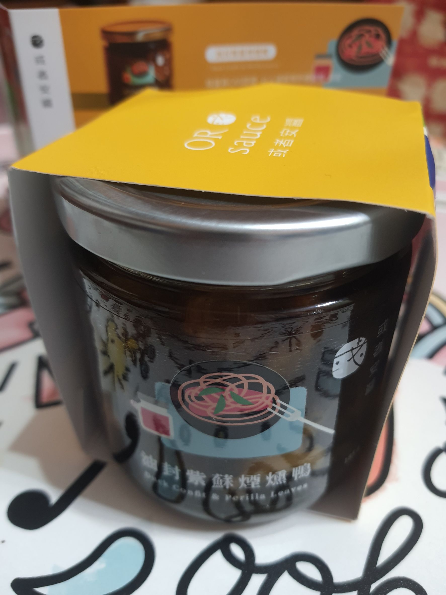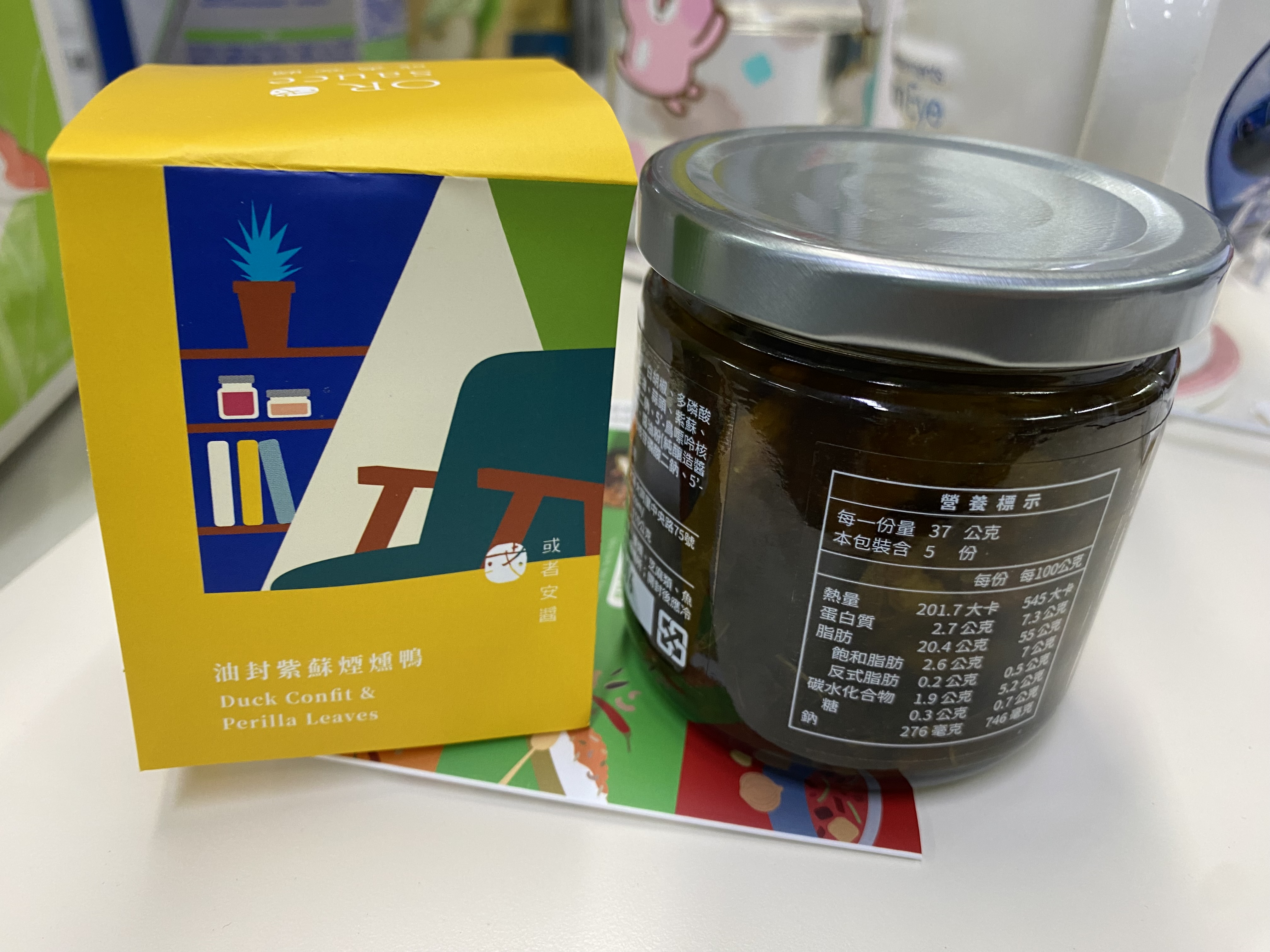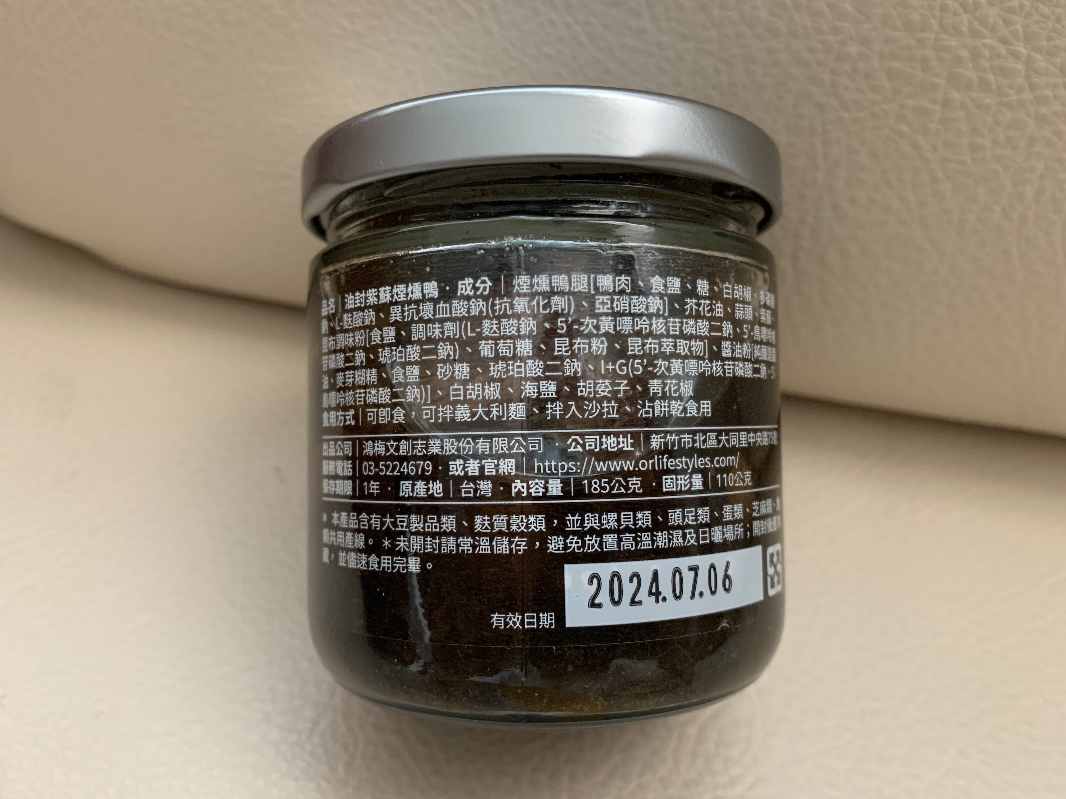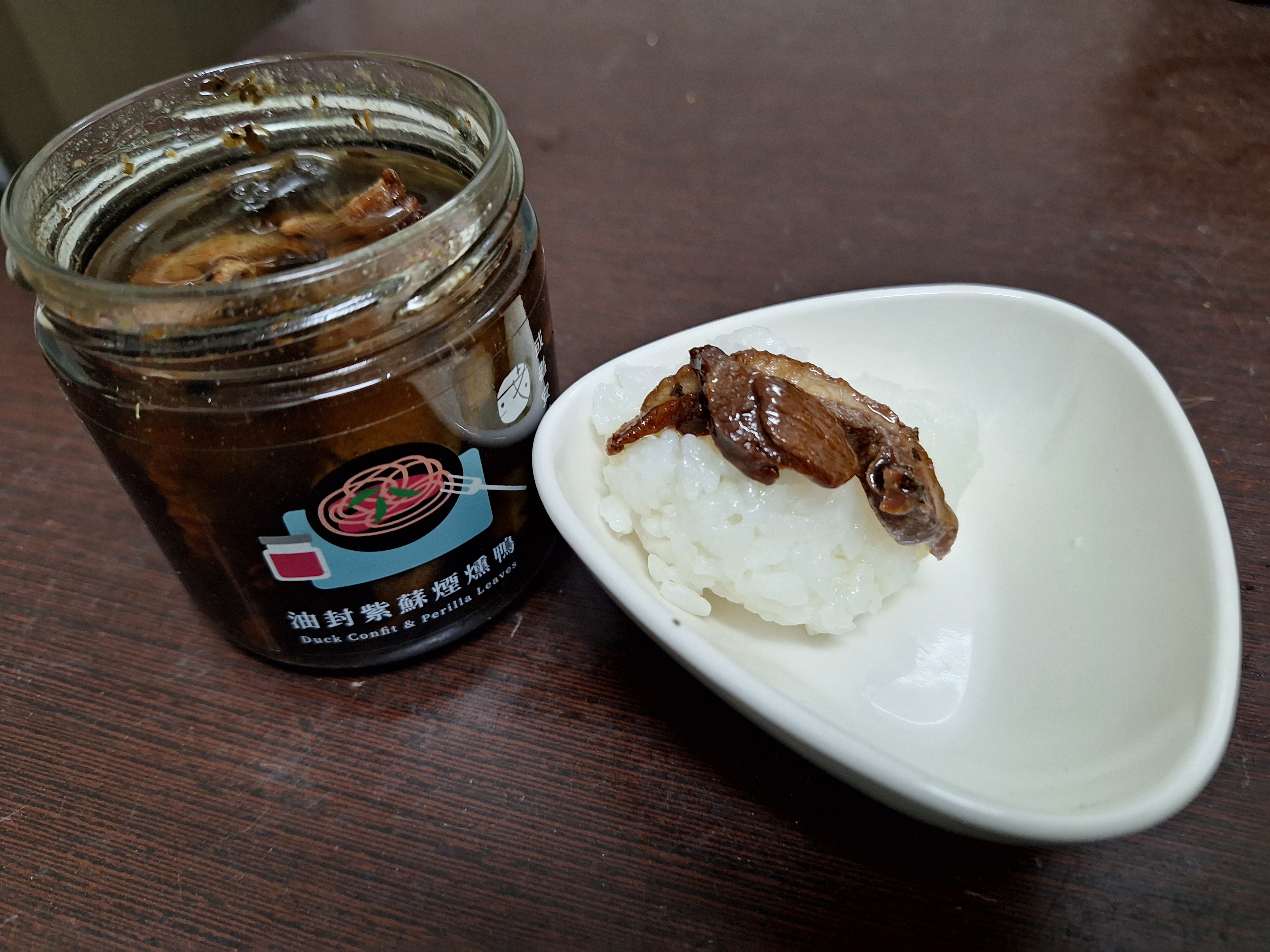 煙燻鴨腿[鴨肉、食鹽、糖、白胡椒、多磷酸鈉、L-麩酸鈉、異抗壞血酸鈉(抗氧化劑)、亞硝酸鈉]、芥花油、蒜頭、紫蘇、昆布調味粉[食鹽、調味劑(L-麩酸鈉、5’-次黃嘌呤核苷磷酸二鈉、5’-鳥嘌呤核苷磷酸二鈉、琥珀酸二鈉)、葡萄糖、昆布粉、昆布萃取物]、醬油粉[純釀造醬油、麥芽糊精、食鹽、砂糖、琥珀酸二鈉、I+G(5’-次黃嘌呤核苷磷酸二鈉、5’-鳥嘌呤核苷磷酸二鈉)]、白胡椒、海鹽、胡荽子、青花椒