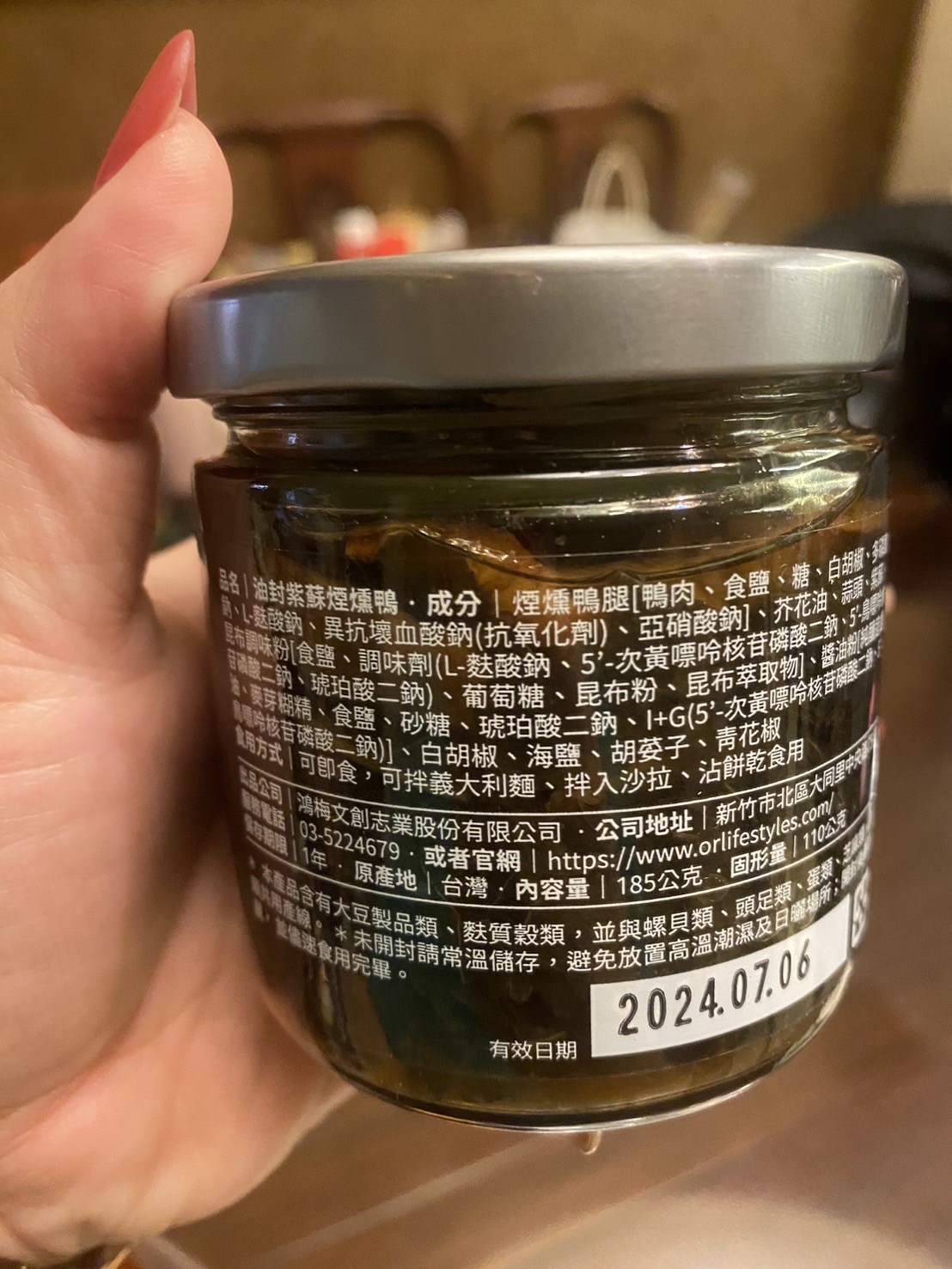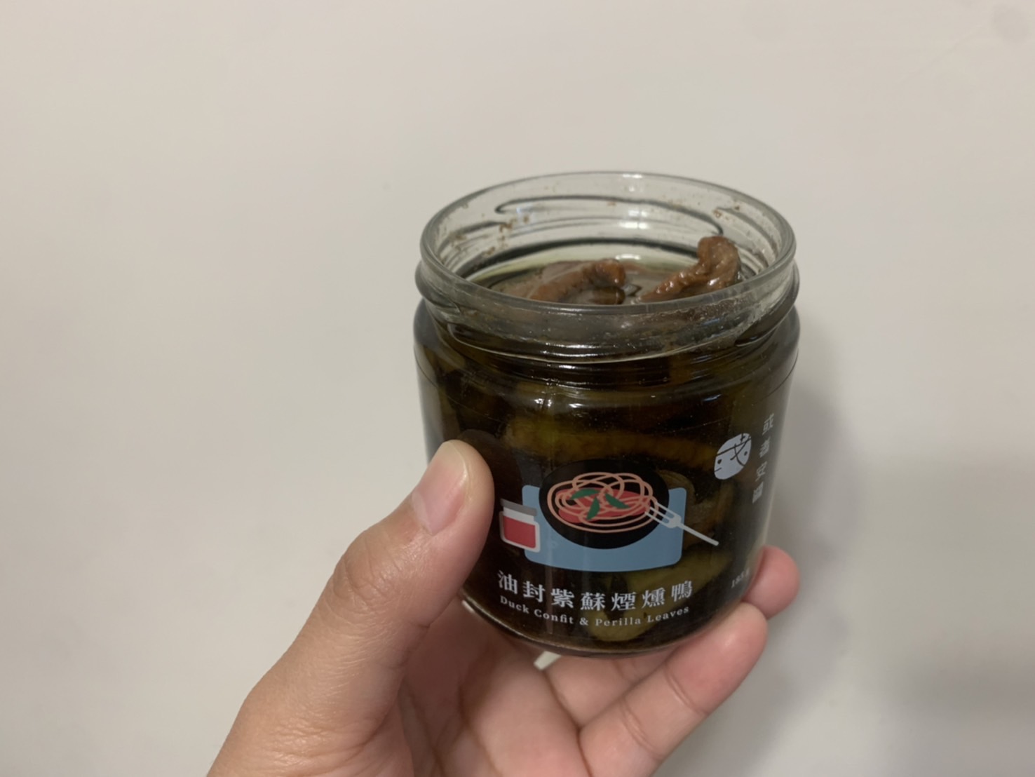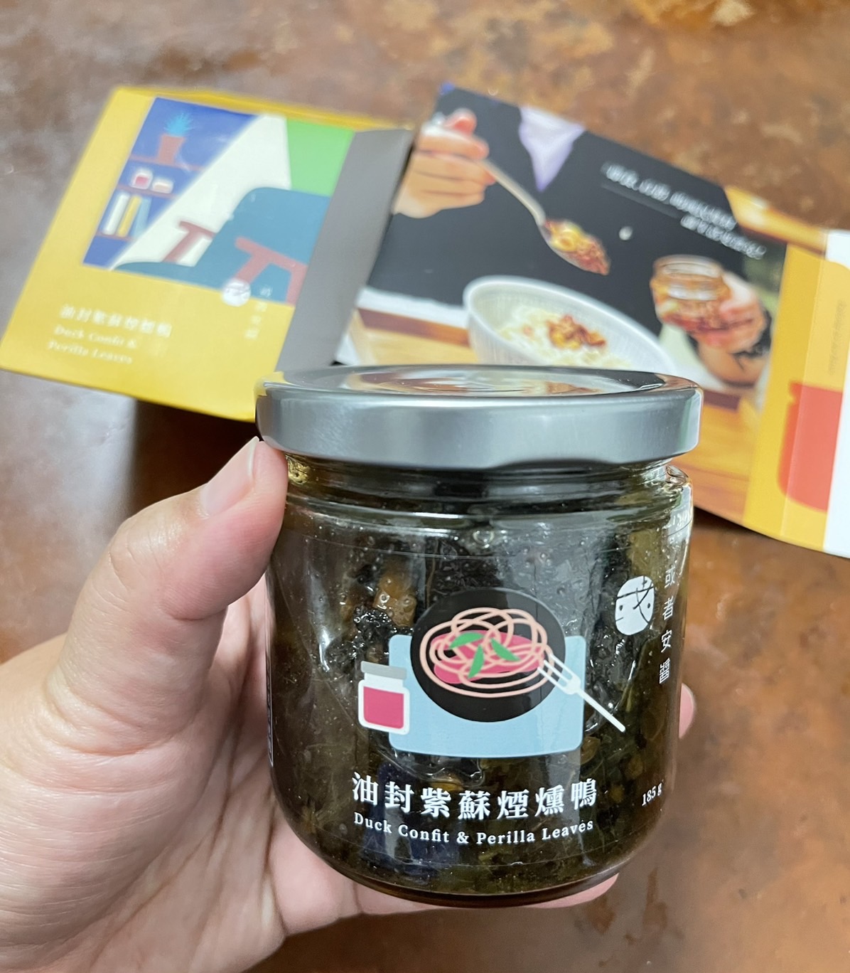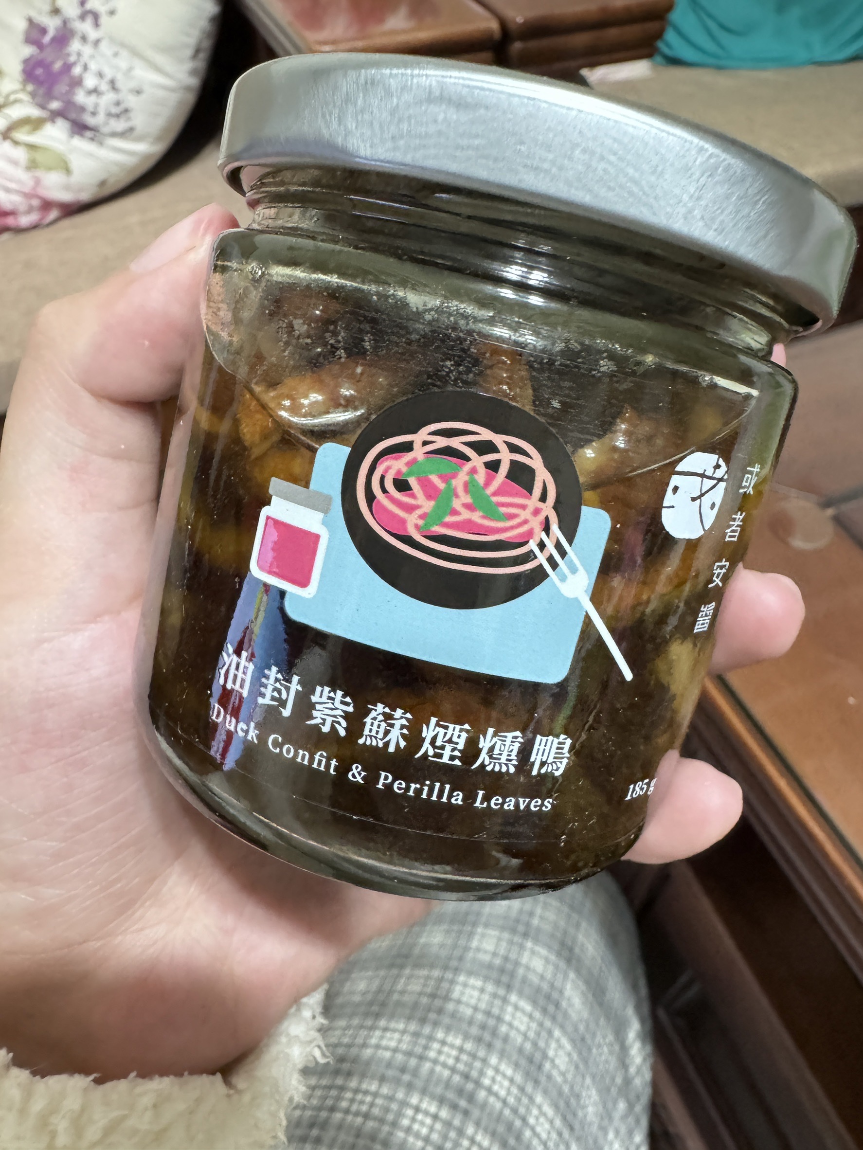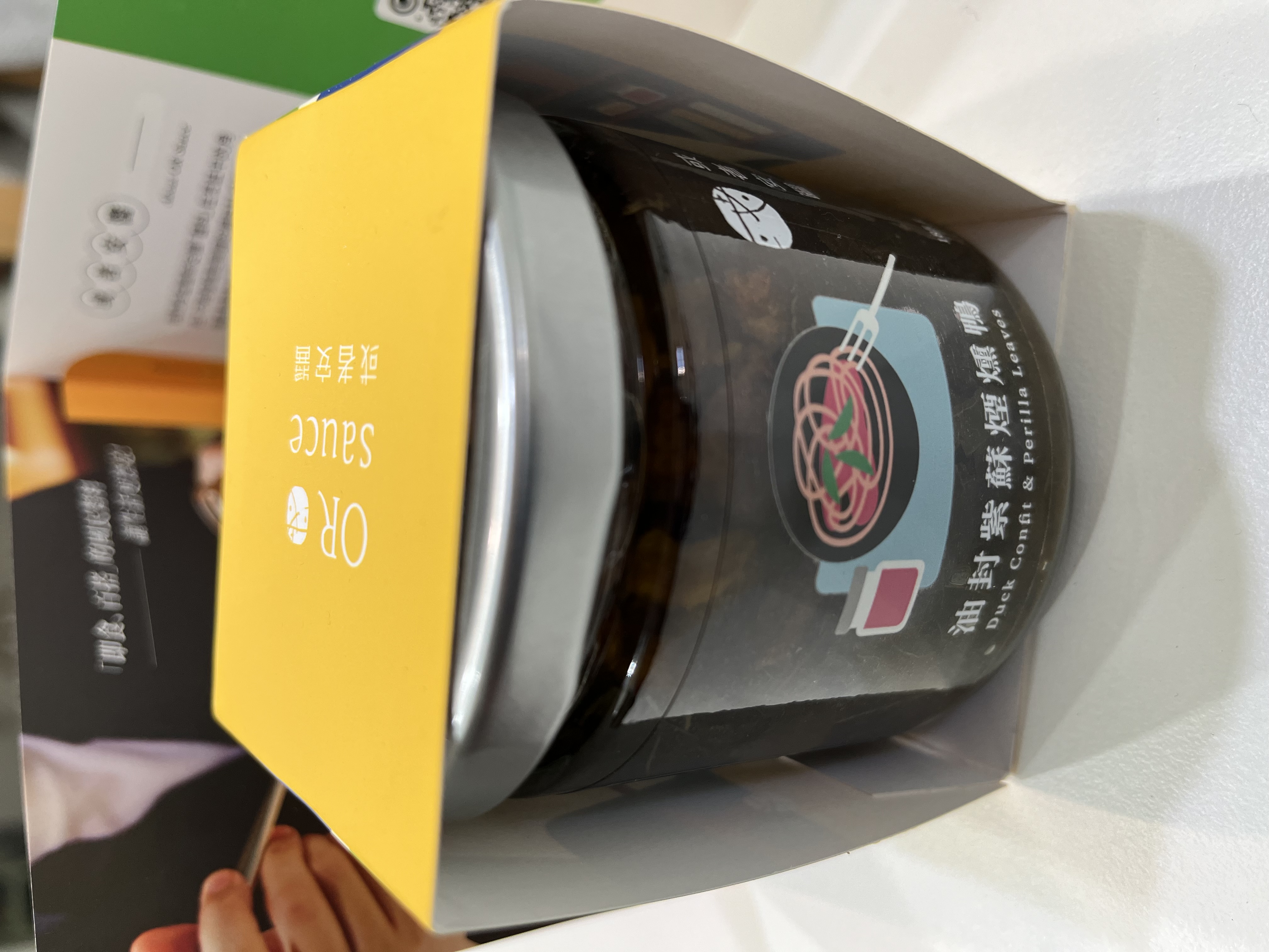 煙燻鴨腿[鴨肉、食鹽、糖、白胡椒、多磷酸鈉、L-麩酸鈉、異抗壞血酸鈉(抗氧化劑)、亞硝酸鈉]、芥花油、蒜頭、紫蘇、昆布調味粉[食鹽、調味劑(L-麩酸鈉、5’-次黃嘌呤核苷磷酸二鈉、5’-鳥嘌呤核苷磷酸二鈉、琥珀酸二鈉)、葡萄糖、昆布粉、昆布萃取物]、醬油粉[純釀造醬油、麥芽糊精、食鹽、砂糖、琥珀酸二鈉、I+G(5’-次黃嘌呤核苷磷酸二鈉、5’-鳥嘌呤核苷磷酸二鈉)]、白胡椒、海鹽、胡荽子、青花椒